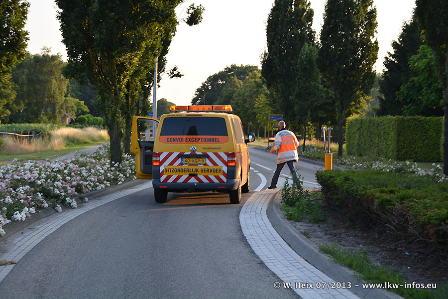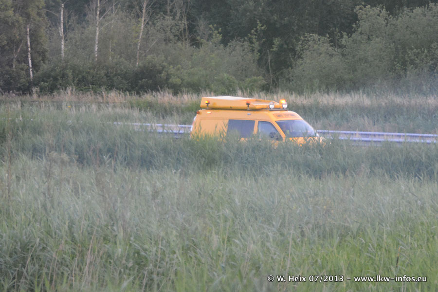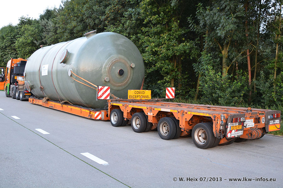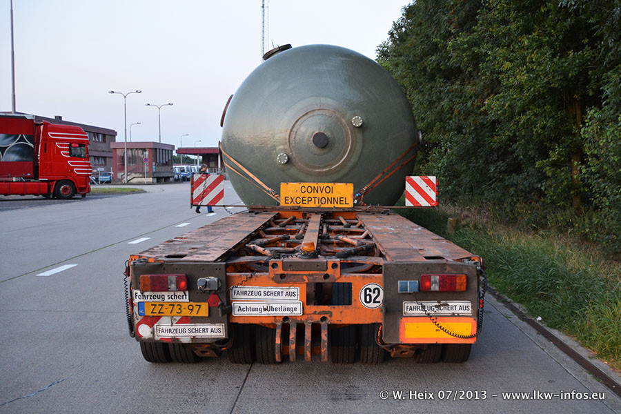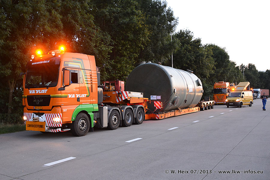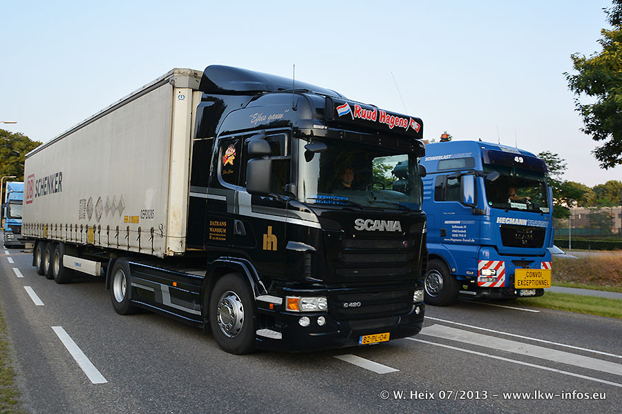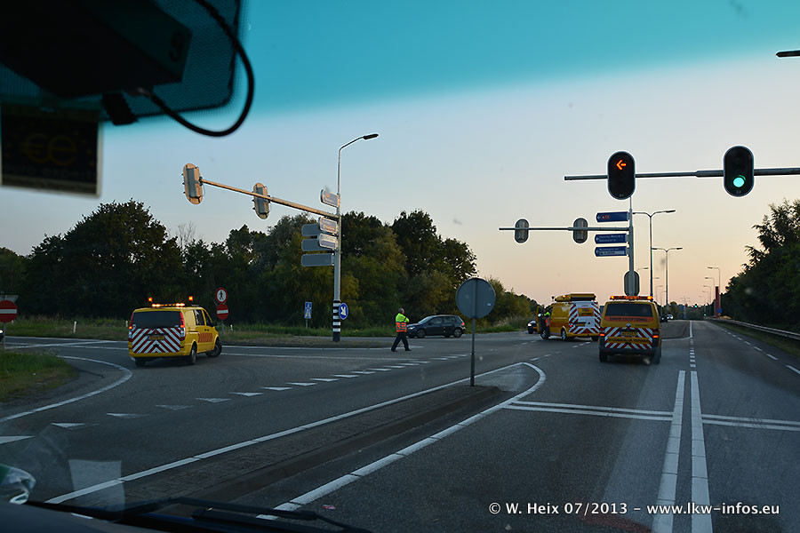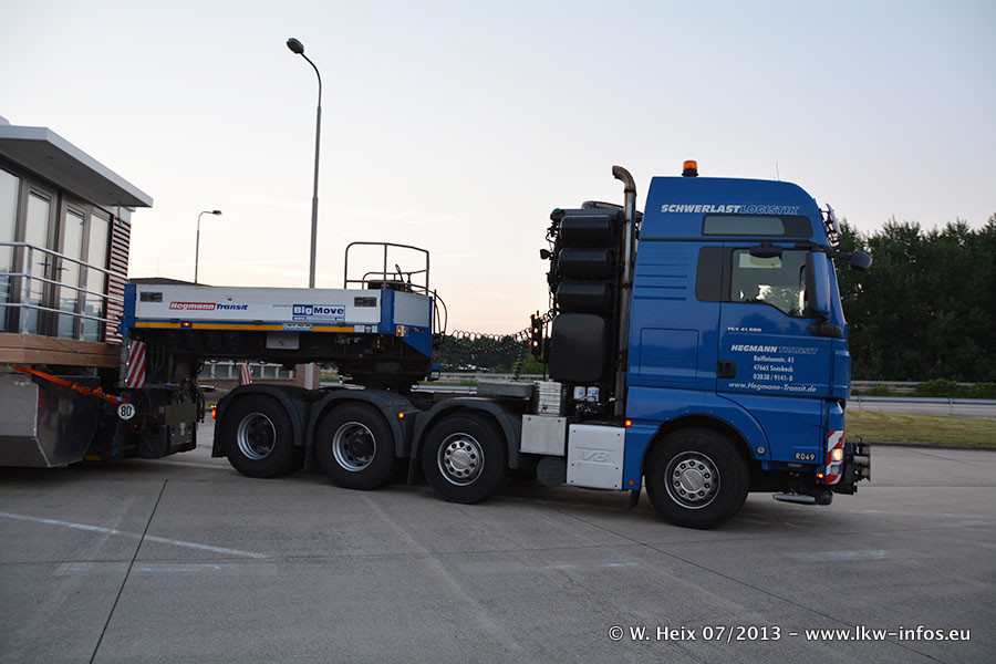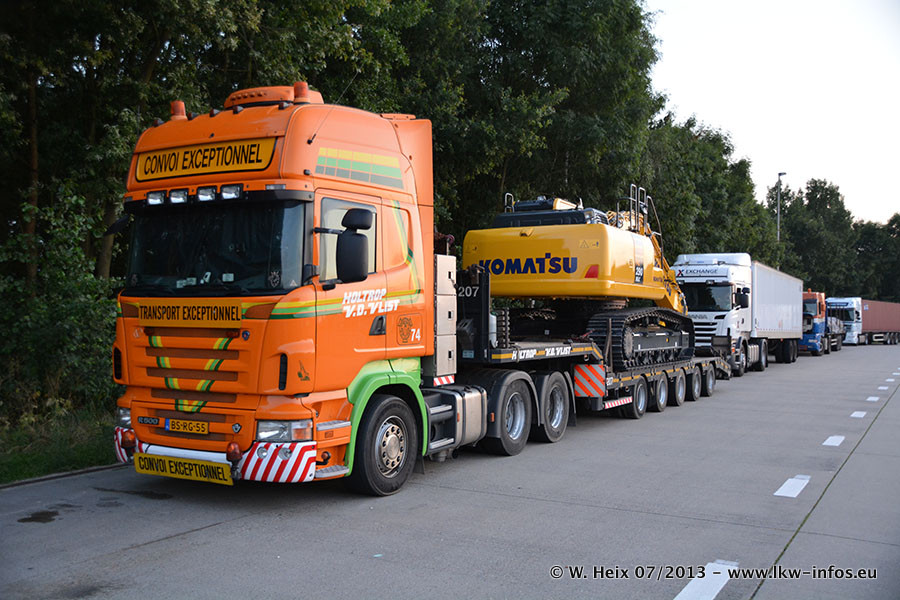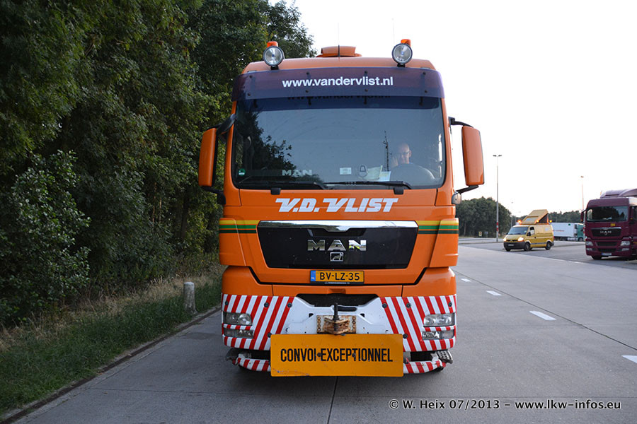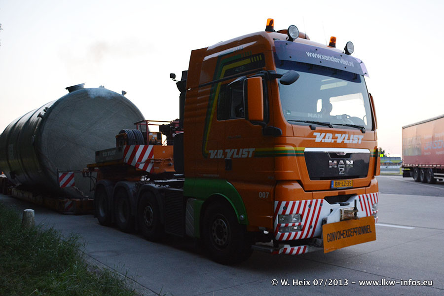 Am 15.07.2013 hatte die Firma Hegmann Transit aus Sonsbeck den Auftrag, ein 6,10 m breites und 13,0 m langes voll eingerichtetes Hausboot vom Hersteller im niederländischen Wanssum (zwischen Venlo und Nijmegen gelegen) zum Freizeitpark "Xantener Nordsee" im niederrheinischen Xanten-Wardt zu transportieren. Der Transport startet gegen 20:00 Uhr und führte zunächst mit zwei und später vier niederländischen Begleitern durch den Ort Wanssum und dann ca. 10 km über Nationalstraße bis zur A73. Diese Etappe war auch das interessanteste Stück mit einigen engen Verkehrsinseln und zwei Kreisverkehren, die einmal rechts und einmal links im Gegenverkehr durchfahren wurden. Dann ging es über die Autobahnen A73 und A77 bis zum Grenzübergang Goch Autobahn auf der A57. Dort blieb der Transport für eine gute Stunde stehen bis die deutsche Polizeibegleitung vor Ort war. Die Fahrt führte dann über die A57 bis zur Anschlussstelle Alpen. Dort wechselte dann die Polizeibegleitung und die Fahrt ging weiter über die B58 bis Alpen und dann über die B57 vorbei an Xanten bis zum Ortsteil Wardt.