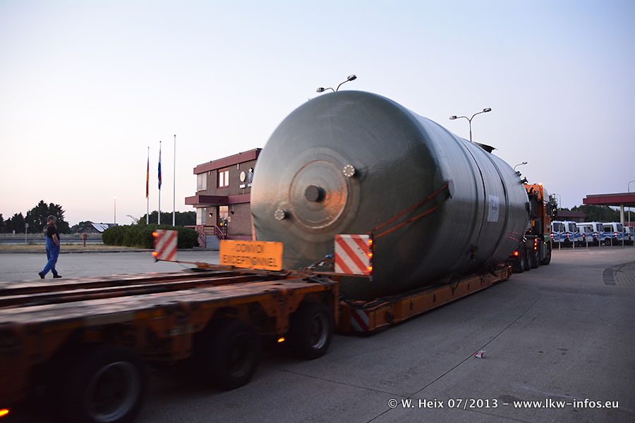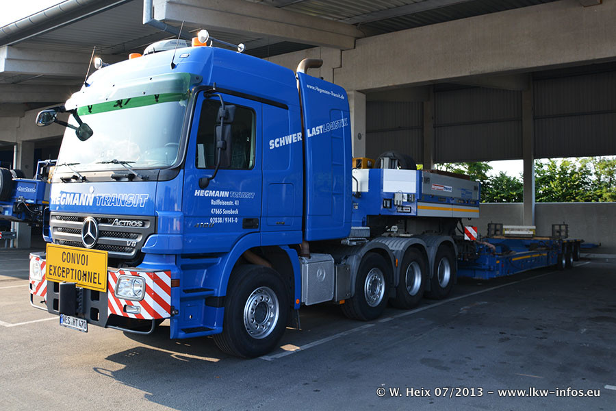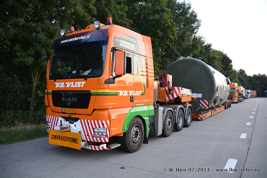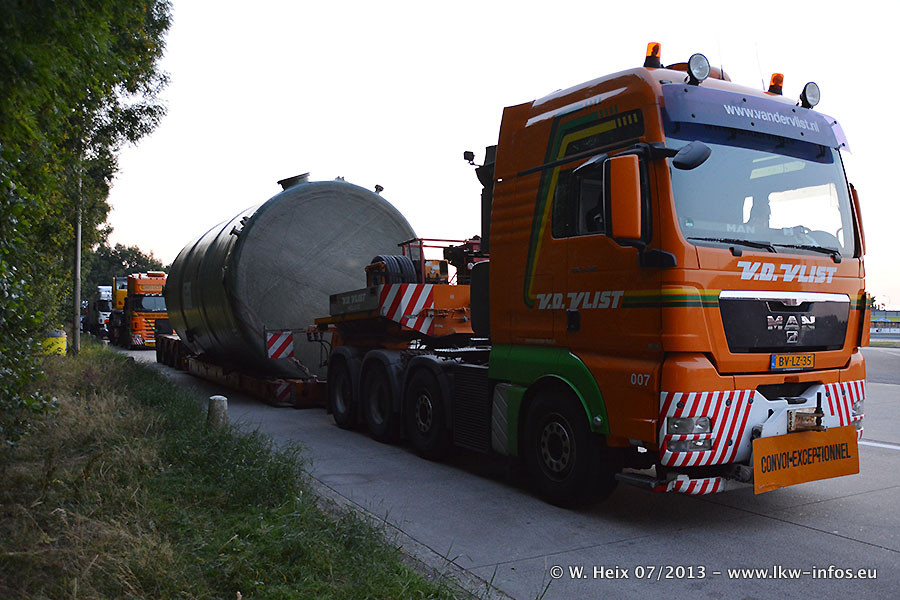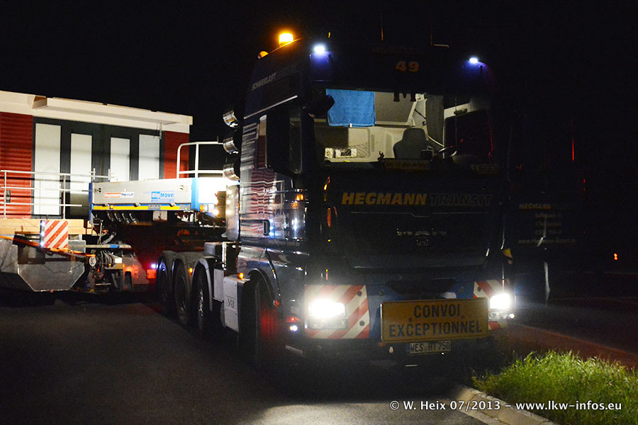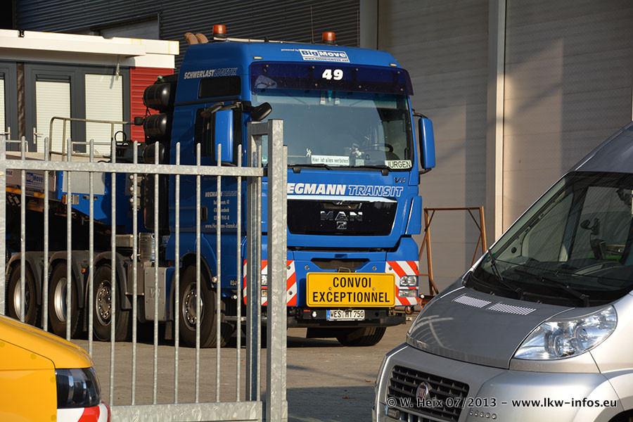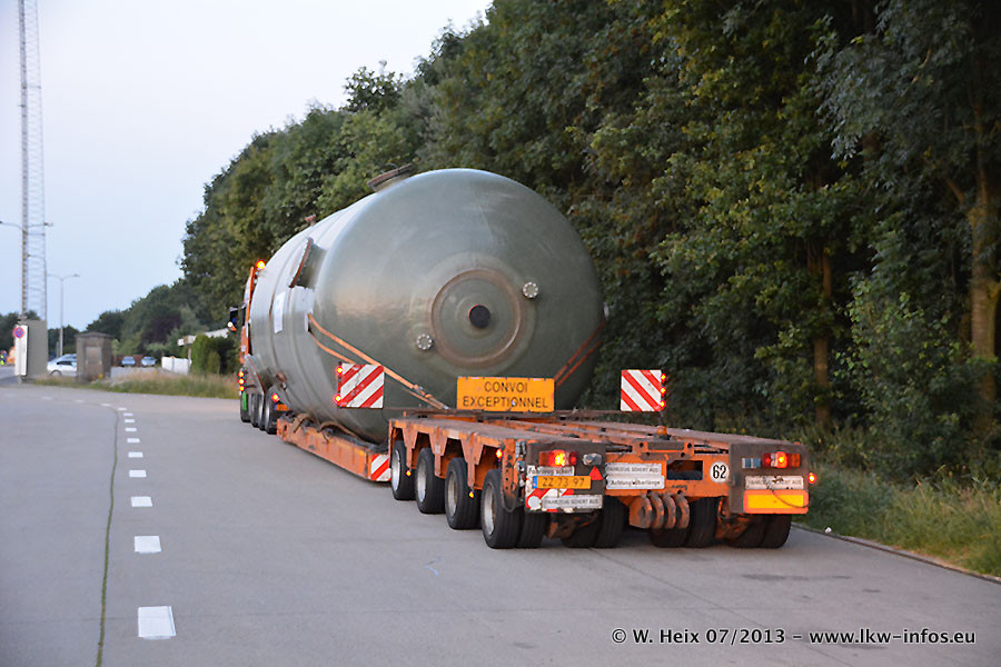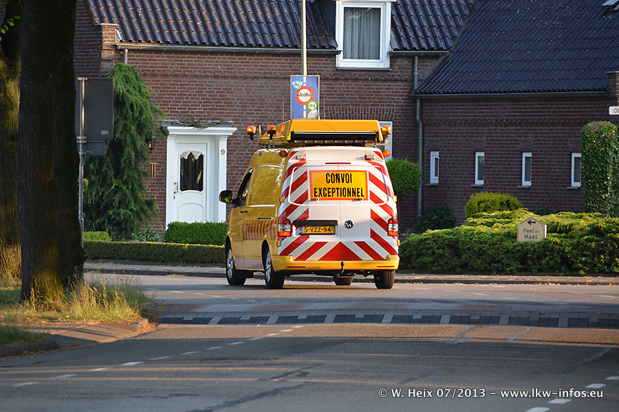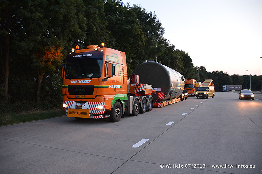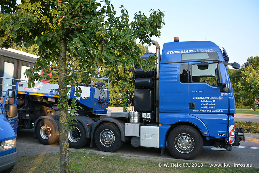 Am 15.07.2013 hatte die Firma Hegmann Transit aus Sonsbeck den Auftrag, ein 6,10 m breites und 13,0 m langes voll eingerichtetes Hausboot vom Hersteller im niederländischen Wanssum (zwischen Venlo und Nijmegen gelegen) zum Freizeitpark "Xantener Nordsee" im niederrheinischen Xanten-Wardt zu transportieren. Der Transport startet gegen 20:00 Uhr und führte zunächst mit zwei und später vier niederländischen Begleitern durch den Ort Wanssum und dann ca. 10 km über Nationalstraße bis zur A73. Diese Etappe war auch das interessanteste Stück mit einigen engen Verkehrsinseln und zwei Kreisverkehren, die einmal rechts und einmal links im Gegenverkehr durchfahren wurden. Dann ging es über die Autobahnen A73 und A77 bis zum Grenzübergang Goch Autobahn auf der A57. Dort blieb der Transport für eine gute Stunde stehen bis die deutsche Polizeibegleitung vor Ort war. Die Fahrt führte dann über die A57 bis zur Anschlussstelle Alpen. Dort wechselte dann die Polizeibegleitung und die Fahrt ging weiter über die B58 bis Alpen und dann über die B57 vorbei an Xanten bis zum Ortsteil Wardt.