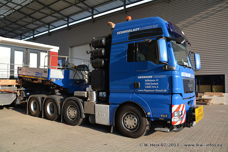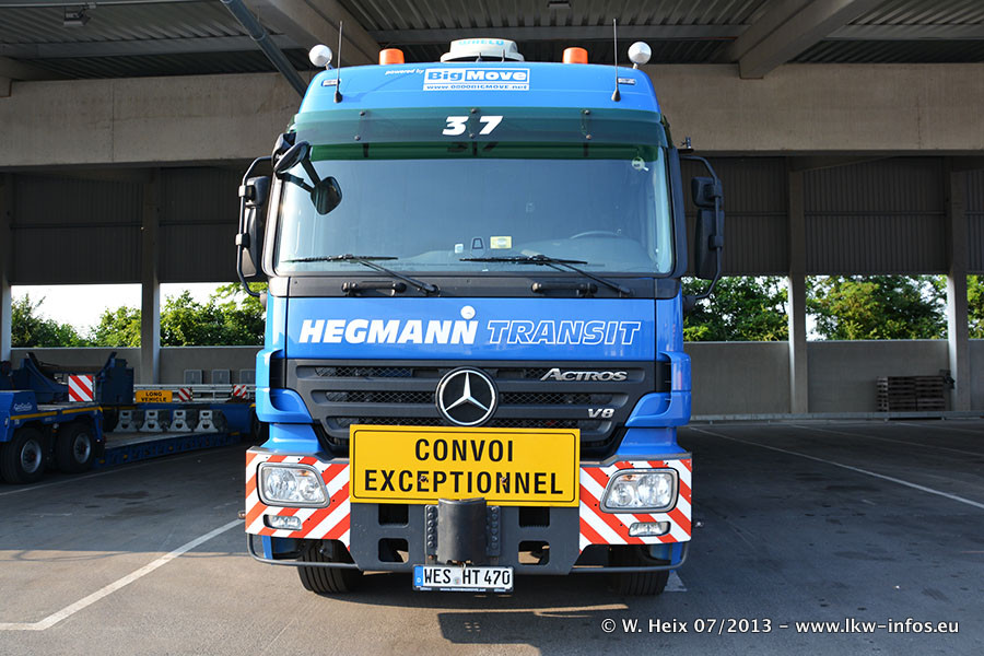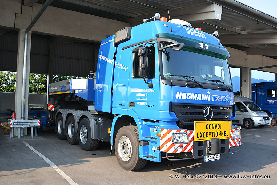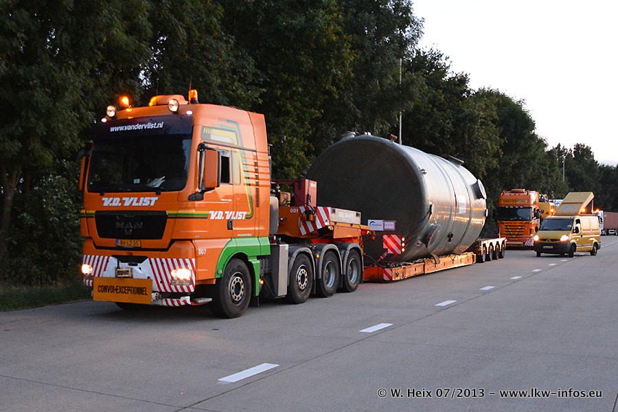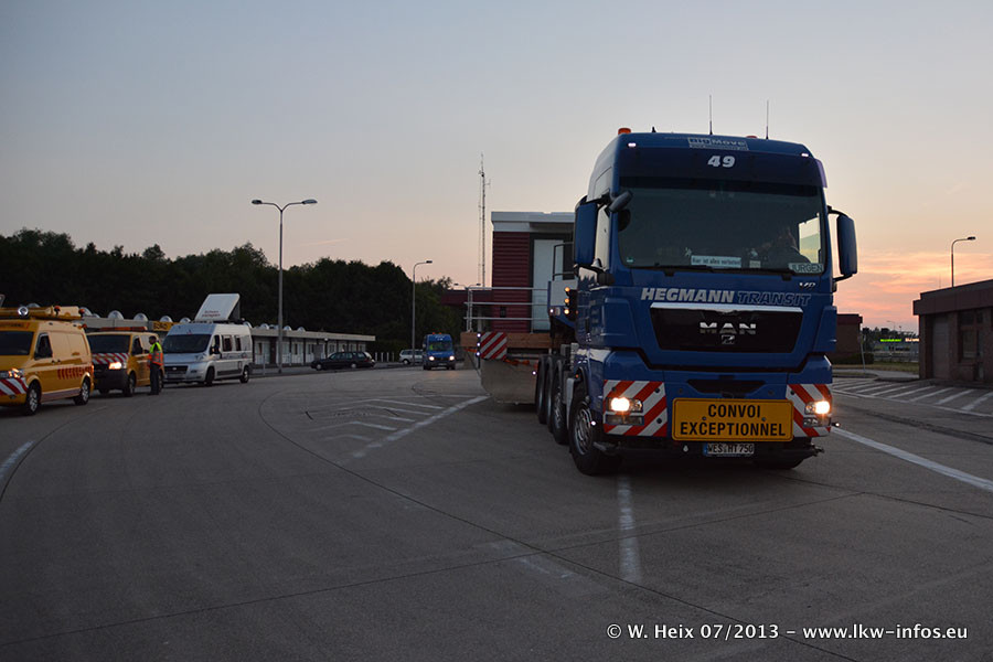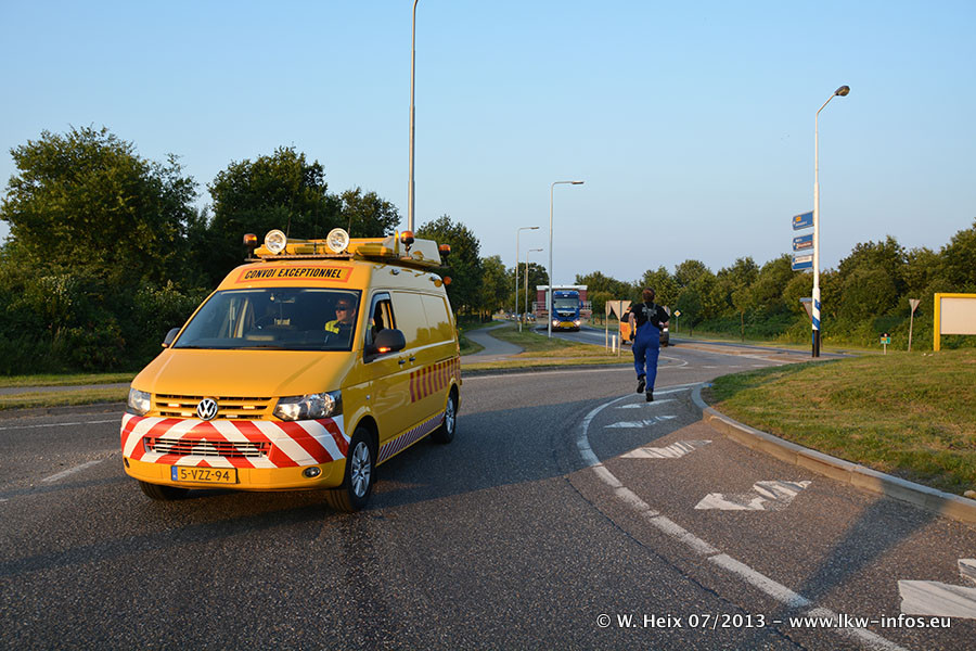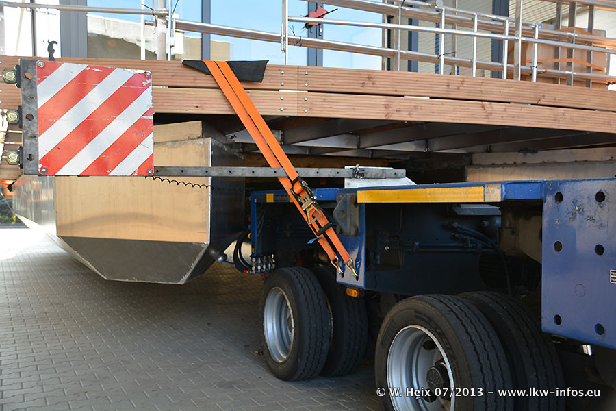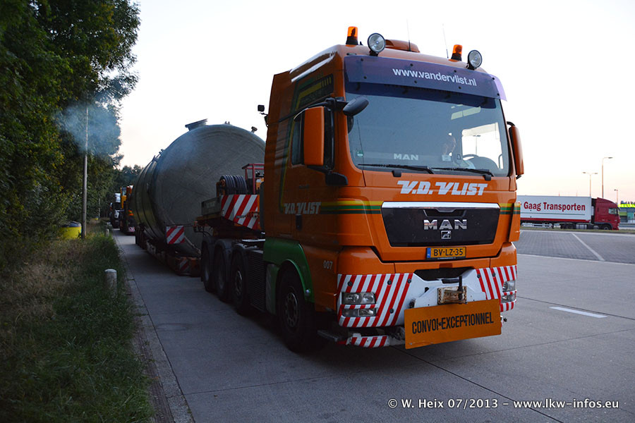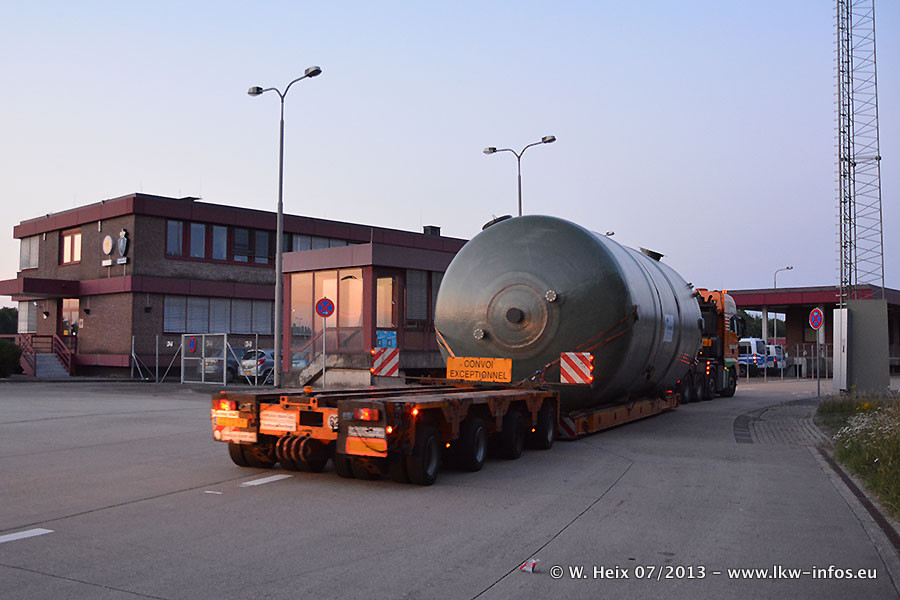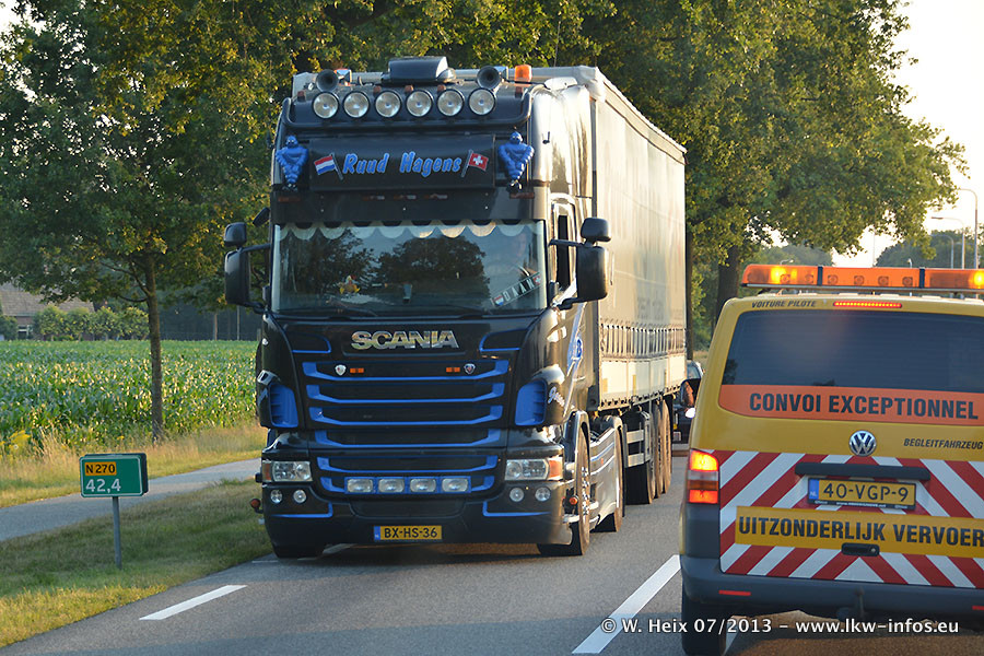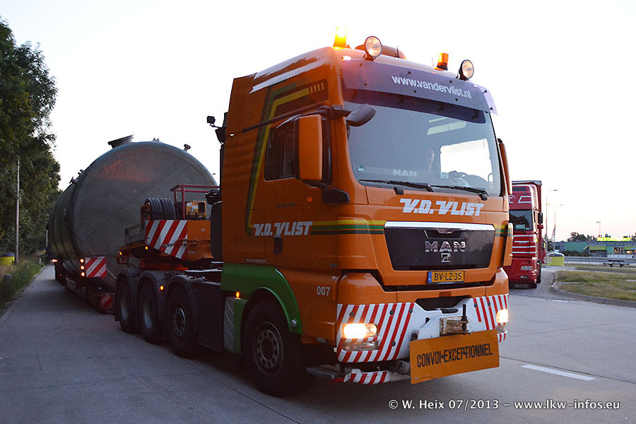 Am 15.07.2013 hatte die Firma Hegmann Transit aus Sonsbeck den Auftrag, ein 6,10 m breites und 13,0 m langes voll eingerichtetes Hausboot vom Hersteller im niederländischen Wanssum (zwischen Venlo und Nijmegen gelegen) zum Freizeitpark "Xantener Nordsee" im niederrheinischen Xanten-Wardt zu transportieren. Der Transport startet gegen 20:00 Uhr und führte zunächst mit zwei und später vier niederländischen Begleitern durch den Ort Wanssum und dann ca. 10 km über Nationalstraße bis zur A73. Diese Etappe war auch das interessanteste Stück mit einigen engen Verkehrsinseln und zwei Kreisverkehren, die einmal rechts und einmal links im Gegenverkehr durchfahren wurden. Dann ging es über die Autobahnen A73 und A77 bis zum Grenzübergang Goch Autobahn auf der A57. Dort blieb der Transport für eine gute Stunde stehen bis die deutsche Polizeibegleitung vor Ort war. Die Fahrt führte dann über die A57 bis zur Anschlussstelle Alpen. Dort wechselte dann die Polizeibegleitung und die Fahrt ging weiter über die B58 bis Alpen und dann über die B57 vorbei an Xanten bis zum Ortsteil Wardt.
