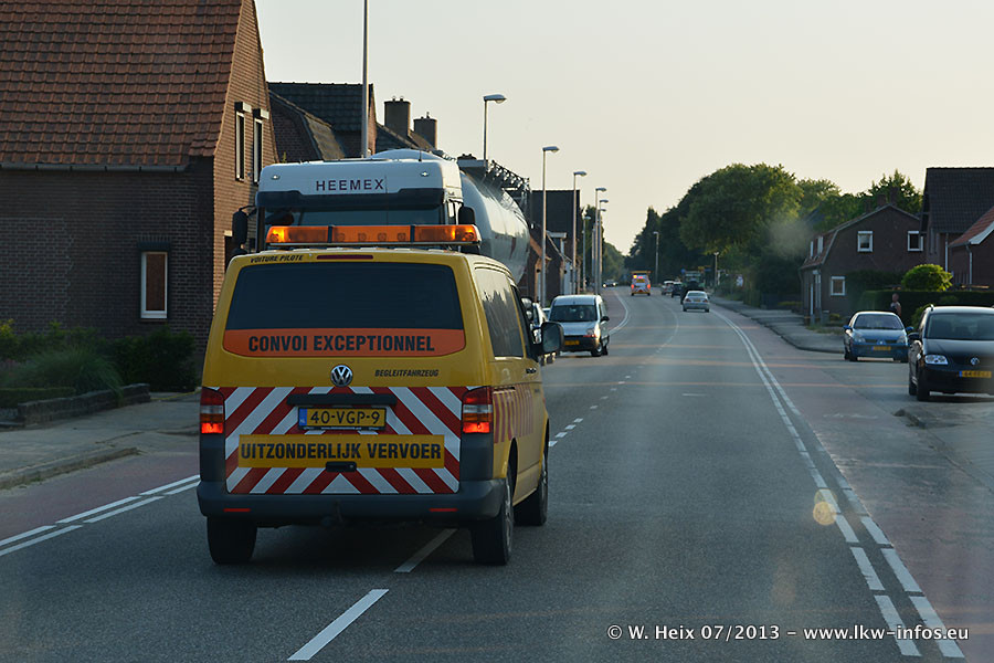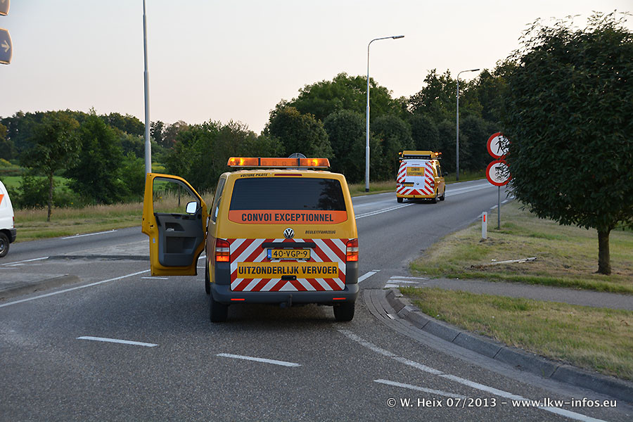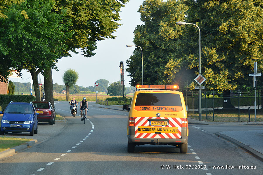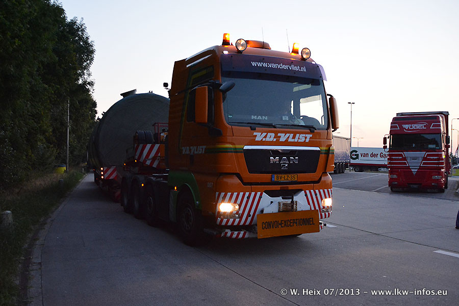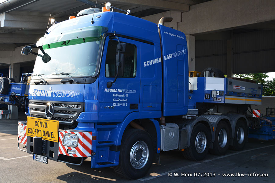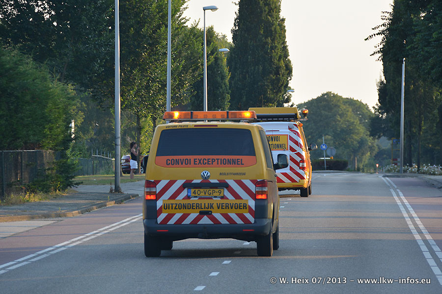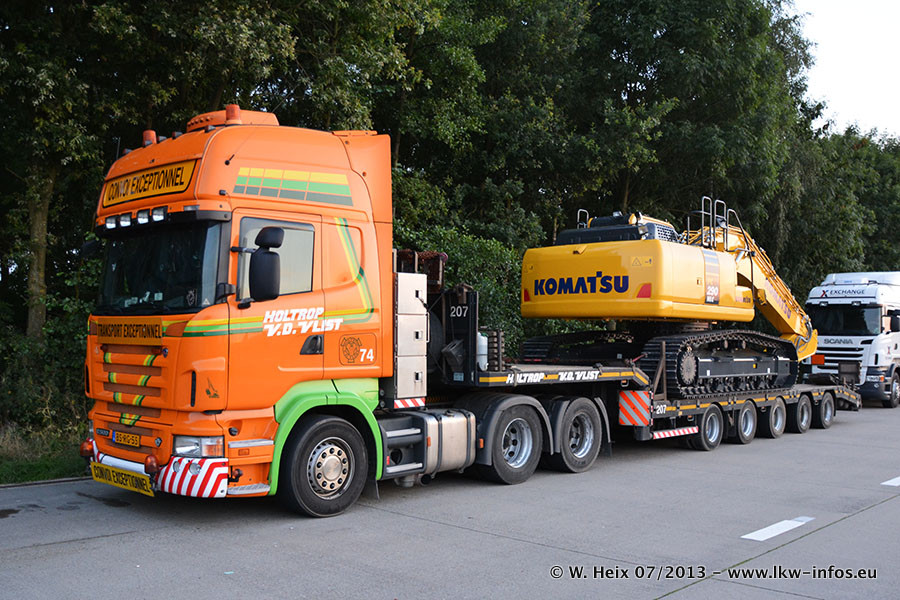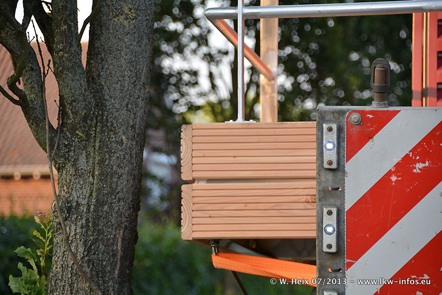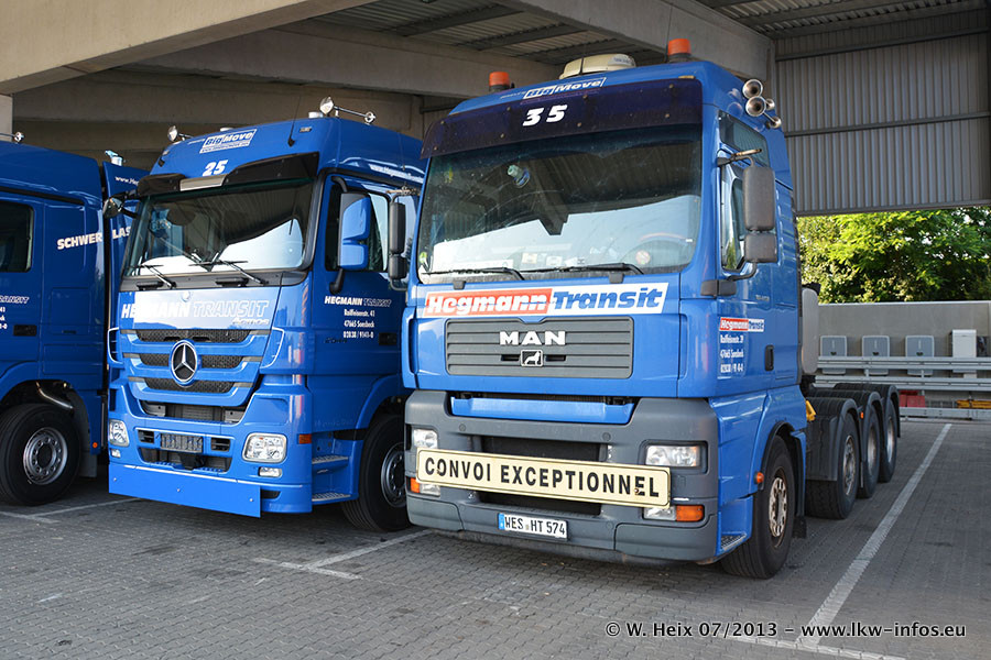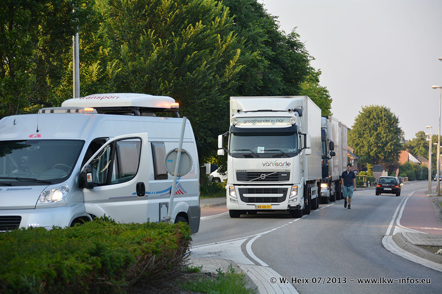 Am 15.07.2013 hatte die Firma Hegmann Transit aus Sonsbeck den Auftrag, ein 6,10 m breites und 13,0 m langes voll eingerichtetes Hausboot vom Hersteller im niederländischen Wanssum (zwischen Venlo und Nijmegen gelegen) zum Freizeitpark "Xantener Nordsee" im niederrheinischen Xanten-Wardt zu transportieren. Der Transport startet gegen 20:00 Uhr und führte zunächst mit zwei und später vier niederländischen Begleitern durch den Ort Wanssum und dann ca. 10 km über Nationalstraße bis zur A73. Diese Etappe war auch das interessanteste Stück mit einigen engen Verkehrsinseln und zwei Kreisverkehren, die einmal rechts und einmal links im Gegenverkehr durchfahren wurden. Dann ging es über die Autobahnen A73 und A77 bis zum Grenzübergang Goch Autobahn auf der A57. Dort blieb der Transport für eine gute Stunde stehen bis die deutsche Polizeibegleitung vor Ort war. Die Fahrt führte dann über die A57 bis zur Anschlussstelle Alpen. Dort wechselte dann die Polizeibegleitung und die Fahrt ging weiter über die B58 bis Alpen und dann über die B57 vorbei an Xanten bis zum Ortsteil Wardt.