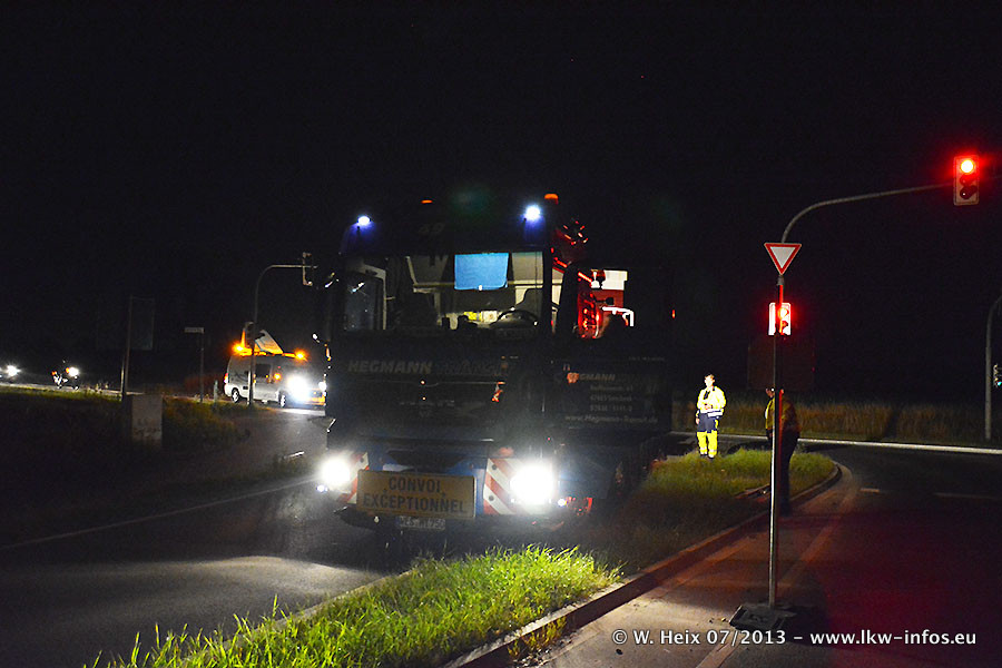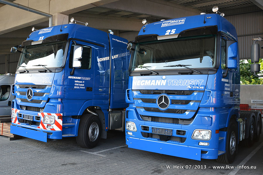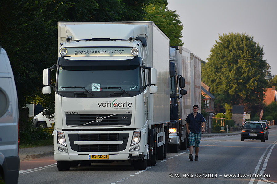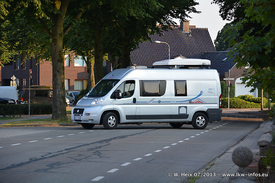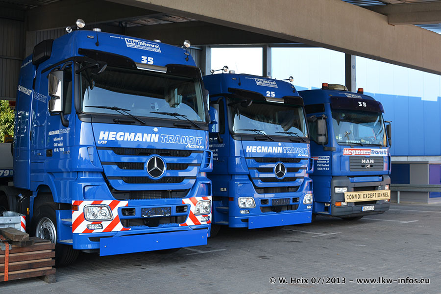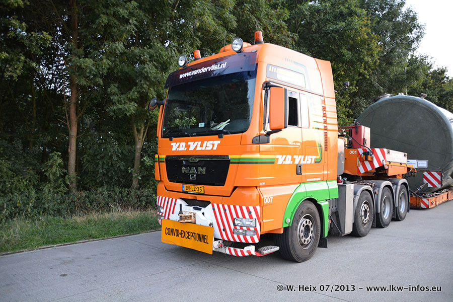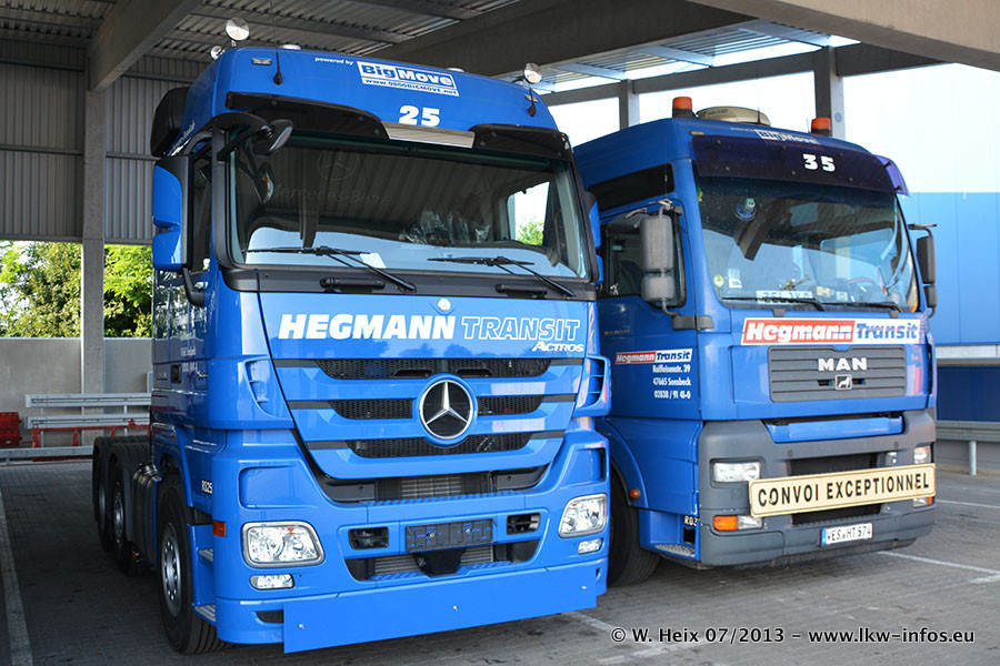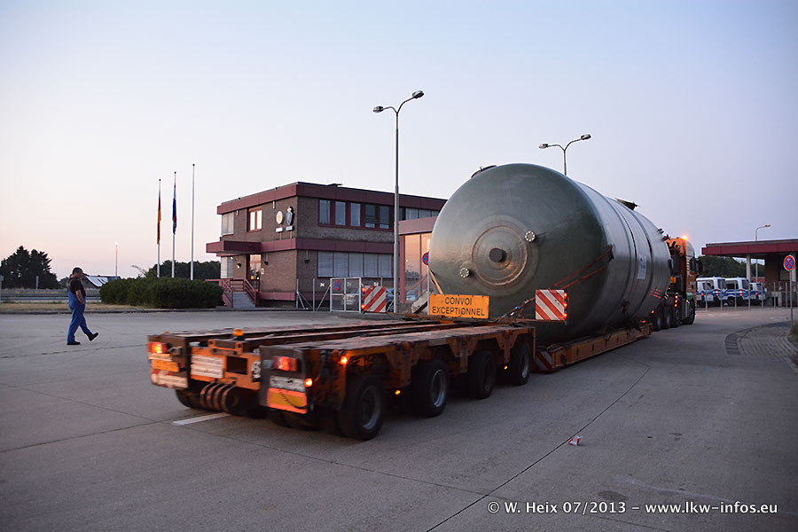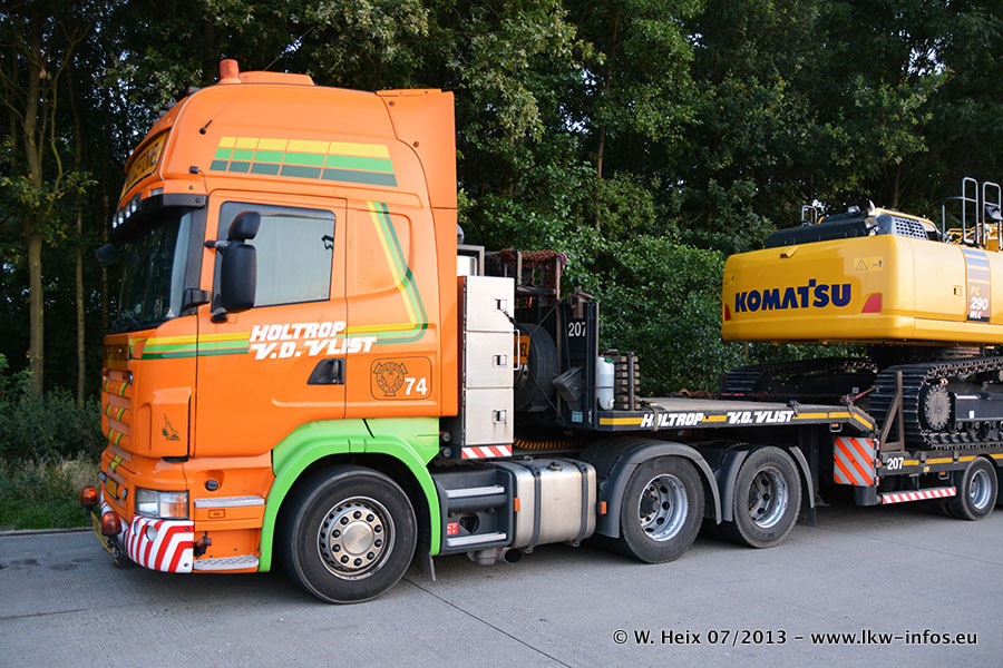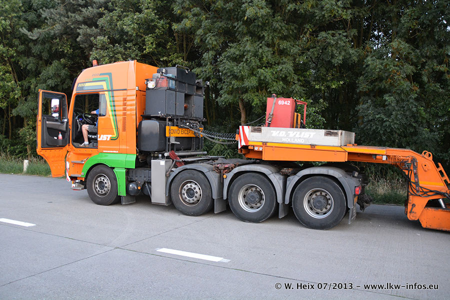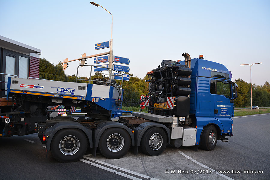 Am 15.07.2013 hatte die Firma Hegmann Transit aus Sonsbeck den Auftrag, ein 6,10 m breites und 13,0 m langes voll eingerichtetes Hausboot vom Hersteller im niederländischen Wanssum (zwischen Venlo und Nijmegen gelegen) zum Freizeitpark "Xantener Nordsee" im niederrheinischen Xanten-Wardt zu transportieren. Der Transport startet gegen 20:00 Uhr und führte zunächst mit zwei und später vier niederländischen Begleitern durch den Ort Wanssum und dann ca. 10 km über Nationalstraße bis zur A73. Diese Etappe war auch das interessanteste Stück mit einigen engen Verkehrsinseln und zwei Kreisverkehren, die einmal rechts und einmal links im Gegenverkehr durchfahren wurden. Dann ging es über die Autobahnen A73 und A77 bis zum Grenzübergang Goch Autobahn auf der A57. Dort blieb der Transport für eine gute Stunde stehen bis die deutsche Polizeibegleitung vor Ort war. Die Fahrt führte dann über die A57 bis zur Anschlussstelle Alpen. Dort wechselte dann die Polizeibegleitung und die Fahrt ging weiter über die B58 bis Alpen und dann über die B57 vorbei an Xanten bis zum Ortsteil Wardt.