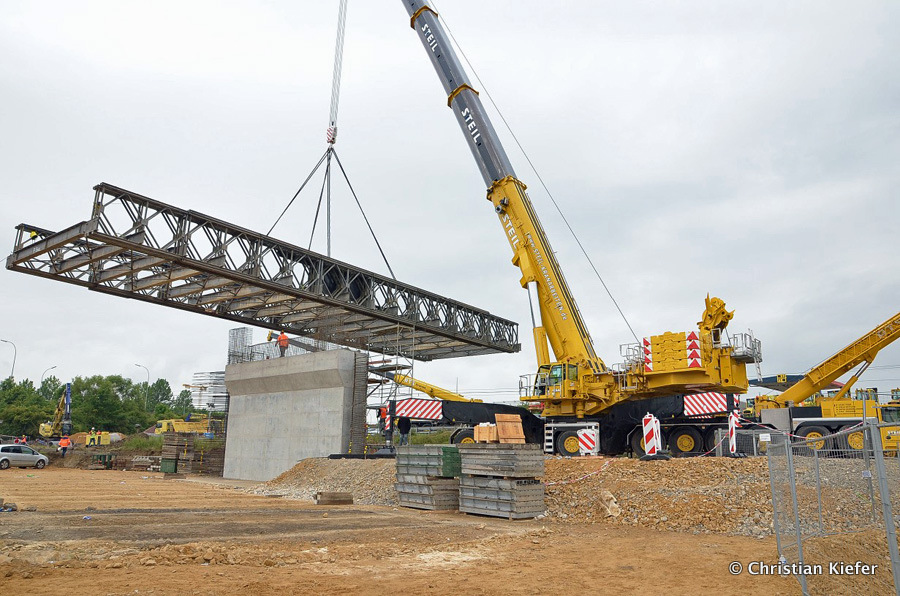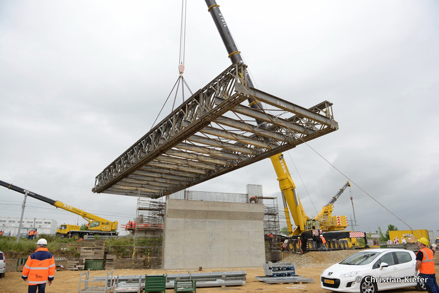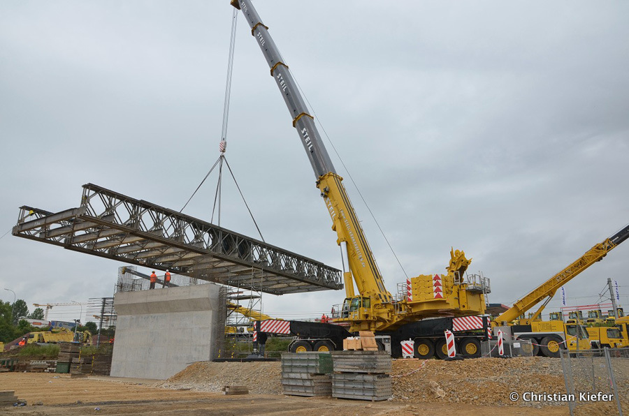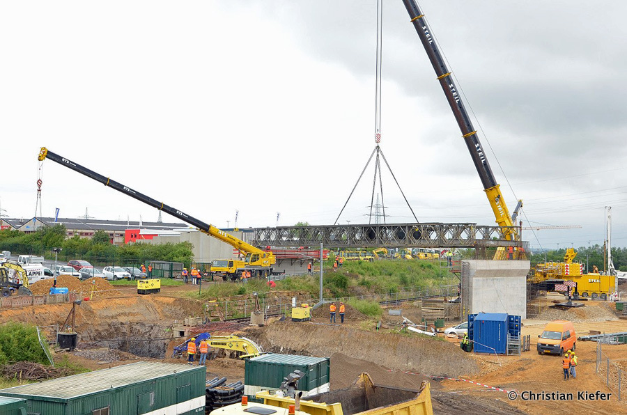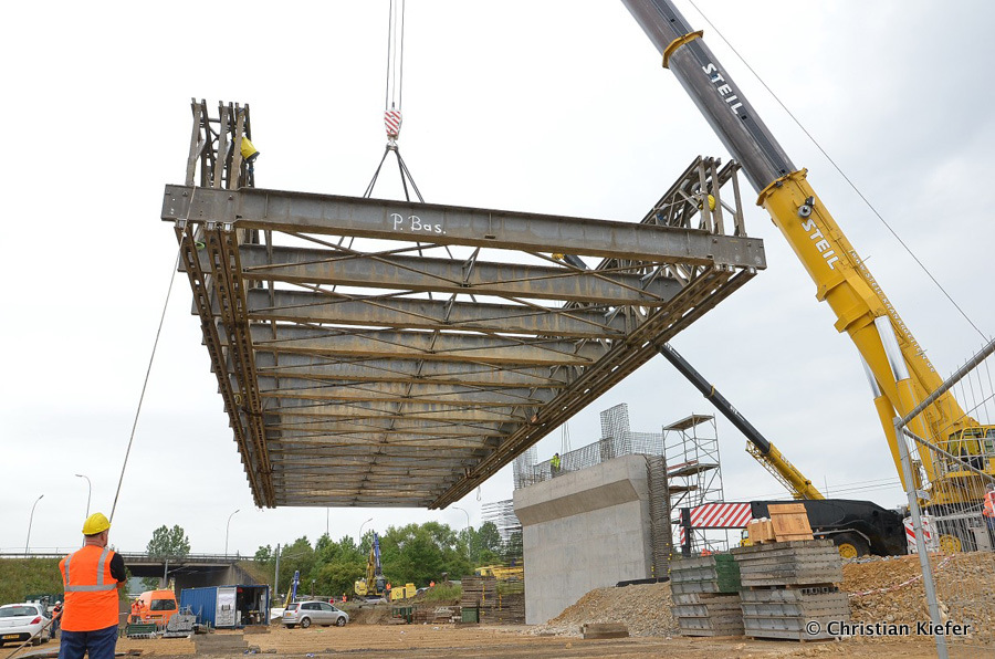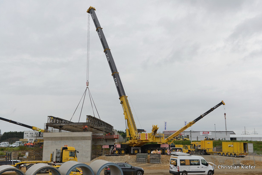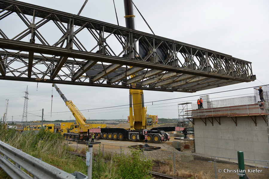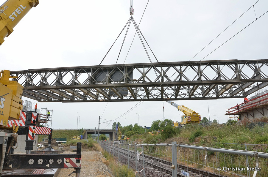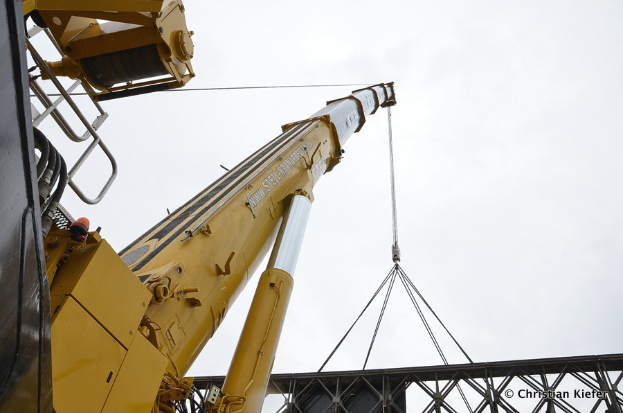 Christian Kiefer konnte in Juni 2014 in Dudelange (Luxemburg) den Brückenhub beobachten und fotografieren, mit dem die Firma Steil beauftragt wurde.