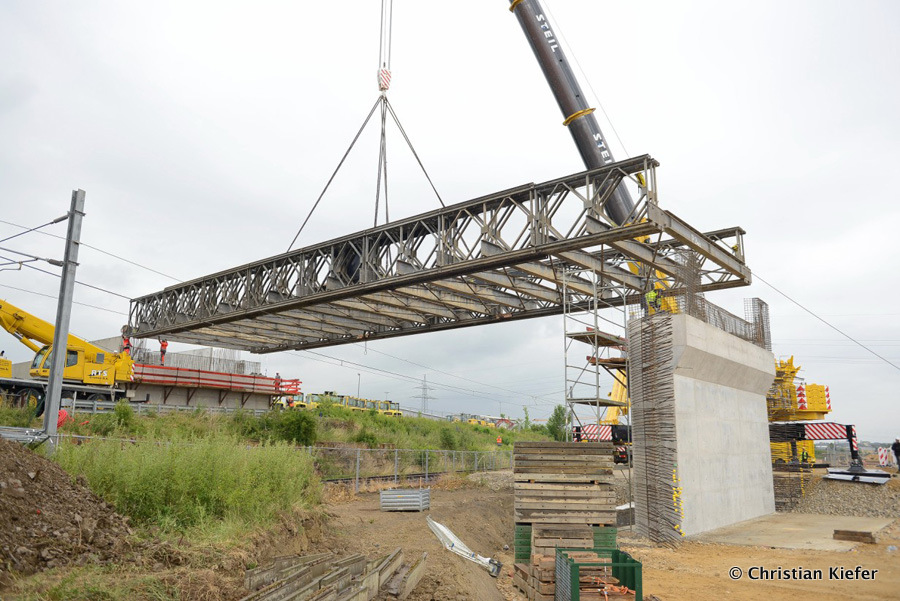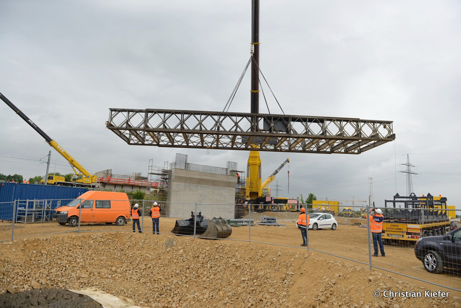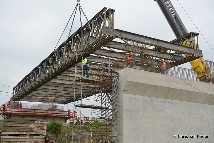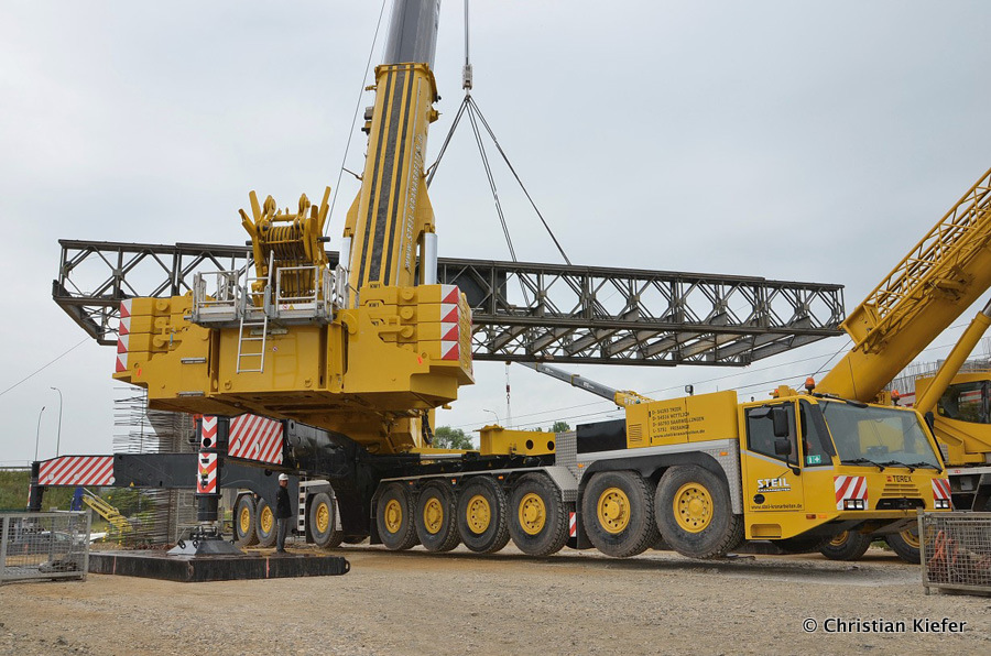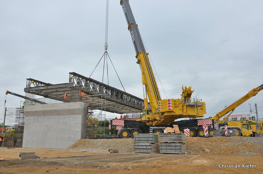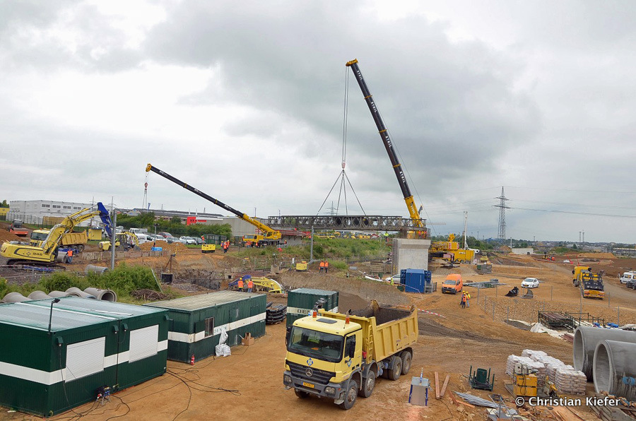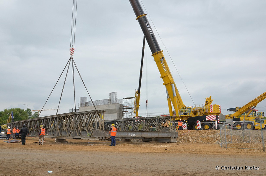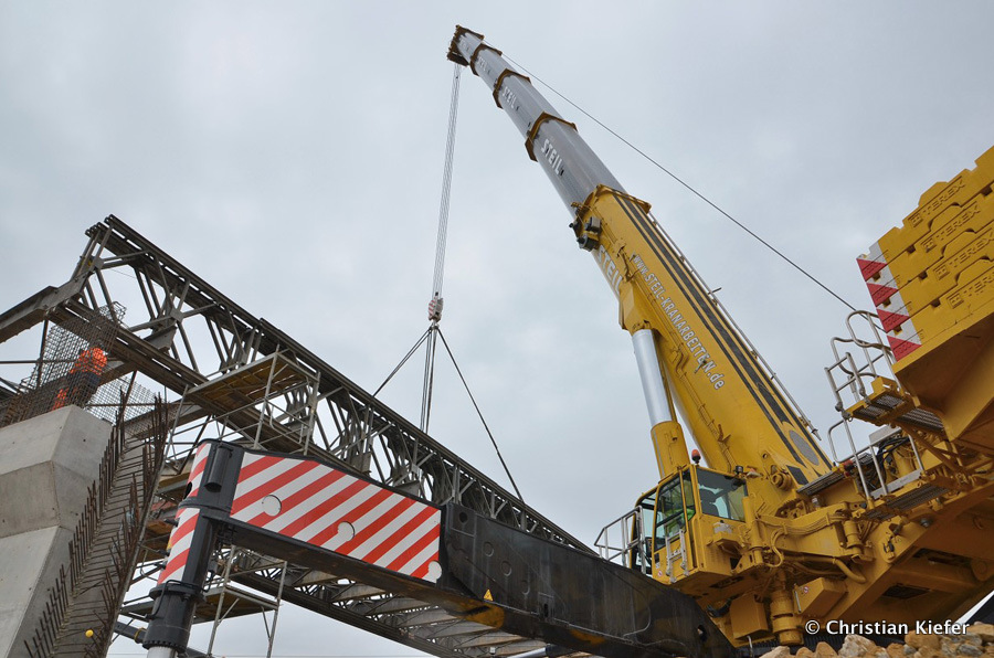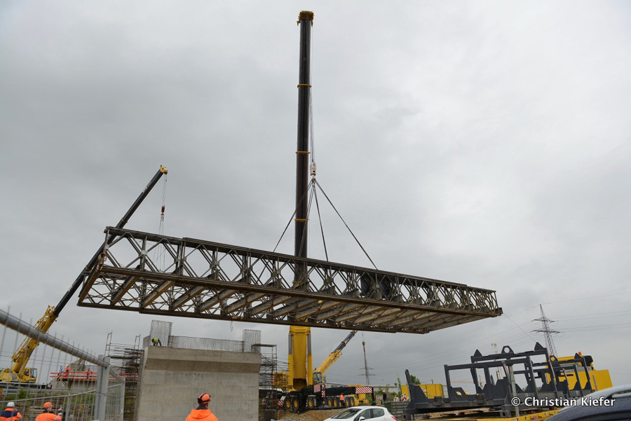 Christian Kiefer konnte in Juni 2014 in Dudelange (Luxemburg) den Brückenhub beobachten und fotografieren, mit dem die Firma Steil beauftragt wurde.