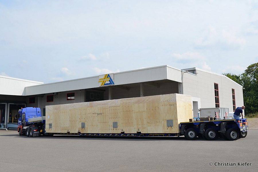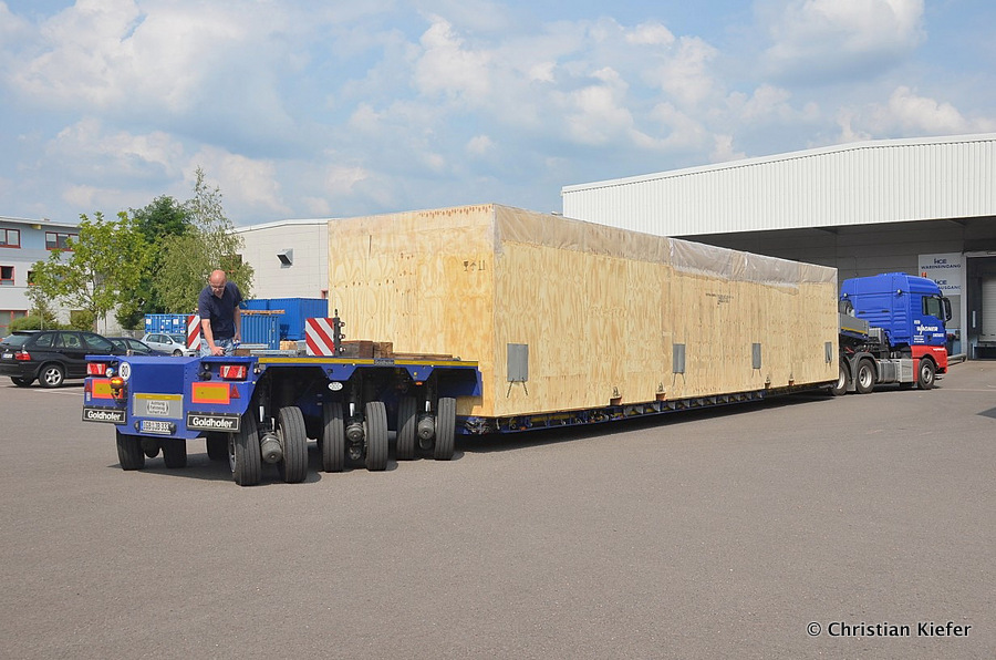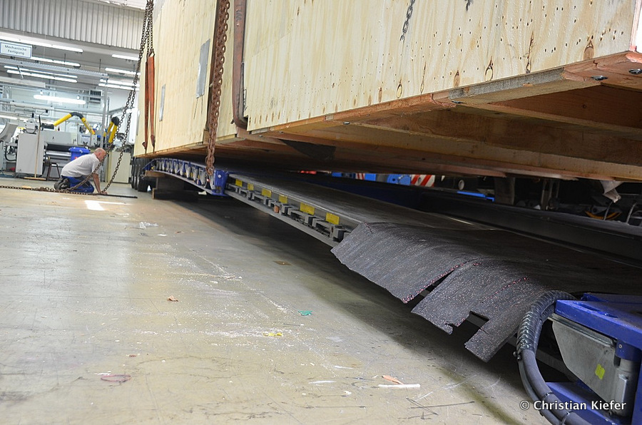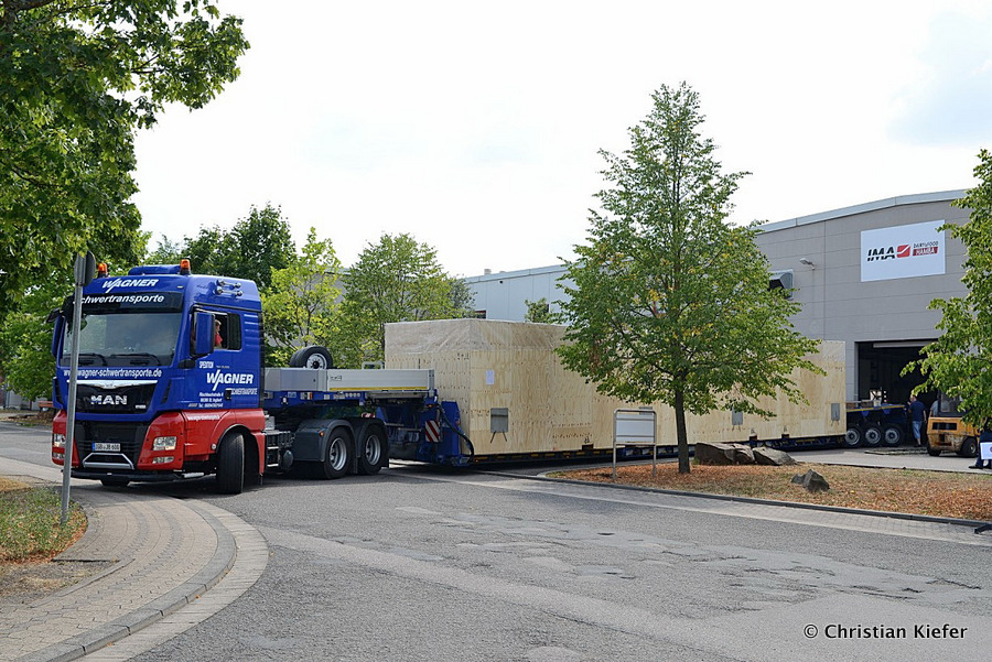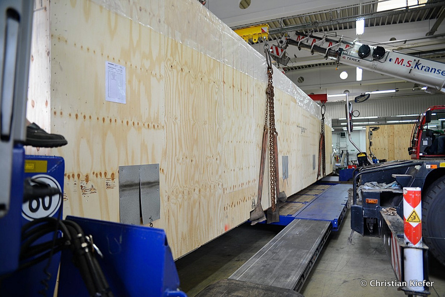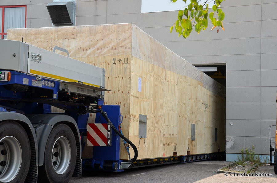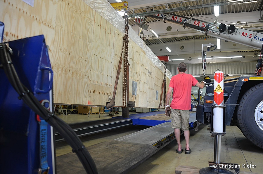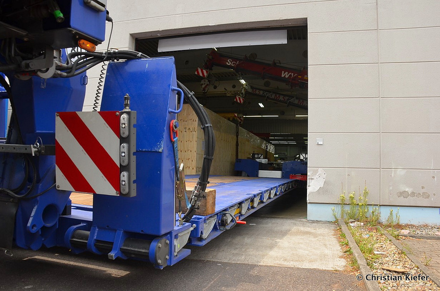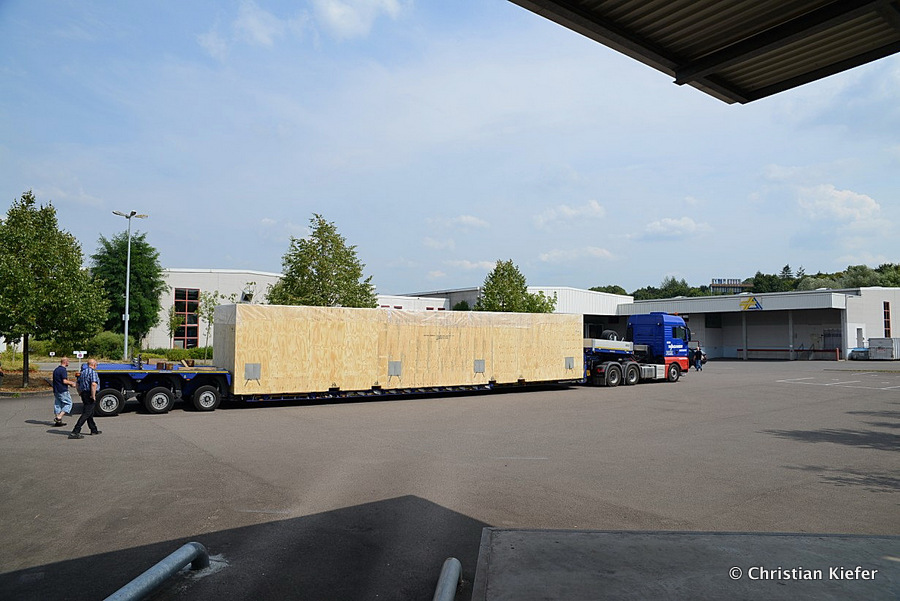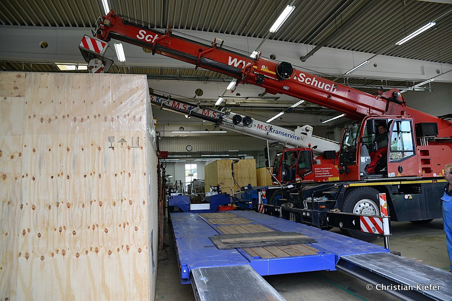 Im Sommer 2015 transportierte die Firma Wagner eine große Kiste mit einem Maschinenteil Das Verladen in der Halle des Herstellers war sehr beengt, ebenso die Ausfahrt aus der Halle.