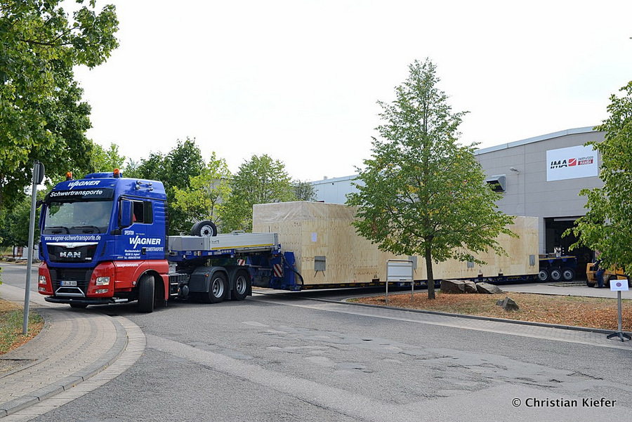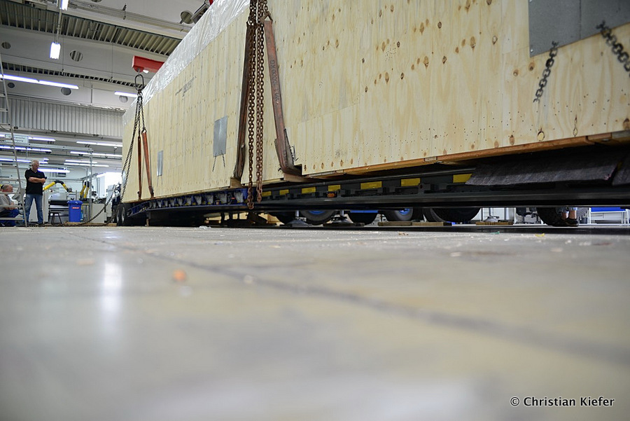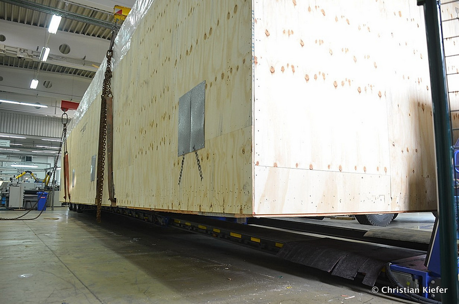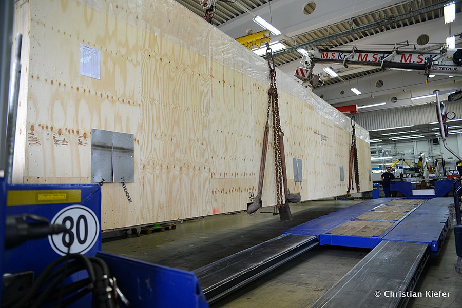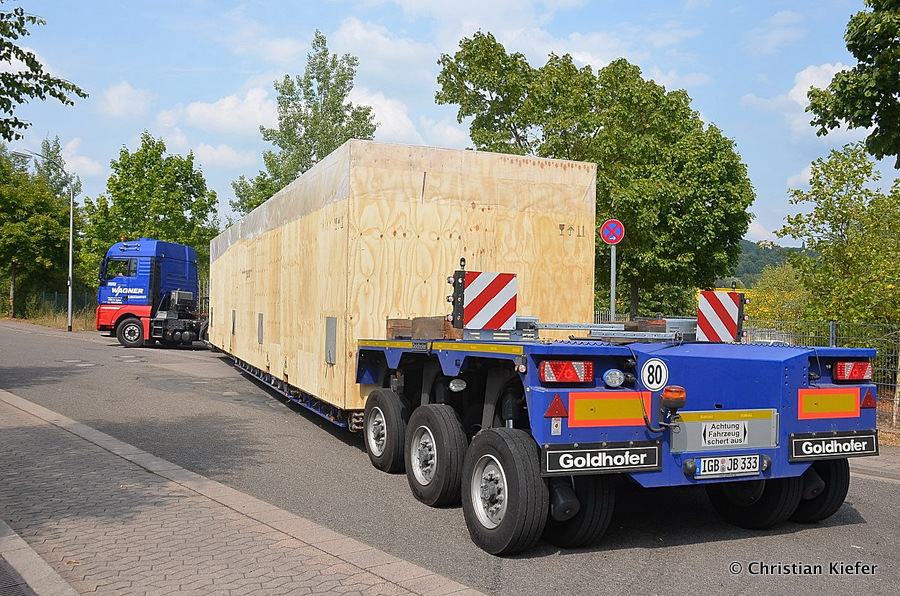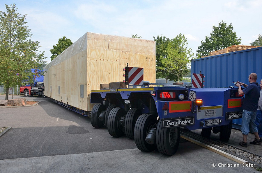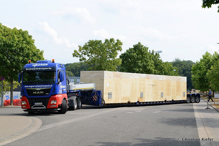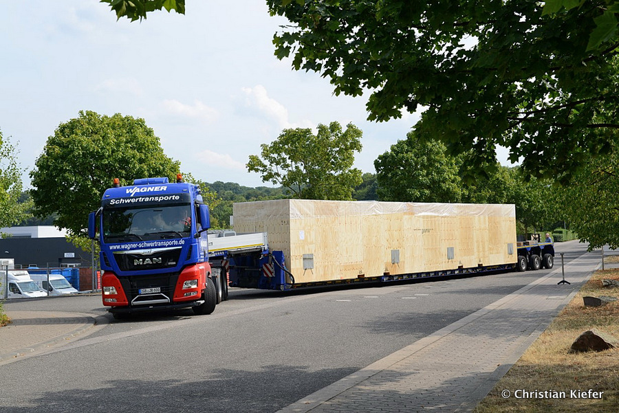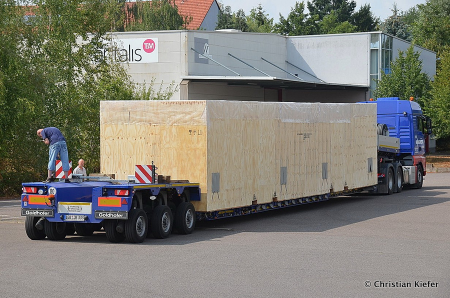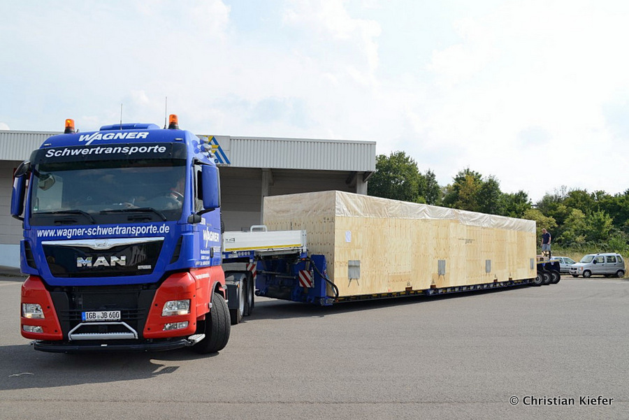 Im Sommer 2015 transportierte die Firma Wagner eine große Kiste mit einem Maschinenteil Das Verladen in der Halle des Herstellers war sehr beengt, ebenso die Ausfahrt aus der Halle.