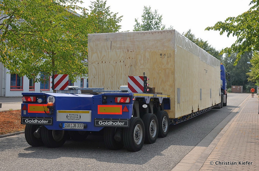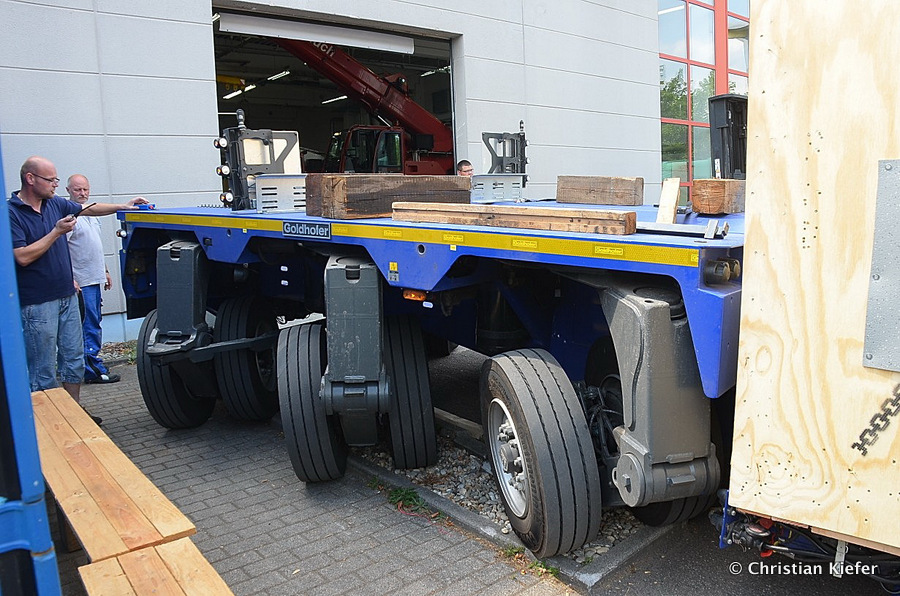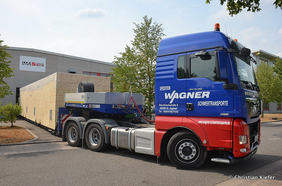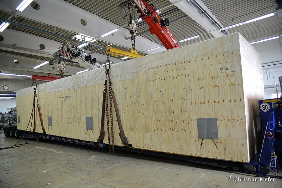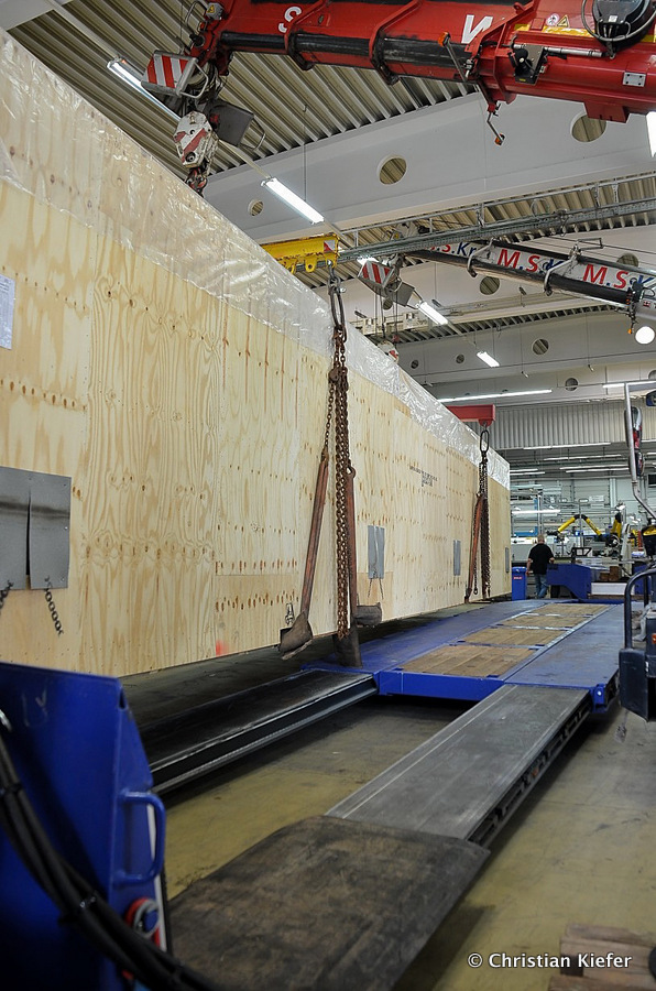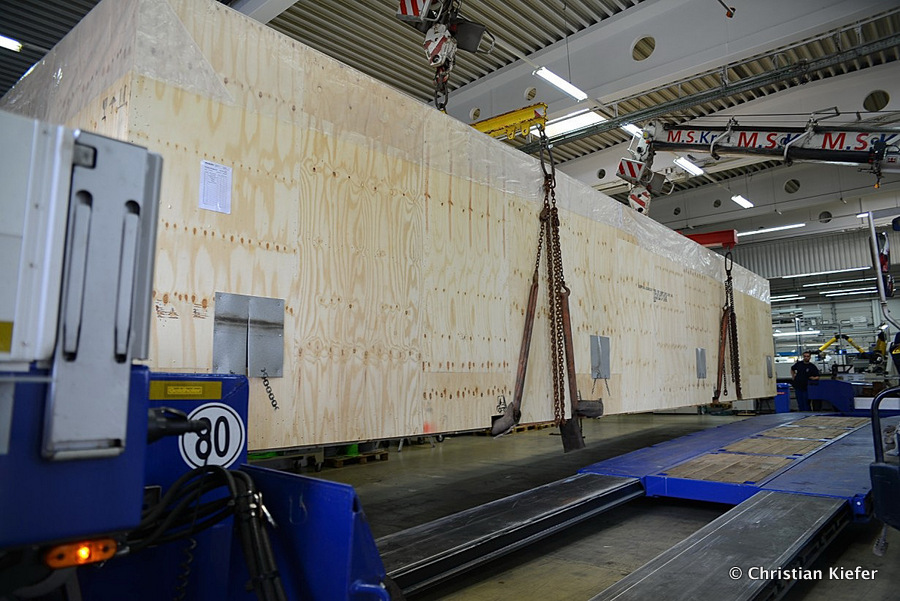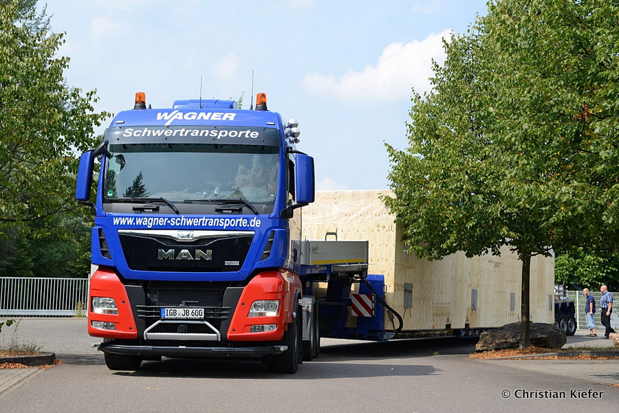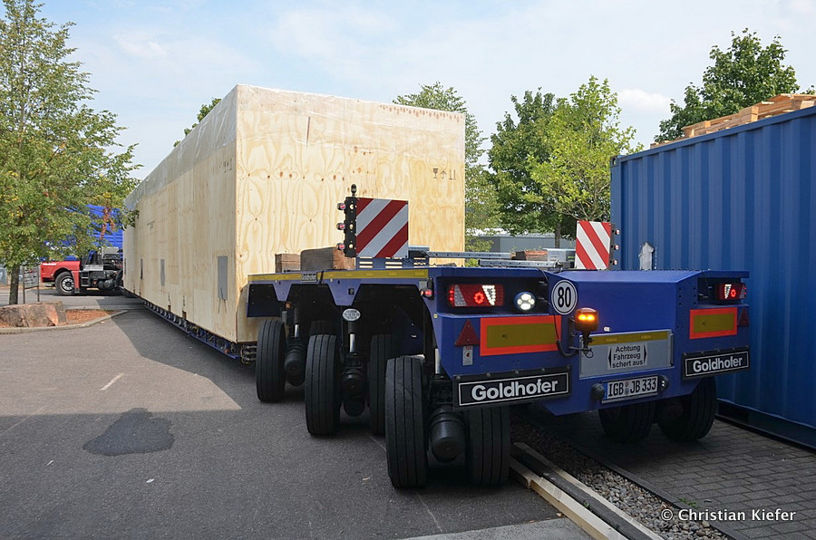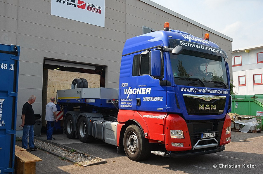 Im Sommer 2015 transportierte die Firma Wagner eine große Kiste mit einem Maschinenteil Das Verladen in der Halle des Herstellers war sehr beengt, ebenso die Ausfahrt aus der Halle.