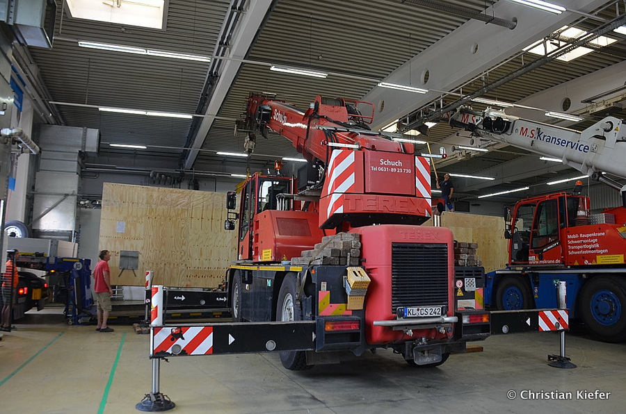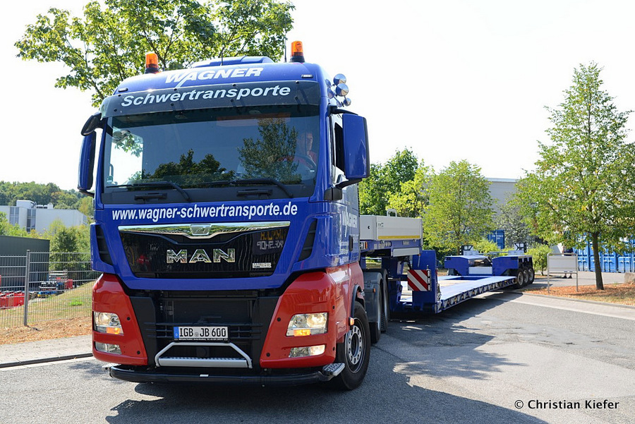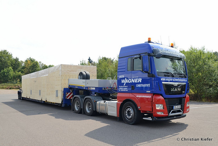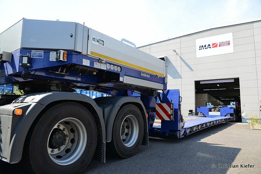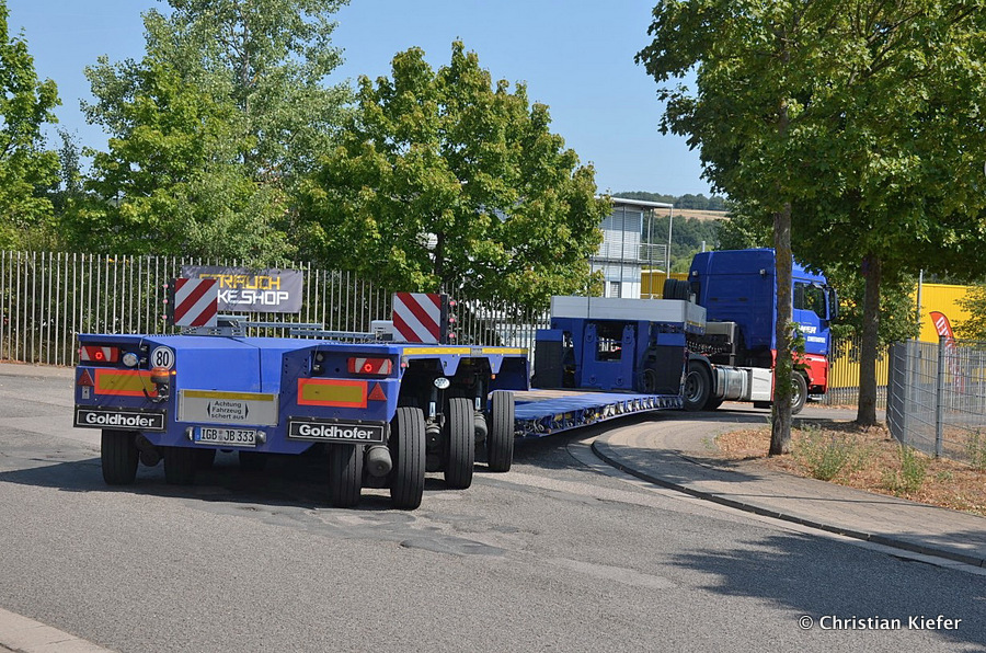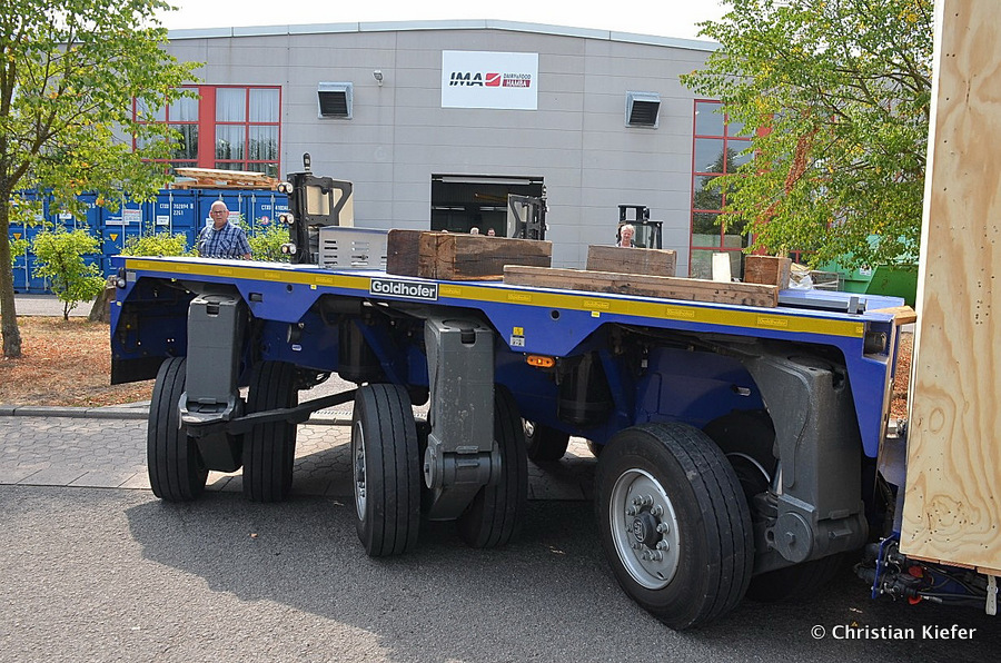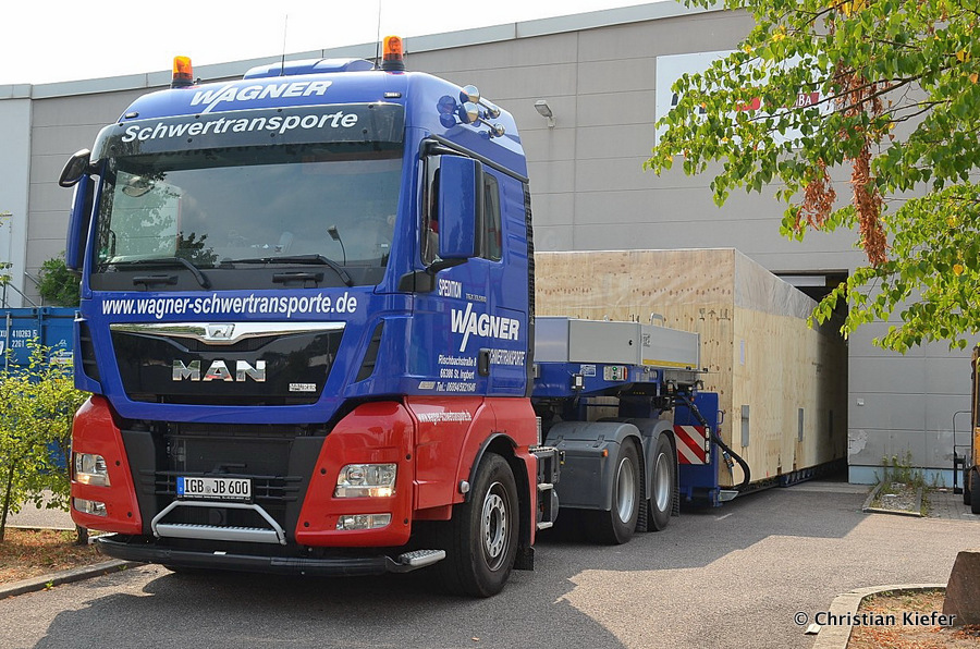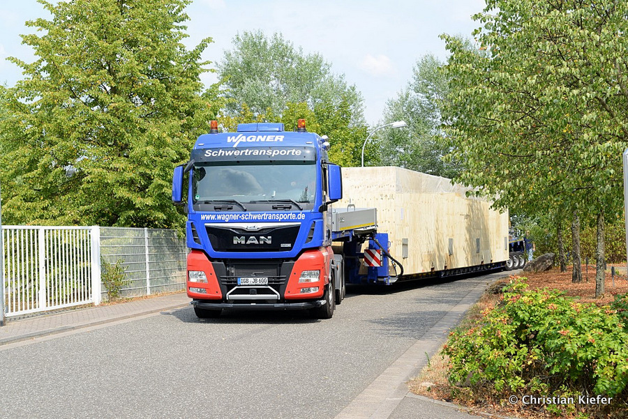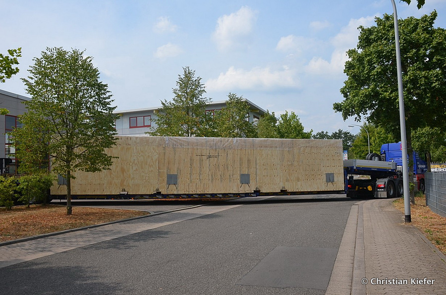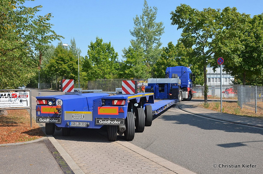 Im Sommer 2015 transportierte die Firma Wagner eine große Kiste mit einem Maschinenteil Das Verladen in der Halle des Herstellers war sehr beengt, ebenso die Ausfahrt aus der Halle.