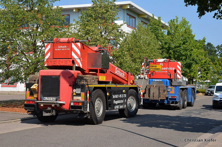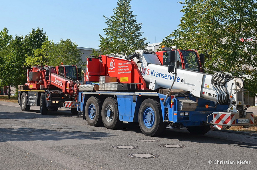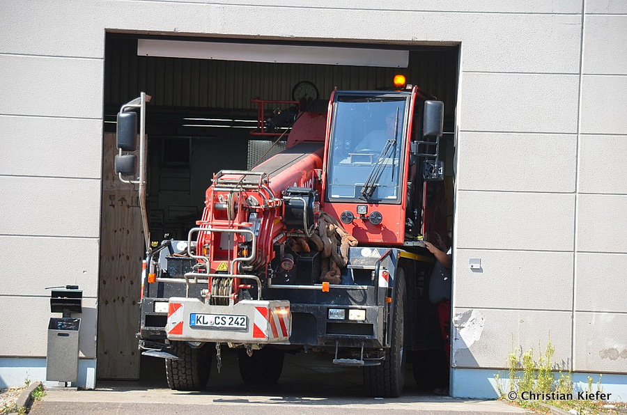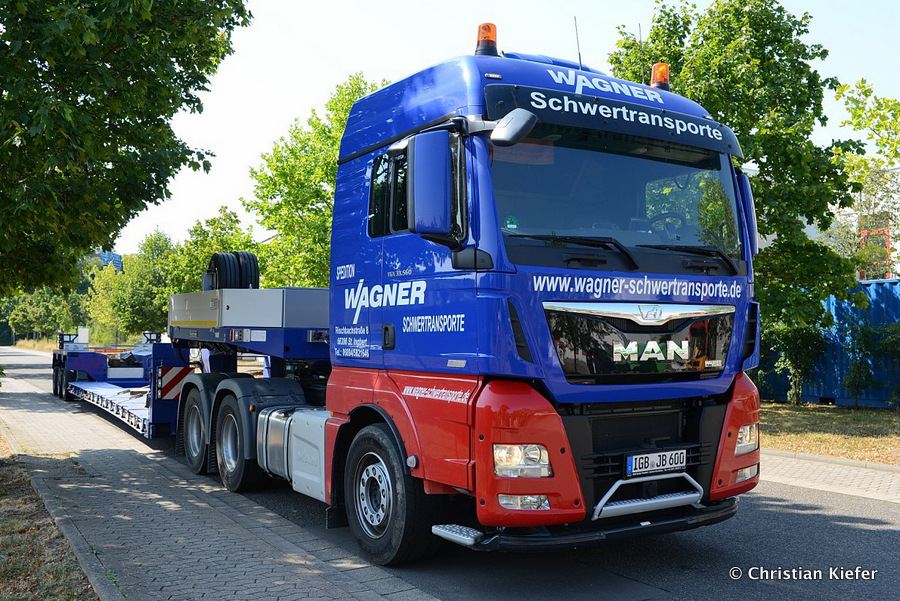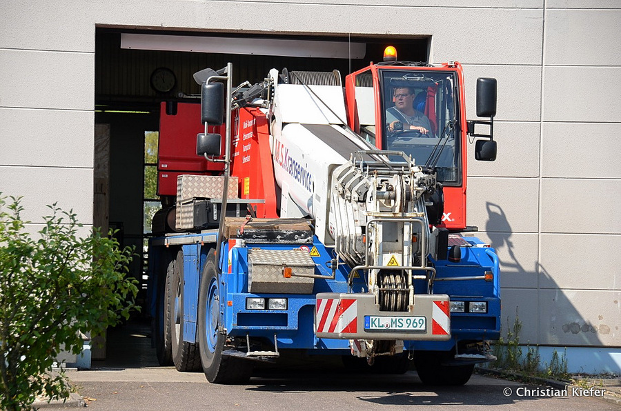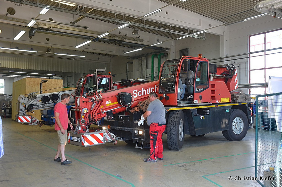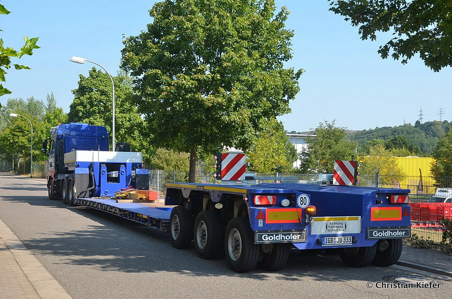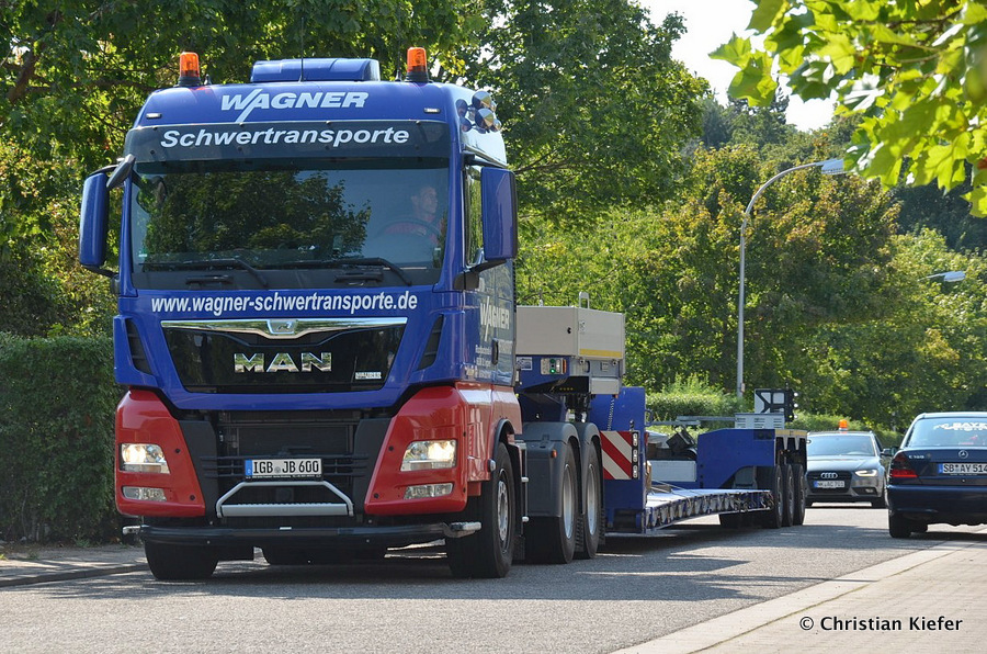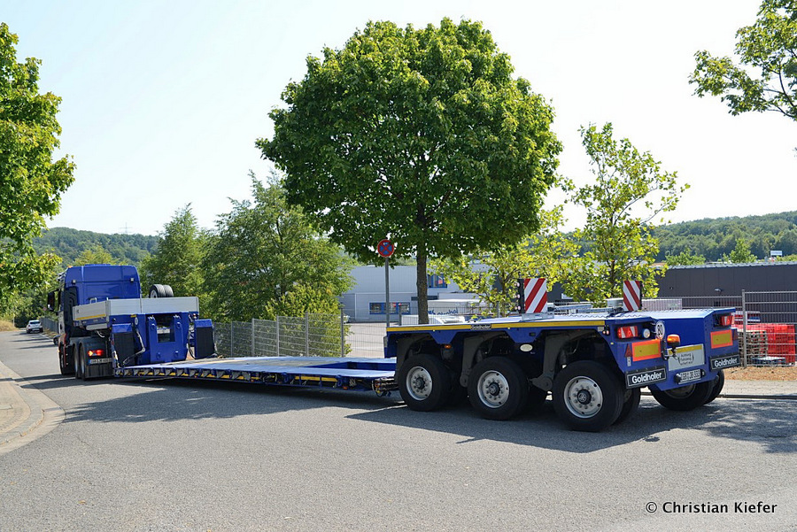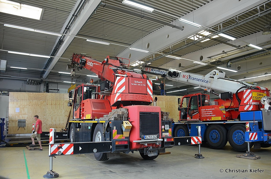 Im Sommer 2015 transportierte die Firma Wagner eine große Kiste mit einem Maschinenteil Das Verladen in der Halle des Herstellers war sehr beengt, ebenso die Ausfahrt aus der Halle.
