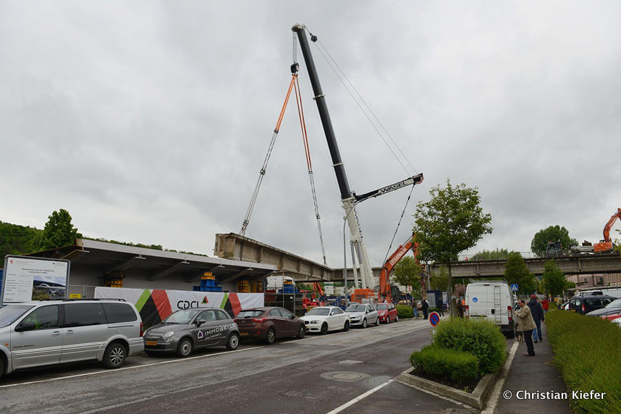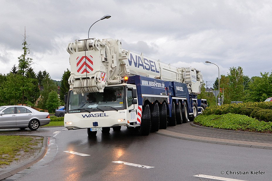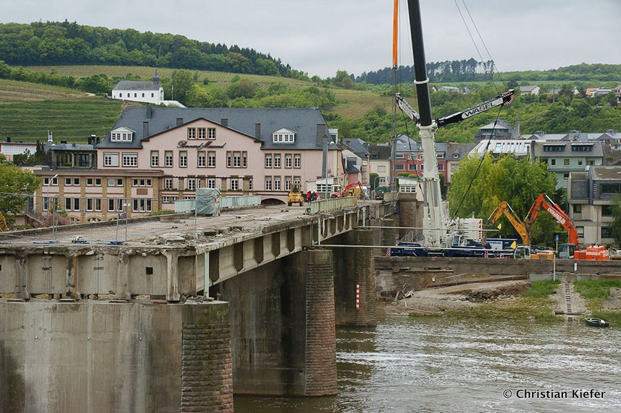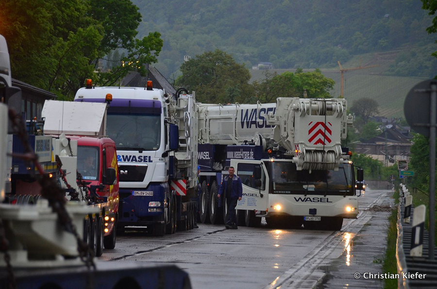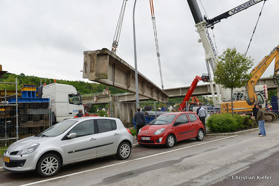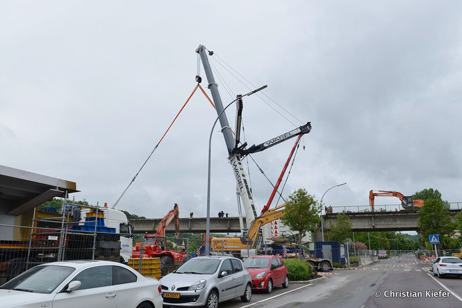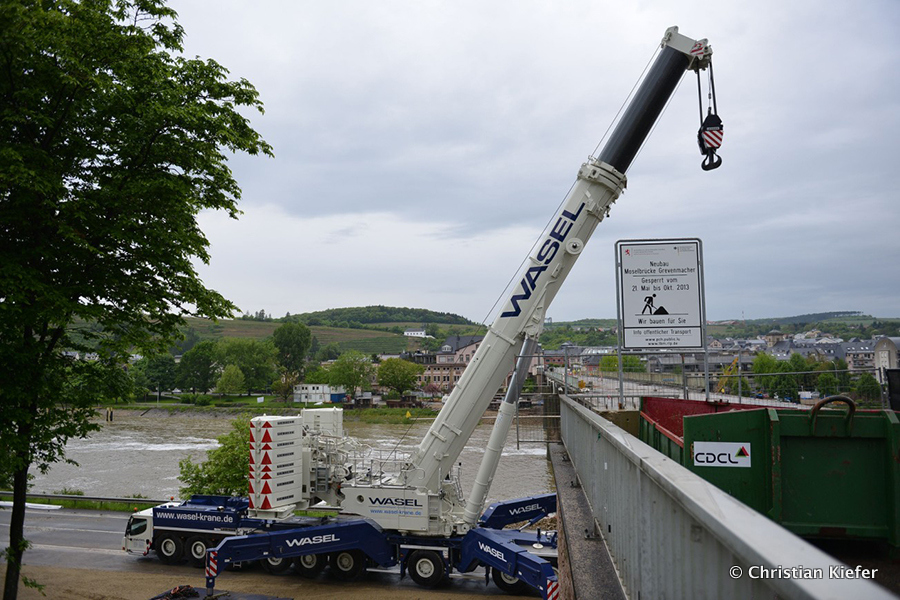 Am 28.05.2013 war der neue Liebherr LTM 1750-9.1 von Wasel im Saarland zu sehen. Die Grenzbrücke über die Mosel, die Grevenmacher (Luxemburg) mit Wellen (Deutschland) verbindet, wurde abgerissen. Die Bilder sind von Christian Kiefer, der vor Ort war.