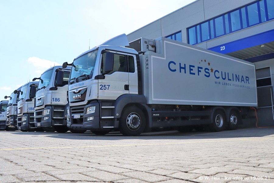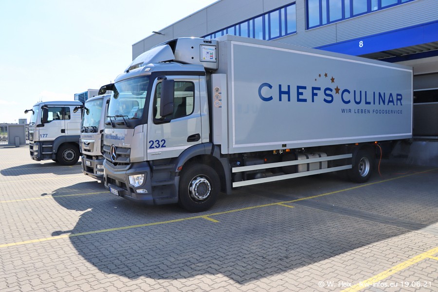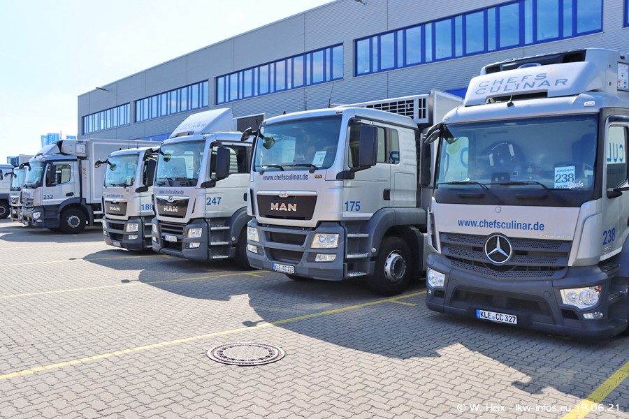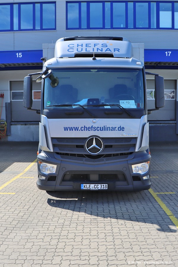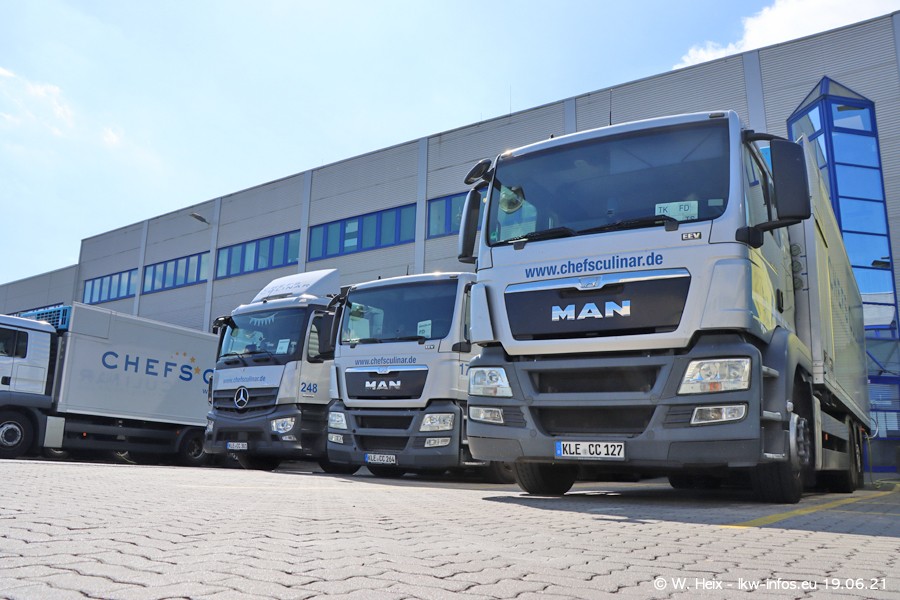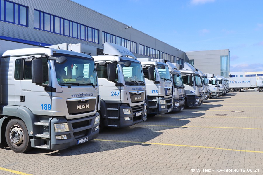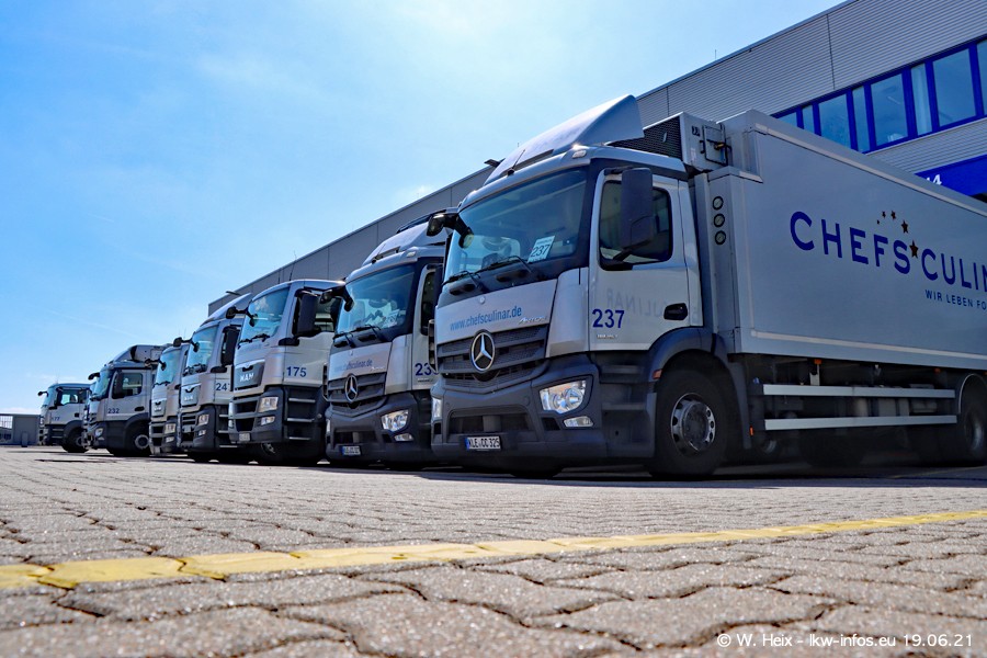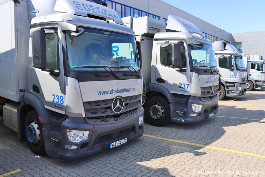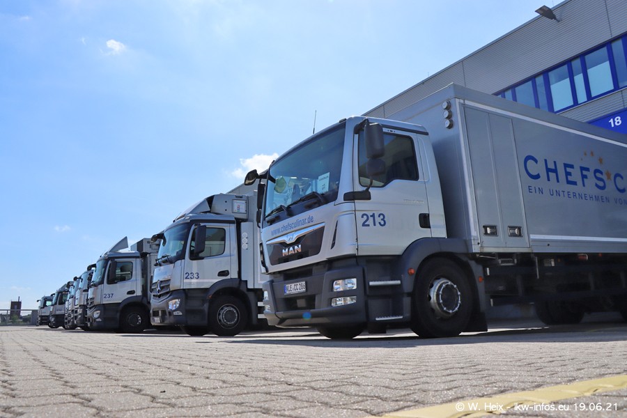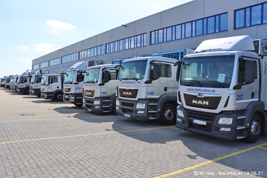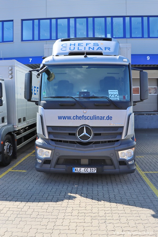 Nach fast genau einem Jahr war ich wieder bei CHEFS CULINAR West. Der Fuhrpark besteht aus knapp 150 Fahrzeugen. Seit dem letzten Besuch wurden viele alte Fahrzeuge durch neue ersetzt, das sind bei den 12-Tonnern MAN TGL und bei den größeren Mercedes-Benz Actros. Von den gelb-blauen alten JOMO-LKW sind jetzt noch 14 Stück vorhanden, also bald ist der Fuhrpark komplett auf das silbergraue Design umgestellt. Die letzten neuen LKW sind daran zu erkennen, dass sie noch keine Kennzeichen tragen.