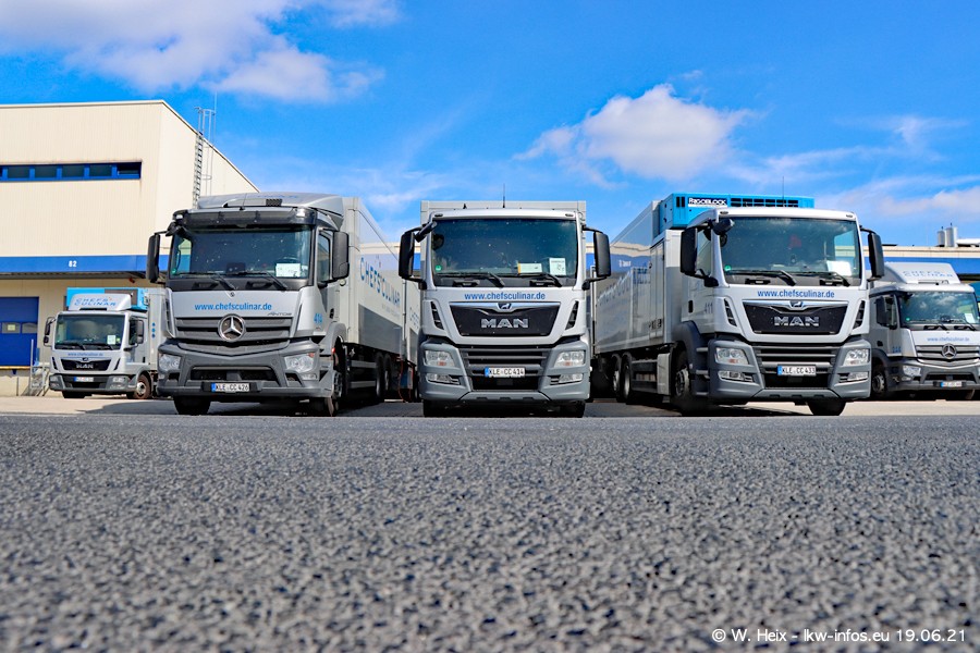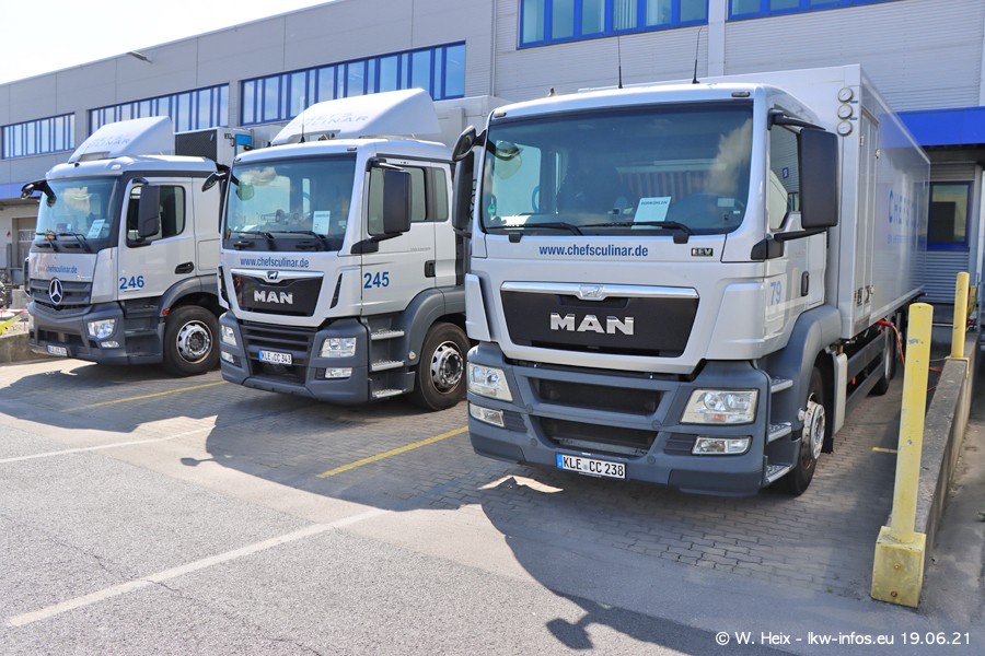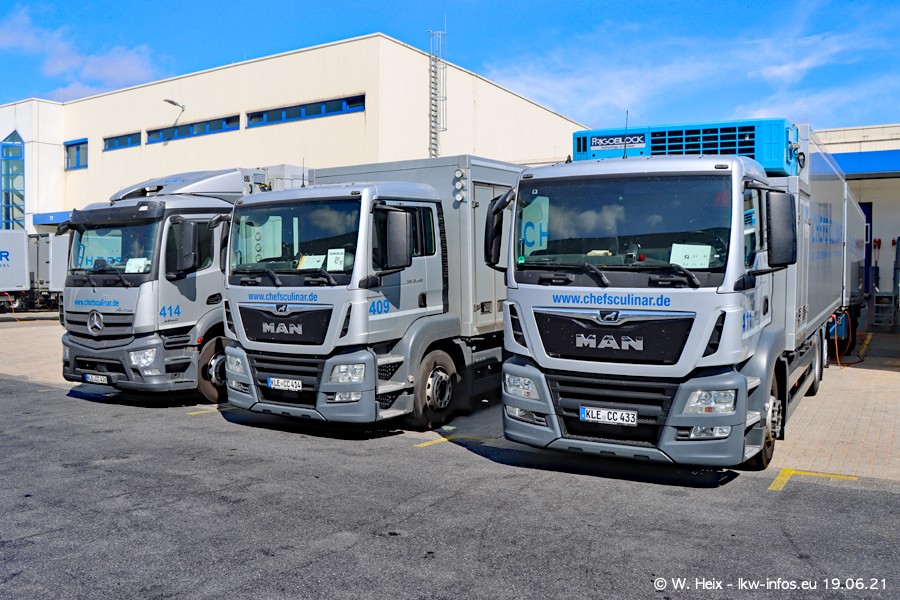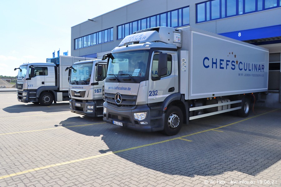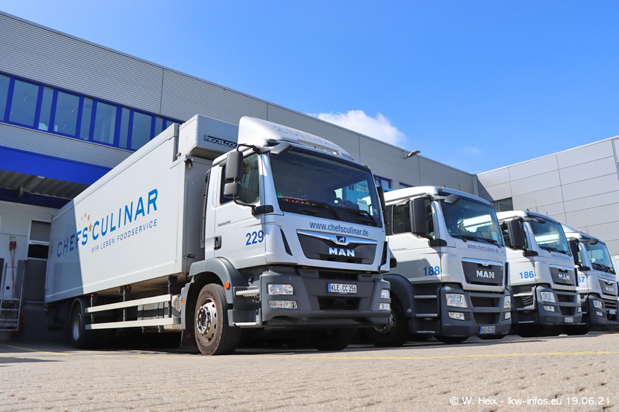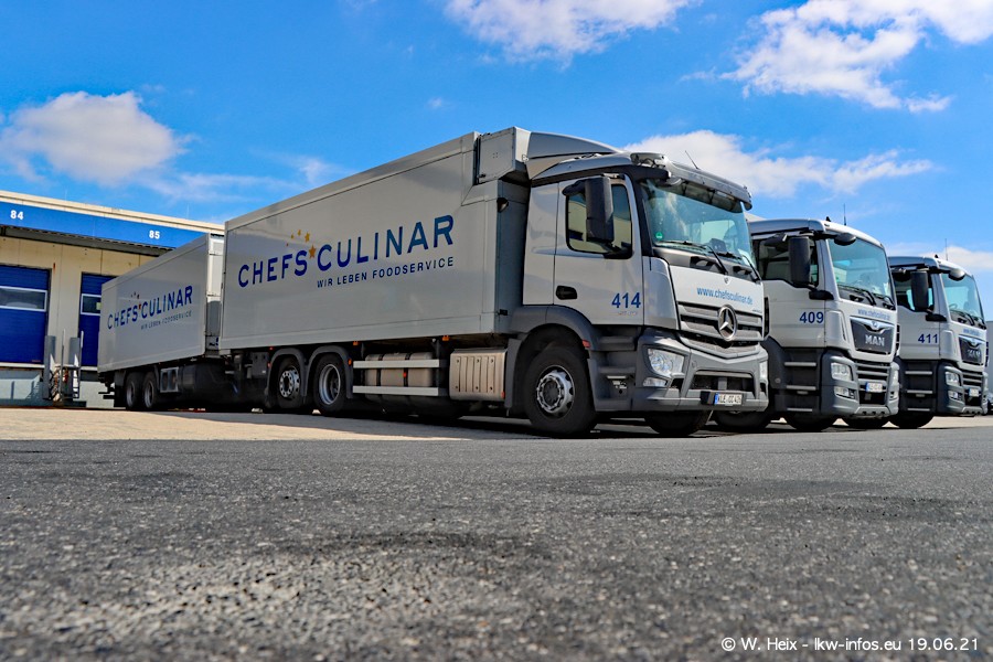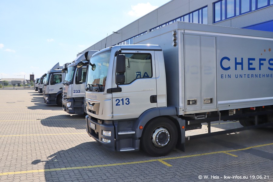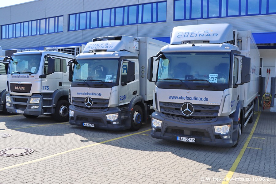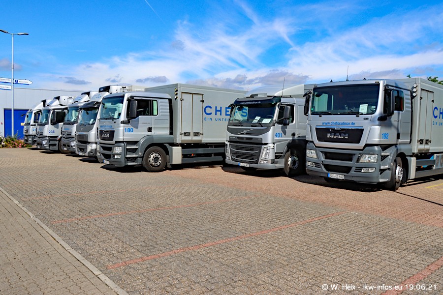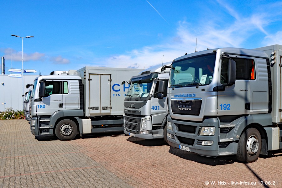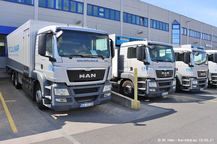 Nach fast genau einem Jahr war ich wieder bei CHEFS CULINAR West. Der Fuhrpark besteht aus knapp 150 Fahrzeugen. Seit dem letzten Besuch wurden viele alte Fahrzeuge durch neue ersetzt, das sind bei den 12-Tonnern MAN TGL und bei den größeren Mercedes-Benz Actros. Von den gelb-blauen alten JOMO-LKW sind jetzt noch 14 Stück vorhanden, also bald ist der Fuhrpark komplett auf das silbergraue Design umgestellt. Die letzten neuen LKW sind daran zu erkennen, dass sie noch keine Kennzeichen tragen.