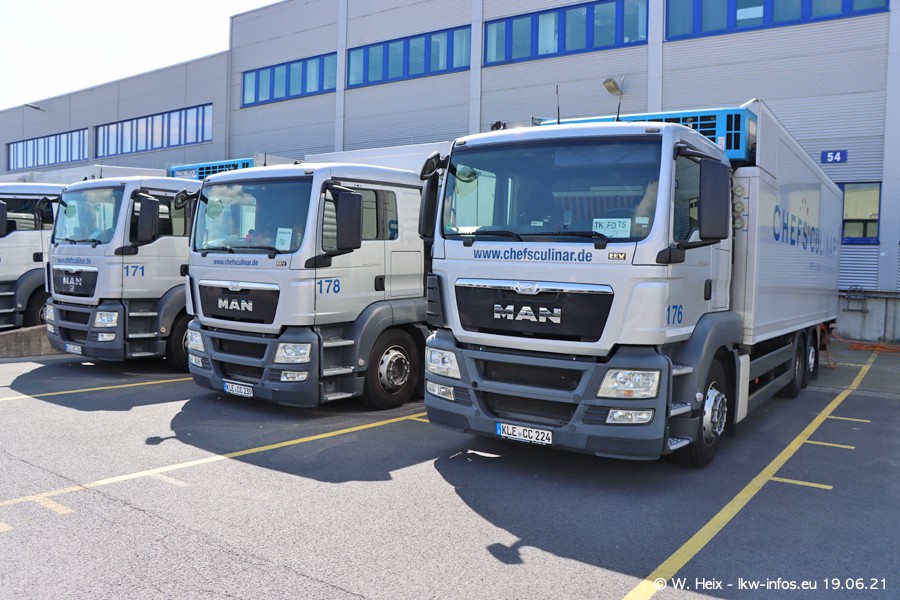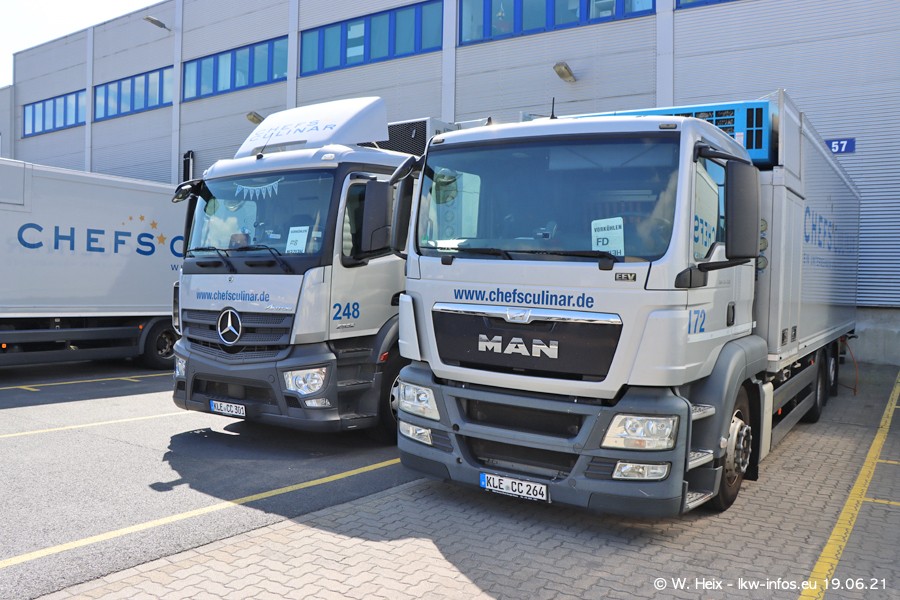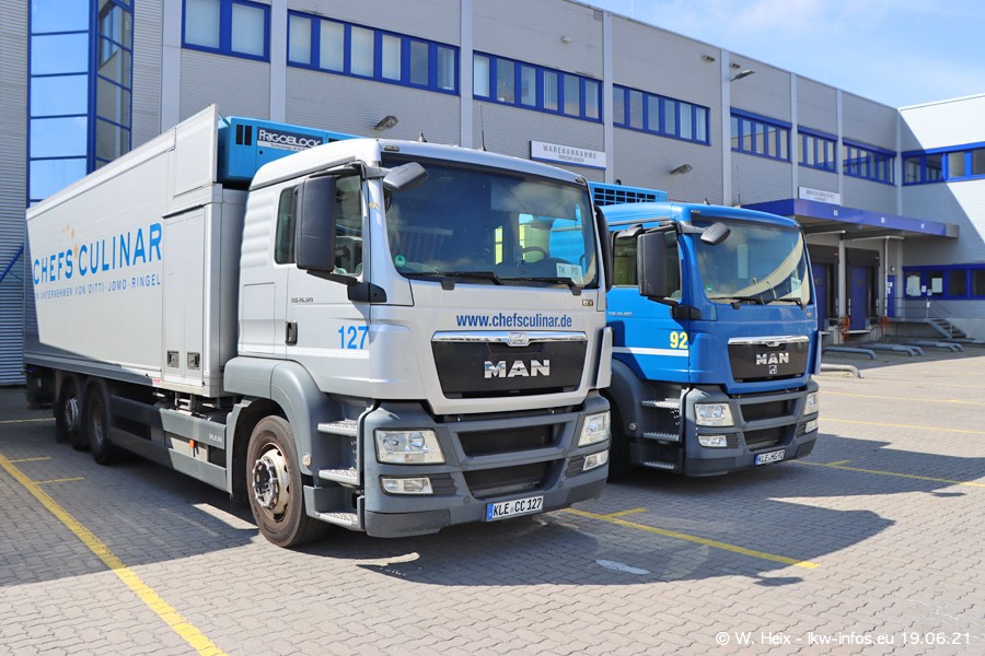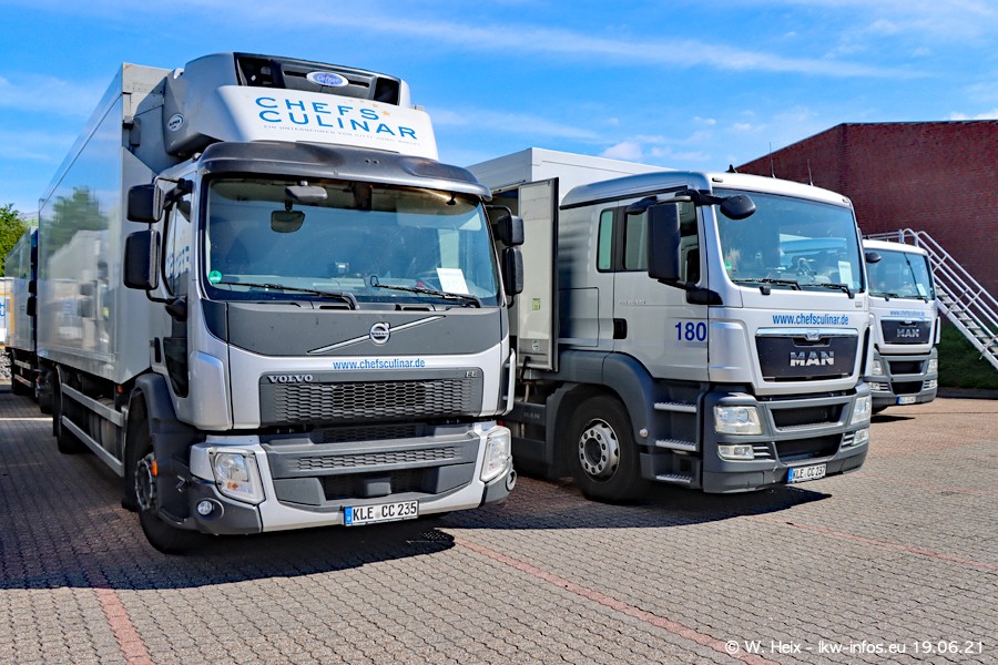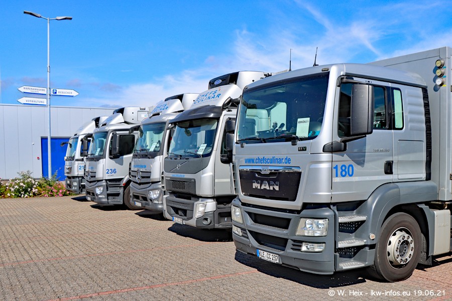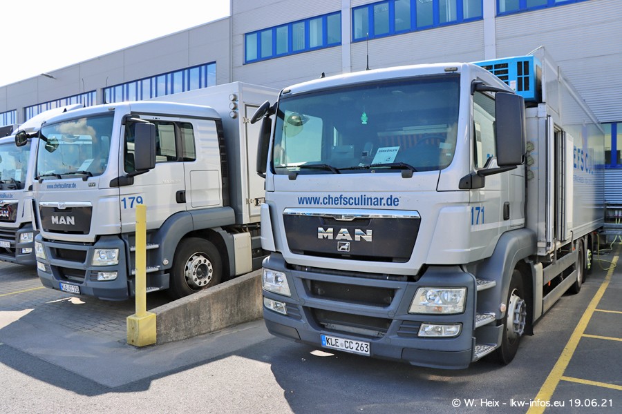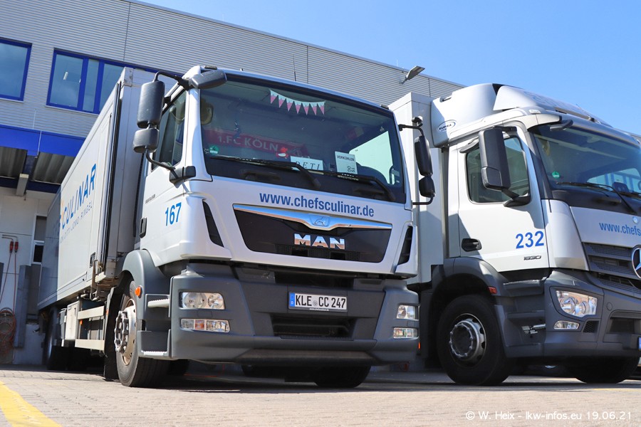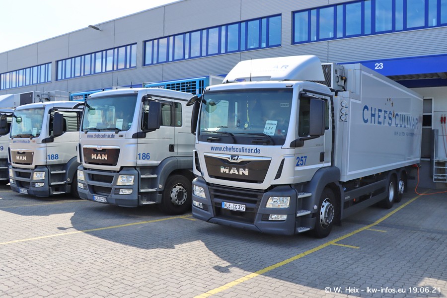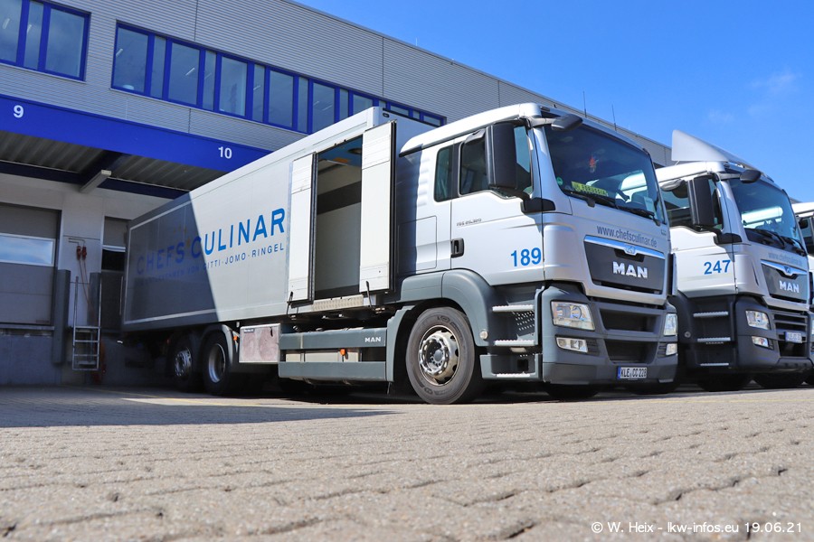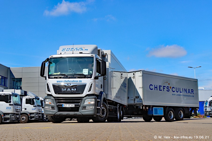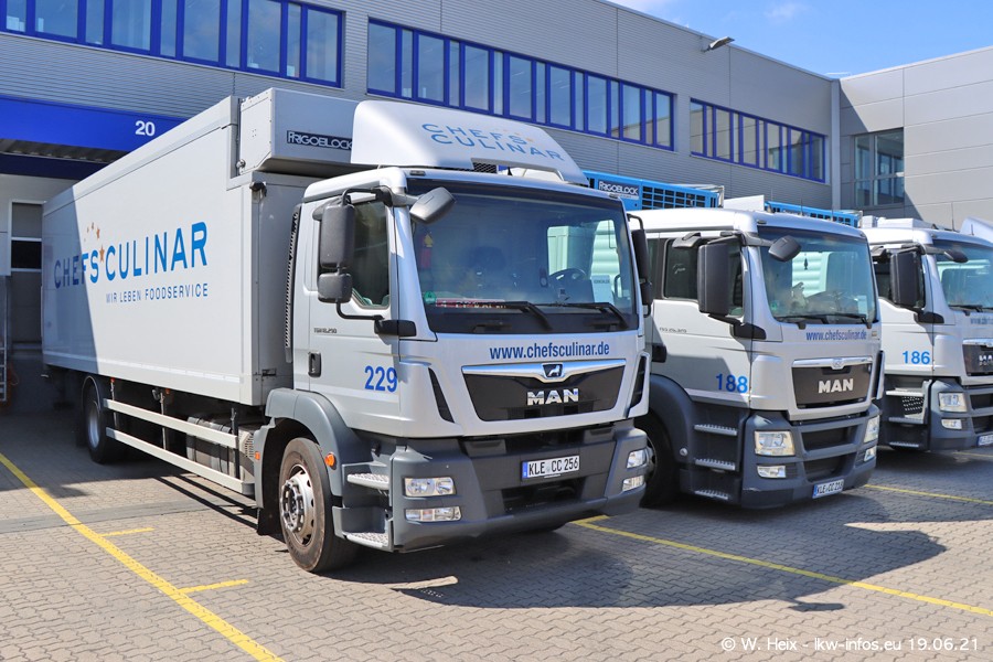Nach fast genau einem Jahr war ich wieder bei CHEFS CULINAR West. Der Fuhrpark besteht aus knapp 150 Fahrzeugen. Seit dem letzten Besuch wurden viele alte Fahrzeuge durch neue ersetzt, das sind bei den 12-Tonnern MAN TGL und bei den größeren Mercedes-Benz Actros. Von den gelb-blauen alten JOMO-LKW sind jetzt noch 14 Stück vorhanden, also bald ist der Fuhrpark komplett auf das silbergraue Design umgestellt. Die letzten neuen LKW sind daran zu erkennen, dass sie noch keine Kennzeichen tragen.