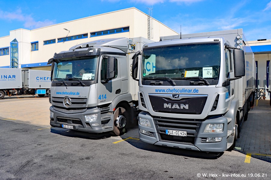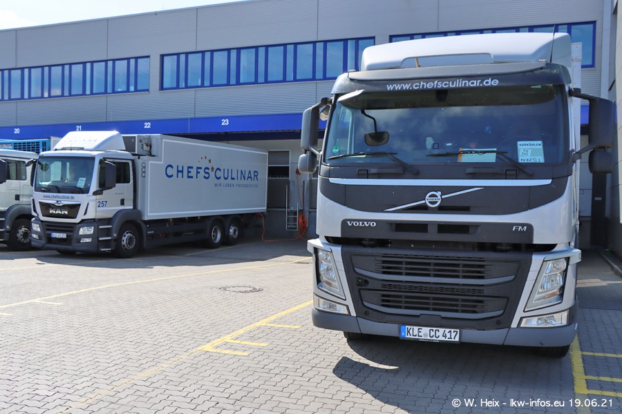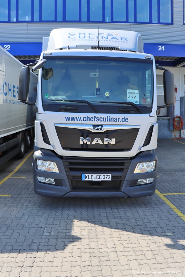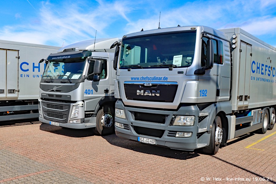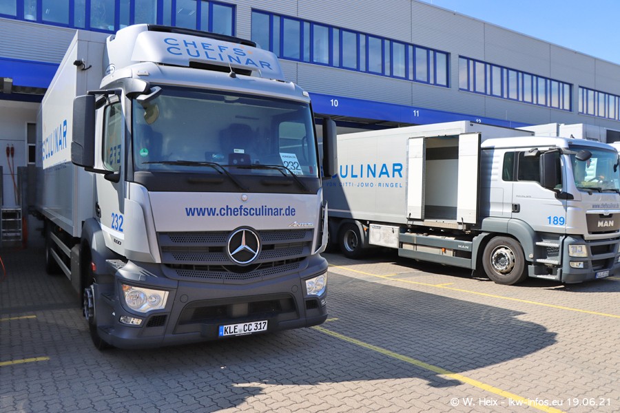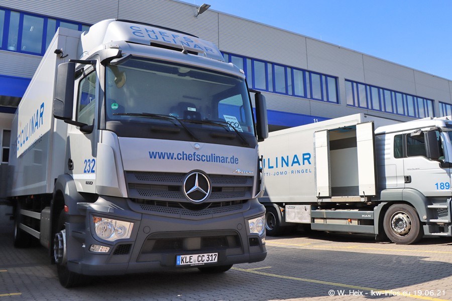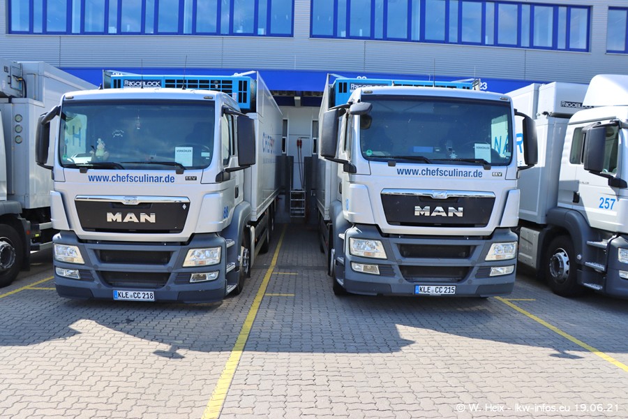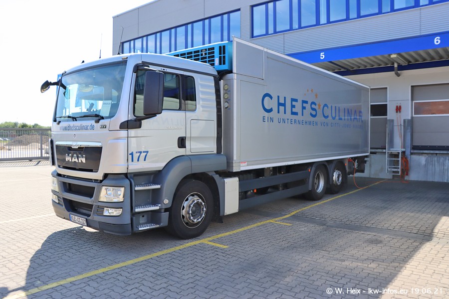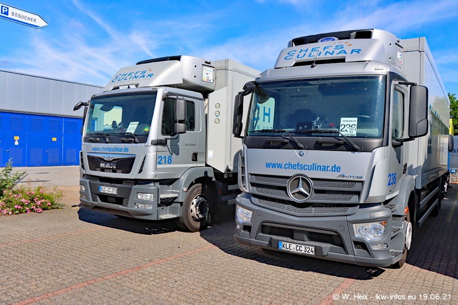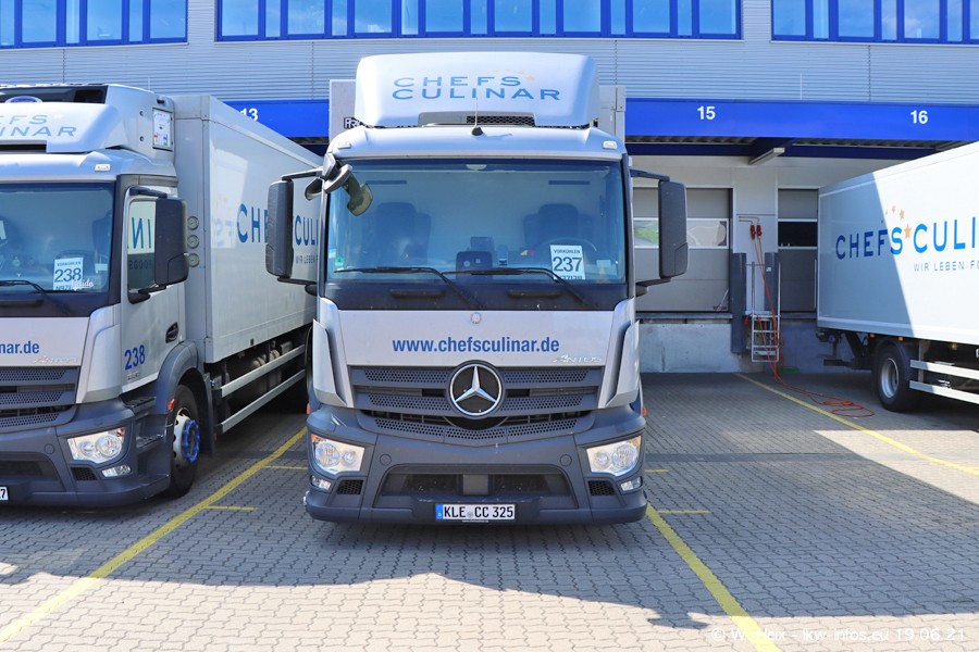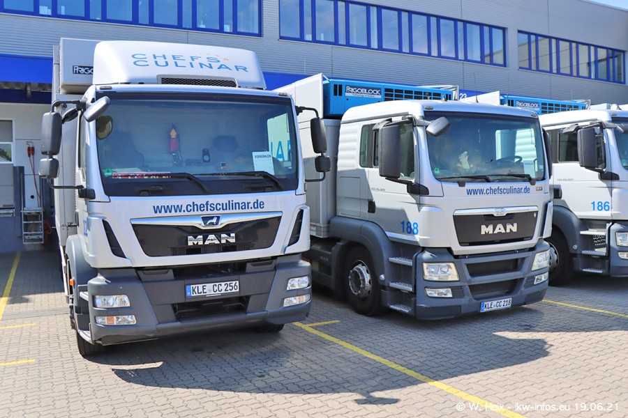 Nach fast genau einem Jahr war ich wieder bei CHEFS CULINAR West. Der Fuhrpark besteht aus knapp 150 Fahrzeugen. Seit dem letzten Besuch wurden viele alte Fahrzeuge durch neue ersetzt, das sind bei den 12-Tonnern MAN TGL und bei den größeren Mercedes-Benz Actros. Von den gelb-blauen alten JOMO-LKW sind jetzt noch 14 Stück vorhanden, also bald ist der Fuhrpark komplett auf das silbergraue Design umgestellt. Die letzten neuen LKW sind daran zu erkennen, dass sie noch keine Kennzeichen tragen.