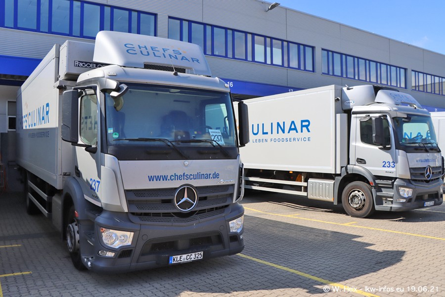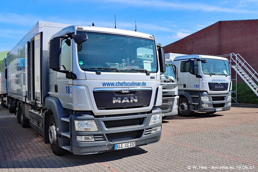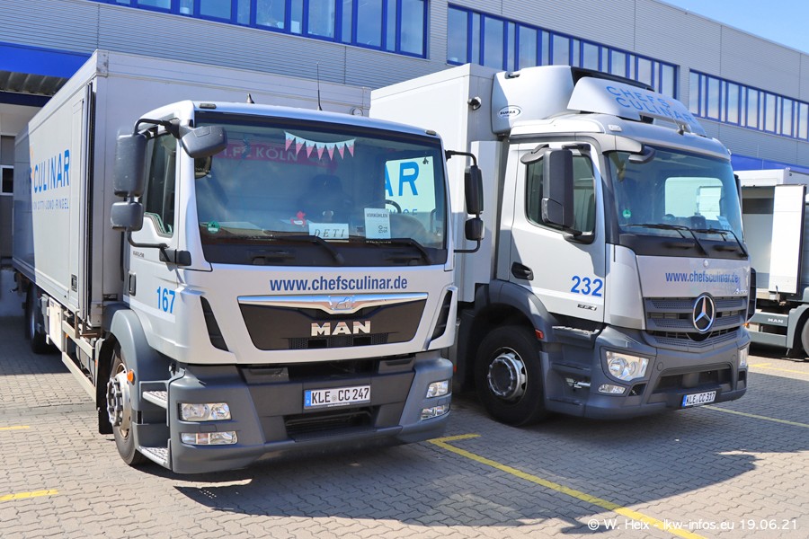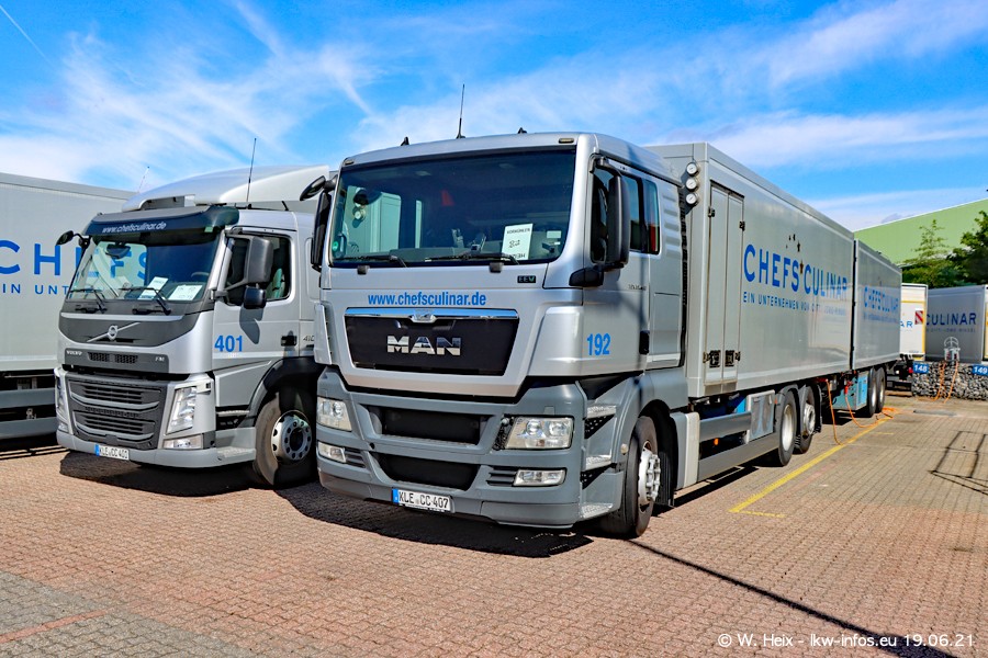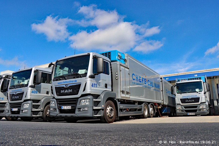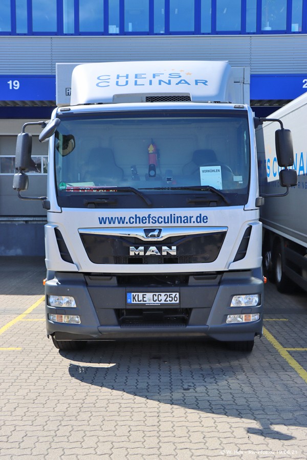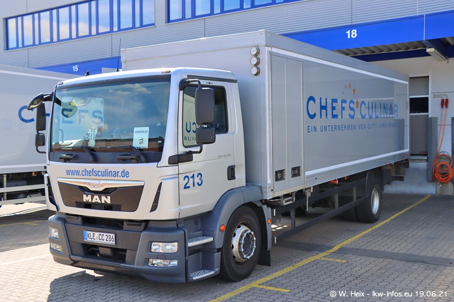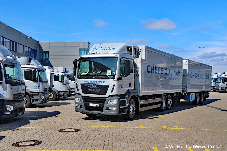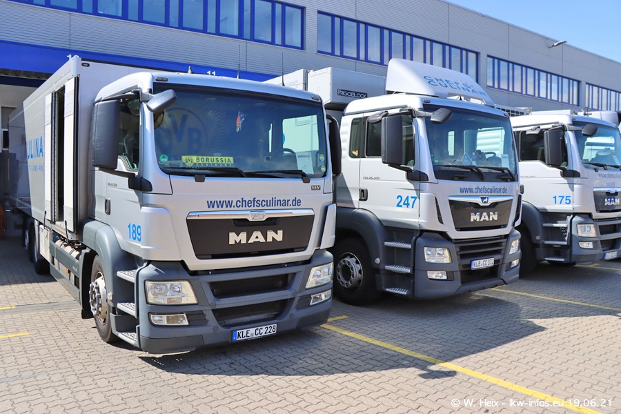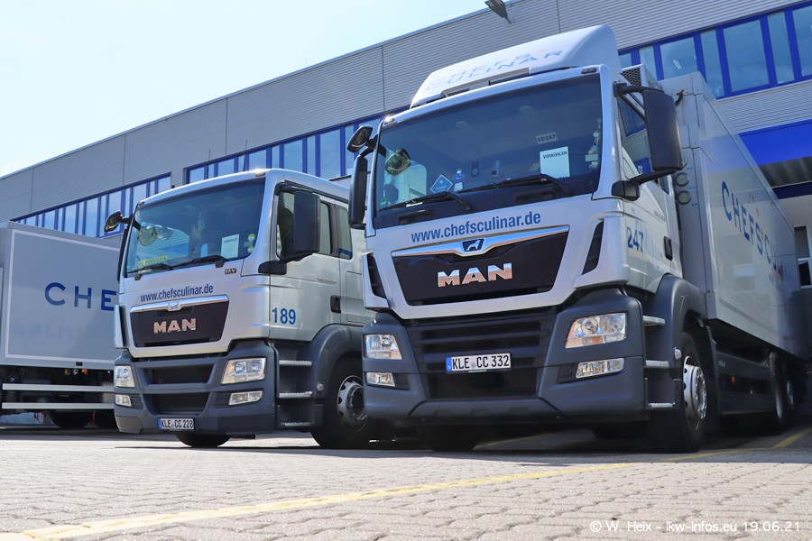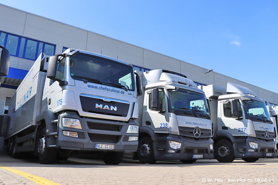 Nach fast genau einem Jahr war ich wieder bei CHEFS CULINAR West. Der Fuhrpark besteht aus knapp 150 Fahrzeugen. Seit dem letzten Besuch wurden viele alte Fahrzeuge durch neue ersetzt, das sind bei den 12-Tonnern MAN TGL und bei den größeren Mercedes-Benz Actros. Von den gelb-blauen alten JOMO-LKW sind jetzt noch 14 Stück vorhanden, also bald ist der Fuhrpark komplett auf das silbergraue Design umgestellt. Die letzten neuen LKW sind daran zu erkennen, dass sie noch keine Kennzeichen tragen.