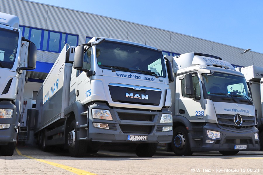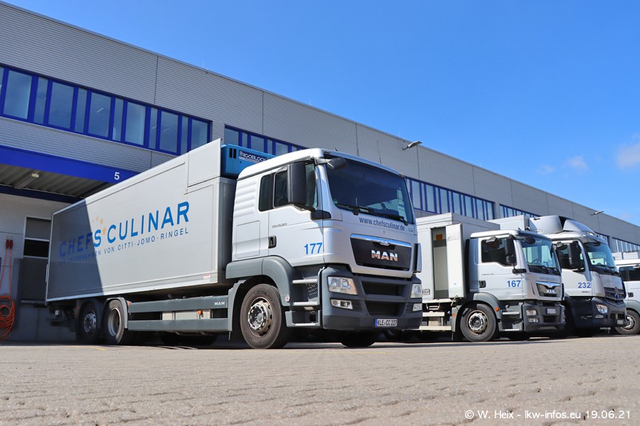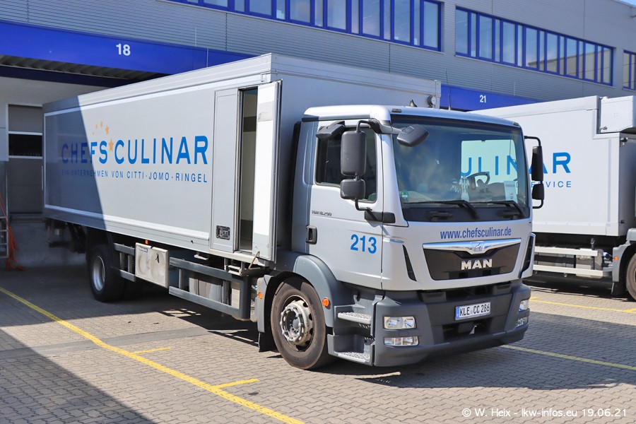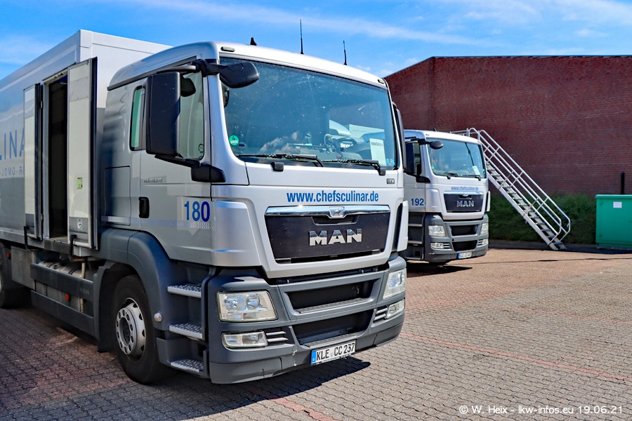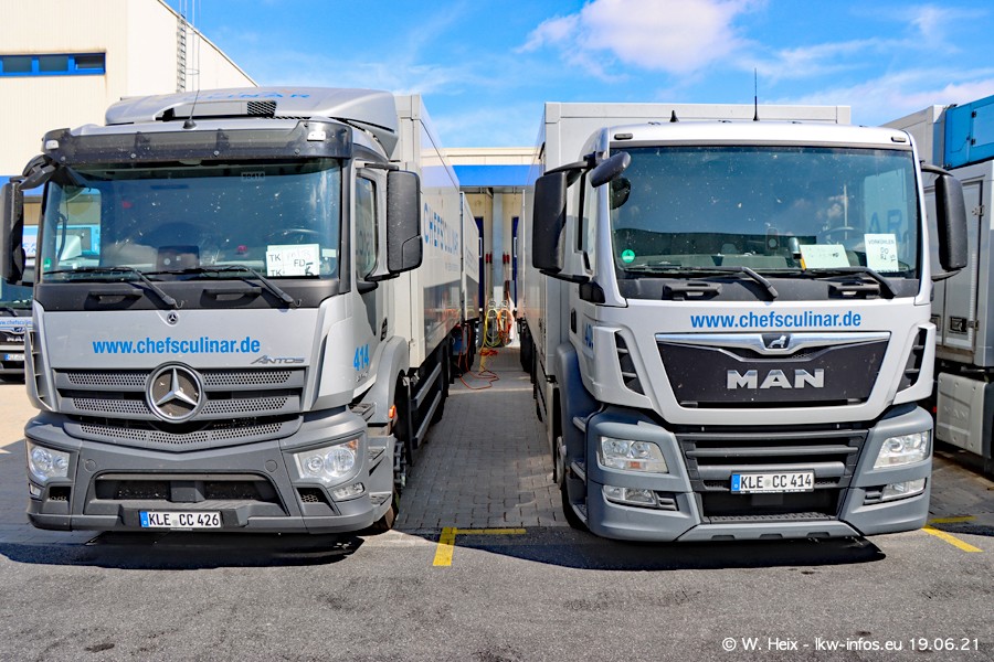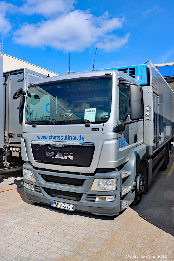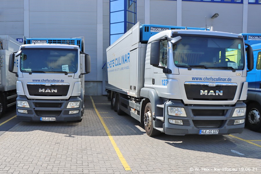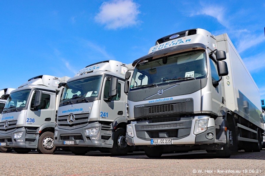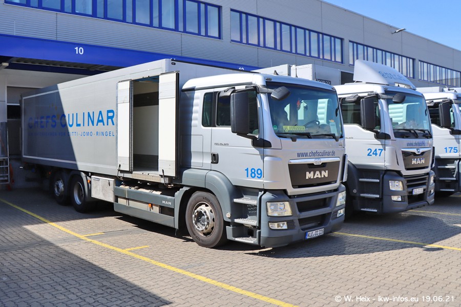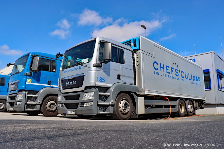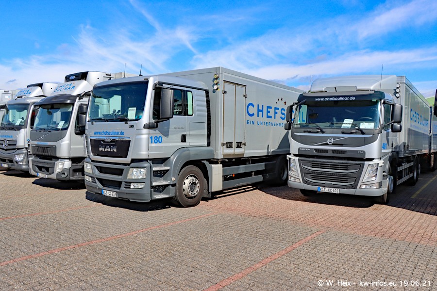 Nach fast genau einem Jahr war ich wieder bei CHEFS CULINAR West. Der Fuhrpark besteht aus knapp 150 Fahrzeugen. Seit dem letzten Besuch wurden viele alte Fahrzeuge durch neue ersetzt, das sind bei den 12-Tonnern MAN TGL und bei den größeren Mercedes-Benz Actros. Von den gelb-blauen alten JOMO-LKW sind jetzt noch 14 Stück vorhanden, also bald ist der Fuhrpark komplett auf das silbergraue Design umgestellt. Die letzten neuen LKW sind daran zu erkennen, dass sie noch keine Kennzeichen tragen.