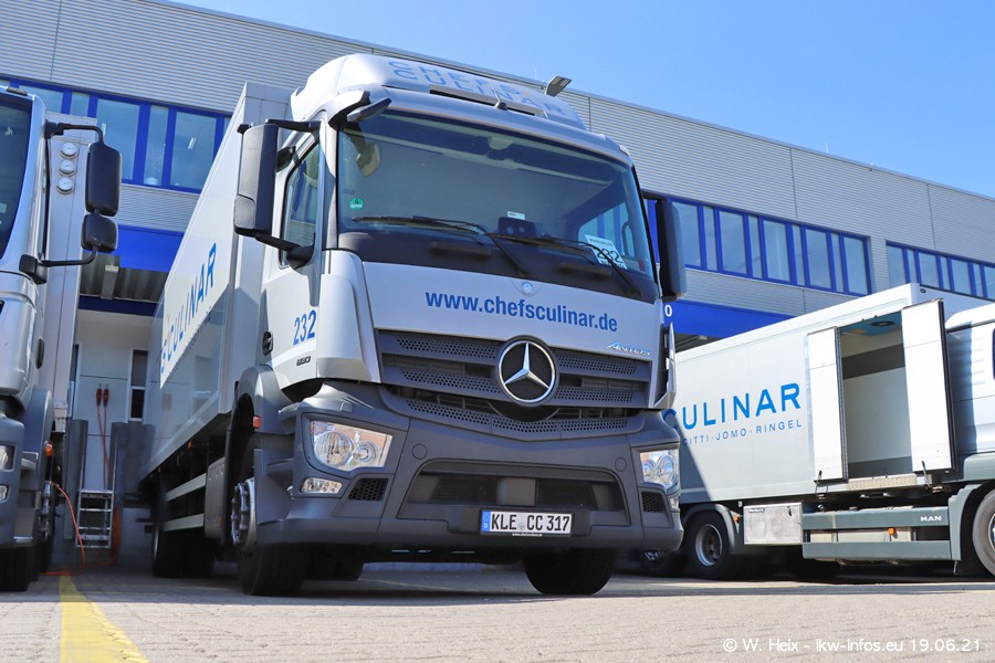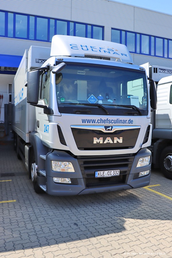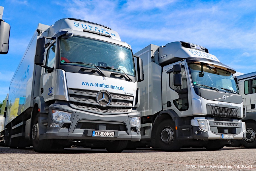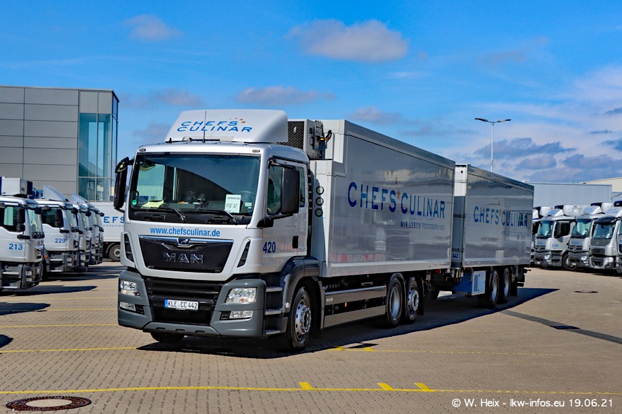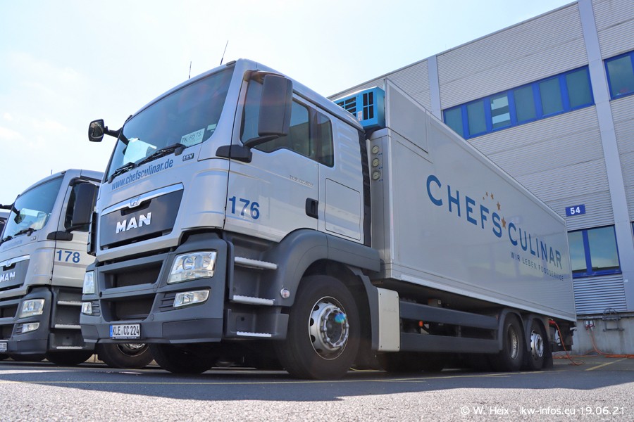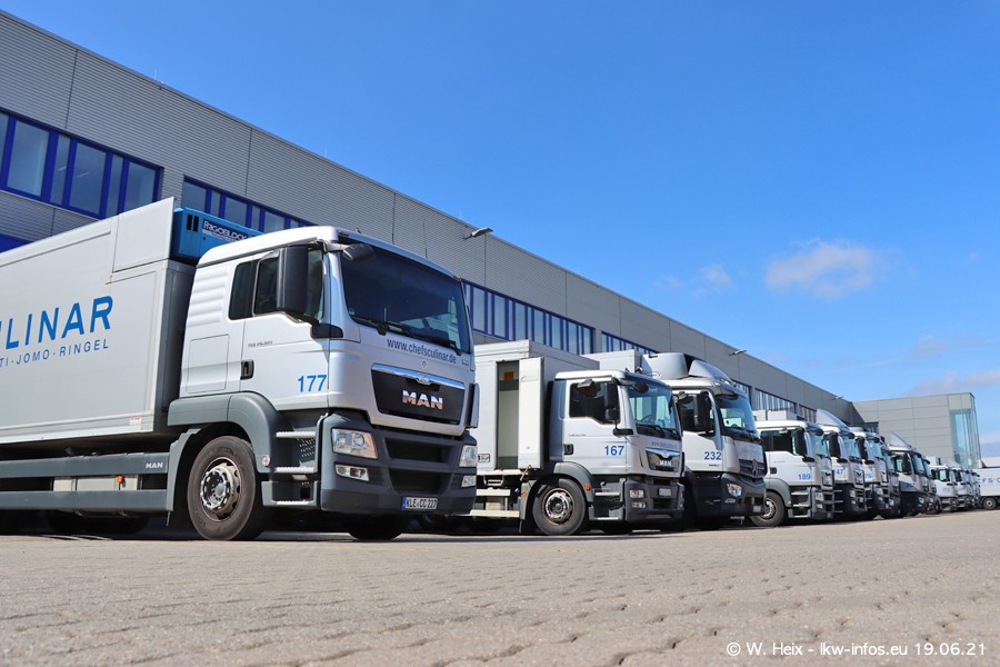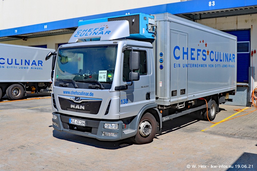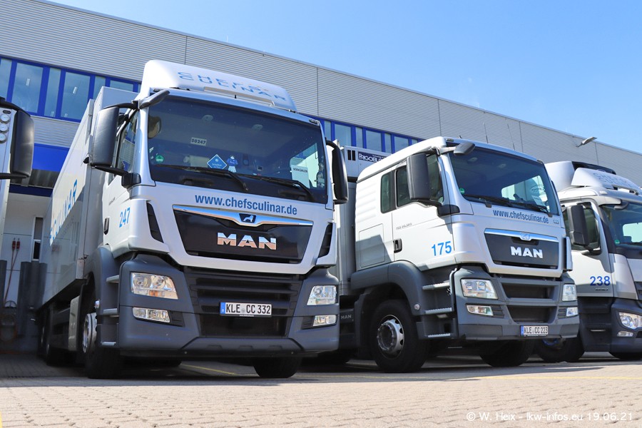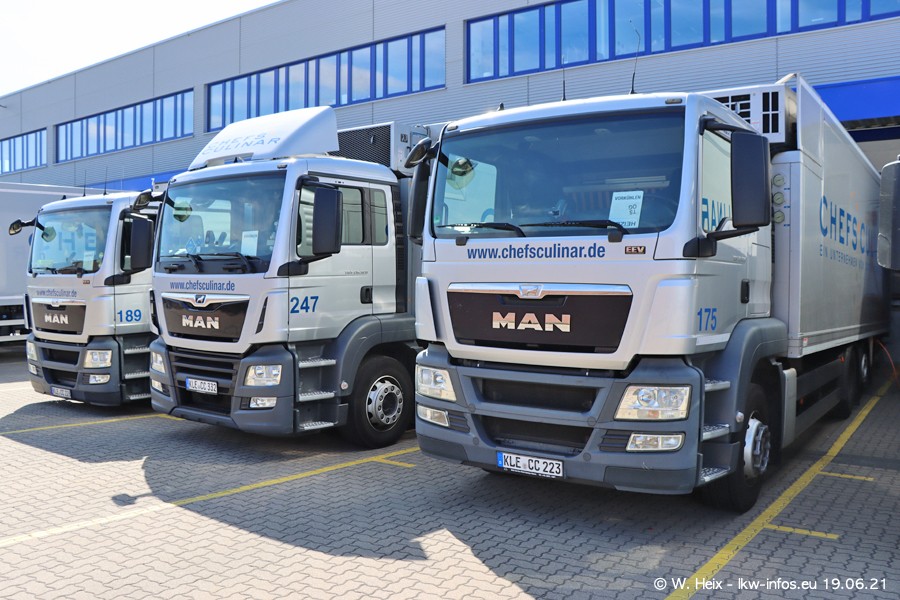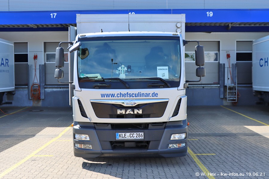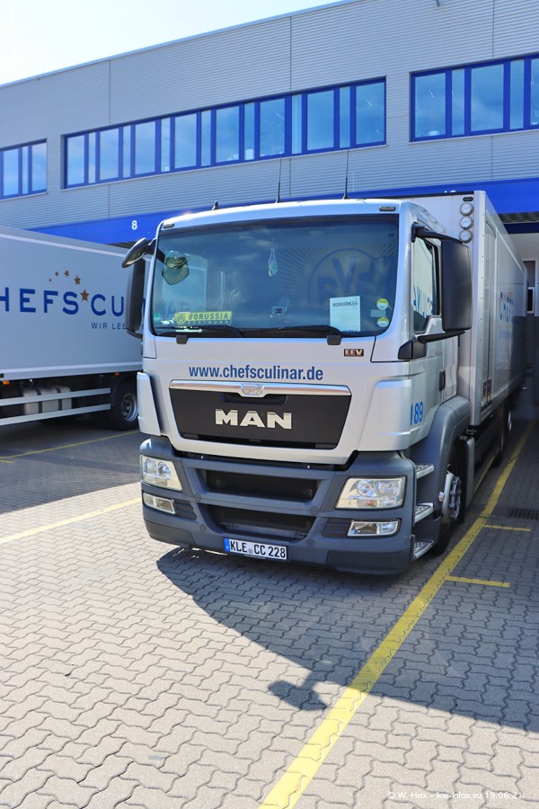 Nach fast genau einem Jahr war ich wieder bei CHEFS CULINAR West. Der Fuhrpark besteht aus knapp 150 Fahrzeugen. Seit dem letzten Besuch wurden viele alte Fahrzeuge durch neue ersetzt, das sind bei den 12-Tonnern MAN TGL und bei den größeren Mercedes-Benz Actros. Von den gelb-blauen alten JOMO-LKW sind jetzt noch 14 Stück vorhanden, also bald ist der Fuhrpark komplett auf das silbergraue Design umgestellt. Die letzten neuen LKW sind daran zu erkennen, dass sie noch keine Kennzeichen tragen.