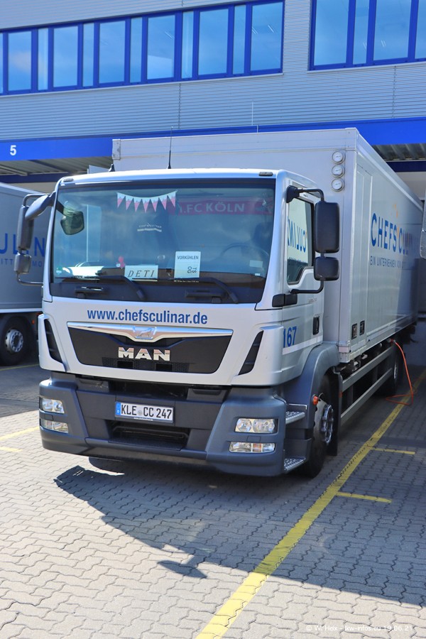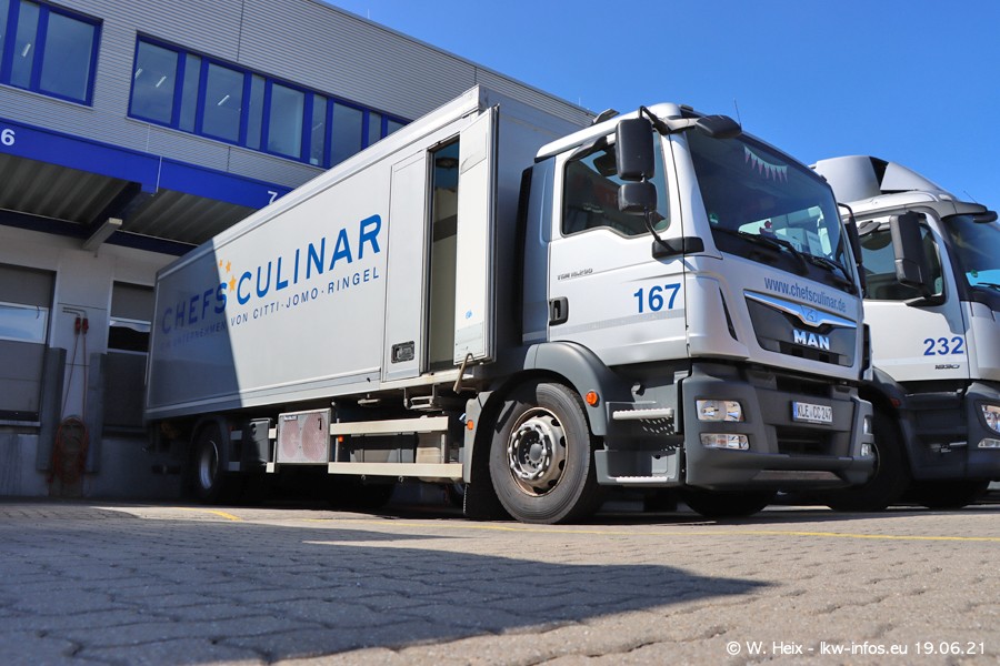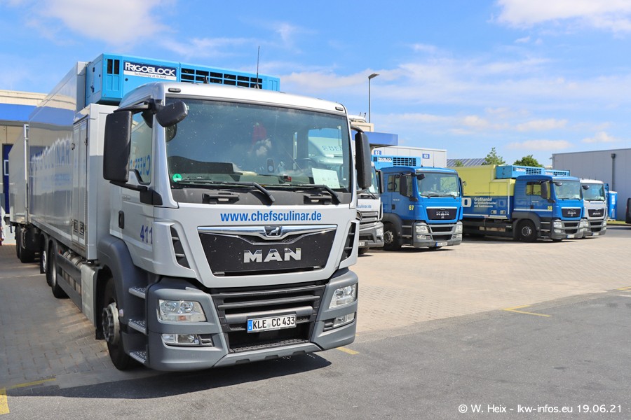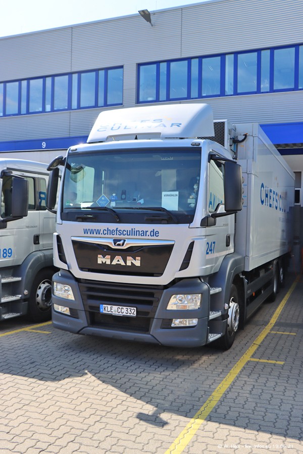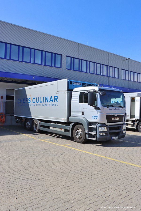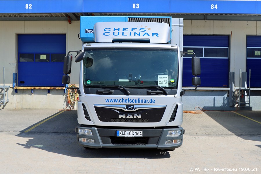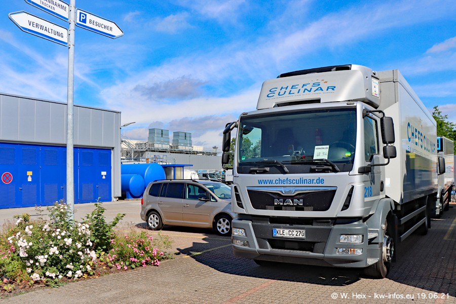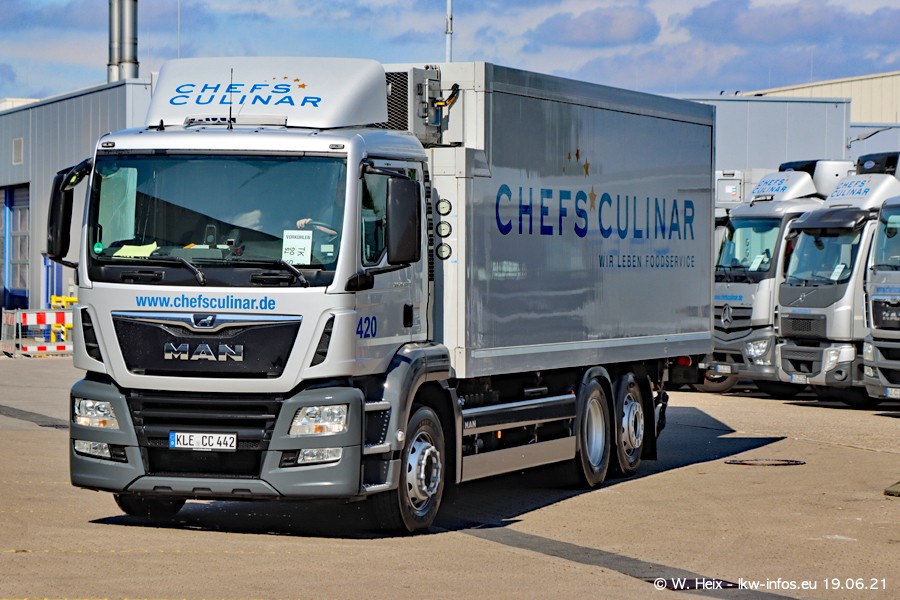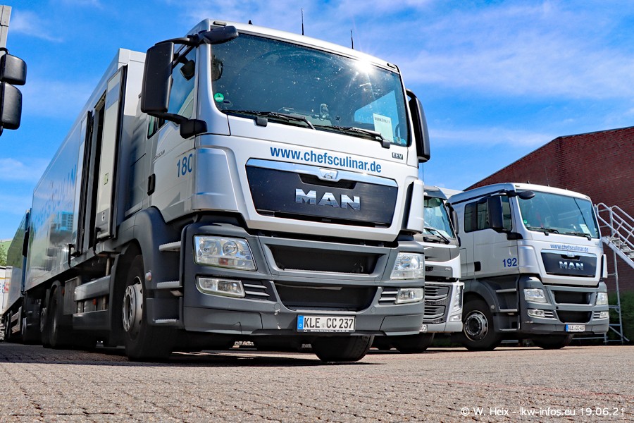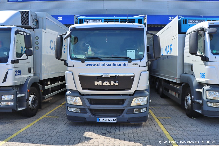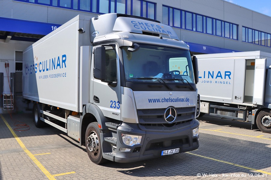Nach fast genau einem Jahr war ich wieder bei CHEFS CULINAR West. Der Fuhrpark besteht aus knapp 150 Fahrzeugen. Seit dem letzten Besuch wurden viele alte Fahrzeuge durch neue ersetzt, das sind bei den 12-Tonnern MAN TGL und bei den größeren Mercedes-Benz Actros. Von den gelb-blauen alten JOMO-LKW sind jetzt noch 14 Stück vorhanden, also bald ist der Fuhrpark komplett auf das silbergraue Design umgestellt. Die letzten neuen LKW sind daran zu erkennen, dass sie noch keine Kennzeichen tragen.
