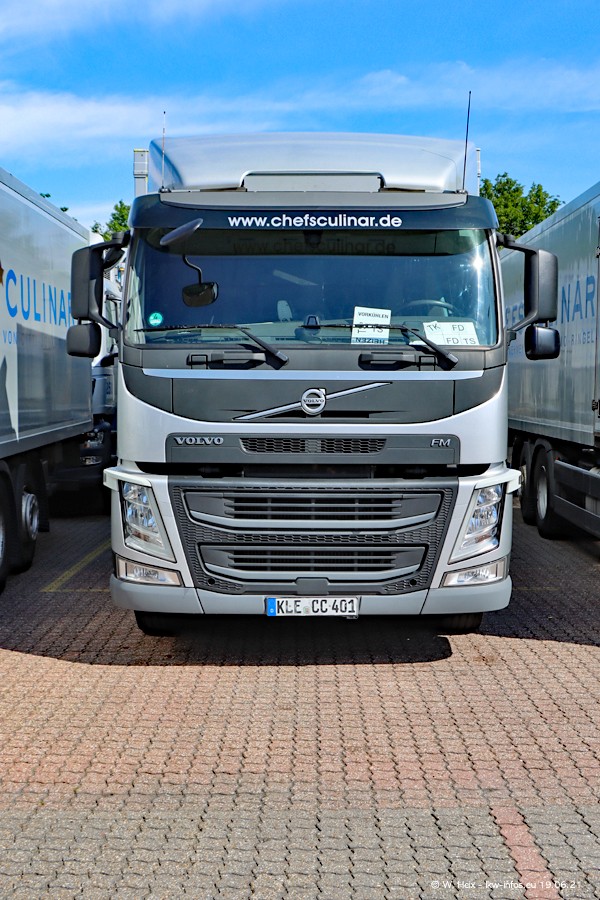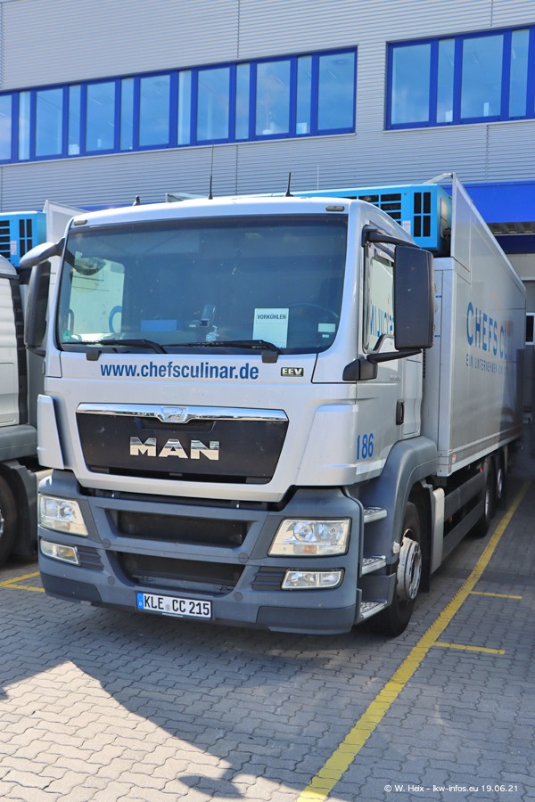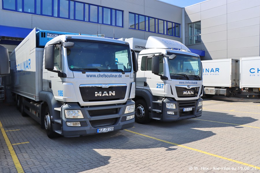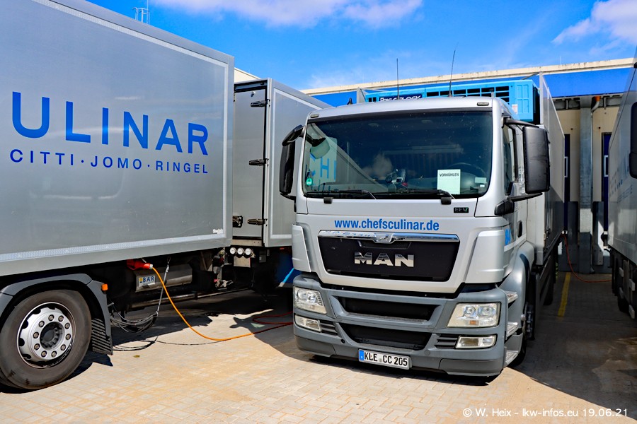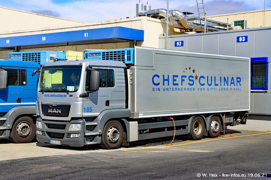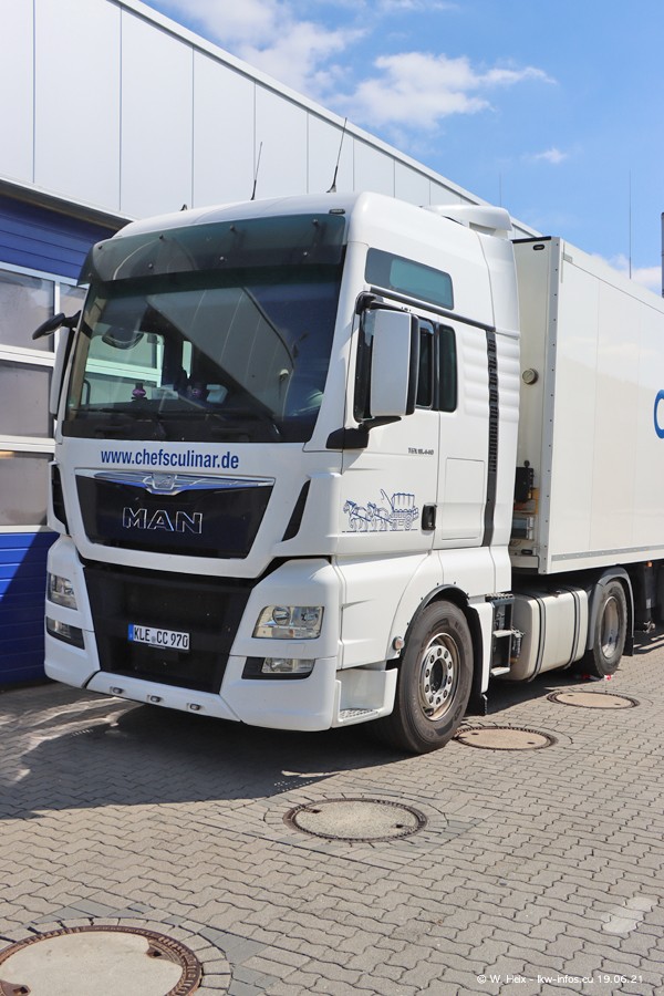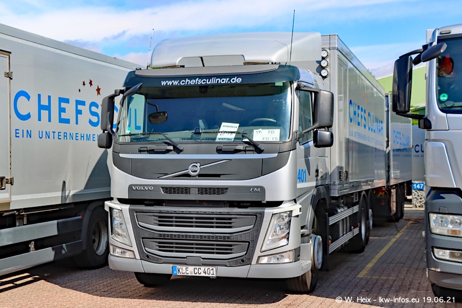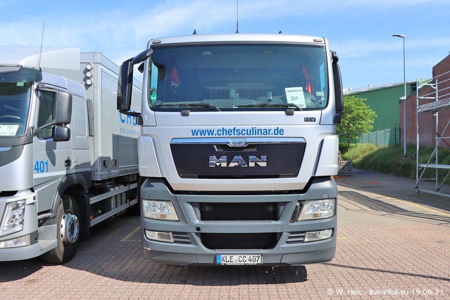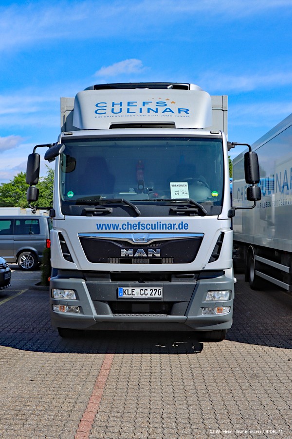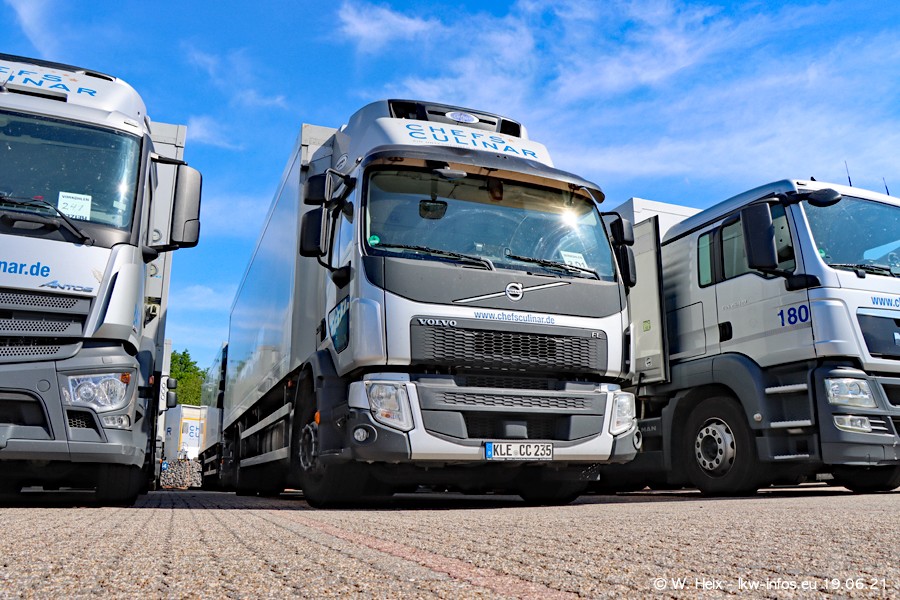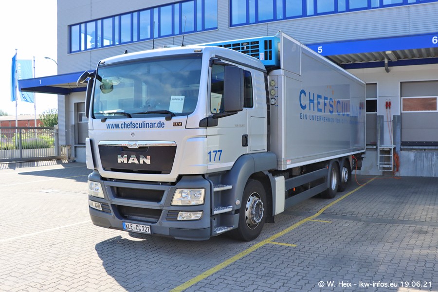 Nach fast genau einem Jahr war ich wieder bei CHEFS CULINAR West. Der Fuhrpark besteht aus knapp 150 Fahrzeugen. Seit dem letzten Besuch wurden viele alte Fahrzeuge durch neue ersetzt, das sind bei den 12-Tonnern MAN TGL und bei den größeren Mercedes-Benz Actros. Von den gelb-blauen alten JOMO-LKW sind jetzt noch 14 Stück vorhanden, also bald ist der Fuhrpark komplett auf das silbergraue Design umgestellt. Die letzten neuen LKW sind daran zu erkennen, dass sie noch keine Kennzeichen tragen.