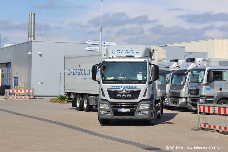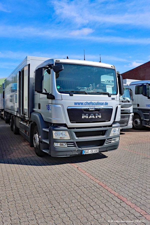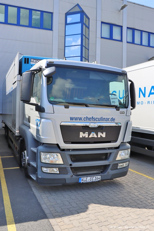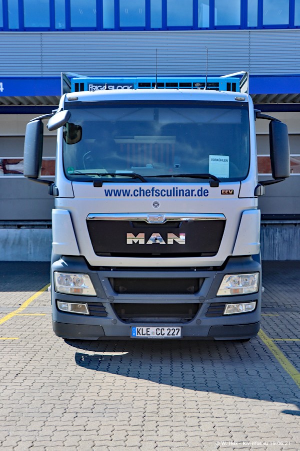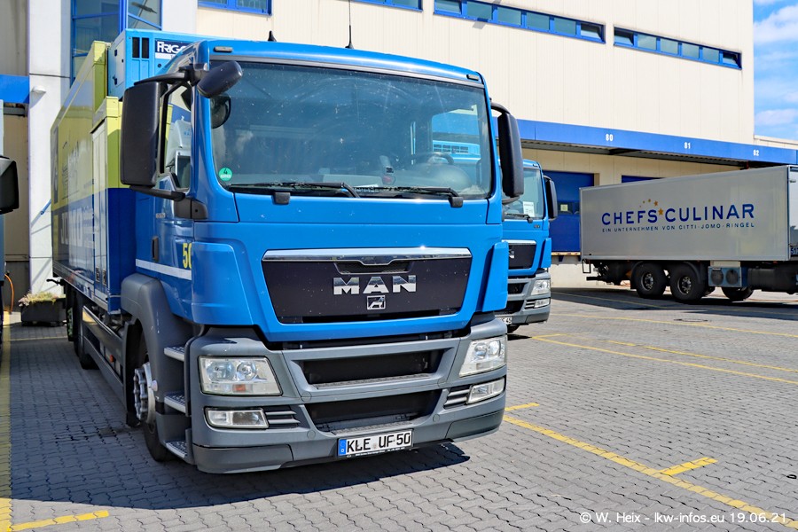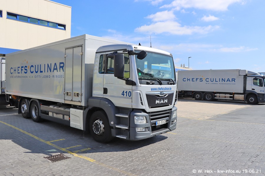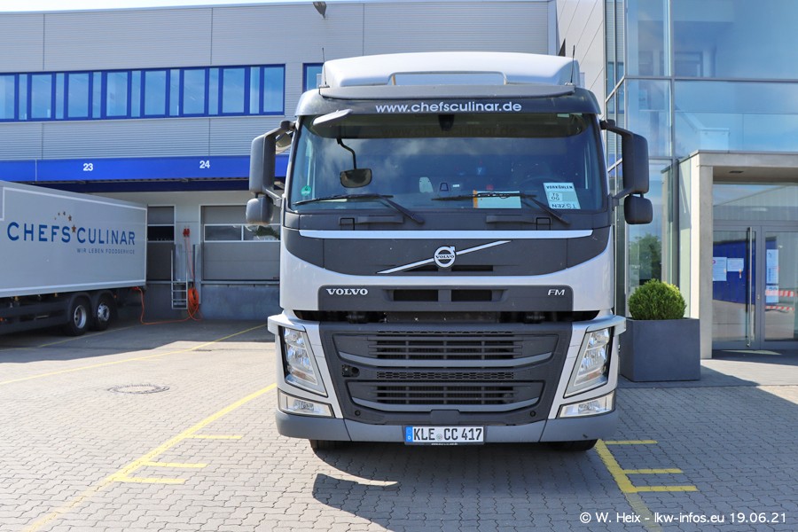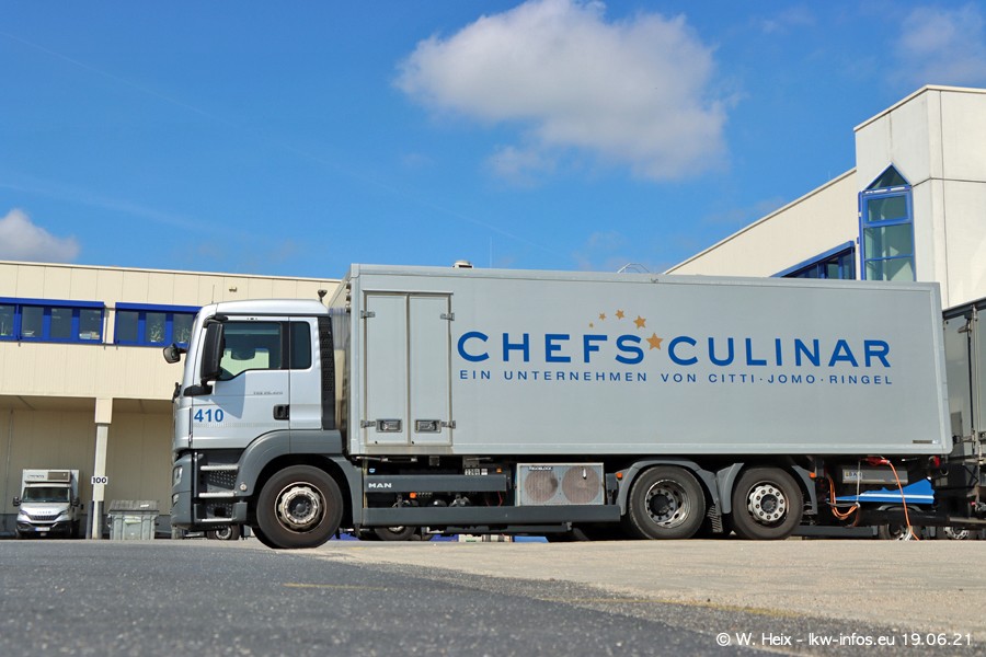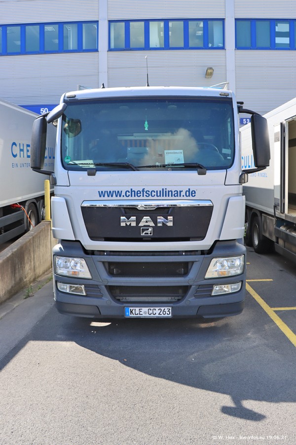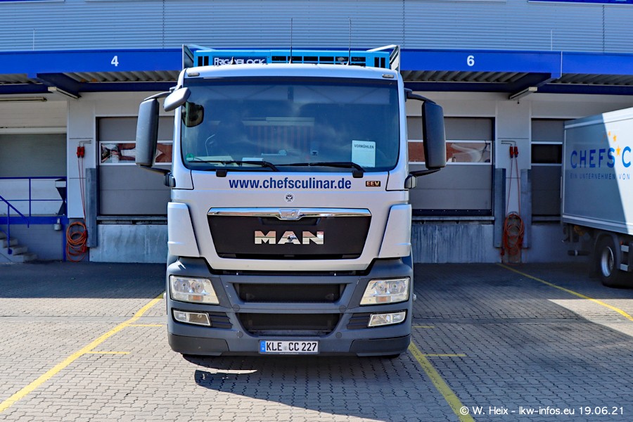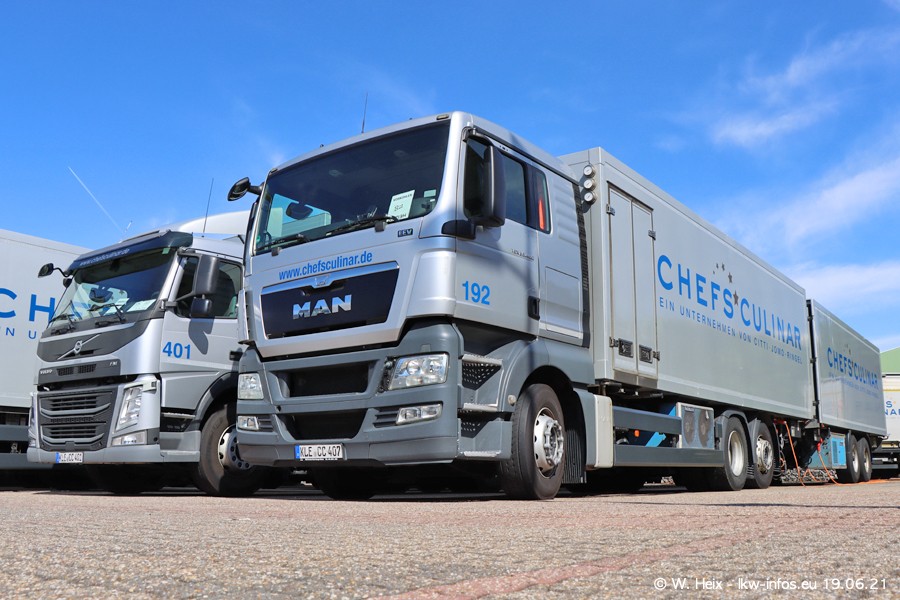 Nach fast genau einem Jahr war ich wieder bei CHEFS CULINAR West. Der Fuhrpark besteht aus knapp 150 Fahrzeugen. Seit dem letzten Besuch wurden viele alte Fahrzeuge durch neue ersetzt, das sind bei den 12-Tonnern MAN TGL und bei den größeren Mercedes-Benz Actros. Von den gelb-blauen alten JOMO-LKW sind jetzt noch 14 Stück vorhanden, also bald ist der Fuhrpark komplett auf das silbergraue Design umgestellt. Die letzten neuen LKW sind daran zu erkennen, dass sie noch keine Kennzeichen tragen.