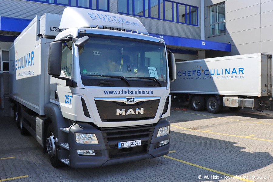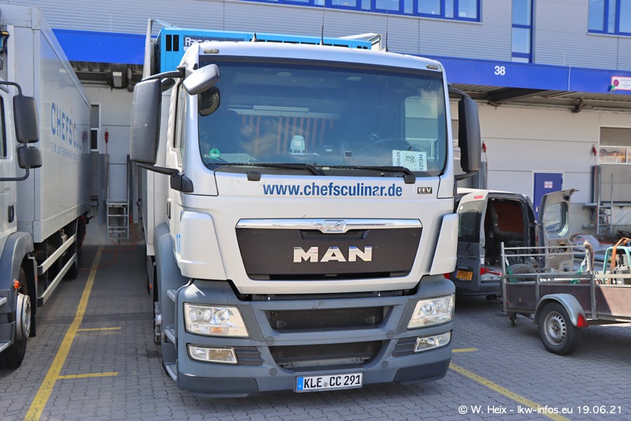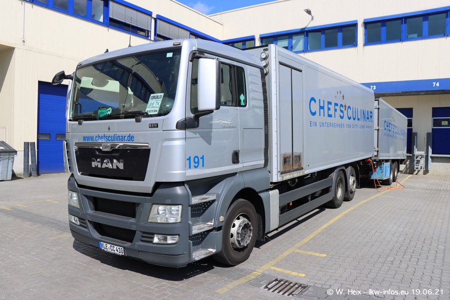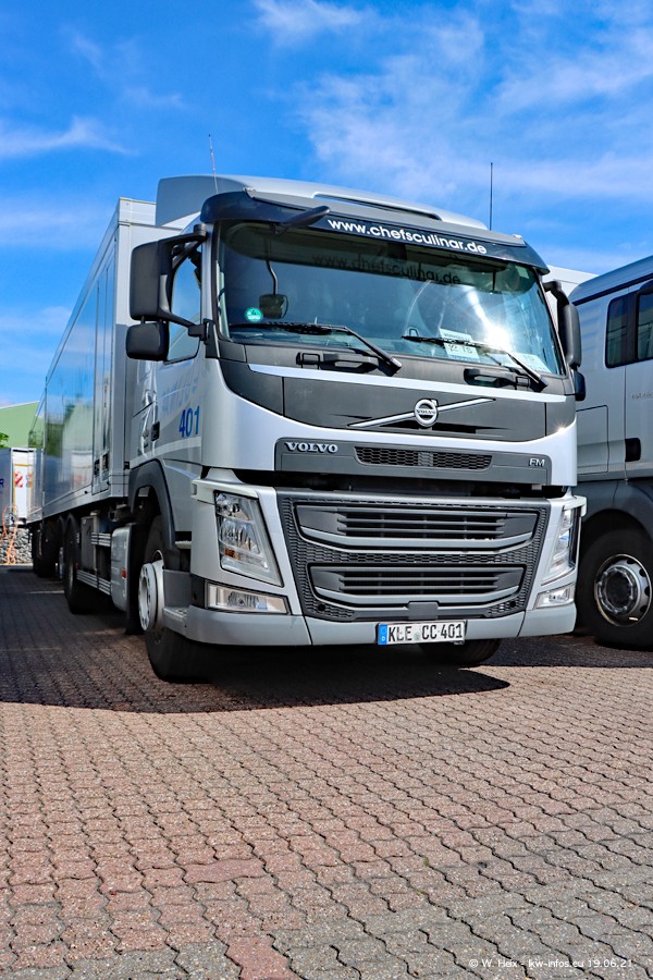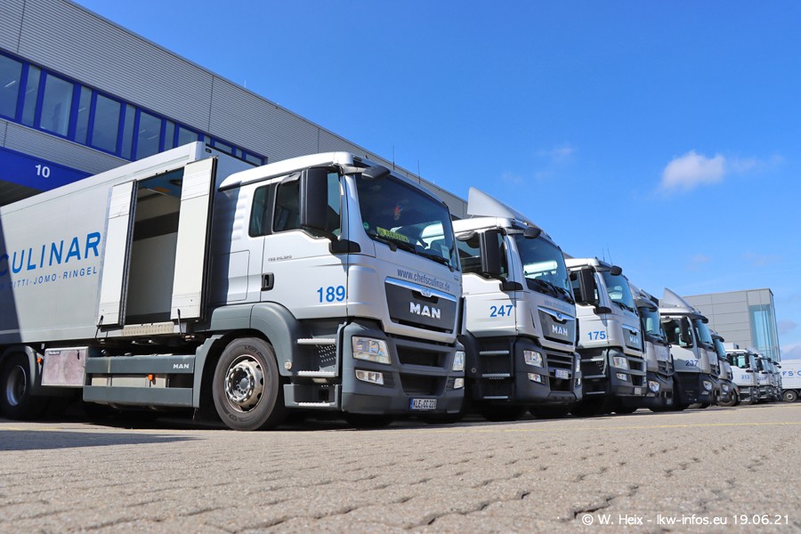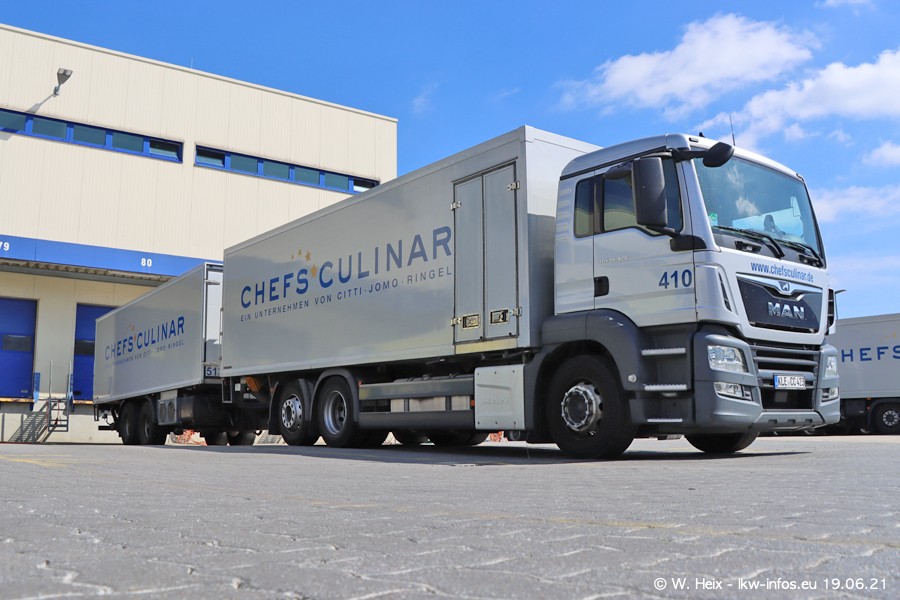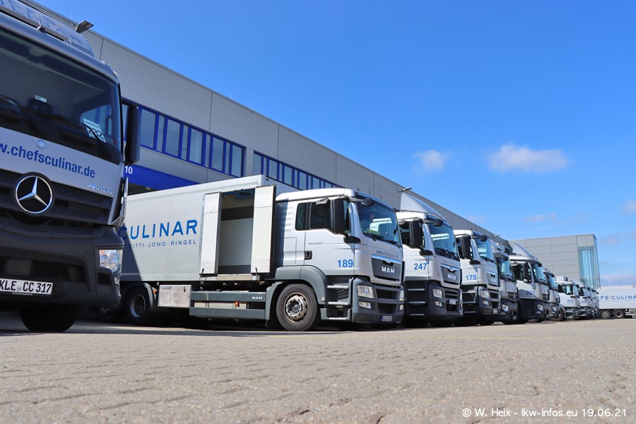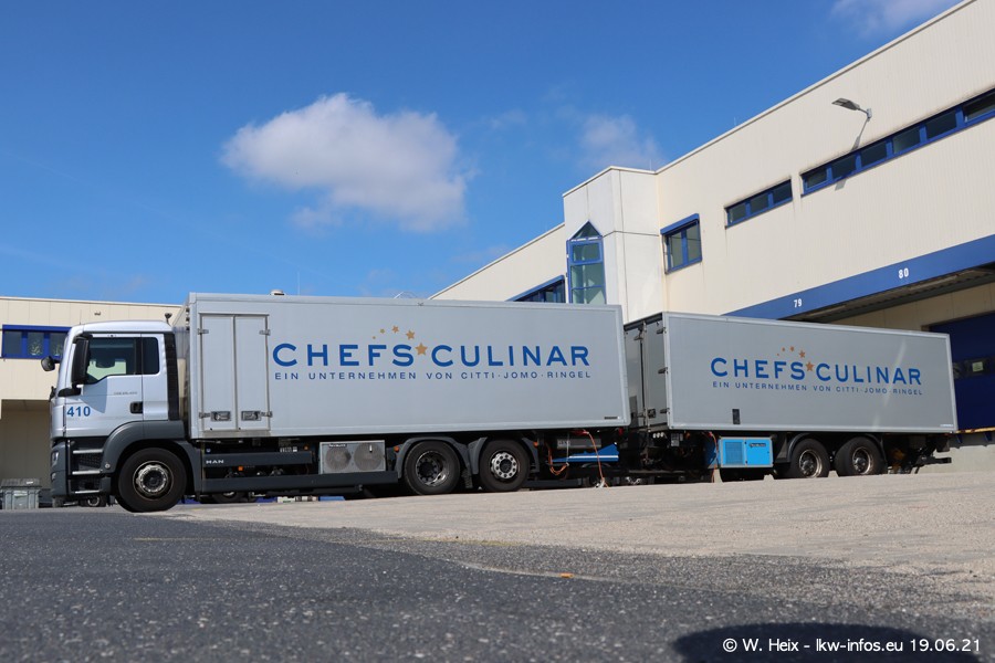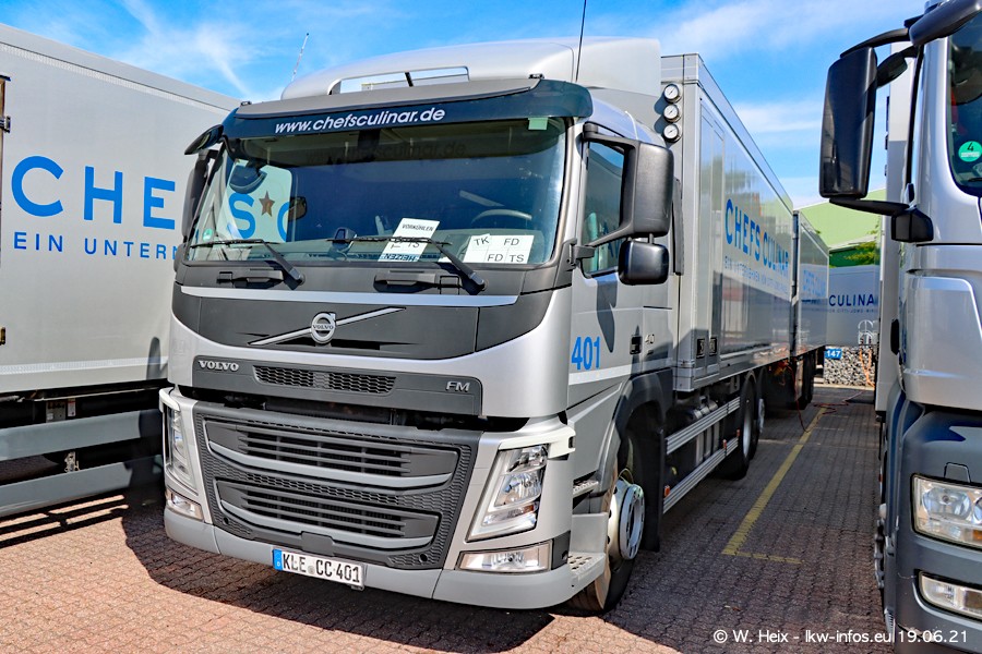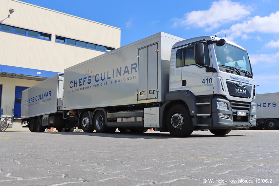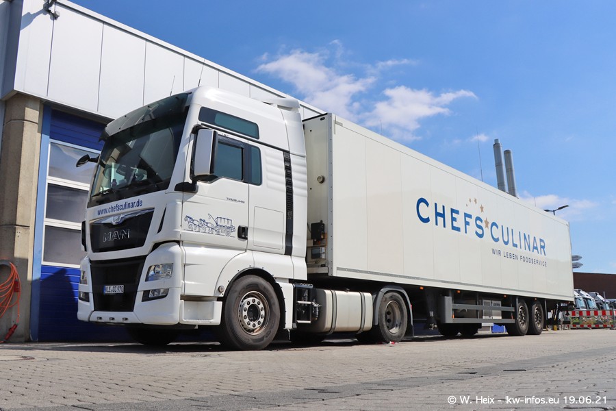 Nach fast genau einem Jahr war ich wieder bei CHEFS CULINAR West. Der Fuhrpark besteht aus knapp 150 Fahrzeugen. Seit dem letzten Besuch wurden viele alte Fahrzeuge durch neue ersetzt, das sind bei den 12-Tonnern MAN TGL und bei den größeren Mercedes-Benz Actros. Von den gelb-blauen alten JOMO-LKW sind jetzt noch 14 Stück vorhanden, also bald ist der Fuhrpark komplett auf das silbergraue Design umgestellt. Die letzten neuen LKW sind daran zu erkennen, dass sie noch keine Kennzeichen tragen.