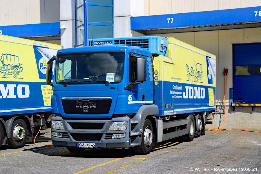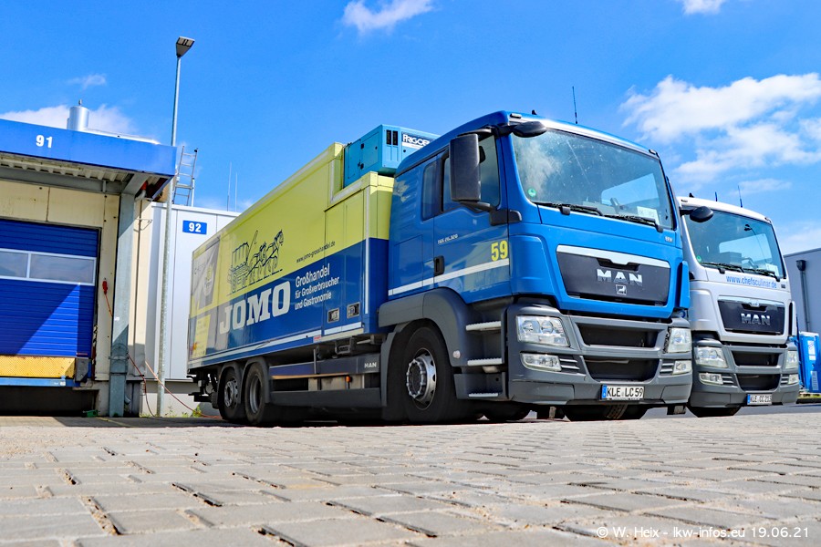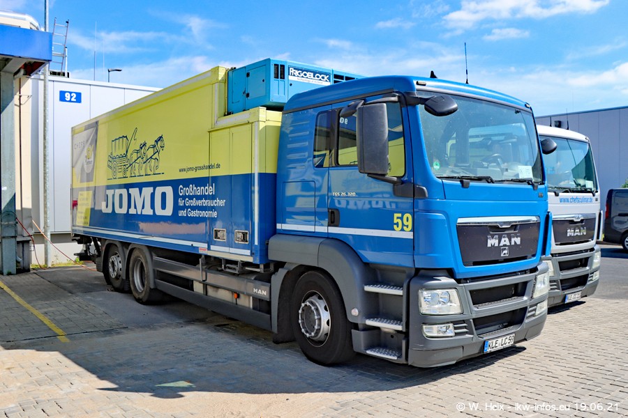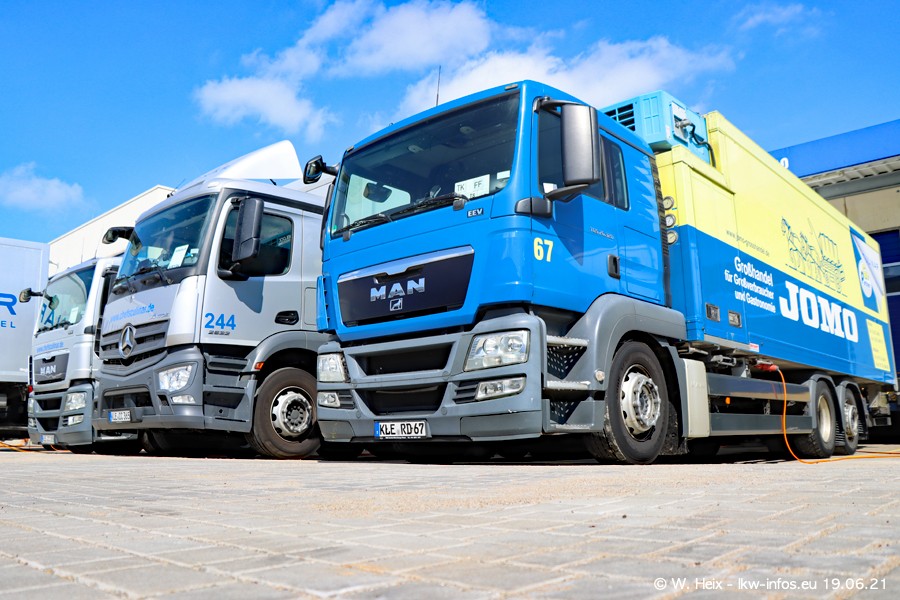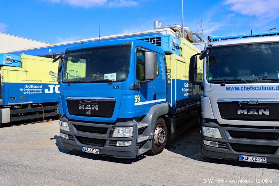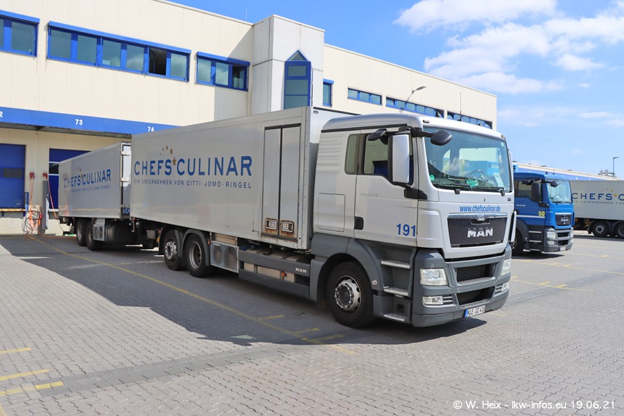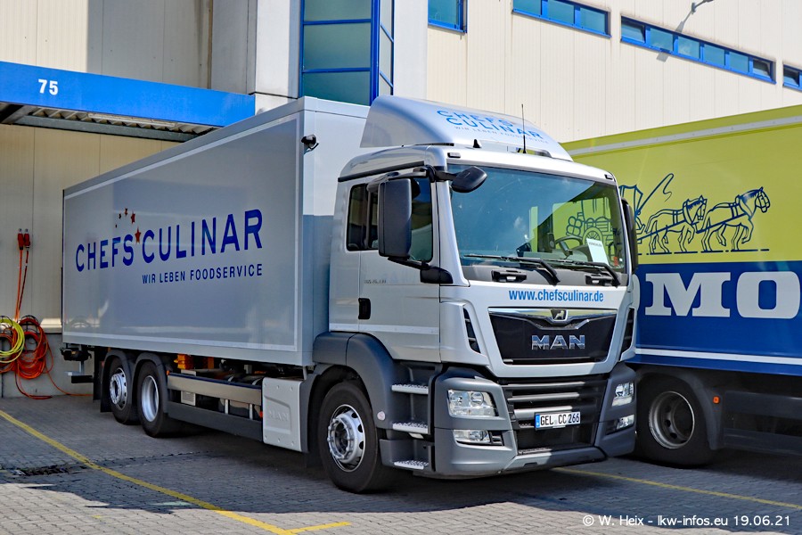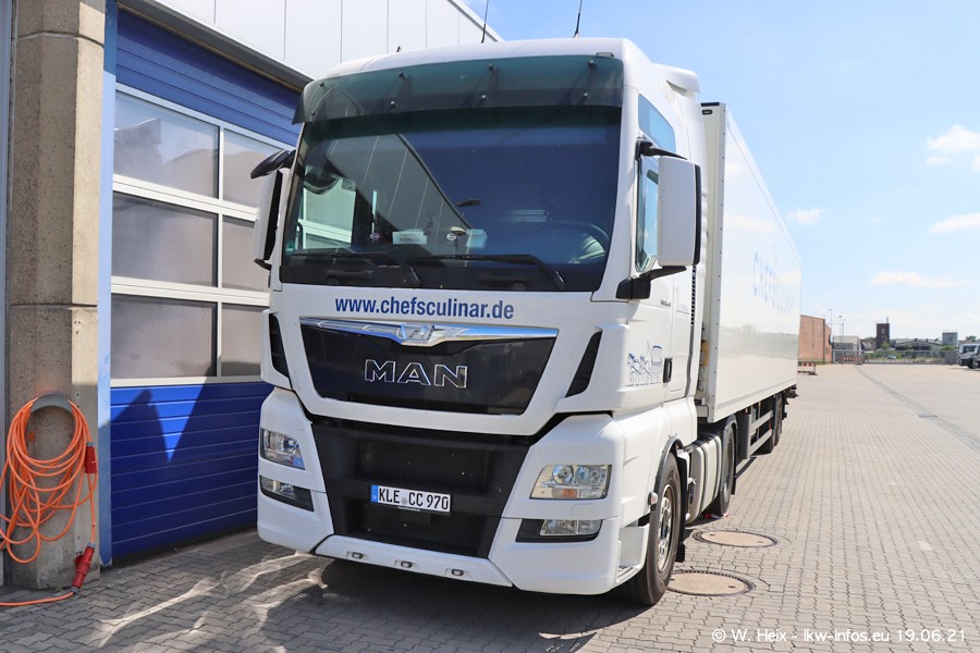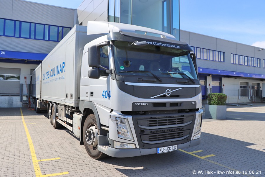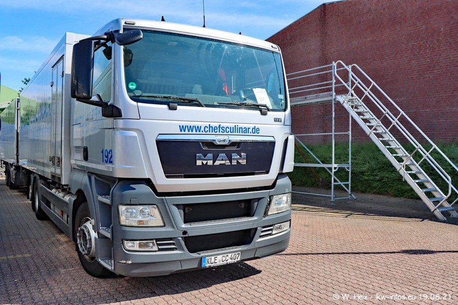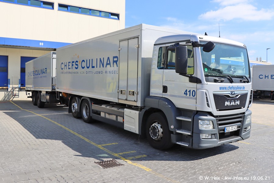Nach fast genau einem Jahr war ich wieder bei CHEFS CULINAR West. Der Fuhrpark besteht aus knapp 150 Fahrzeugen. Seit dem letzten Besuch wurden viele alte Fahrzeuge durch neue ersetzt, das sind bei den 12-Tonnern MAN TGL und bei den größeren Mercedes-Benz Actros. Von den gelb-blauen alten JOMO-LKW sind jetzt noch 14 Stück vorhanden, also bald ist der Fuhrpark komplett auf das silbergraue Design umgestellt. Die letzten neuen LKW sind daran zu erkennen, dass sie noch keine Kennzeichen tragen.