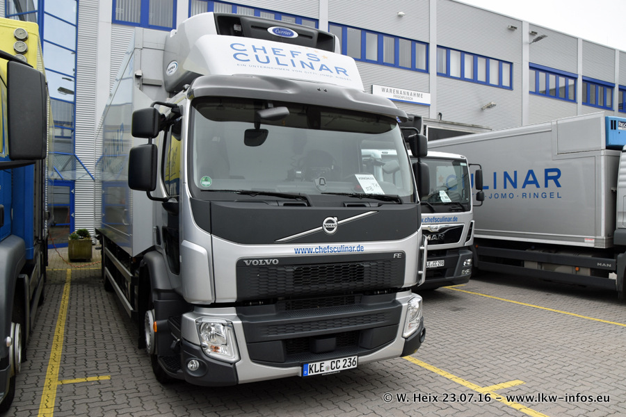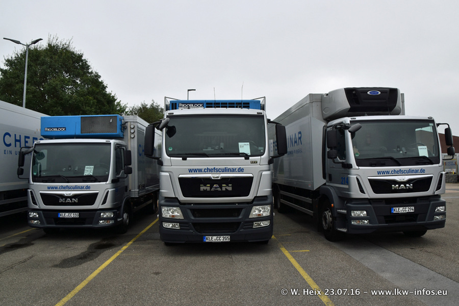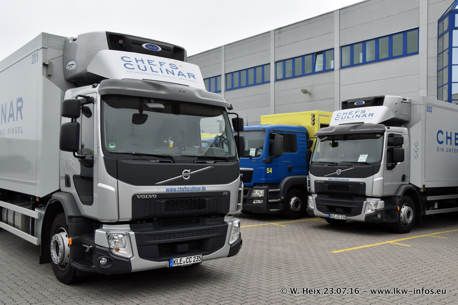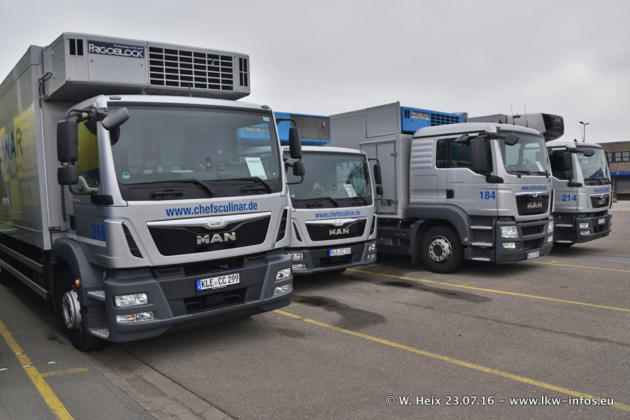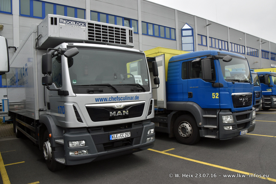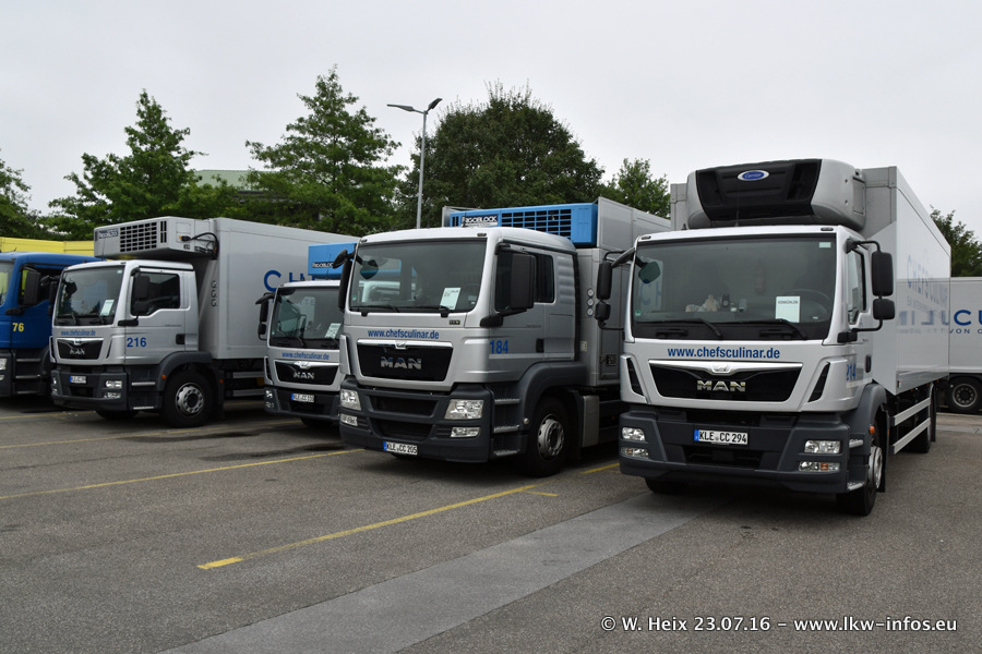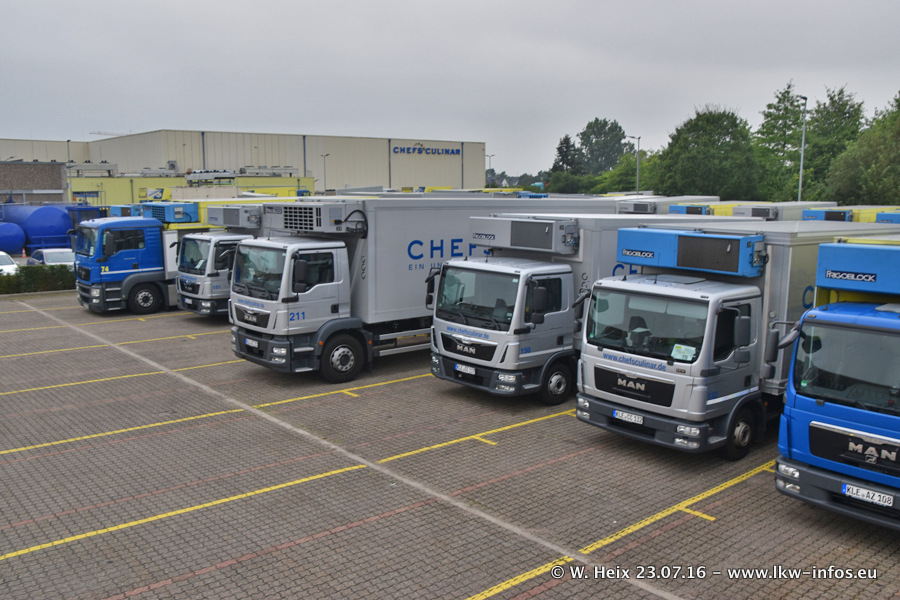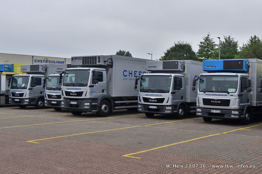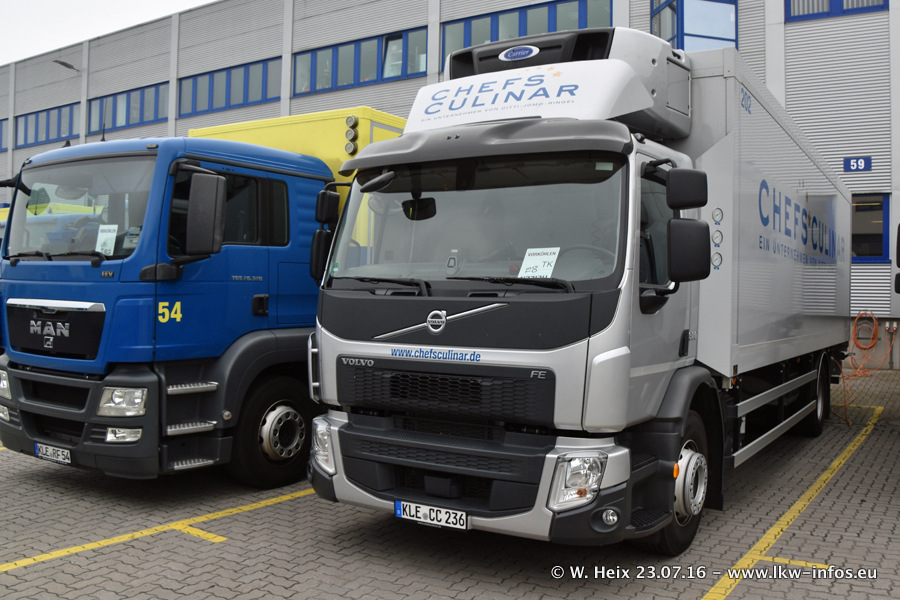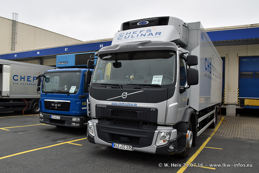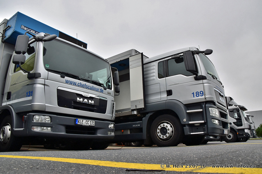 Inzwischen besteht der Fuhrpark rund zur Hälfte aus LKW im neuen Design "Chefs Culinar". Bei meinem letzten Besuch im April 2014 waren die ersten rund 10-12 LKW im neuen Design im Fuhrpark. Seit ca. 3 Monaten gibt es neben den ganzen LKW von MAN auch die ersten Volvo. Das sind Fahrzeuge der Baureihen FE und FM. Bei den kleinen Kühlahrzeugen unter 7,49 t, die von Iveco sind, gibt es inzwischen den ersten Daily der aktuellen Baureihe. Von den rund 120 Fahrzeugen am Standort Weeze war der größte Teil "zuhause".