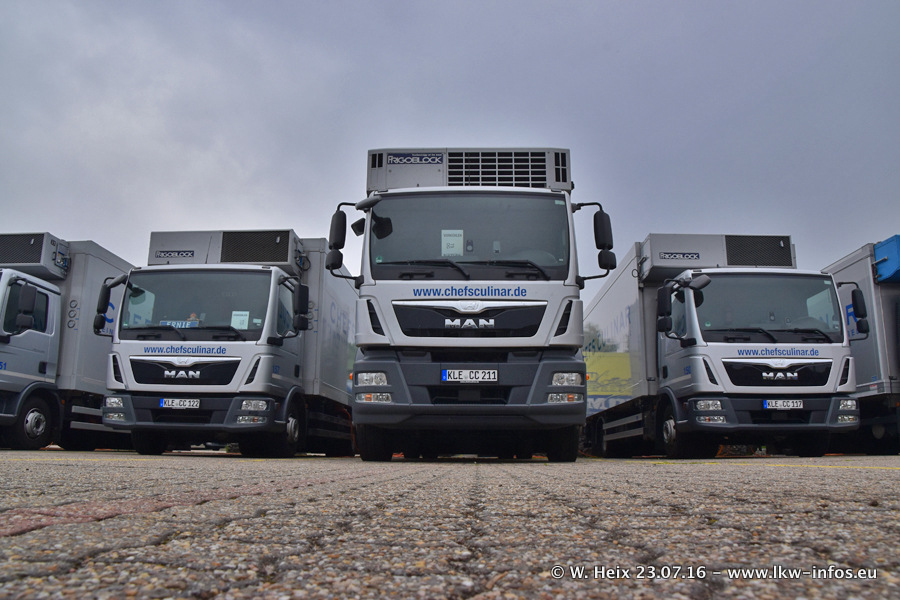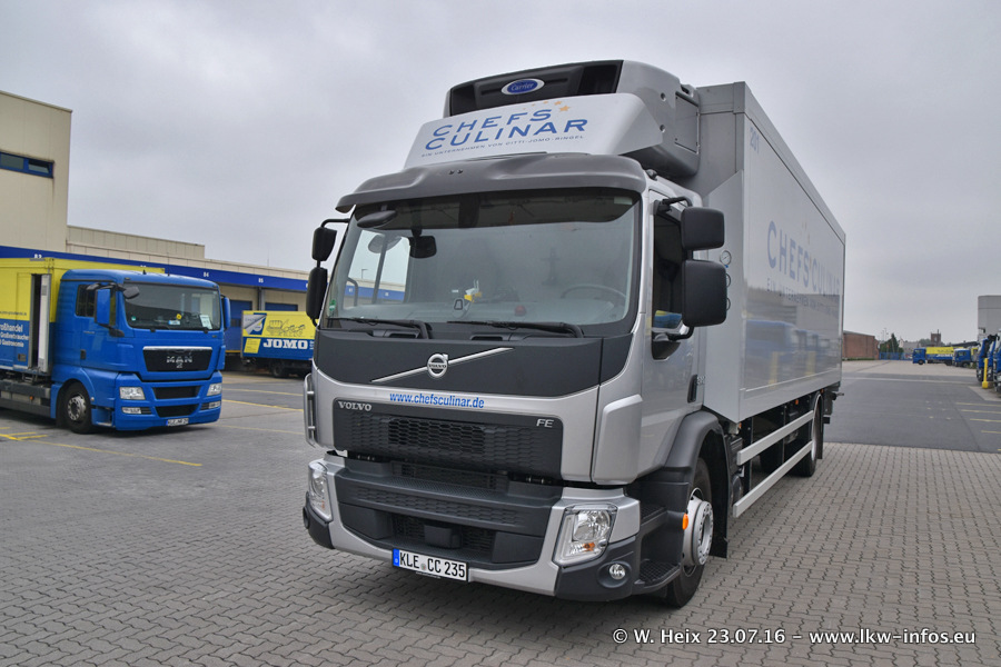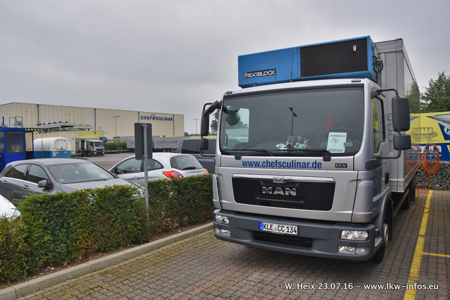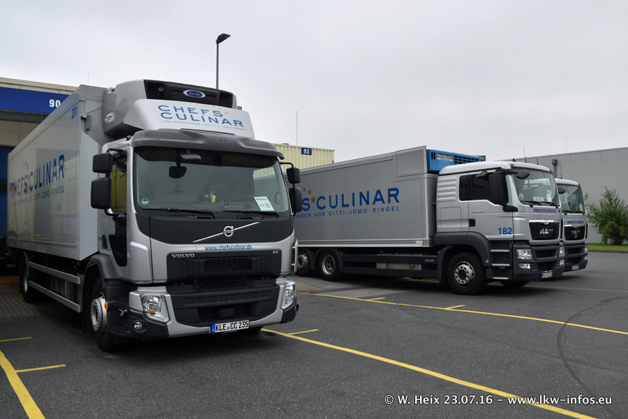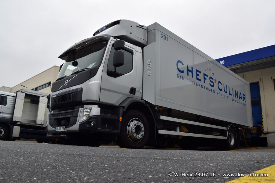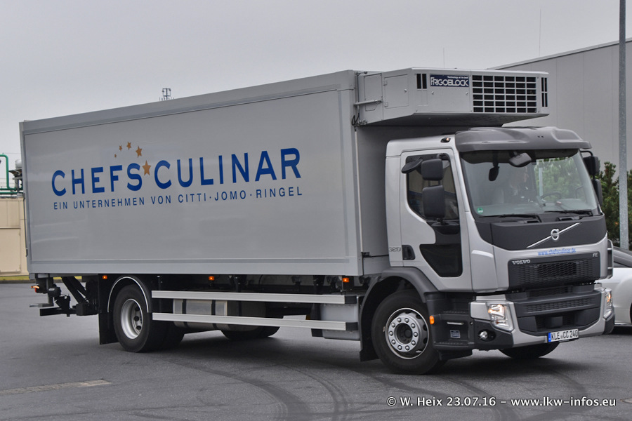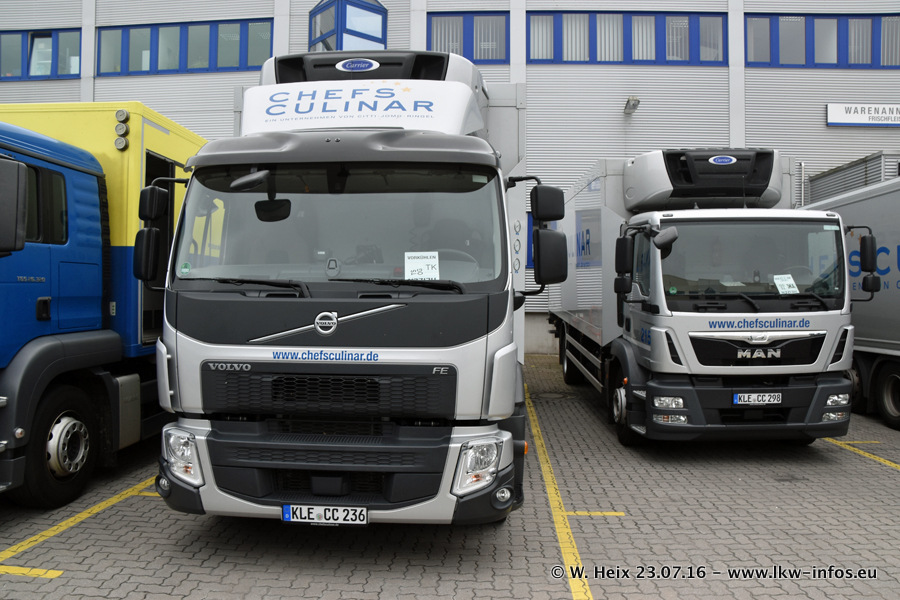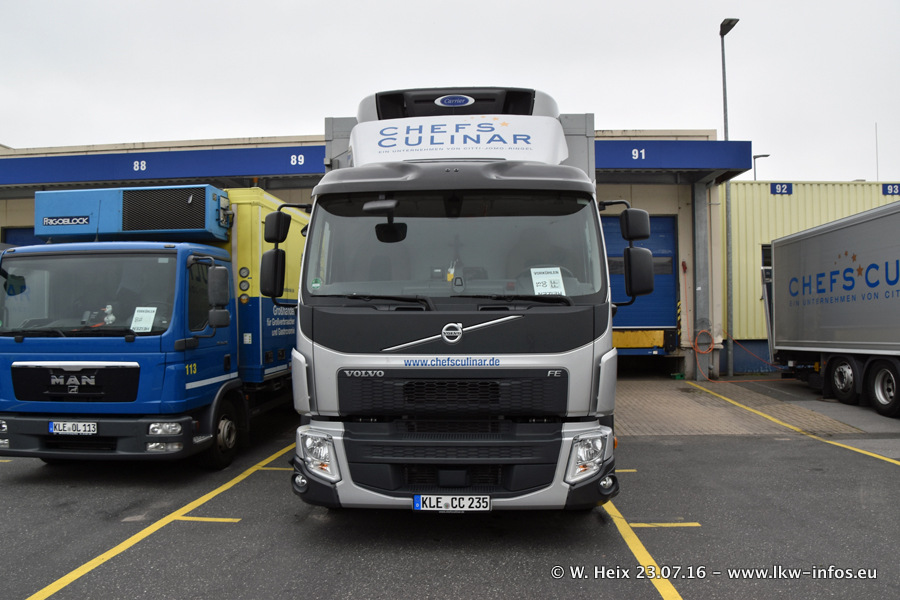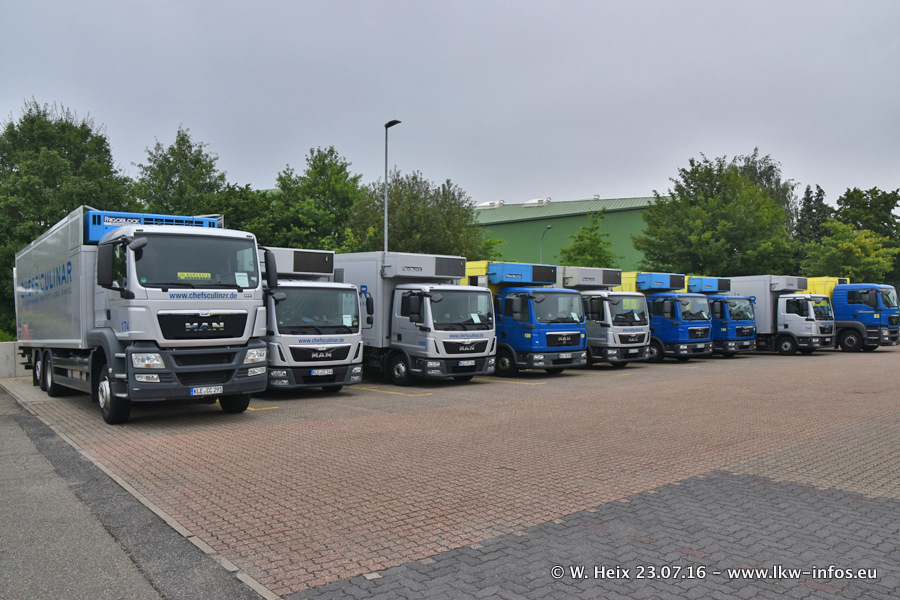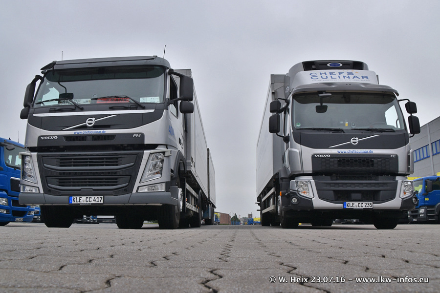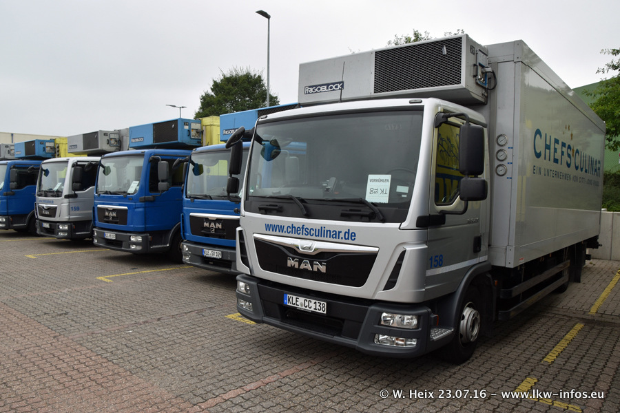 Inzwischen besteht der Fuhrpark rund zur Hälfte aus LKW im neuen Design "Chefs Culinar". Bei meinem letzten Besuch im April 2014 waren die ersten rund 10-12 LKW im neuen Design im Fuhrpark. Seit ca. 3 Monaten gibt es neben den ganzen LKW von MAN auch die ersten Volvo. Das sind Fahrzeuge der Baureihen FE und FM. Bei den kleinen Kühlahrzeugen unter 7,49 t, die von Iveco sind, gibt es inzwischen den ersten Daily der aktuellen Baureihe. Von den rund 120 Fahrzeugen am Standort Weeze war der größte Teil "zuhause".