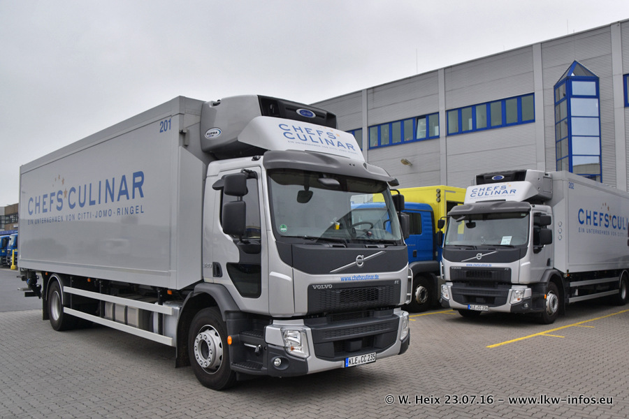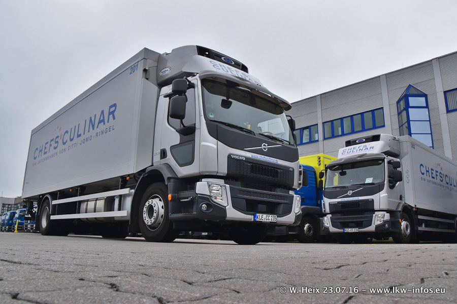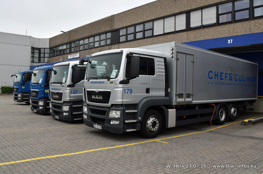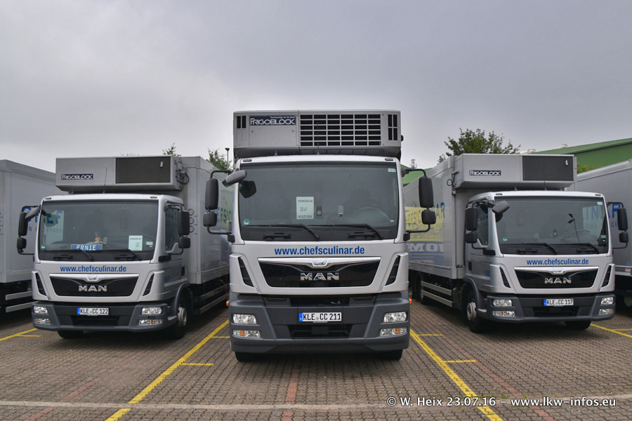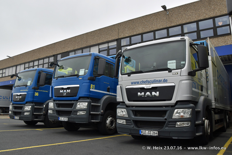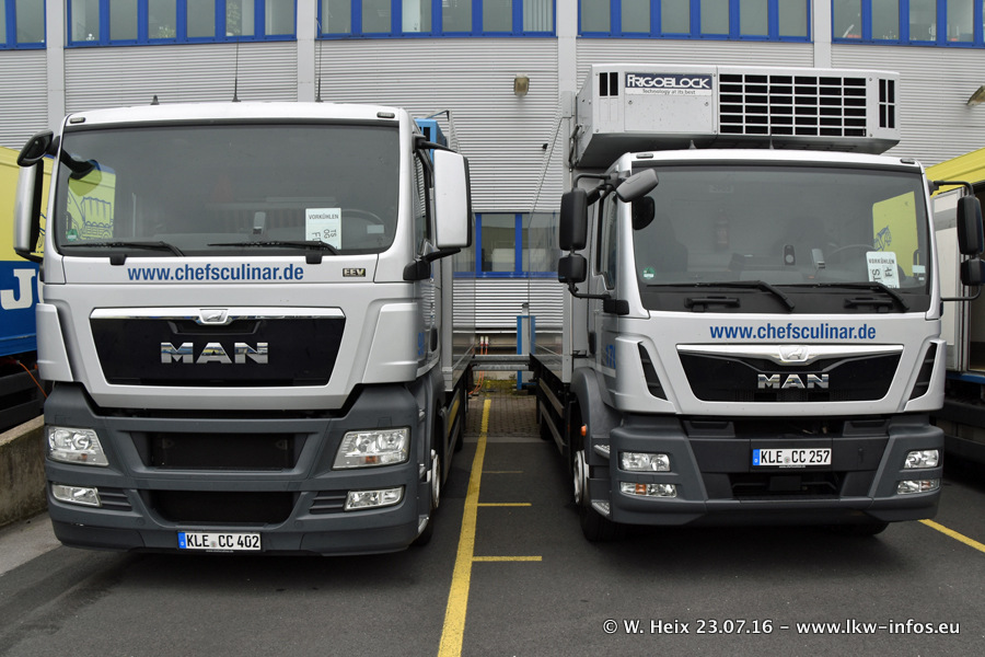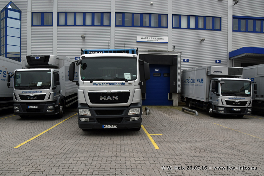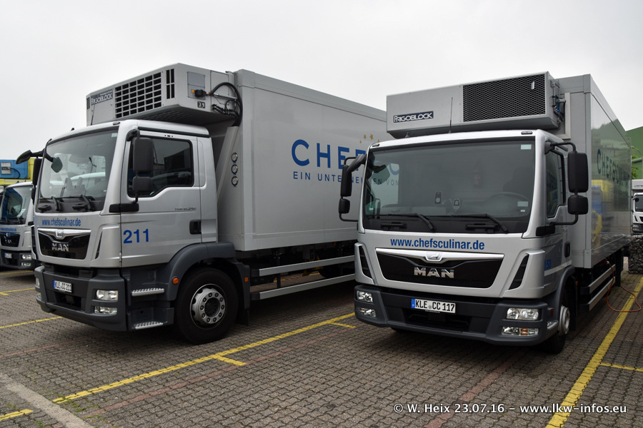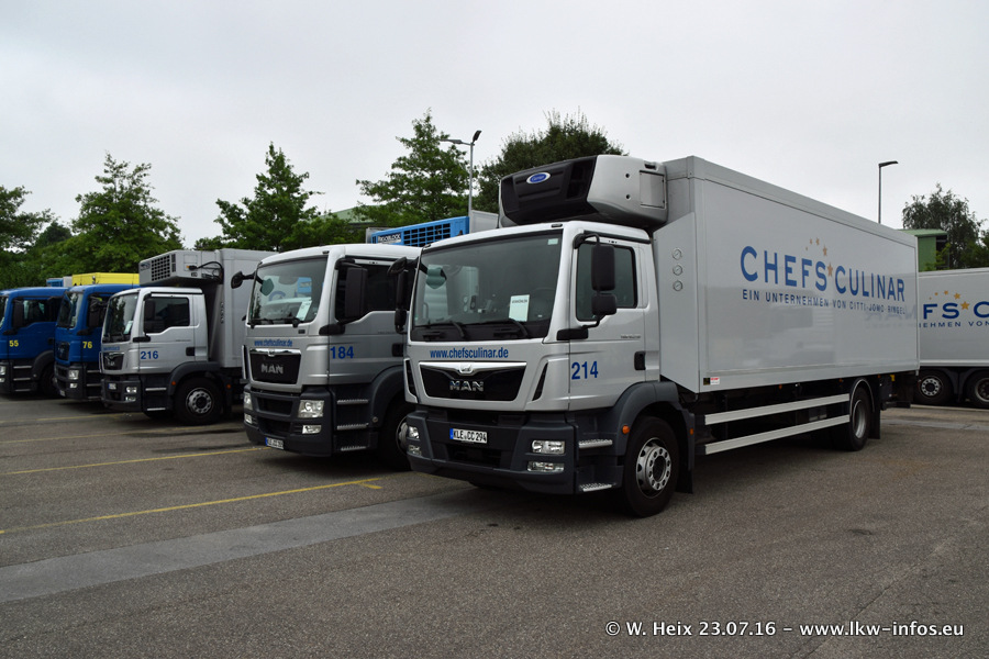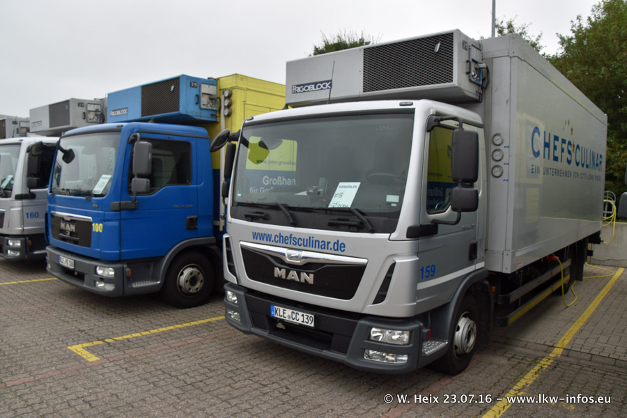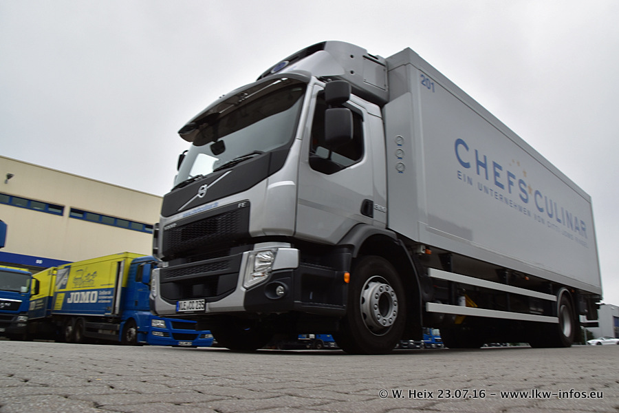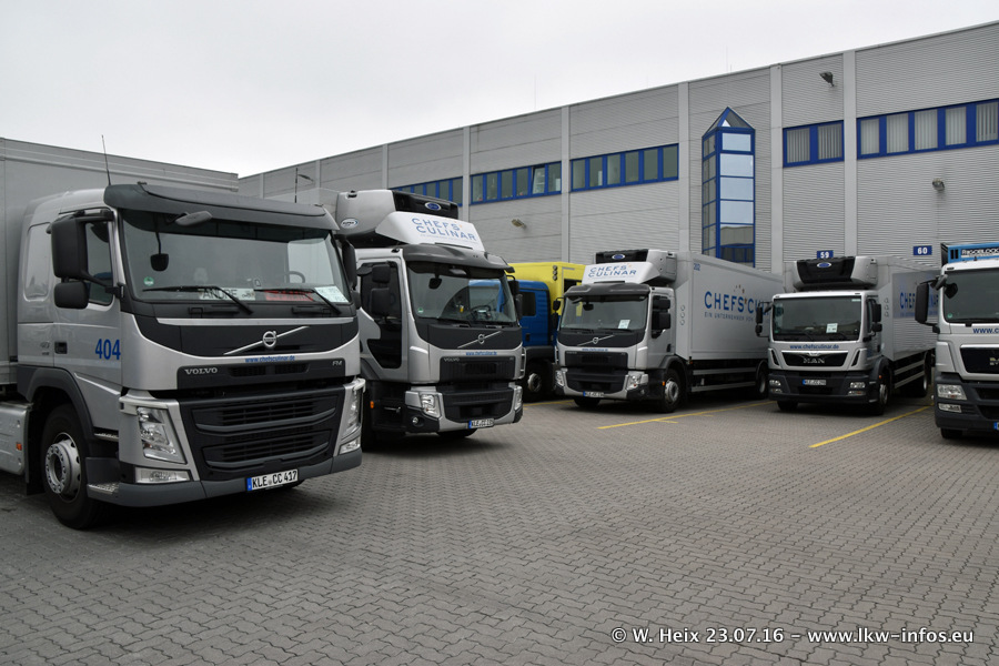 Inzwischen besteht der Fuhrpark rund zur Hälfte aus LKW im neuen Design "Chefs Culinar". Bei meinem letzten Besuch im April 2014 waren die ersten rund 10-12 LKW im neuen Design im Fuhrpark. Seit ca. 3 Monaten gibt es neben den ganzen LKW von MAN auch die ersten Volvo. Das sind Fahrzeuge der Baureihen FE und FM. Bei den kleinen Kühlahrzeugen unter 7,49 t, die von Iveco sind, gibt es inzwischen den ersten Daily der aktuellen Baureihe. Von den rund 120 Fahrzeugen am Standort Weeze war der größte Teil "zuhause".