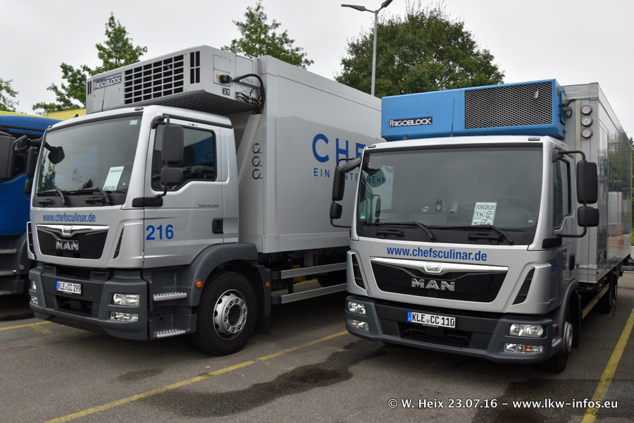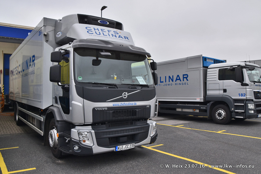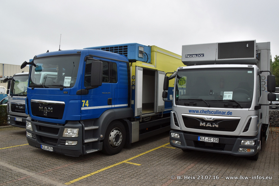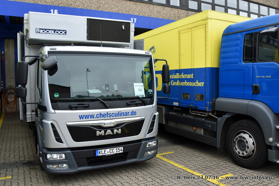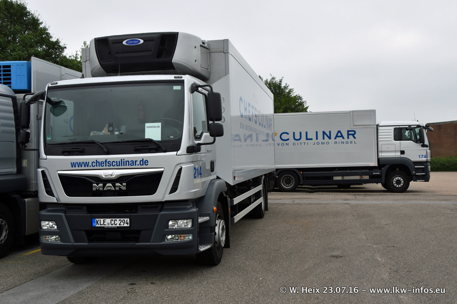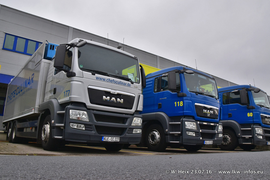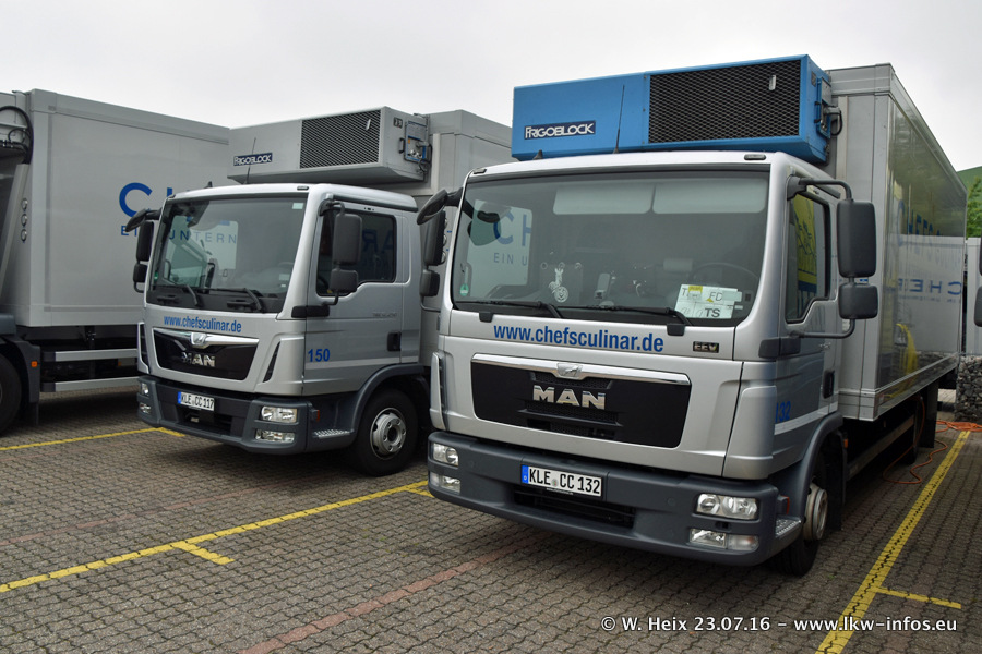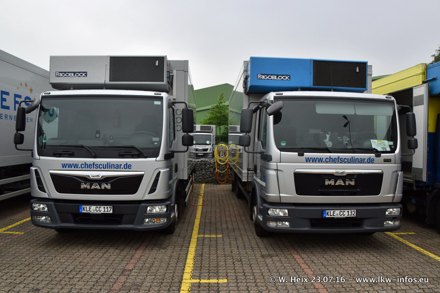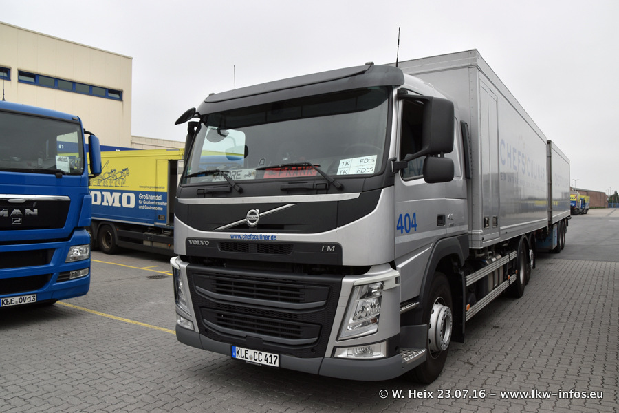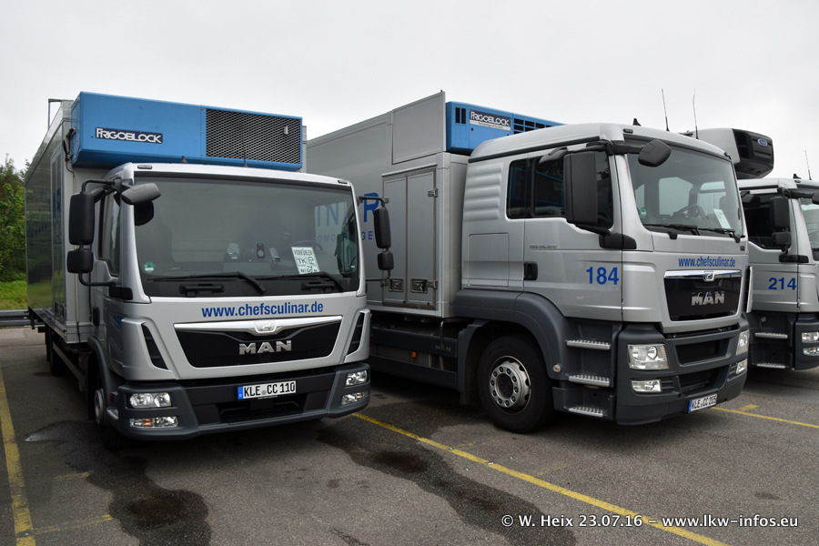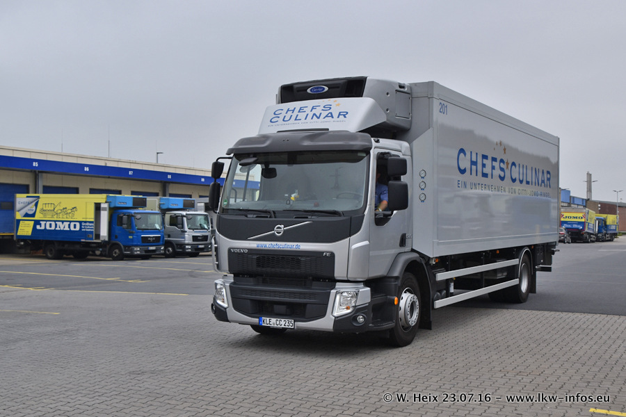 Inzwischen besteht der Fuhrpark rund zur Hälfte aus LKW im neuen Design "Chefs Culinar". Bei meinem letzten Besuch im April 2014 waren die ersten rund 10-12 LKW im neuen Design im Fuhrpark. Seit ca. 3 Monaten gibt es neben den ganzen LKW von MAN auch die ersten Volvo. Das sind Fahrzeuge der Baureihen FE und FM. Bei den kleinen Kühlahrzeugen unter 7,49 t, die von Iveco sind, gibt es inzwischen den ersten Daily der aktuellen Baureihe. Von den rund 120 Fahrzeugen am Standort Weeze war der größte Teil "zuhause".