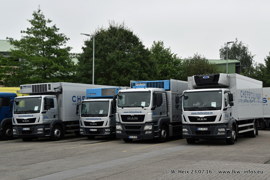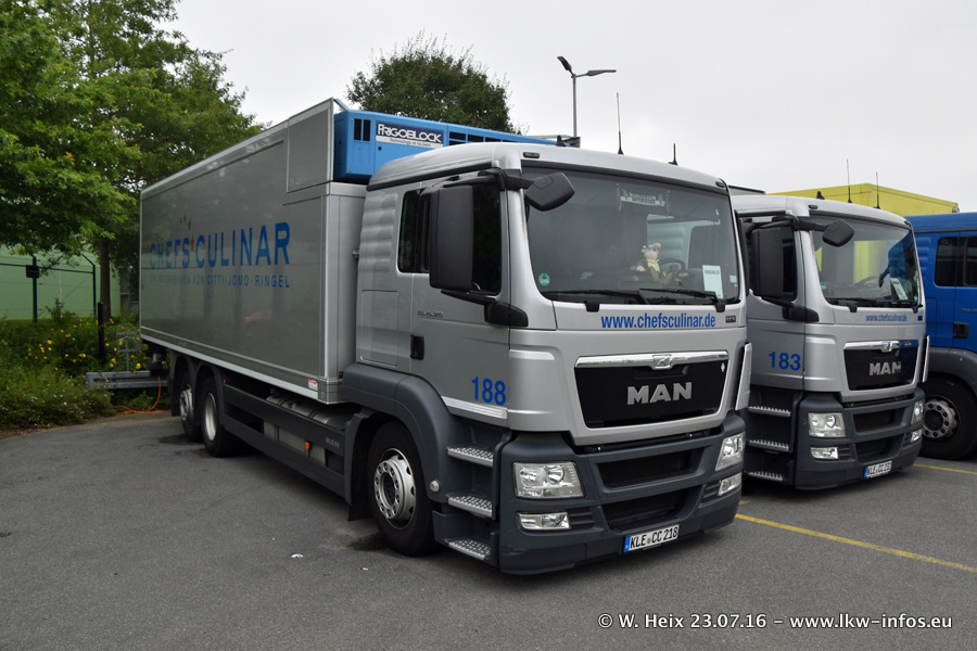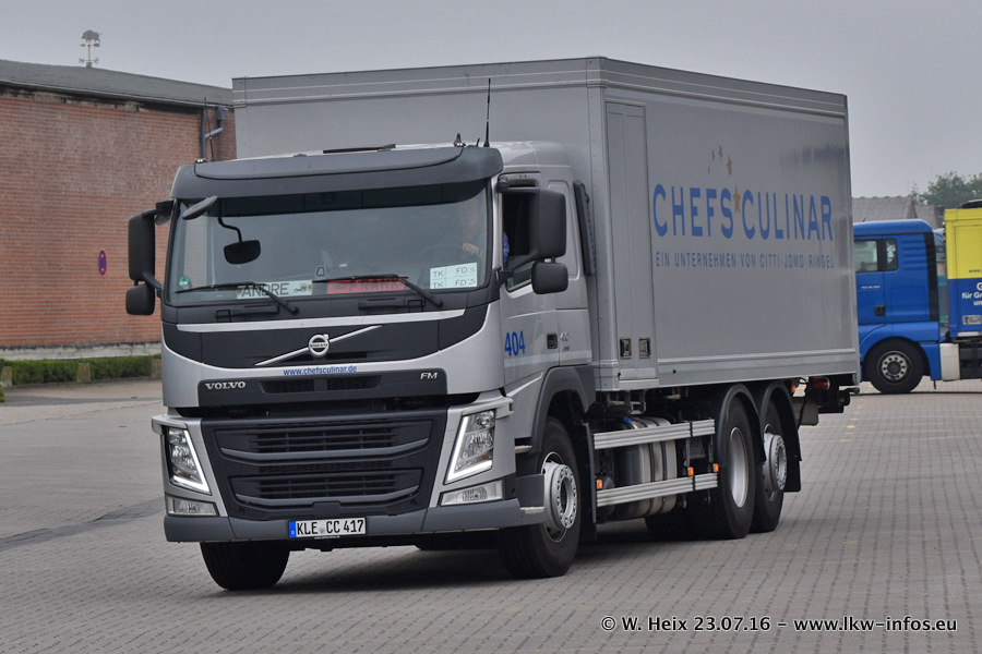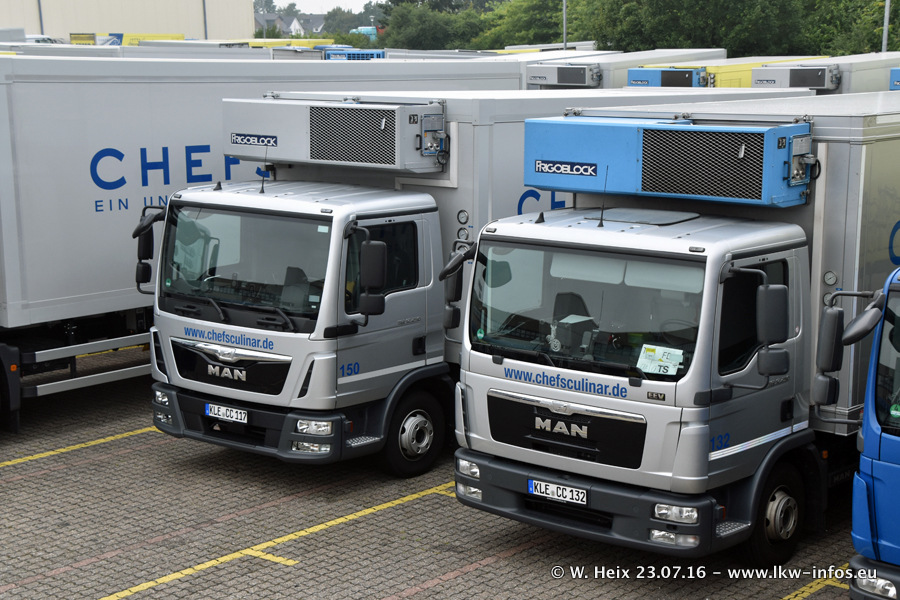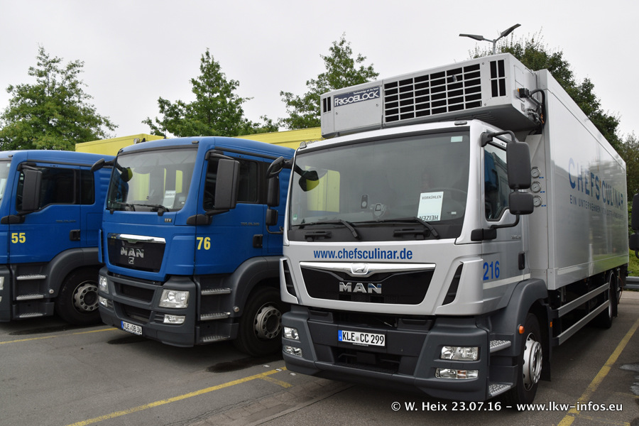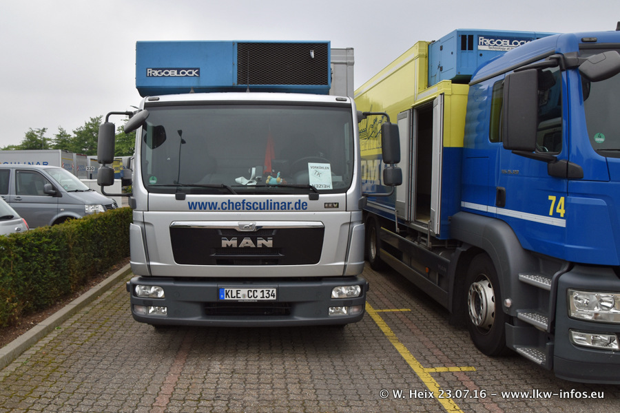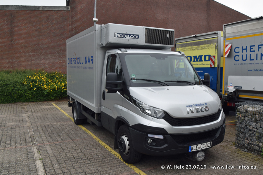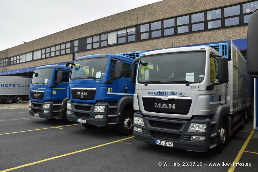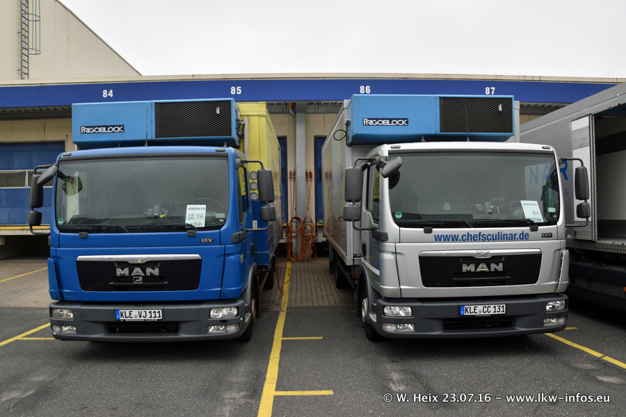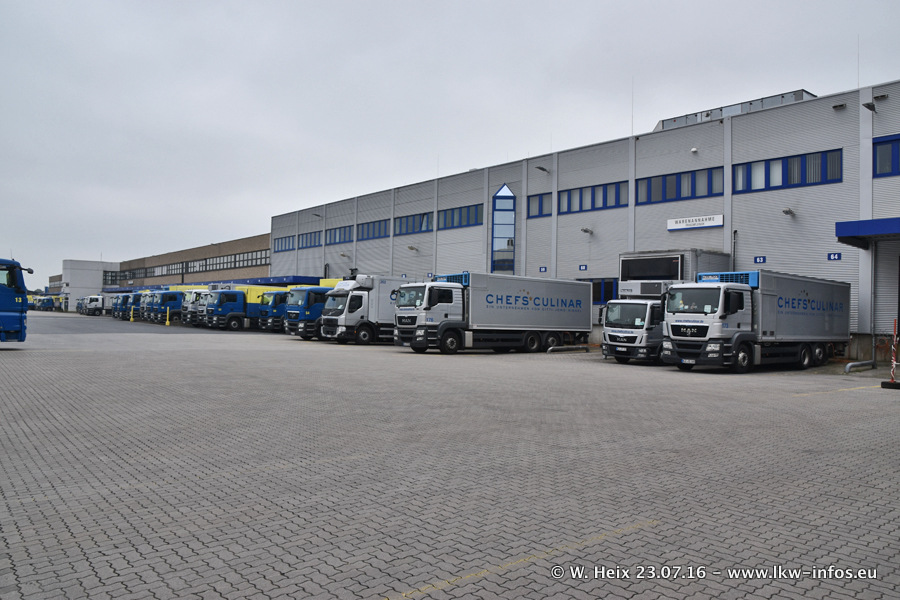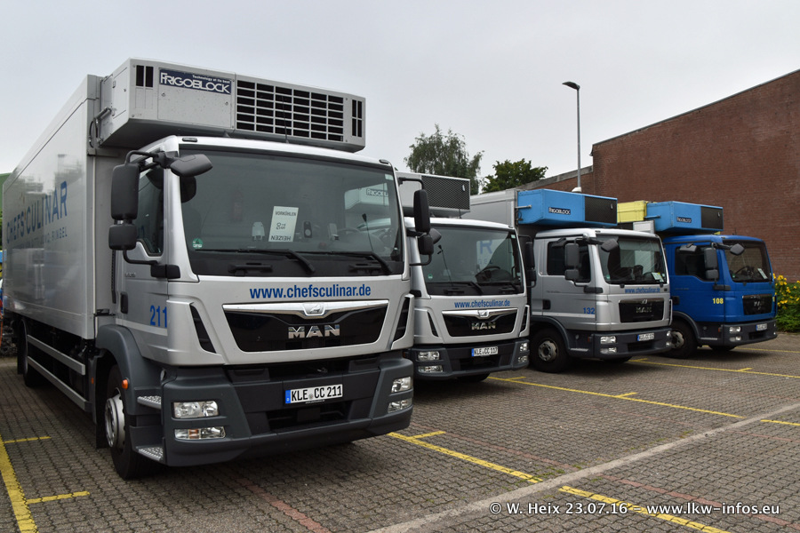 Inzwischen besteht der Fuhrpark rund zur Hälfte aus LKW im neuen Design "Chefs Culinar". Bei meinem letzten Besuch im April 2014 waren die ersten rund 10-12 LKW im neuen Design im Fuhrpark. Seit ca. 3 Monaten gibt es neben den ganzen LKW von MAN auch die ersten Volvo. Das sind Fahrzeuge der Baureihen FE und FM. Bei den kleinen Kühlahrzeugen unter 7,49 t, die von Iveco sind, gibt es inzwischen den ersten Daily der aktuellen Baureihe. Von den rund 120 Fahrzeugen am Standort Weeze war der größte Teil "zuhause".
