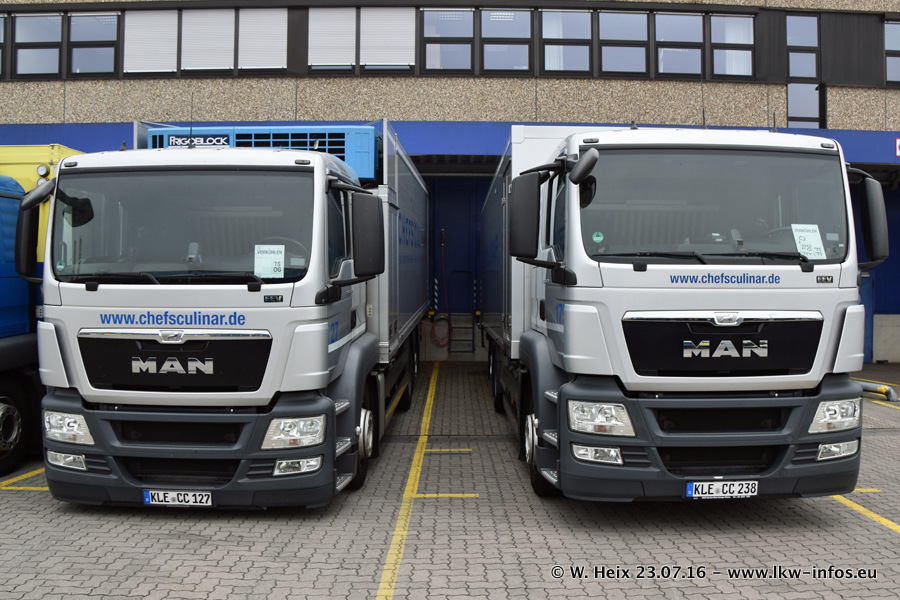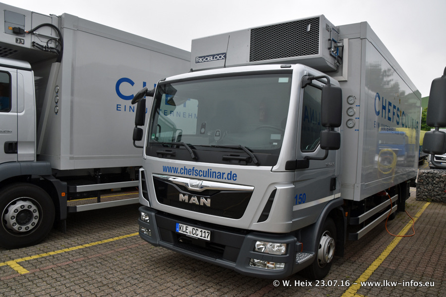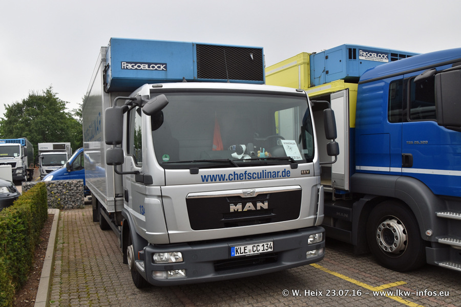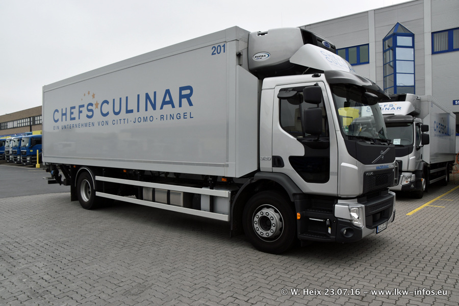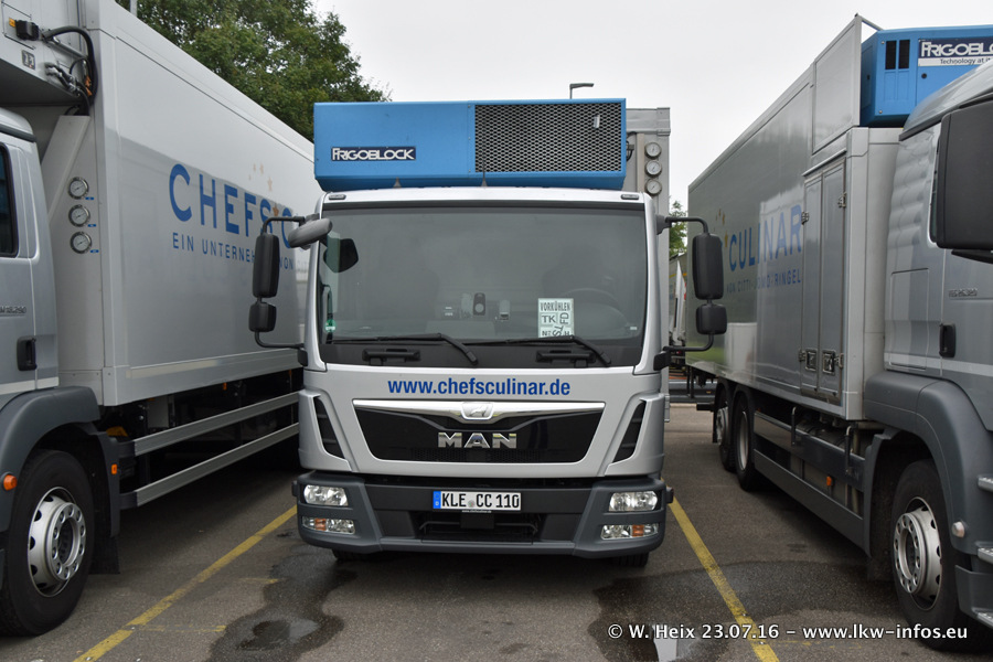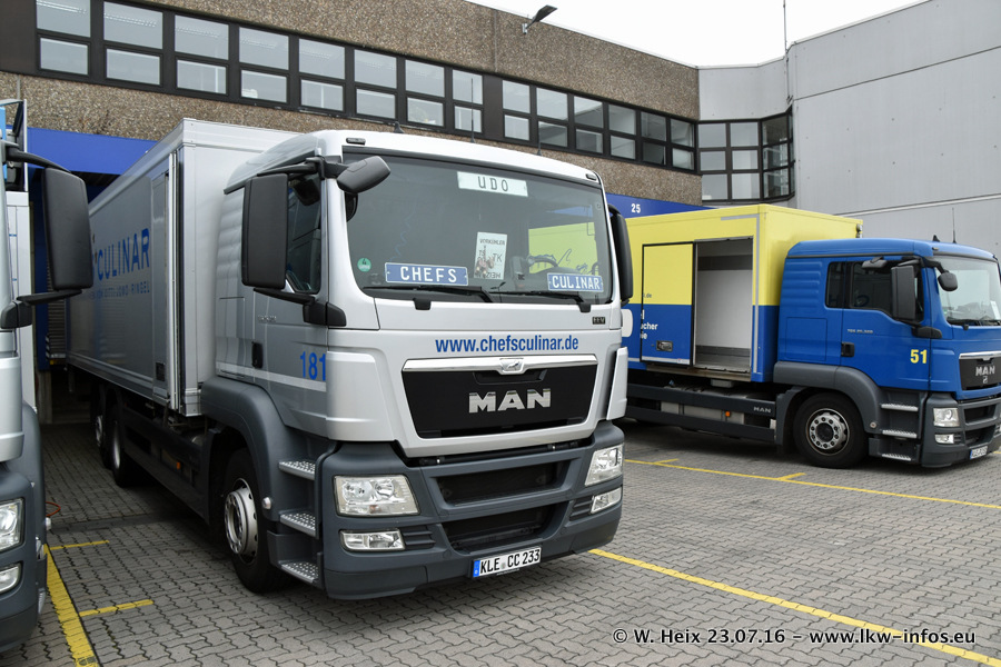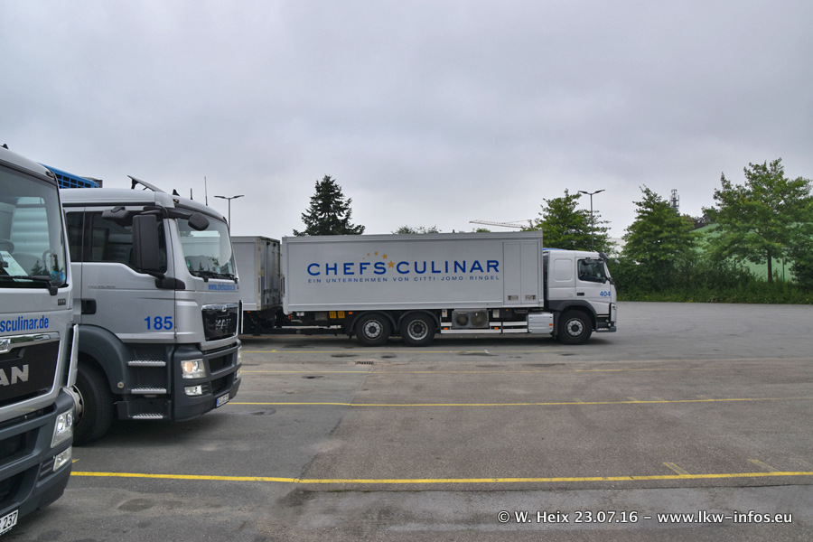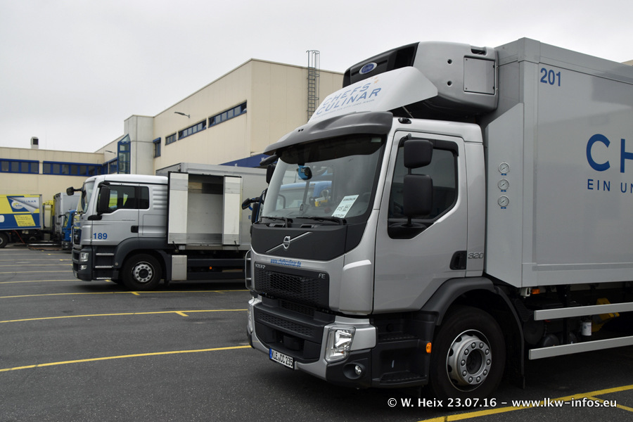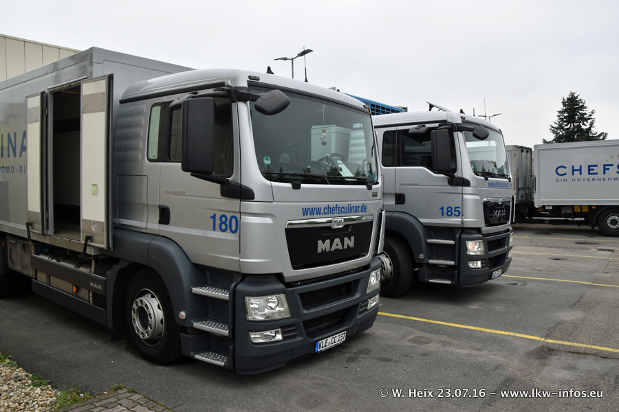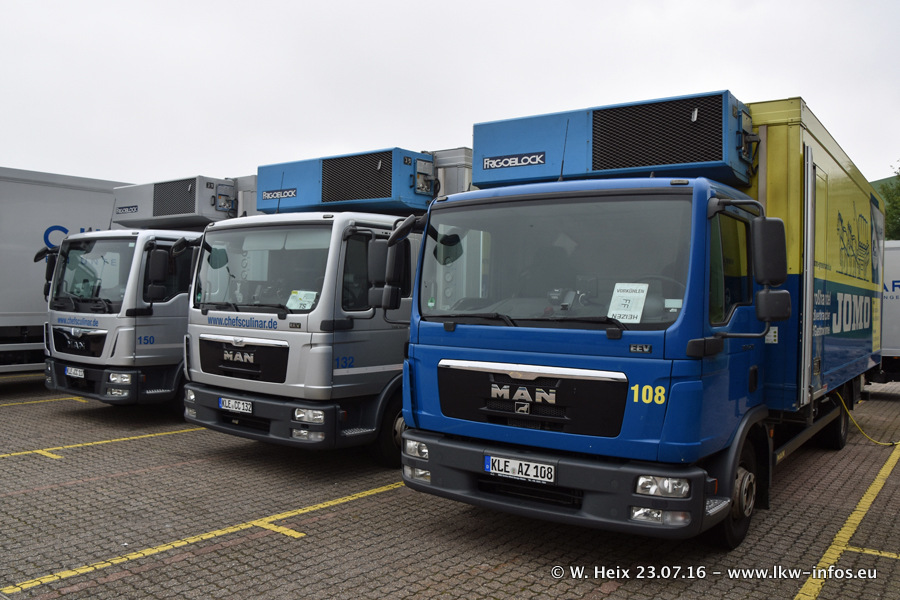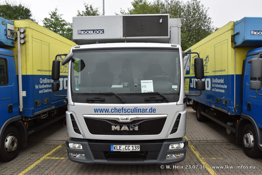 Inzwischen besteht der Fuhrpark rund zur Hälfte aus LKW im neuen Design "Chefs Culinar". Bei meinem letzten Besuch im April 2014 waren die ersten rund 10-12 LKW im neuen Design im Fuhrpark. Seit ca. 3 Monaten gibt es neben den ganzen LKW von MAN auch die ersten Volvo. Das sind Fahrzeuge der Baureihen FE und FM. Bei den kleinen Kühlahrzeugen unter 7,49 t, die von Iveco sind, gibt es inzwischen den ersten Daily der aktuellen Baureihe. Von den rund 120 Fahrzeugen am Standort Weeze war der größte Teil "zuhause".
