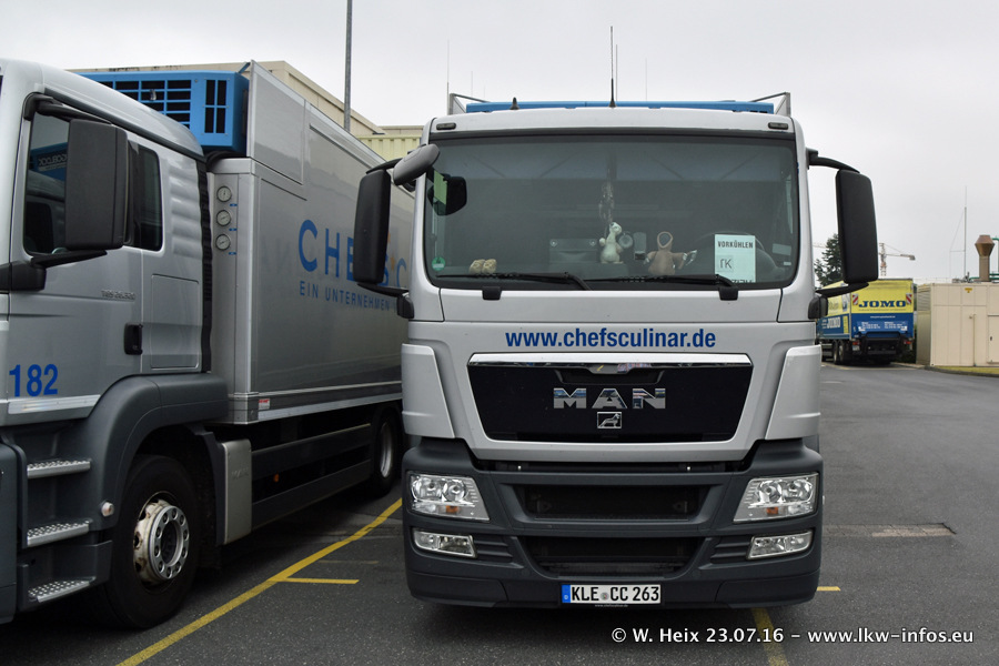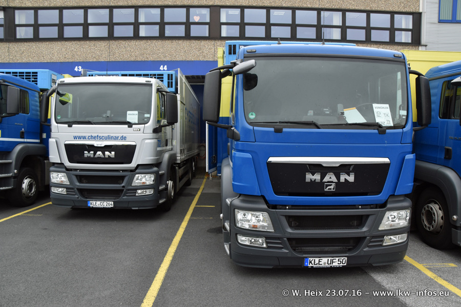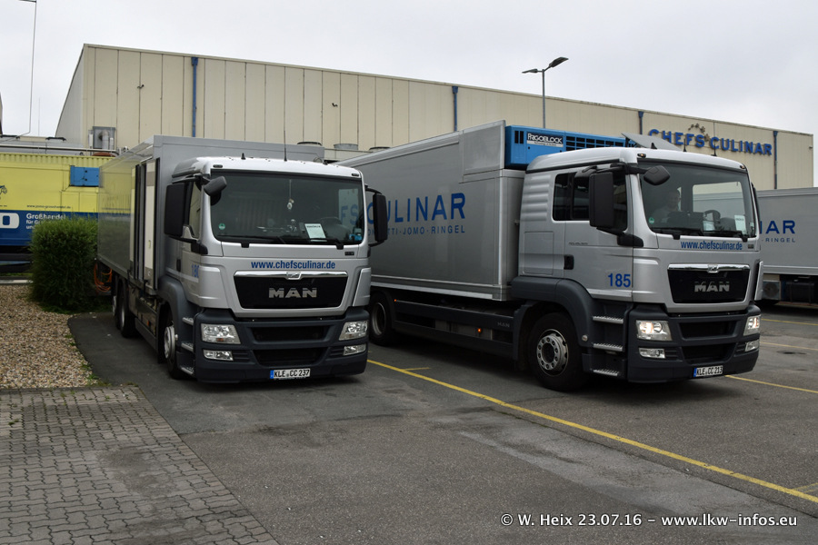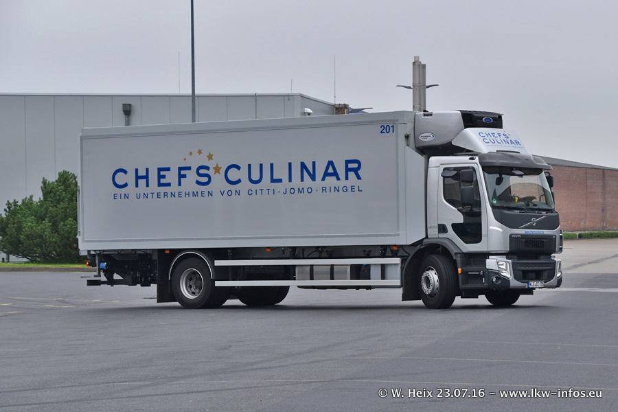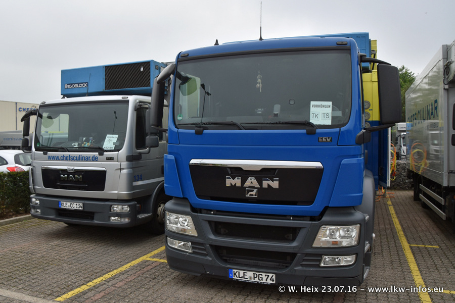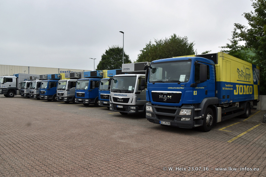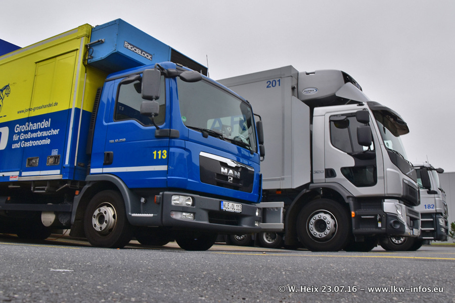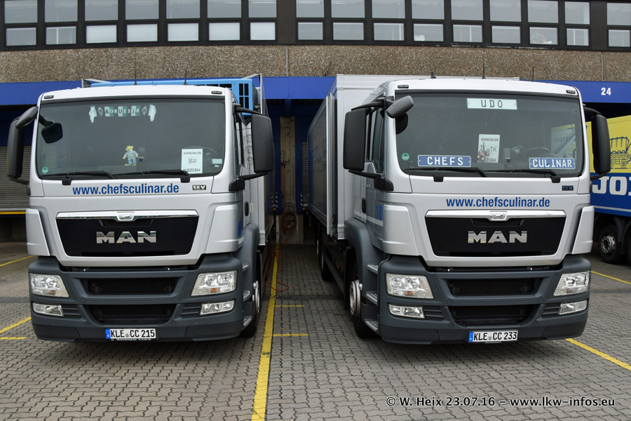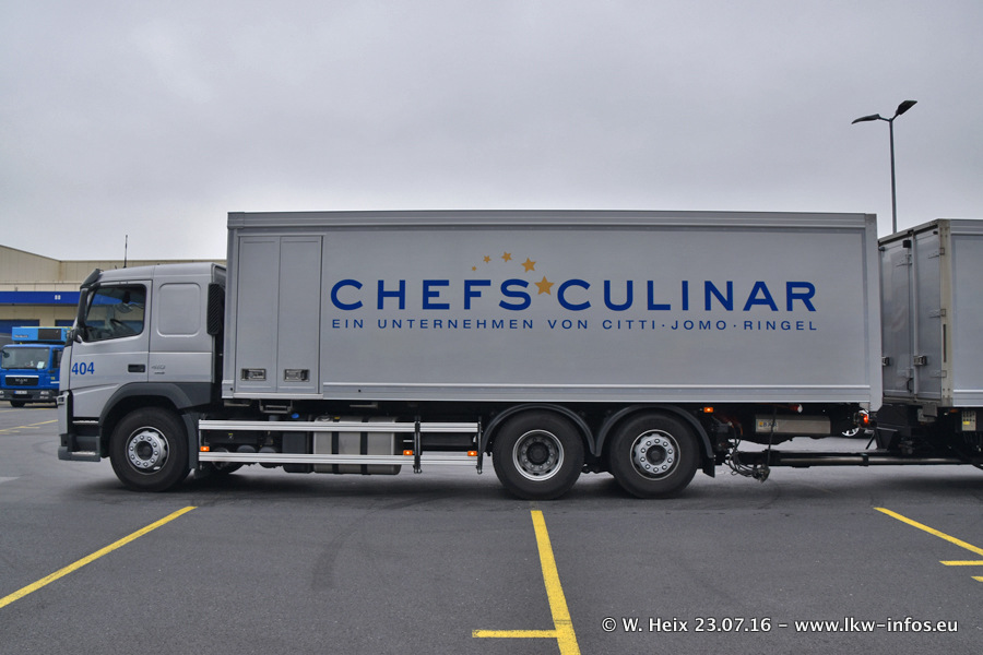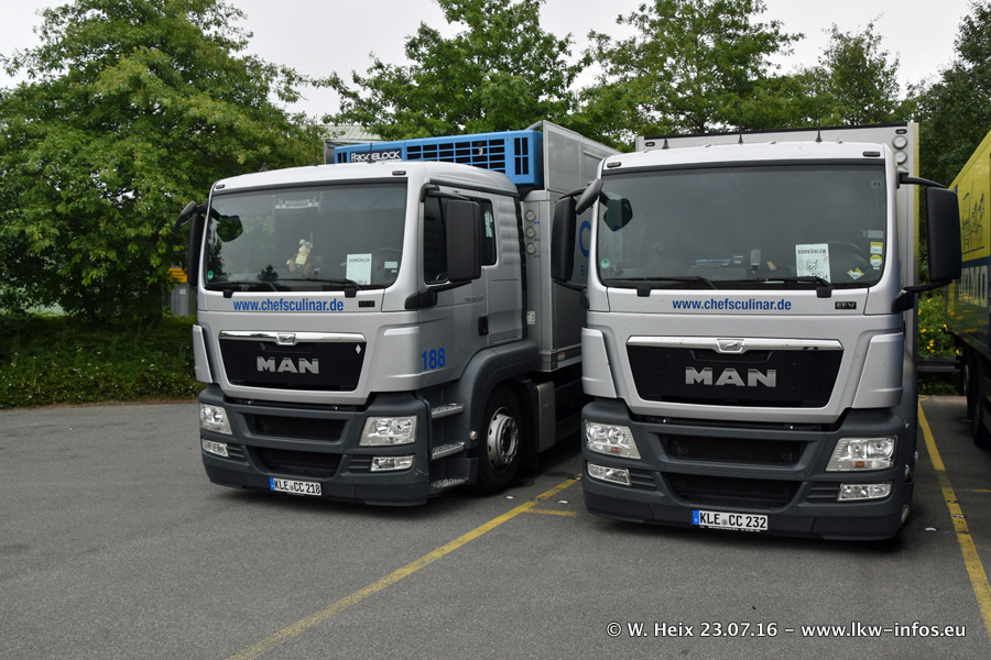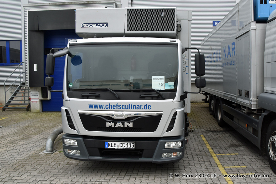 Inzwischen besteht der Fuhrpark rund zur Hälfte aus LKW im neuen Design "Chefs Culinar". Bei meinem letzten Besuch im April 2014 waren die ersten rund 10-12 LKW im neuen Design im Fuhrpark. Seit ca. 3 Monaten gibt es neben den ganzen LKW von MAN auch die ersten Volvo. Das sind Fahrzeuge der Baureihen FE und FM. Bei den kleinen Kühlahrzeugen unter 7,49 t, die von Iveco sind, gibt es inzwischen den ersten Daily der aktuellen Baureihe. Von den rund 120 Fahrzeugen am Standort Weeze war der größte Teil "zuhause".