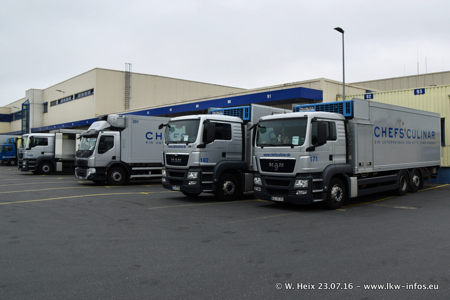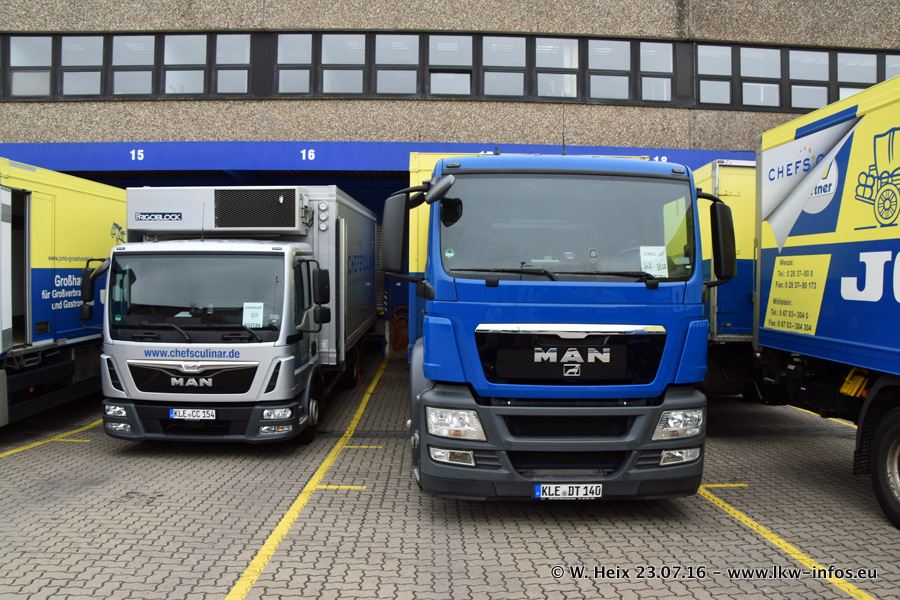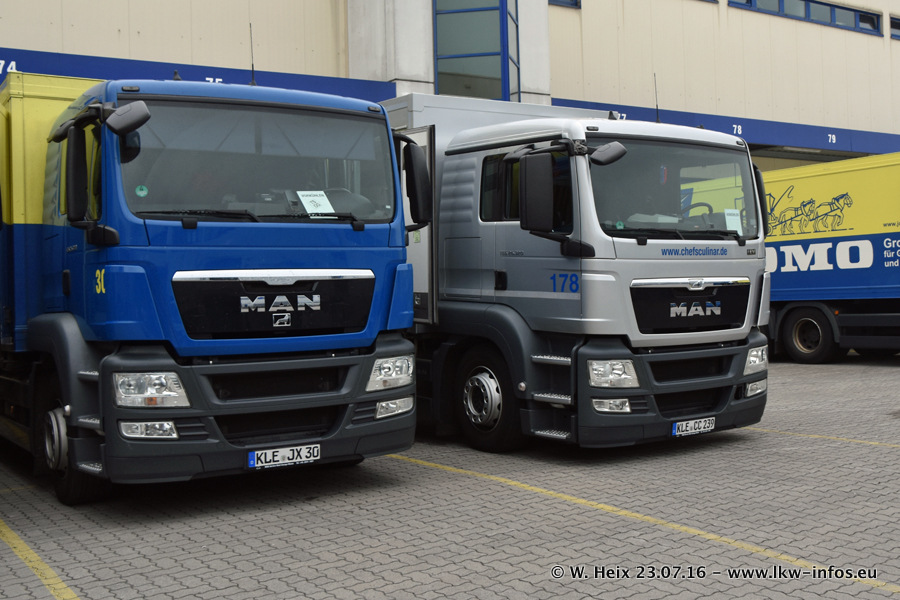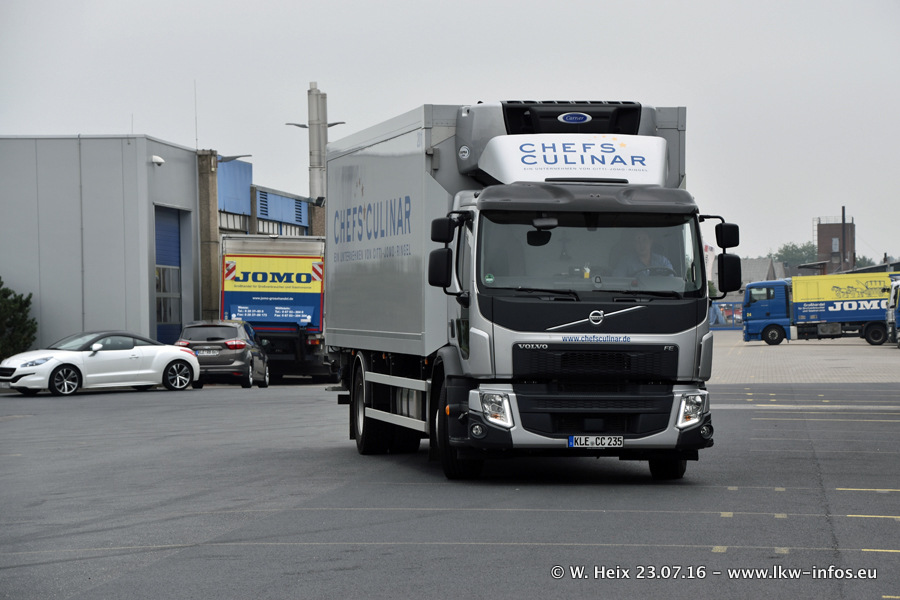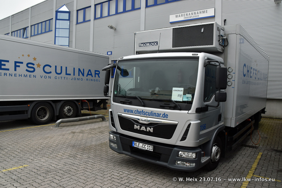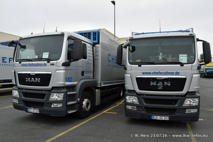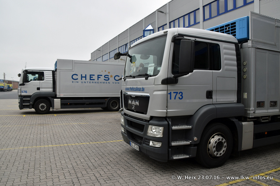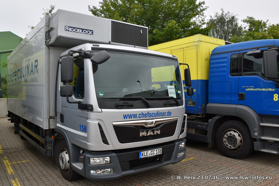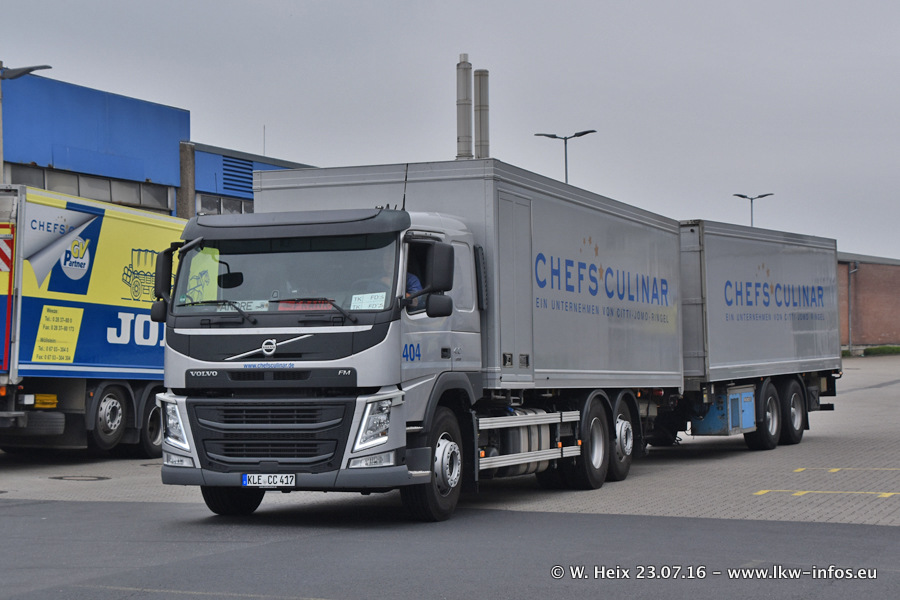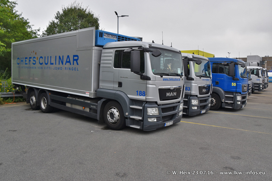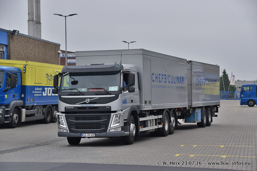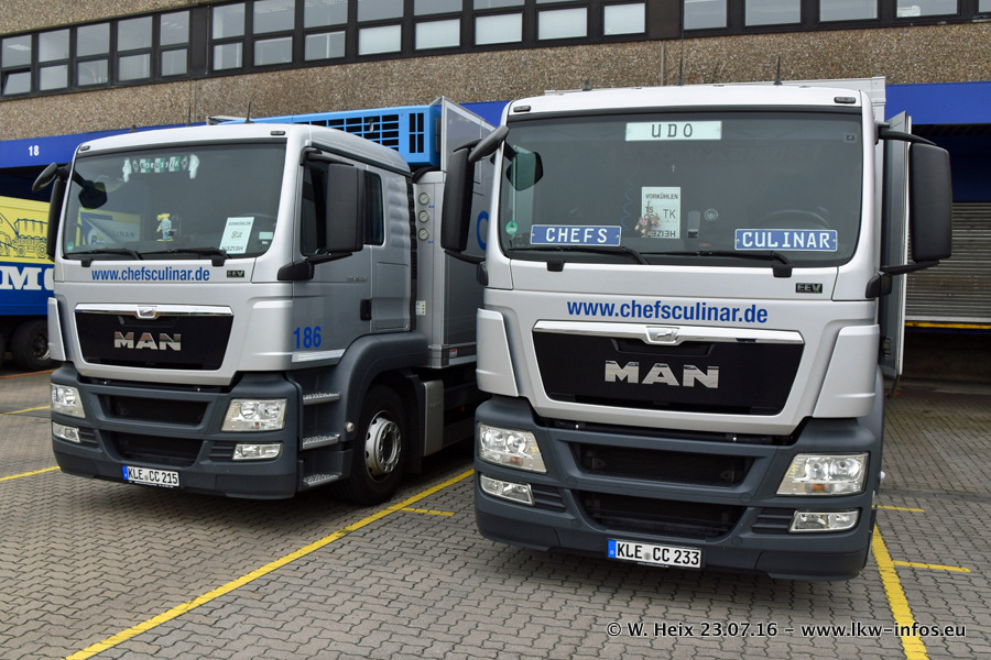 Inzwischen besteht der Fuhrpark rund zur Hälfte aus LKW im neuen Design "Chefs Culinar". Bei meinem letzten Besuch im April 2014 waren die ersten rund 10-12 LKW im neuen Design im Fuhrpark. Seit ca. 3 Monaten gibt es neben den ganzen LKW von MAN auch die ersten Volvo. Das sind Fahrzeuge der Baureihen FE und FM. Bei den kleinen Kühlahrzeugen unter 7,49 t, die von Iveco sind, gibt es inzwischen den ersten Daily der aktuellen Baureihe. Von den rund 120 Fahrzeugen am Standort Weeze war der größte Teil "zuhause".