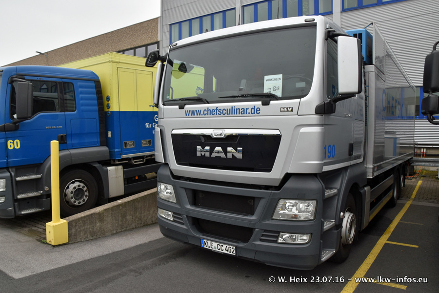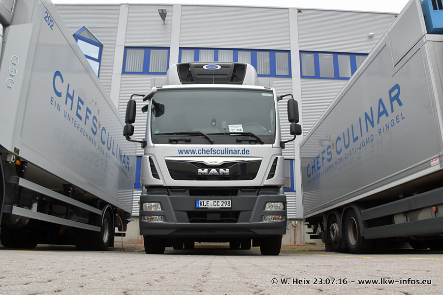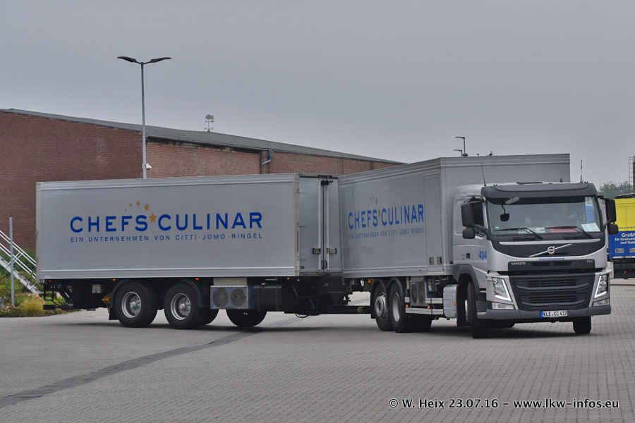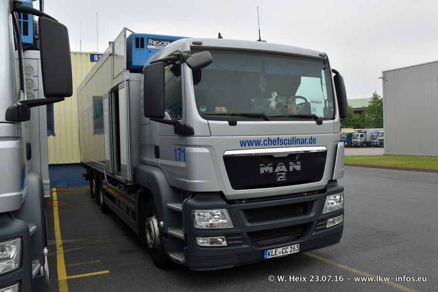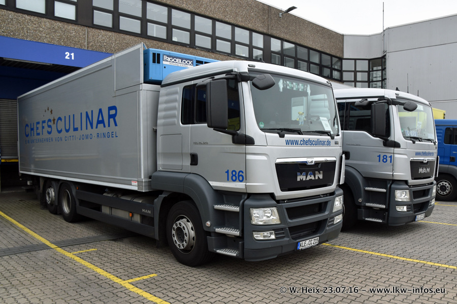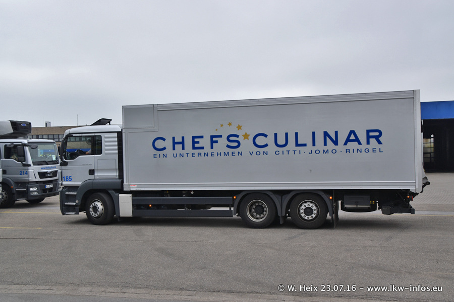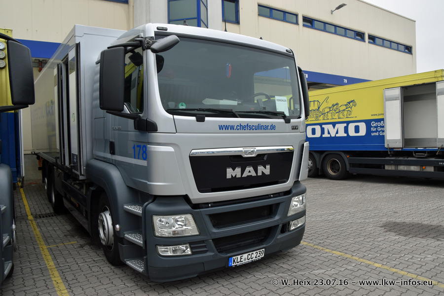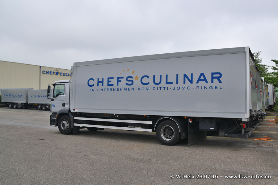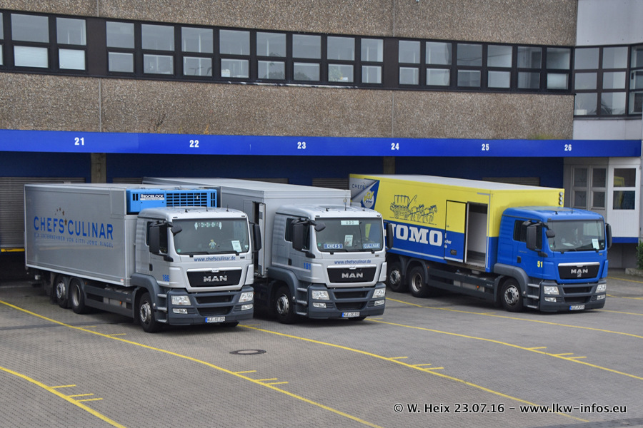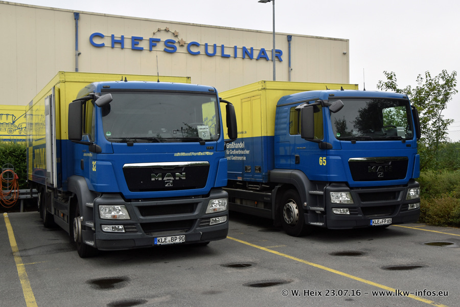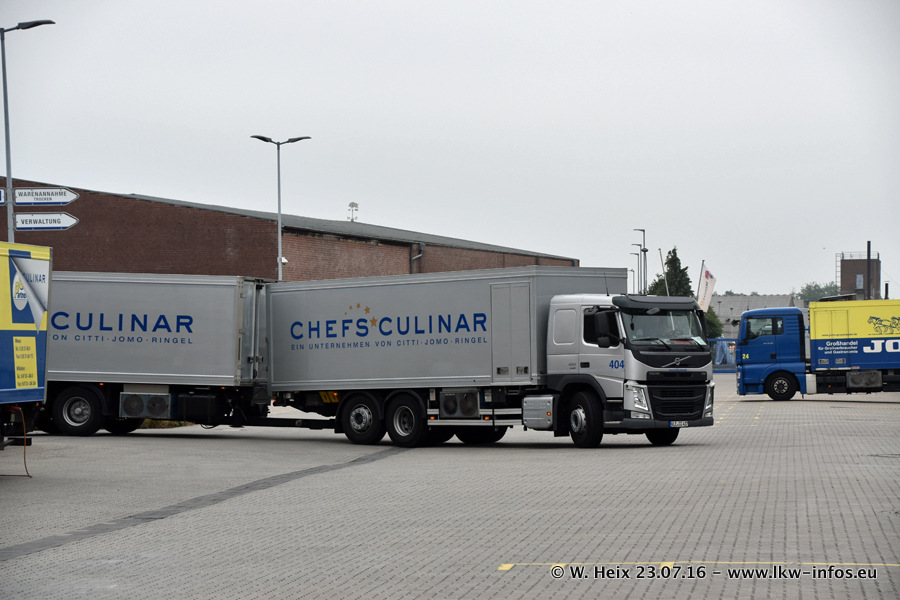 Inzwischen besteht der Fuhrpark rund zur Hälfte aus LKW im neuen Design "Chefs Culinar". Bei meinem letzten Besuch im April 2014 waren die ersten rund 10-12 LKW im neuen Design im Fuhrpark. Seit ca. 3 Monaten gibt es neben den ganzen LKW von MAN auch die ersten Volvo. Das sind Fahrzeuge der Baureihen FE und FM. Bei den kleinen Kühlahrzeugen unter 7,49 t, die von Iveco sind, gibt es inzwischen den ersten Daily der aktuellen Baureihe. Von den rund 120 Fahrzeugen am Standort Weeze war der größte Teil "zuhause".