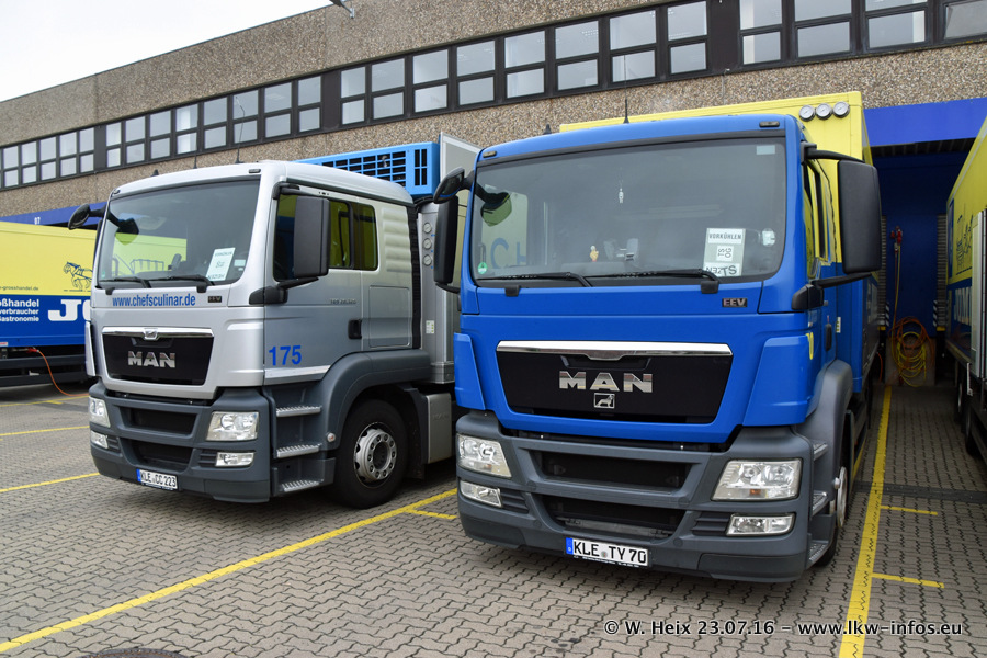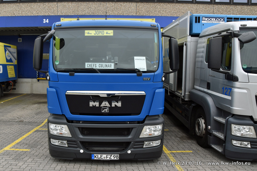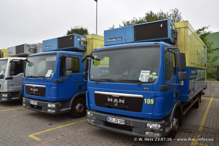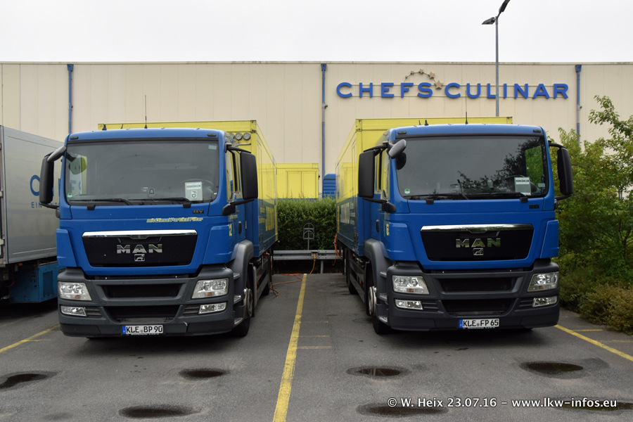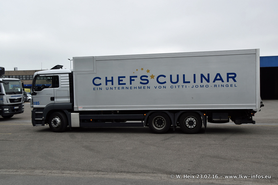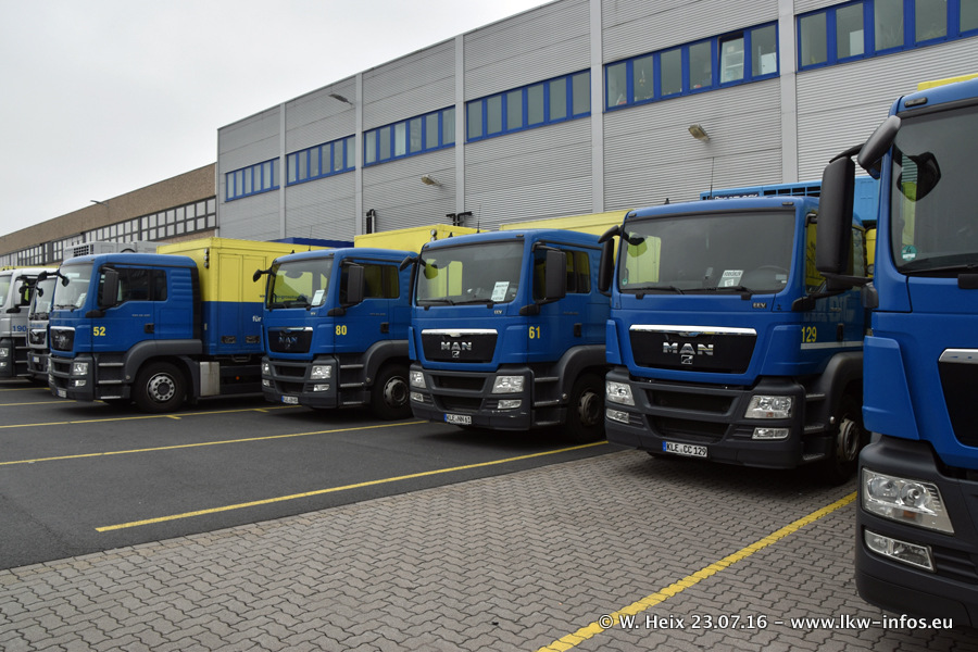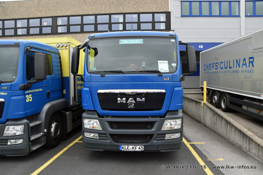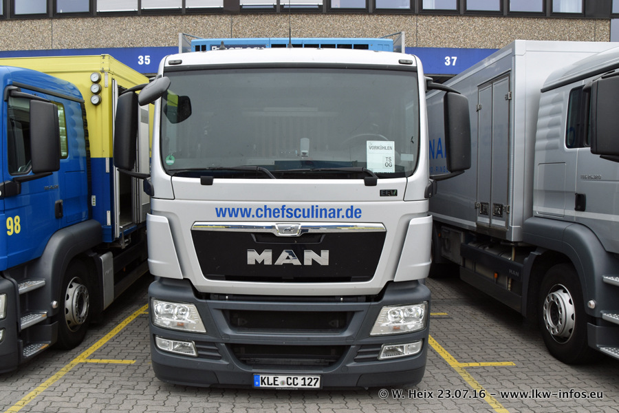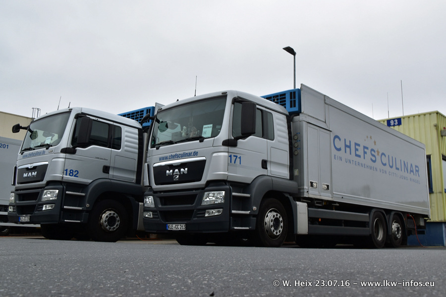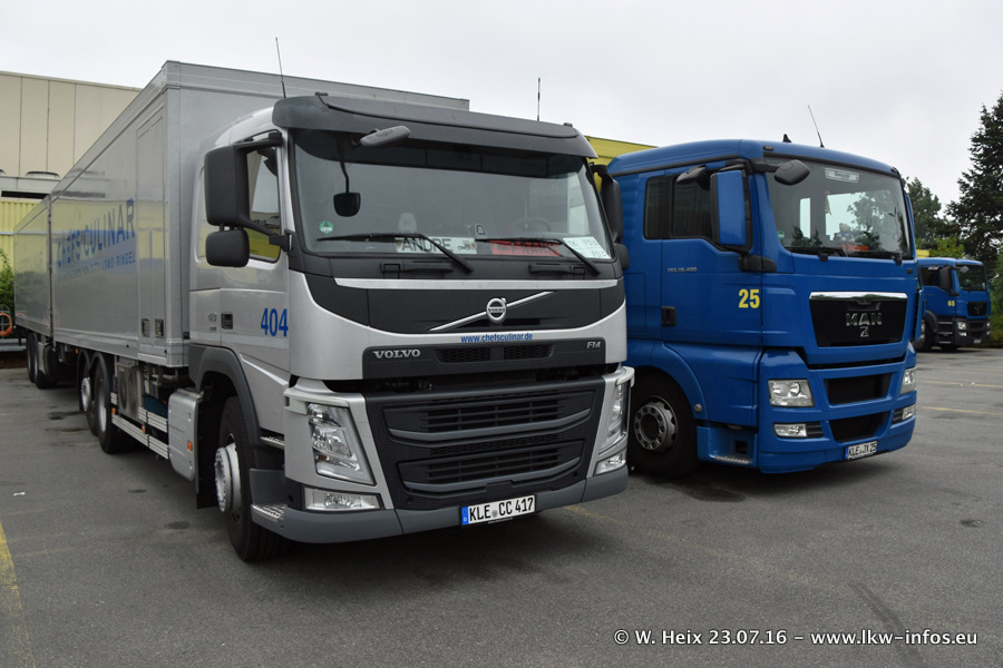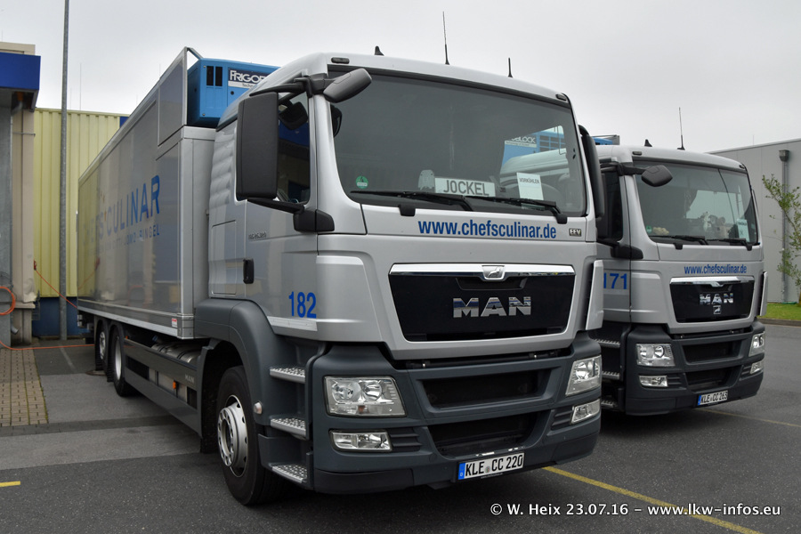Inzwischen besteht der Fuhrpark rund zur Hälfte aus LKW im neuen Design "Chefs Culinar". Bei meinem letzten Besuch im April 2014 waren die ersten rund 10-12 LKW im neuen Design im Fuhrpark. Seit ca. 3 Monaten gibt es neben den ganzen LKW von MAN auch die ersten Volvo. Das sind Fahrzeuge der Baureihen FE und FM. Bei den kleinen Kühlahrzeugen unter 7,49 t, die von Iveco sind, gibt es inzwischen den ersten Daily der aktuellen Baureihe. Von den rund 120 Fahrzeugen am Standort Weeze war der größte Teil "zuhause".