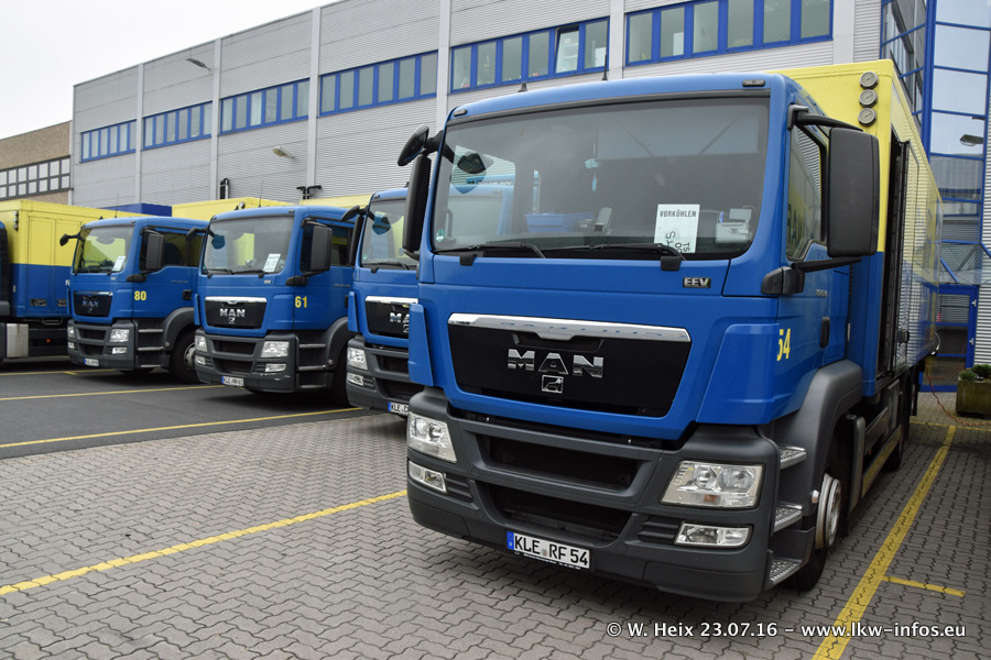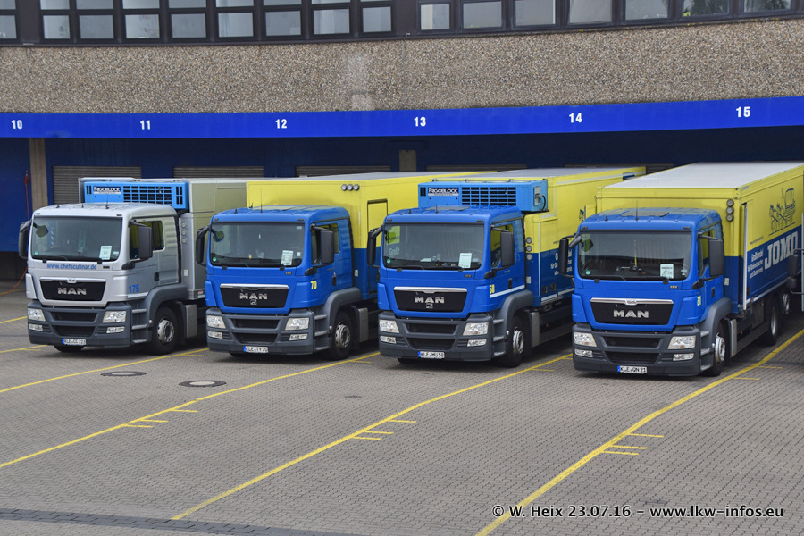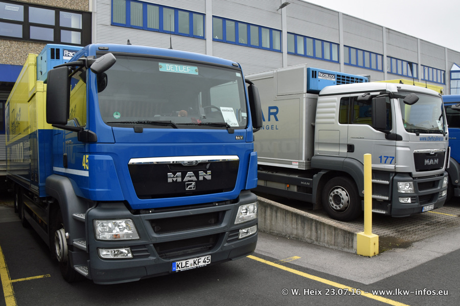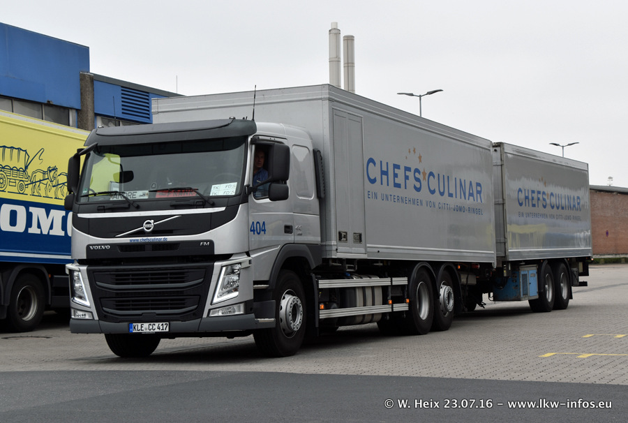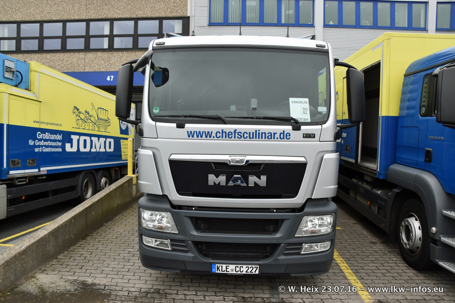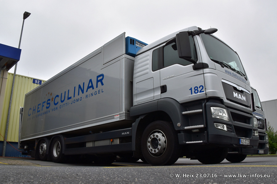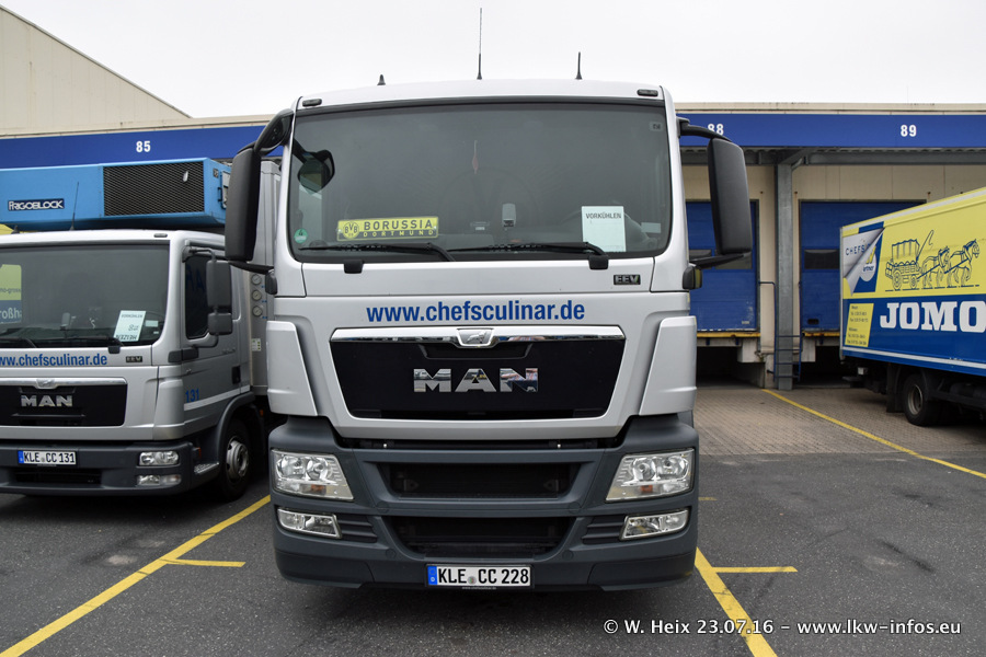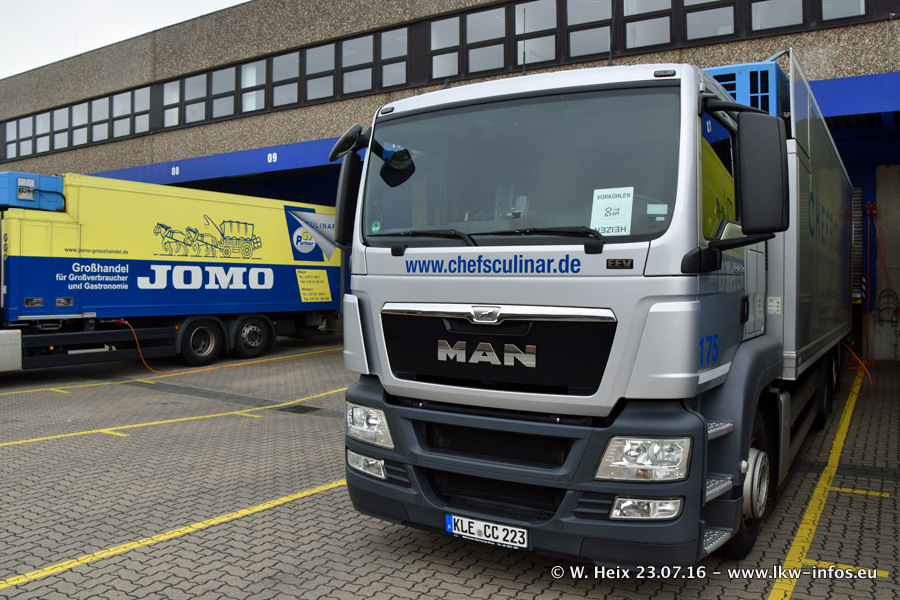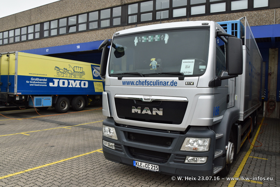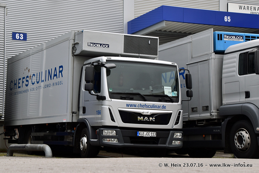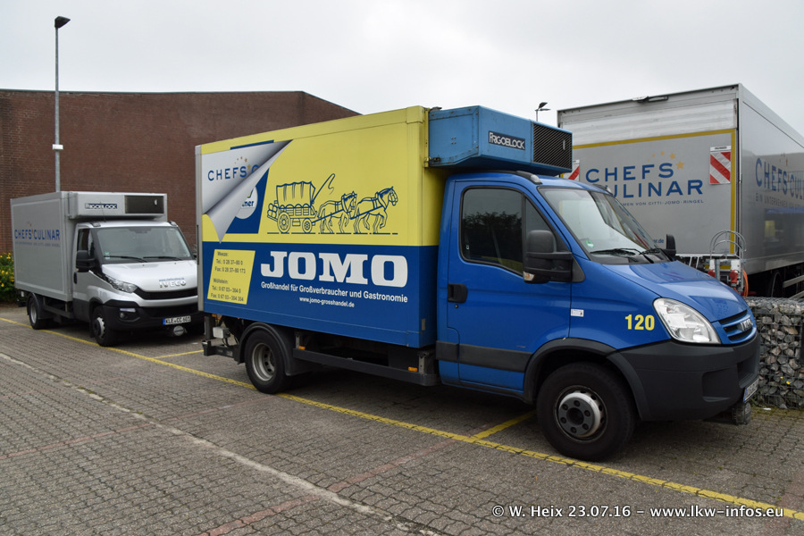 Inzwischen besteht der Fuhrpark rund zur Hälfte aus LKW im neuen Design "Chefs Culinar". Bei meinem letzten Besuch im April 2014 waren die ersten rund 10-12 LKW im neuen Design im Fuhrpark. Seit ca. 3 Monaten gibt es neben den ganzen LKW von MAN auch die ersten Volvo. Das sind Fahrzeuge der Baureihen FE und FM. Bei den kleinen Kühlahrzeugen unter 7,49 t, die von Iveco sind, gibt es inzwischen den ersten Daily der aktuellen Baureihe. Von den rund 120 Fahrzeugen am Standort Weeze war der größte Teil "zuhause".