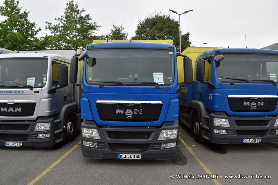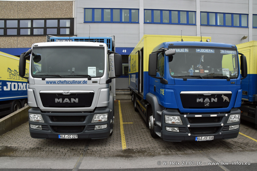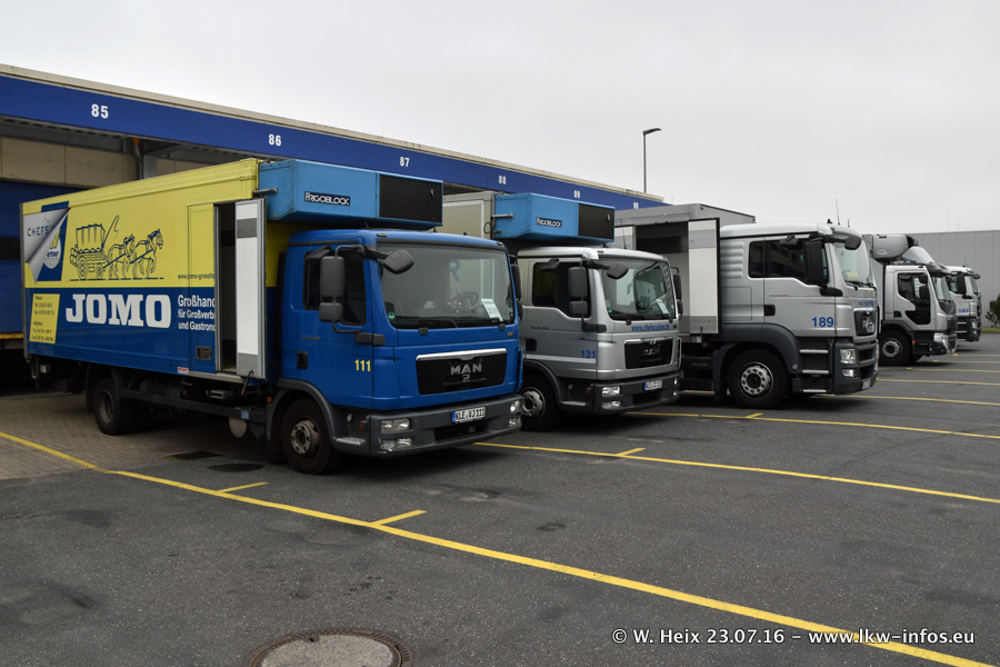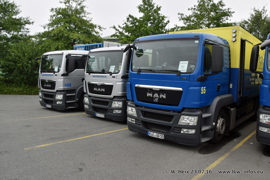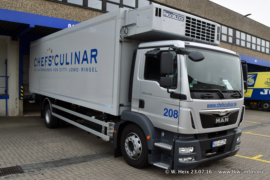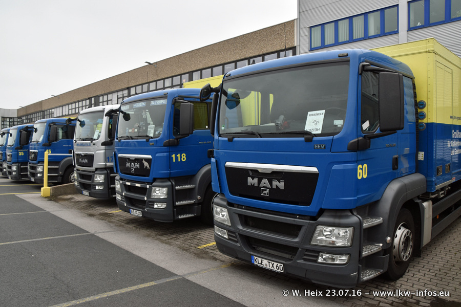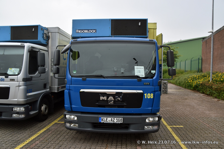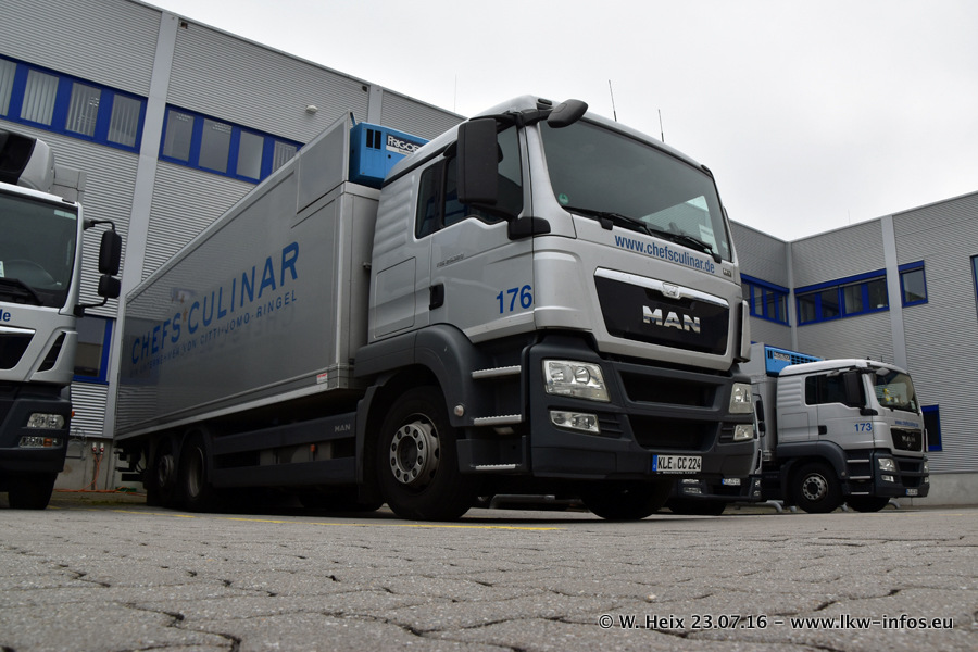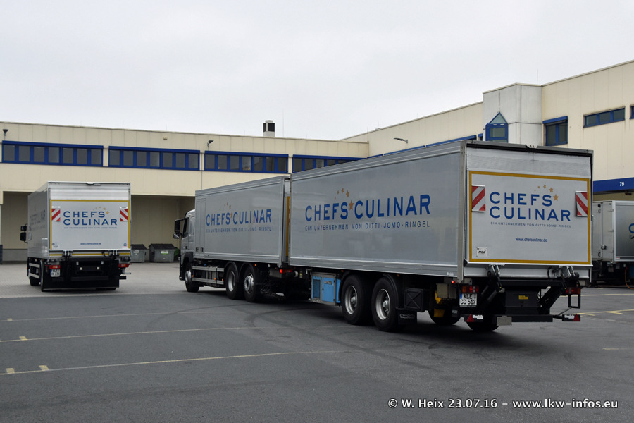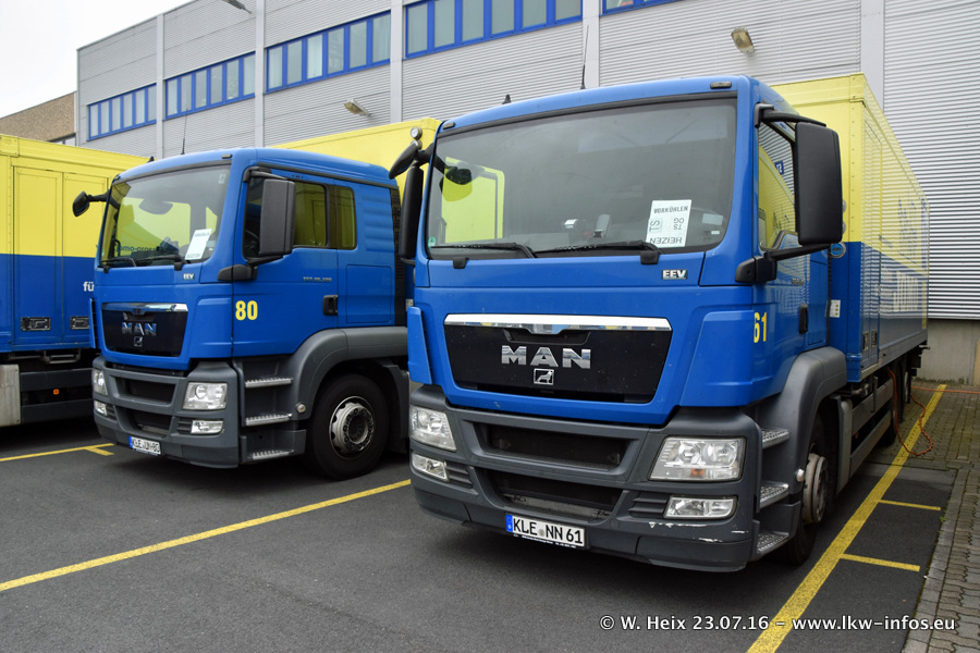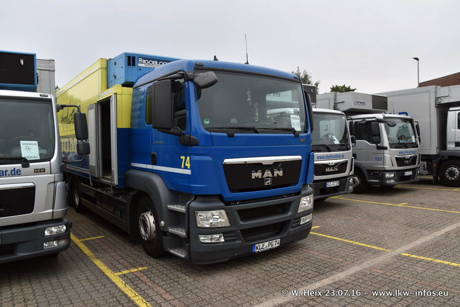 Inzwischen besteht der Fuhrpark rund zur Hälfte aus LKW im neuen Design "Chefs Culinar". Bei meinem letzten Besuch im April 2014 waren die ersten rund 10-12 LKW im neuen Design im Fuhrpark. Seit ca. 3 Monaten gibt es neben den ganzen LKW von MAN auch die ersten Volvo. Das sind Fahrzeuge der Baureihen FE und FM. Bei den kleinen Kühlahrzeugen unter 7,49 t, die von Iveco sind, gibt es inzwischen den ersten Daily der aktuellen Baureihe. Von den rund 120 Fahrzeugen am Standort Weeze war der größte Teil "zuhause".