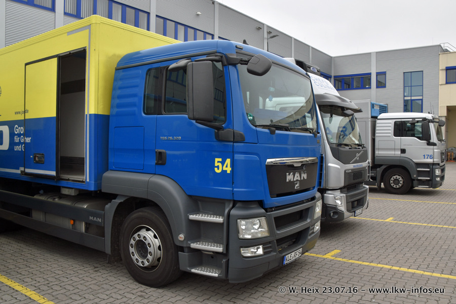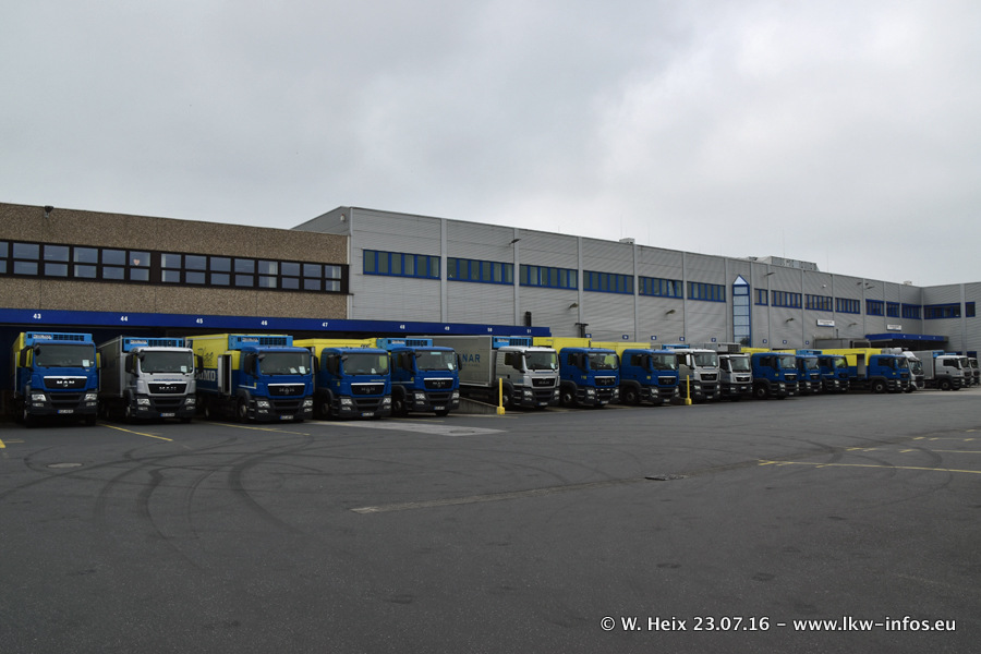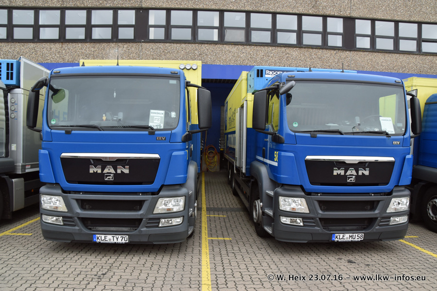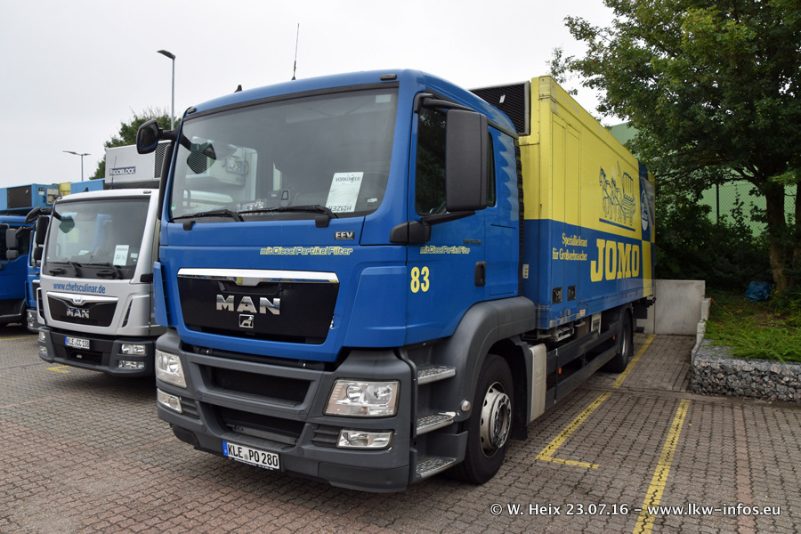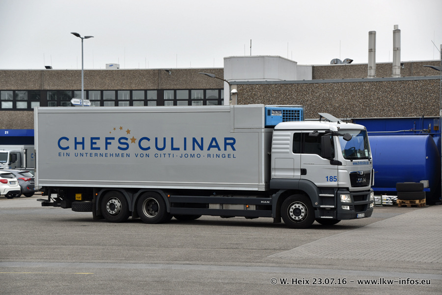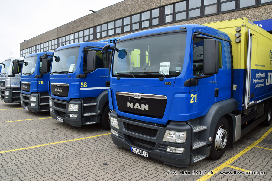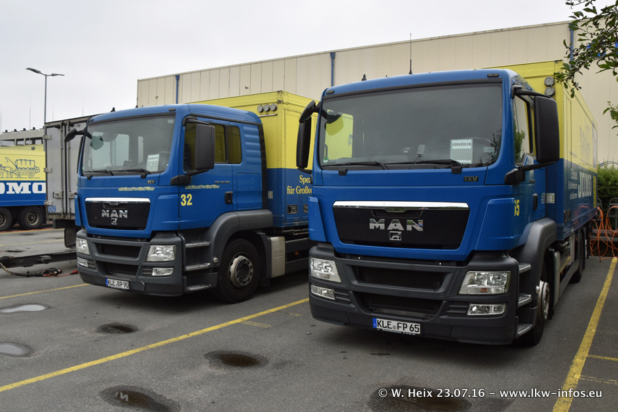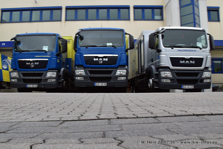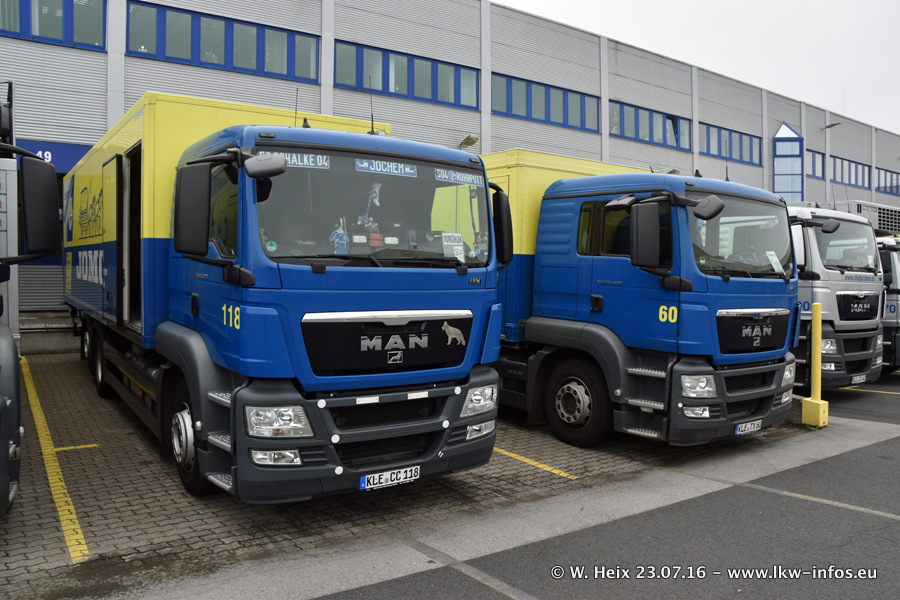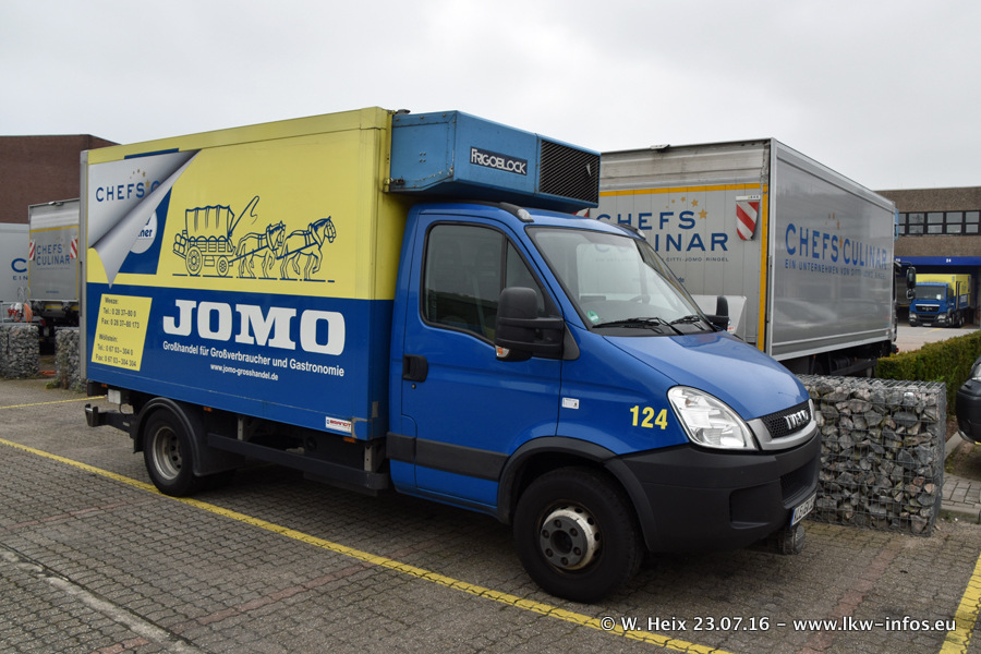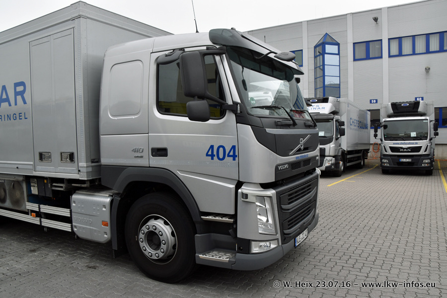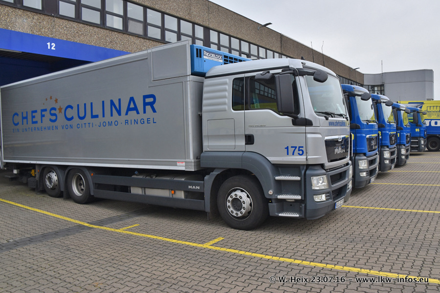 Inzwischen besteht der Fuhrpark rund zur Hälfte aus LKW im neuen Design "Chefs Culinar". Bei meinem letzten Besuch im April 2014 waren die ersten rund 10-12 LKW im neuen Design im Fuhrpark. Seit ca. 3 Monaten gibt es neben den ganzen LKW von MAN auch die ersten Volvo. Das sind Fahrzeuge der Baureihen FE und FM. Bei den kleinen Kühlahrzeugen unter 7,49 t, die von Iveco sind, gibt es inzwischen den ersten Daily der aktuellen Baureihe. Von den rund 120 Fahrzeugen am Standort Weeze war der größte Teil "zuhause".