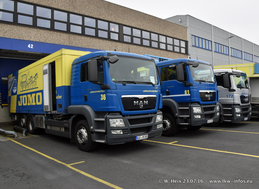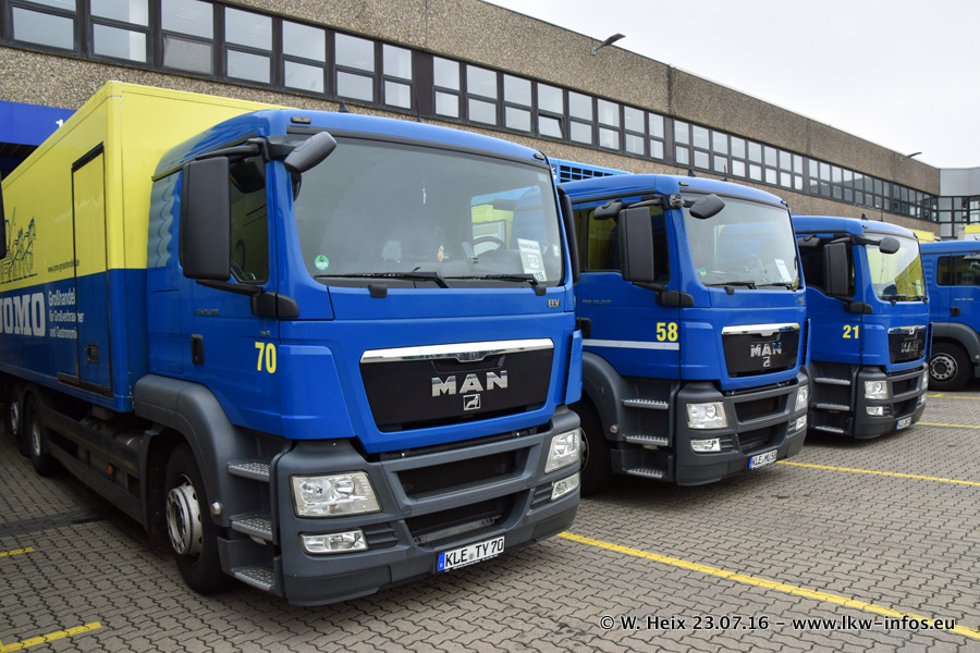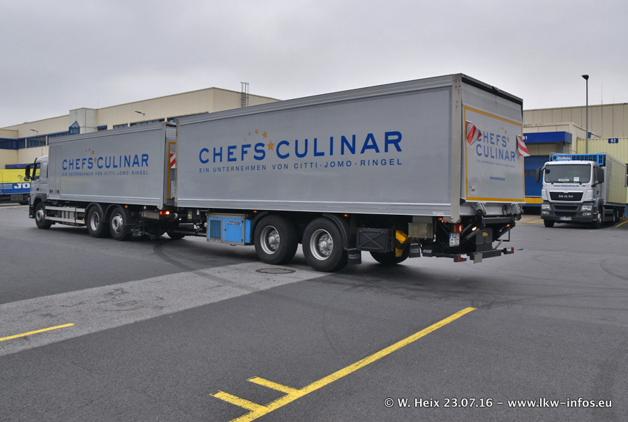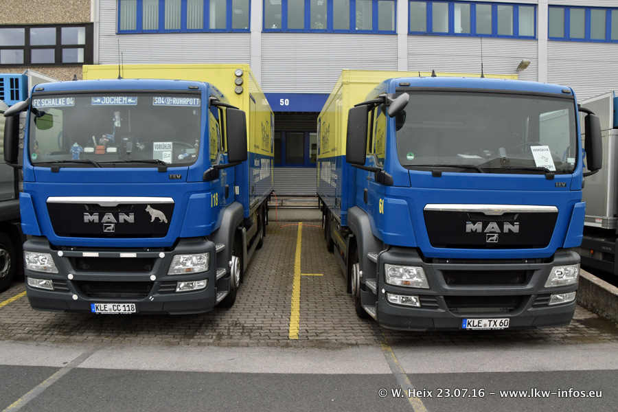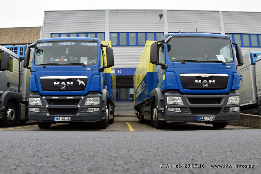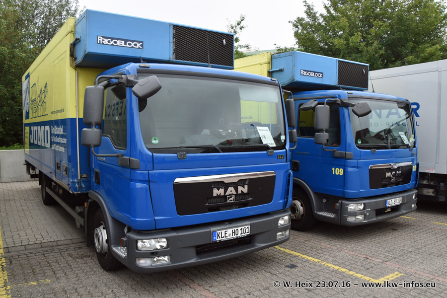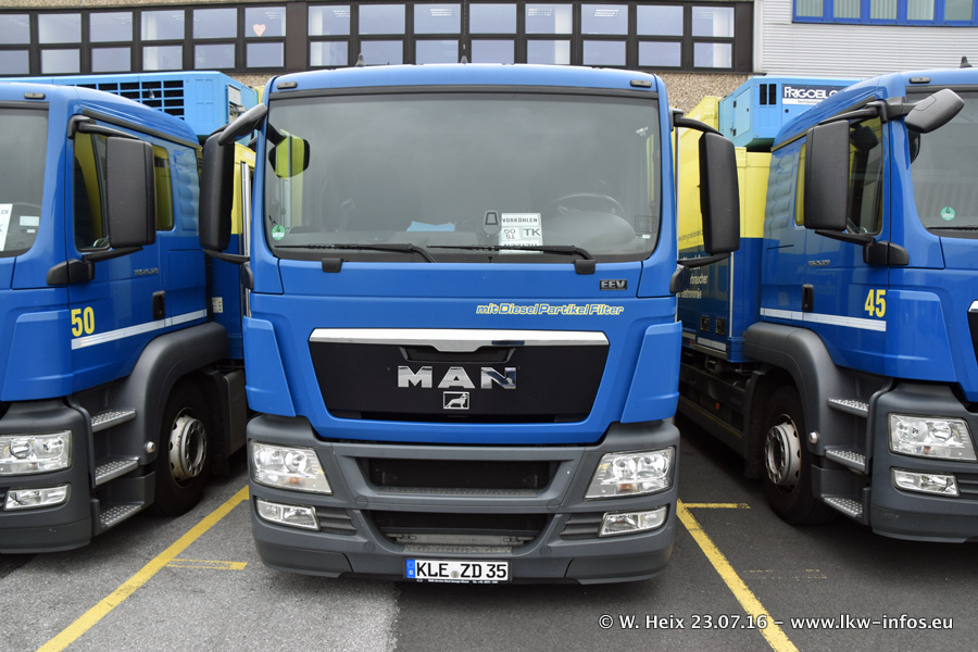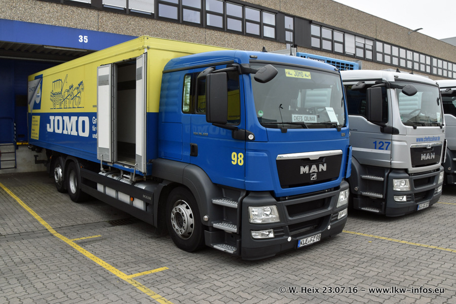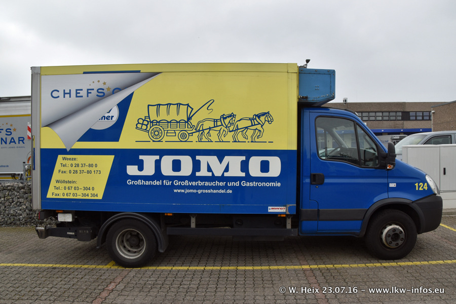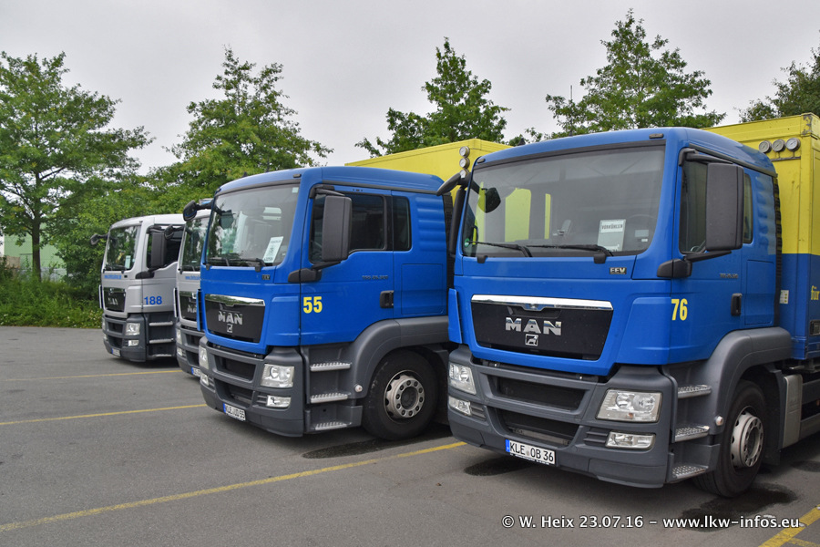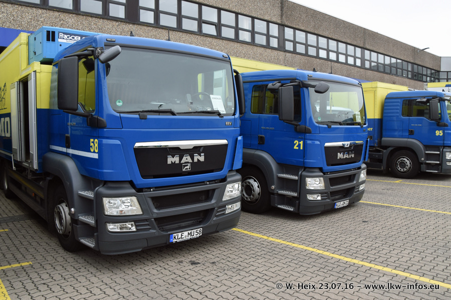 Inzwischen besteht der Fuhrpark rund zur Hälfte aus LKW im neuen Design "Chefs Culinar". Bei meinem letzten Besuch im April 2014 waren die ersten rund 10-12 LKW im neuen Design im Fuhrpark. Seit ca. 3 Monaten gibt es neben den ganzen LKW von MAN auch die ersten Volvo. Das sind Fahrzeuge der Baureihen FE und FM. Bei den kleinen Kühlahrzeugen unter 7,49 t, die von Iveco sind, gibt es inzwischen den ersten Daily der aktuellen Baureihe. Von den rund 120 Fahrzeugen am Standort Weeze war der größte Teil "zuhause".