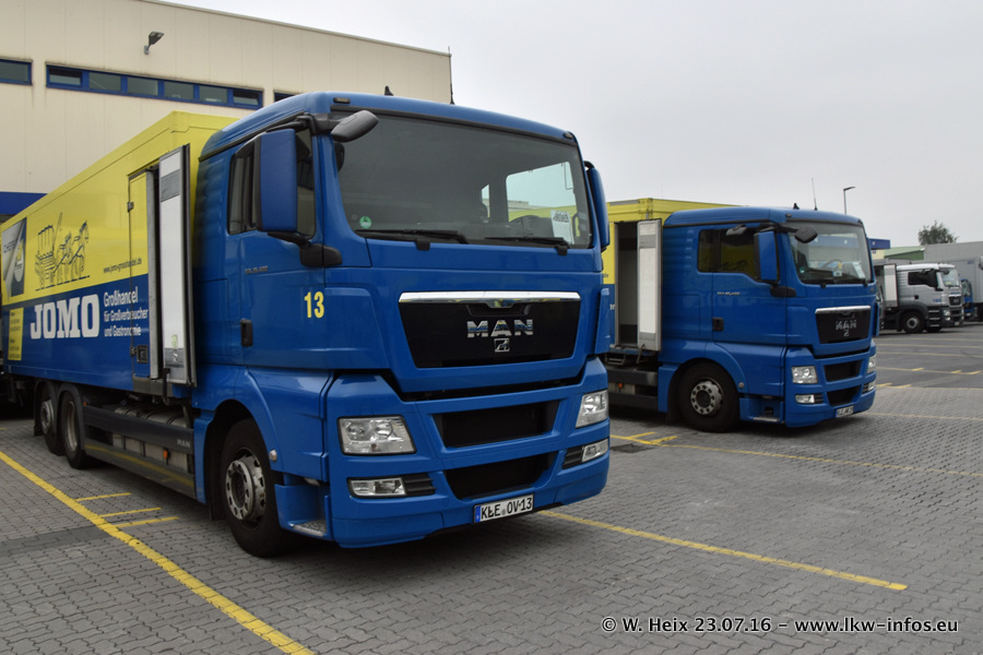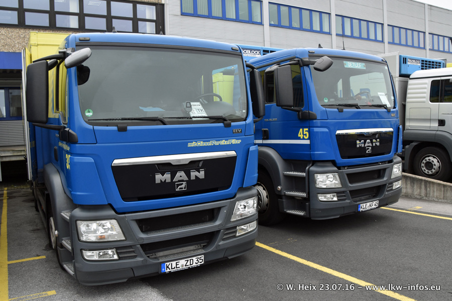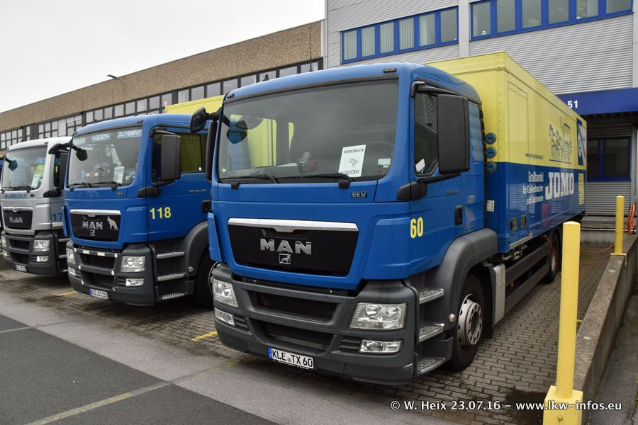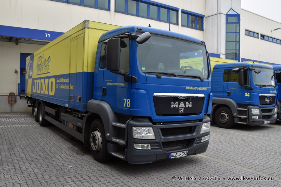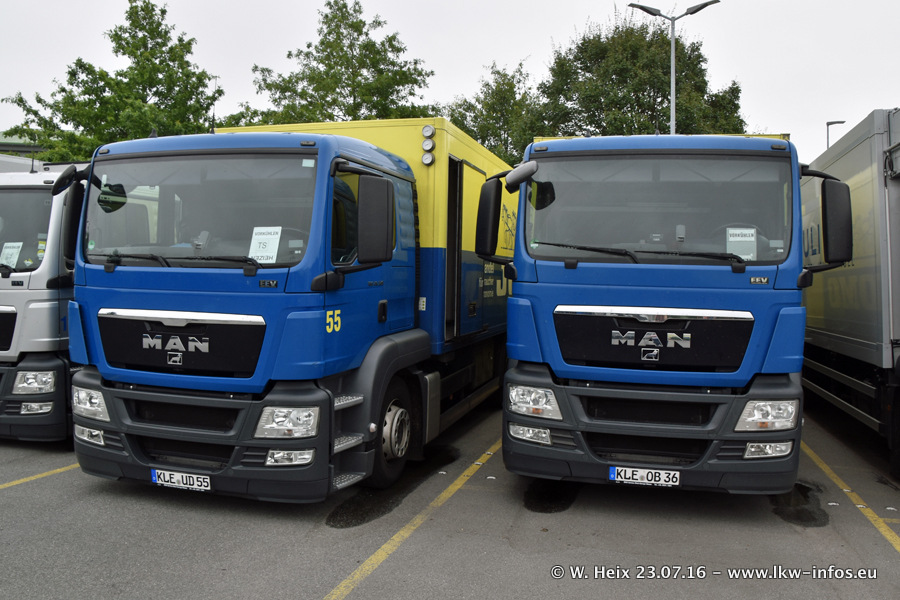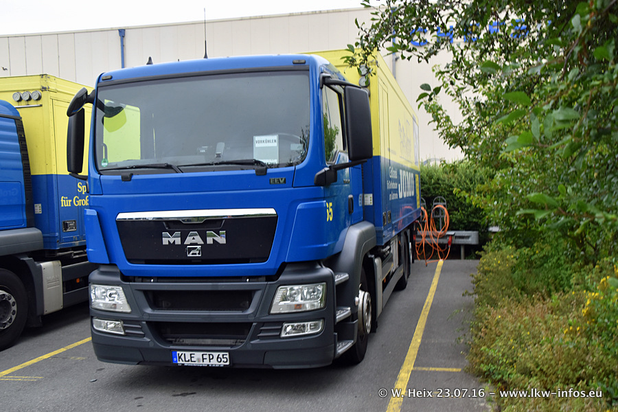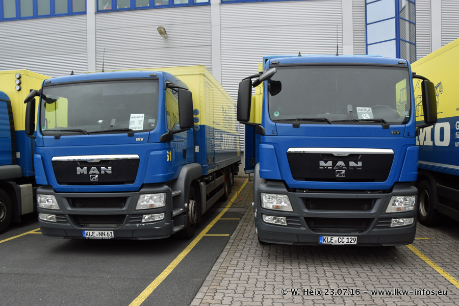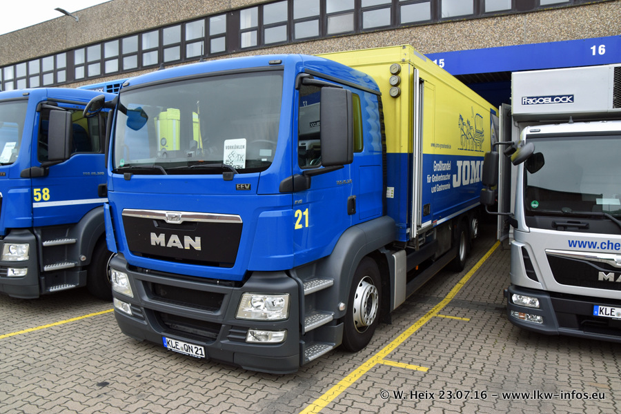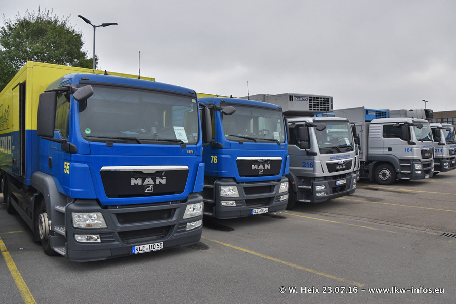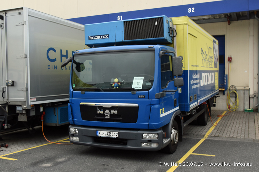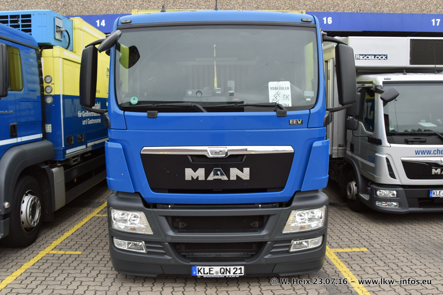 Inzwischen besteht der Fuhrpark rund zur Hälfte aus LKW im neuen Design "Chefs Culinar". Bei meinem letzten Besuch im April 2014 waren die ersten rund 10-12 LKW im neuen Design im Fuhrpark. Seit ca. 3 Monaten gibt es neben den ganzen LKW von MAN auch die ersten Volvo. Das sind Fahrzeuge der Baureihen FE und FM. Bei den kleinen Kühlahrzeugen unter 7,49 t, die von Iveco sind, gibt es inzwischen den ersten Daily der aktuellen Baureihe. Von den rund 120 Fahrzeugen am Standort Weeze war der größte Teil "zuhause".