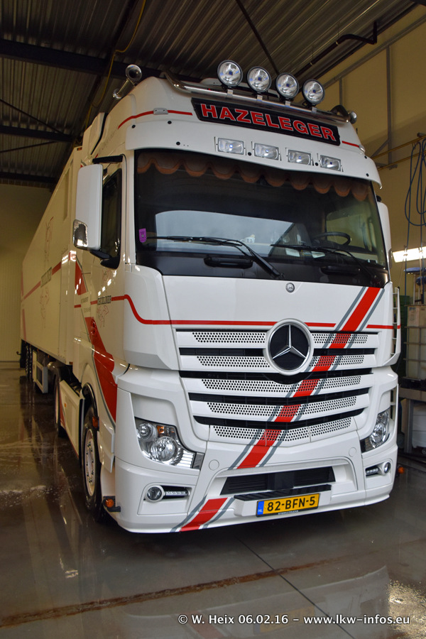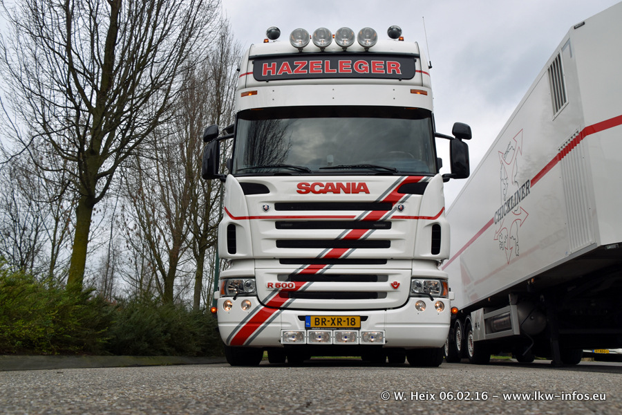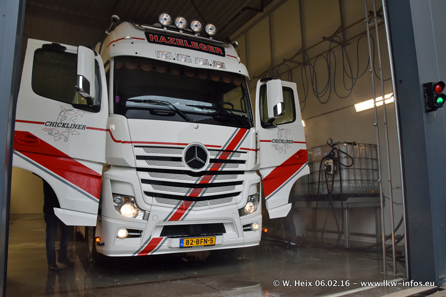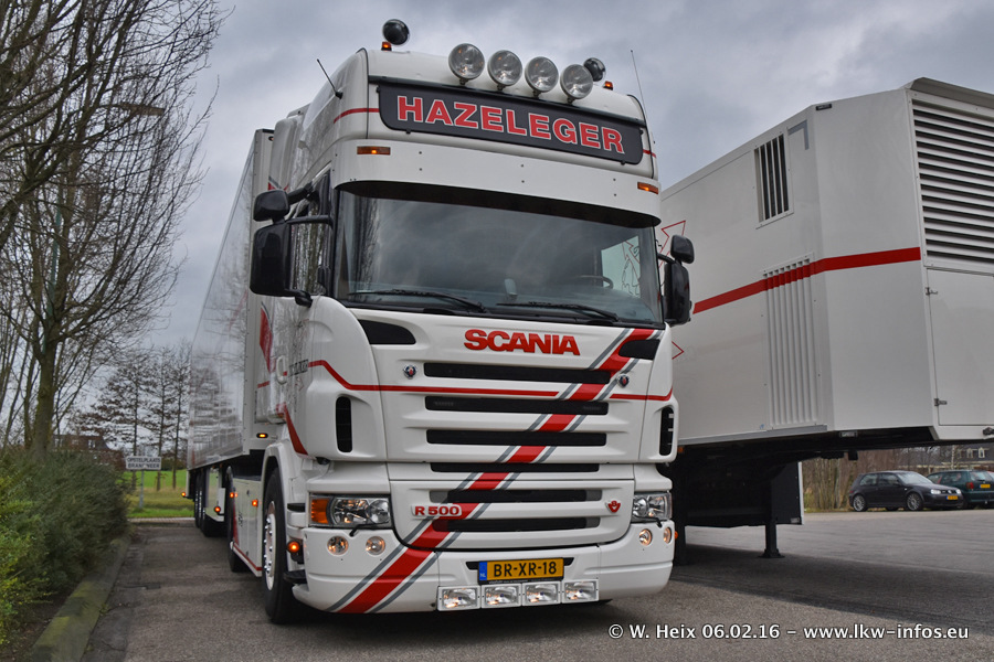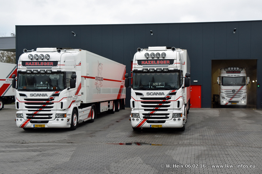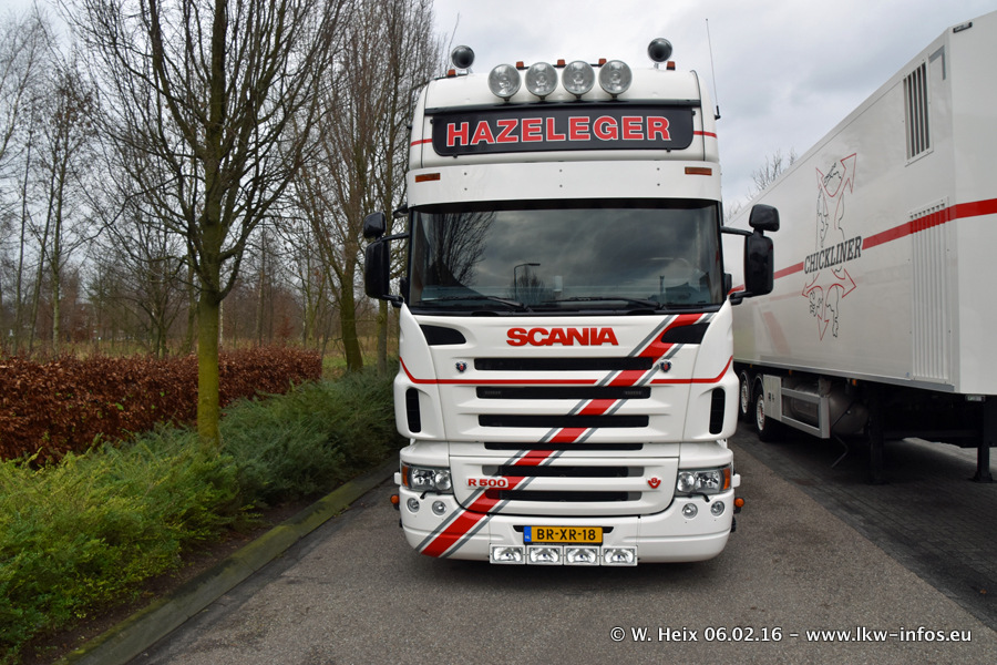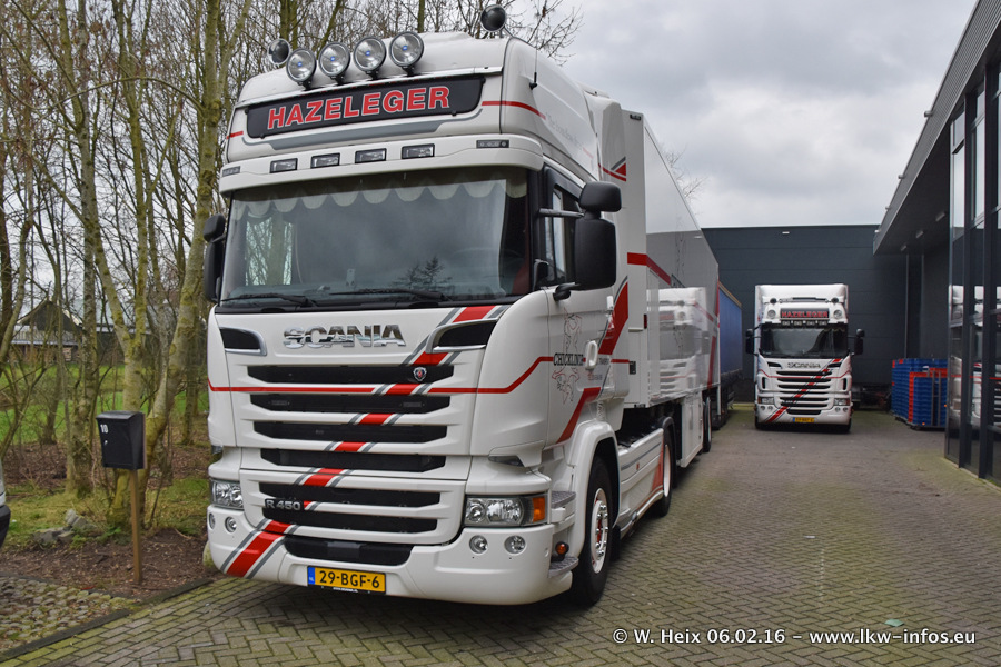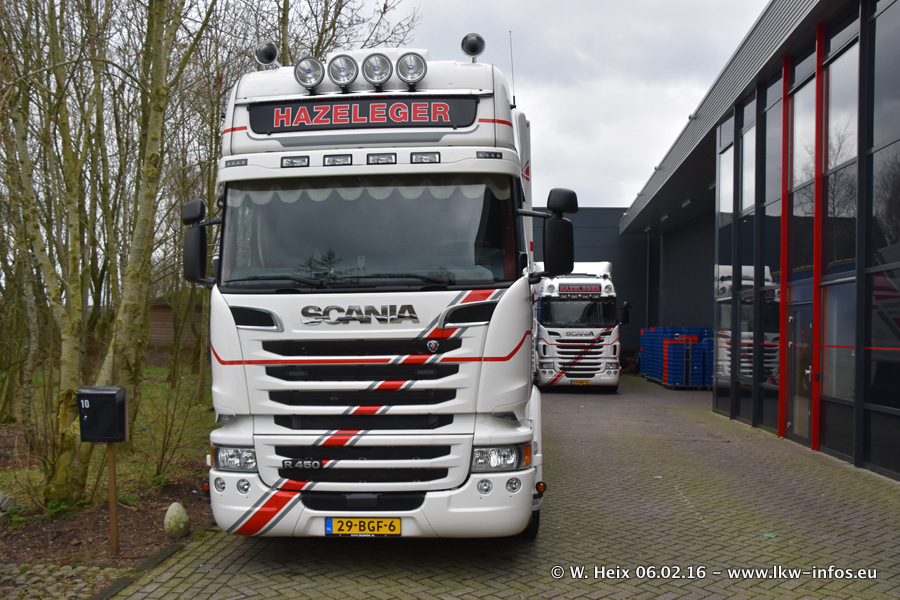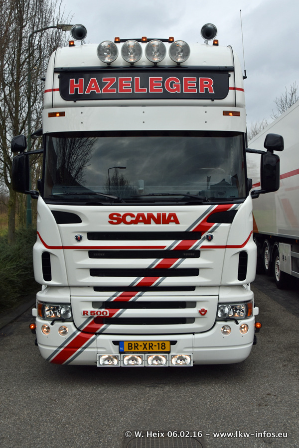 Der Besuch war eigentlich nicht geplant, da ich erst vor 4 Wochen bei Hazeleger war. Aber der Hof stand voll und bis auf zwei LKW waren alle zuhause und standen teiwleise sehr gut zum Fotografieren. Ganz neu ist der zweiachsige Auflieger, der hinter dem Scania R 450 Streamline ist. Den hat die Firma Hazeleger erst gestern bekommen.