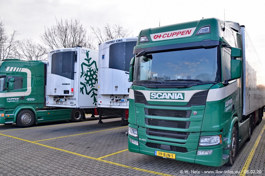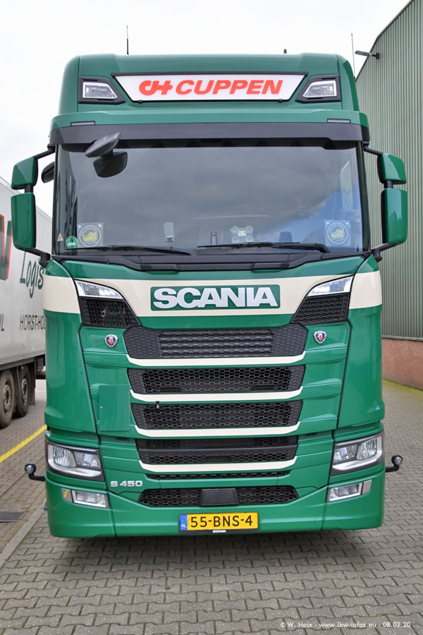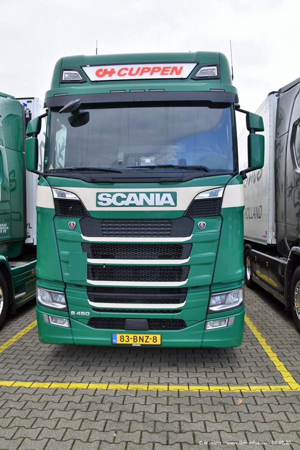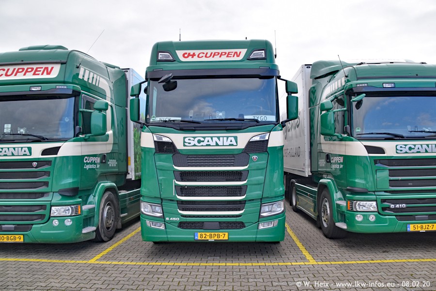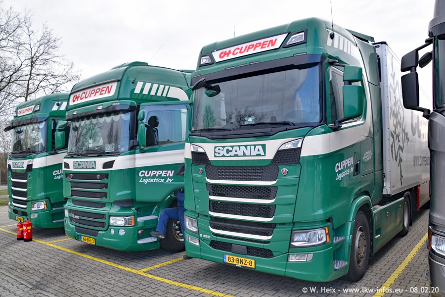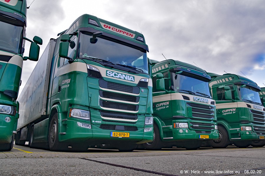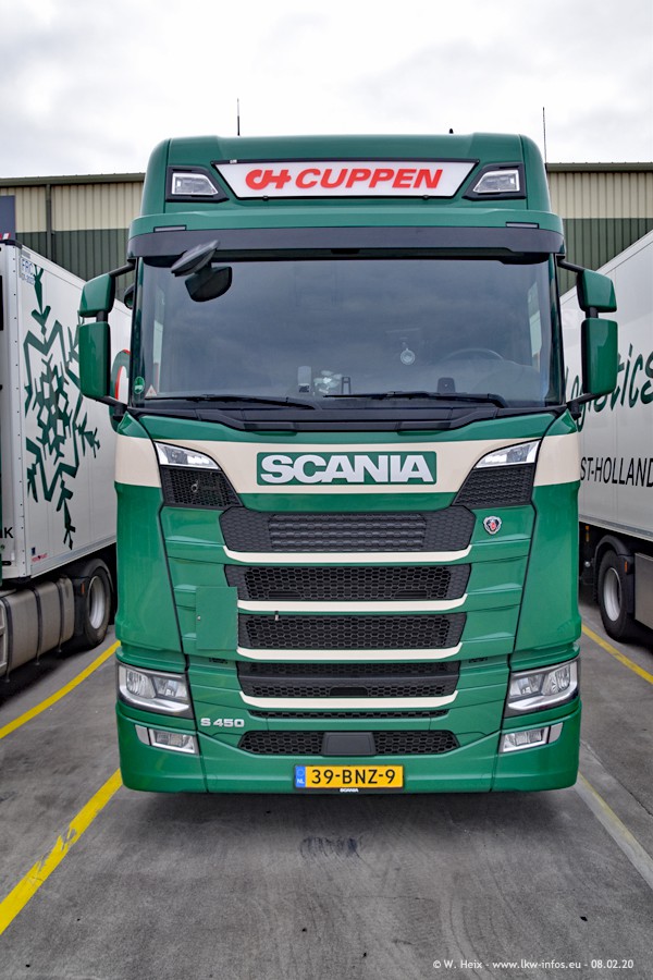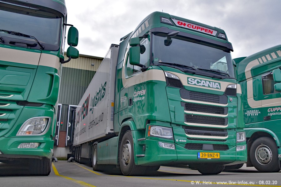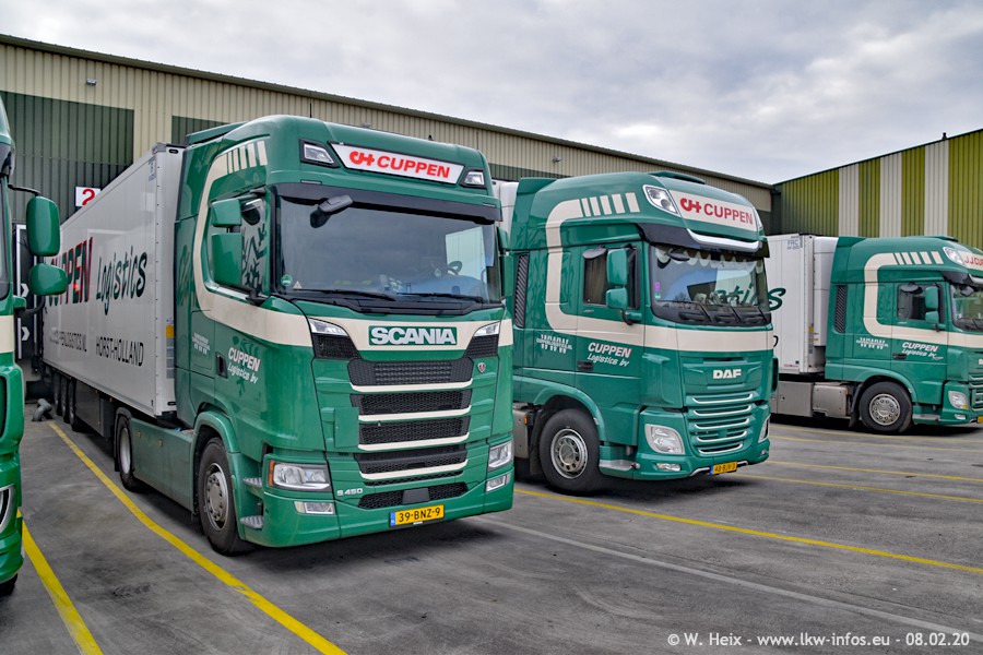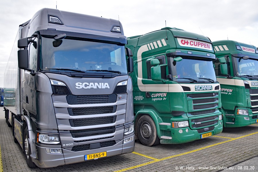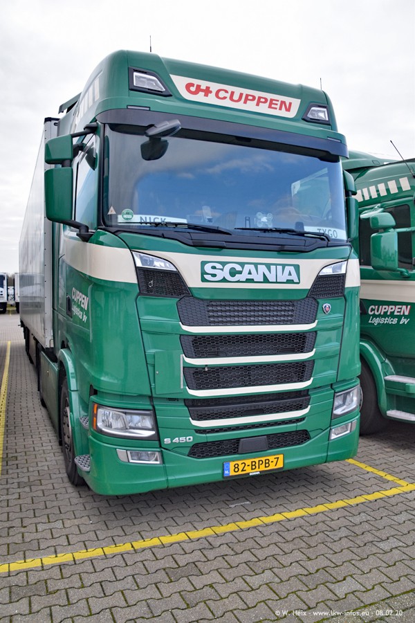 Kurz nach meinem ersten Besuch dieses Jahres im Januar hat Cuppen Logistics zwei weitere neue SCANIA S 450 NextGen bekommen. Die sind zu erkennen an der Buchstabenkombination "BPB" auf dem Kennzeichen. Stand Februar 2020 besteht der Fuhrpark aus 40 LKW der Marken DAF, SCANIA und VOLVO. Dazu kommen noch 5 Charter (Subunternehmer). Zwei davon stehen immer fest auf dem Gelände (v. d. Gun und Knoops). Diese habe ich aber nicht mit fotografiert.