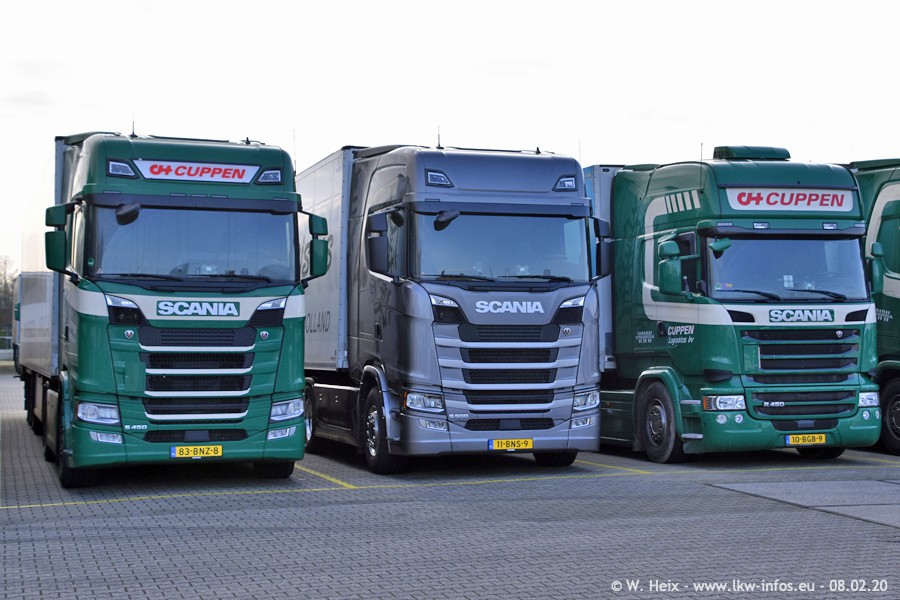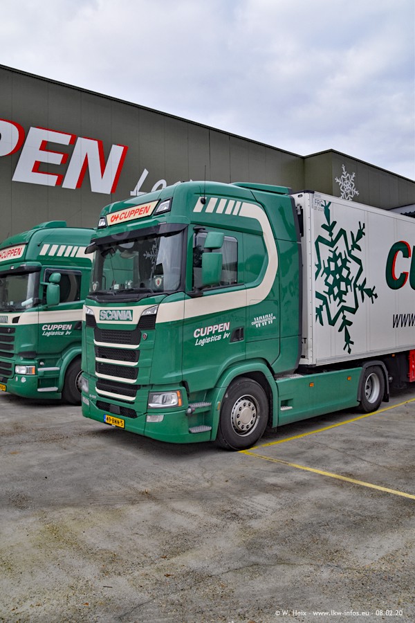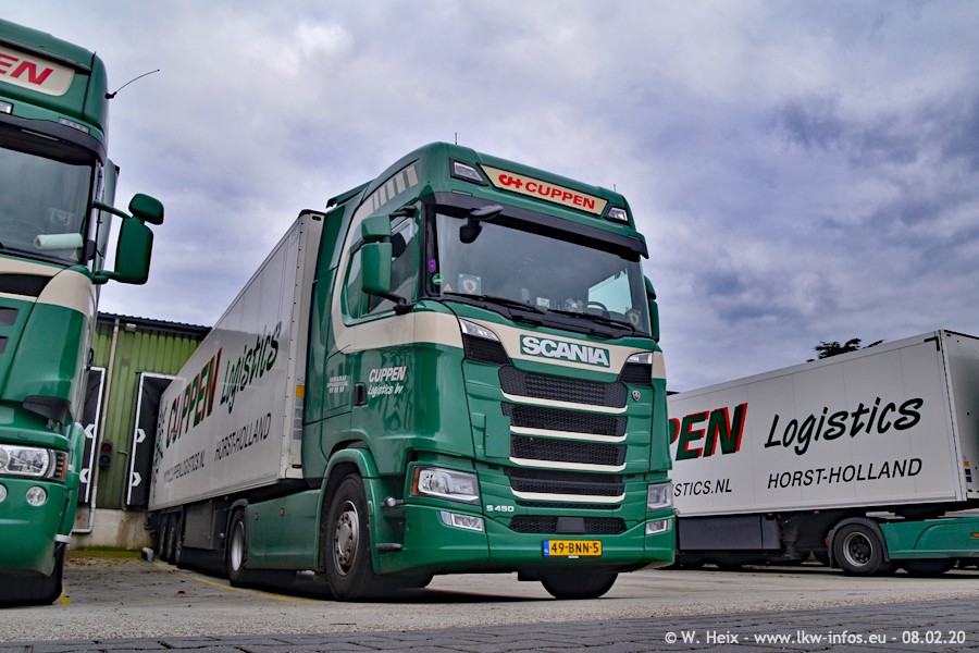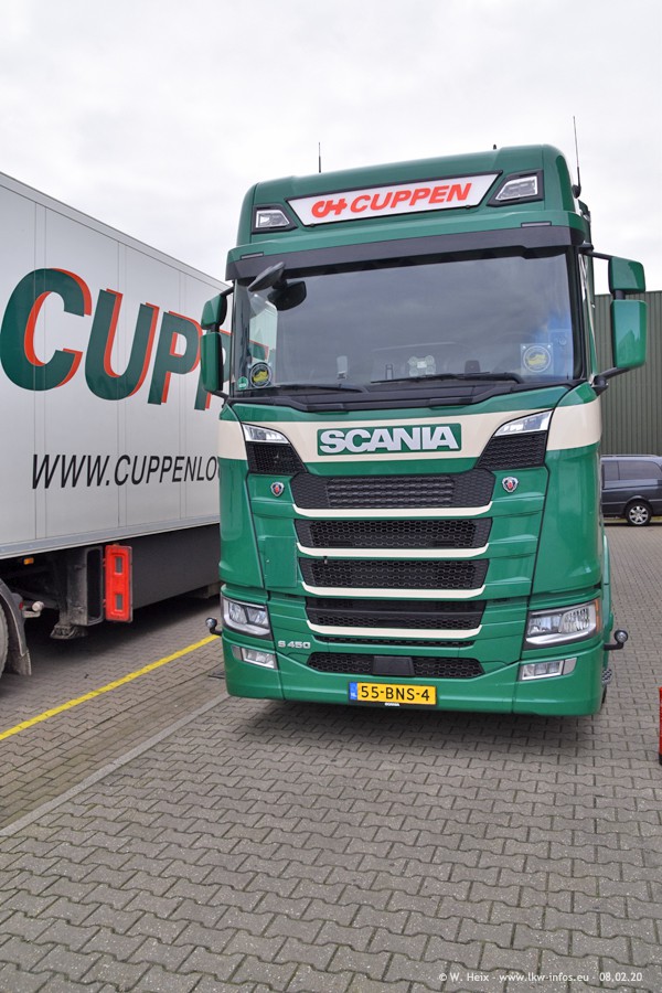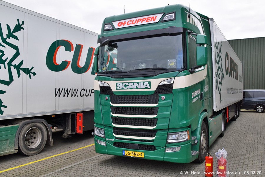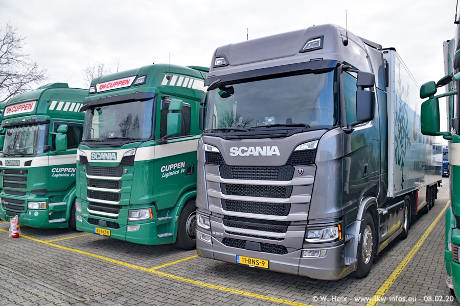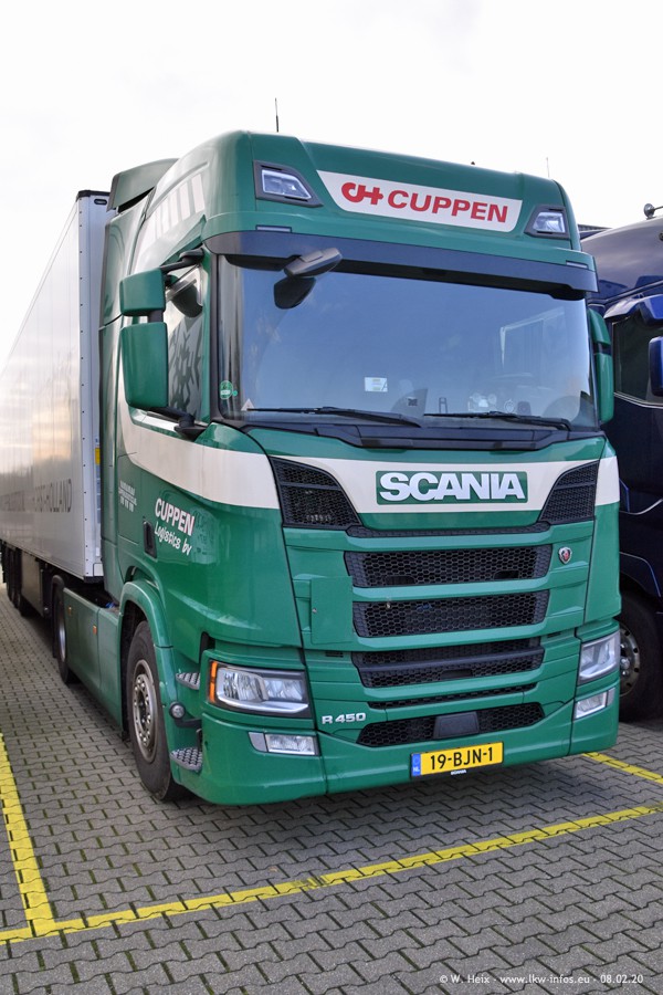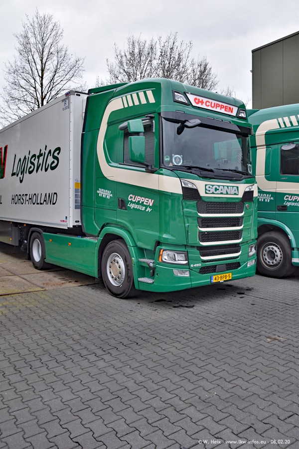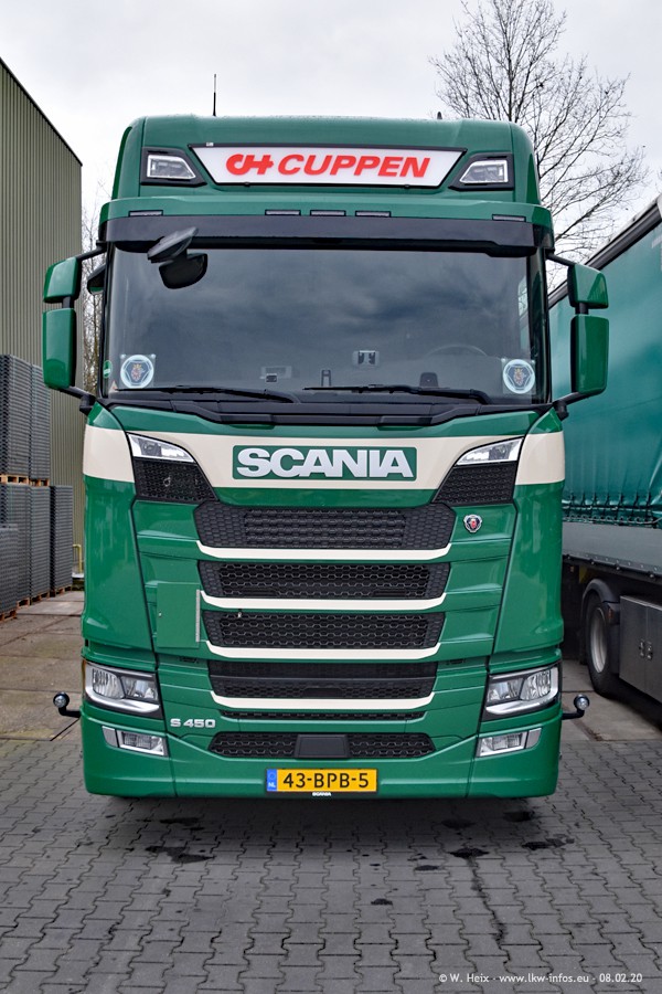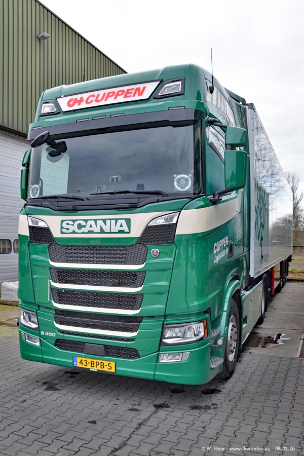 Kurz nach meinem ersten Besuch dieses Jahres im Januar hat Cuppen Logistics zwei weitere neue SCANIA S 450 NextGen bekommen. Die sind zu erkennen an der Buchstabenkombination "BPB" auf dem Kennzeichen. Stand Februar 2020 besteht der Fuhrpark aus 40 LKW der Marken DAF, SCANIA und VOLVO. Dazu kommen noch 5 Charter (Subunternehmer). Zwei davon stehen immer fest auf dem Gelände (v. d. Gun und Knoops). Diese habe ich aber nicht mit fotografiert.
