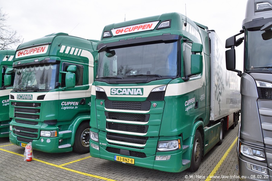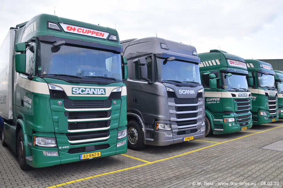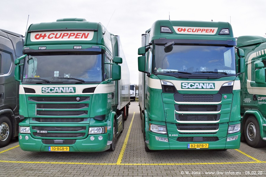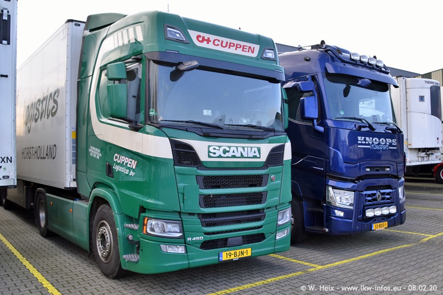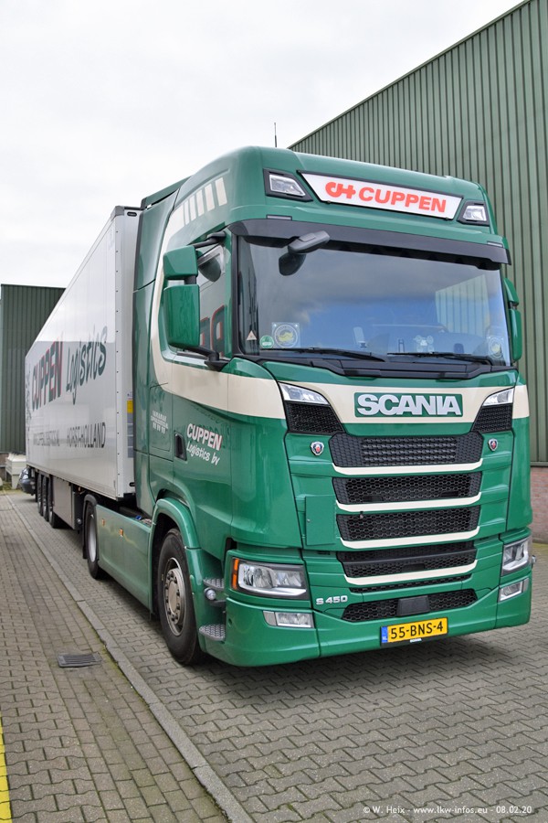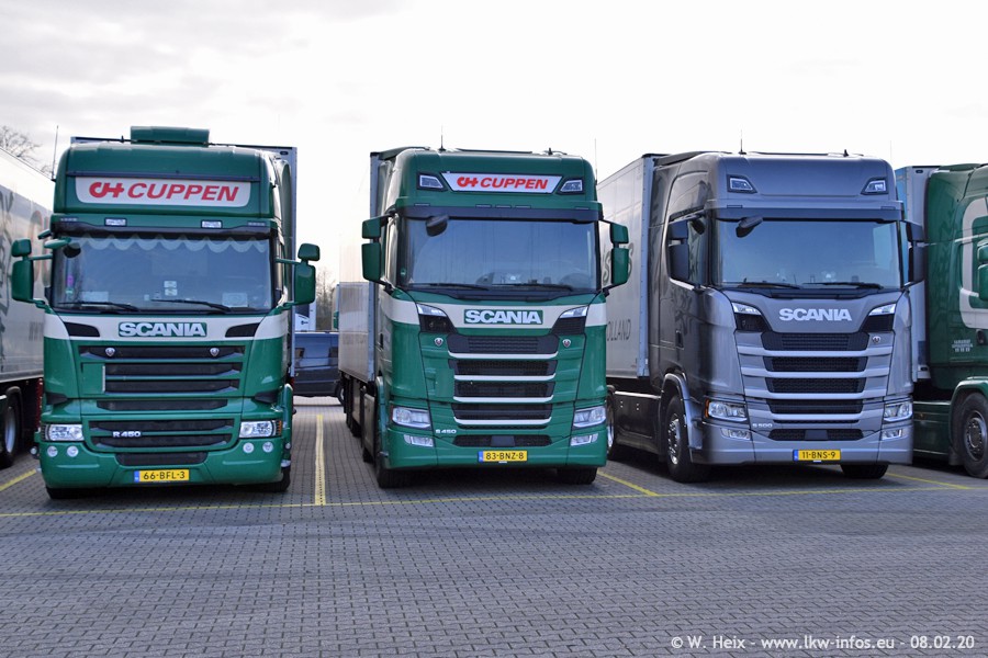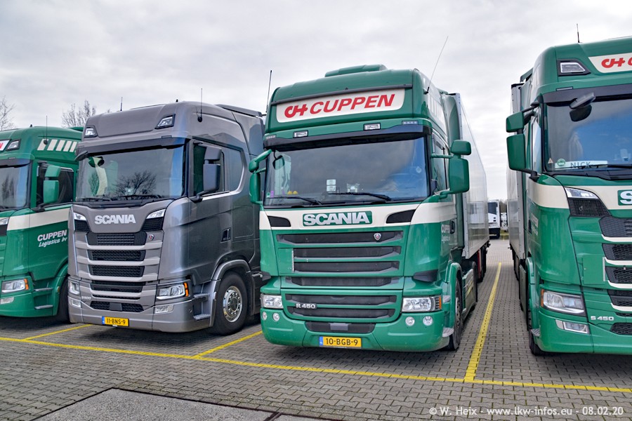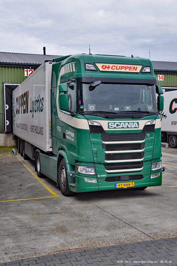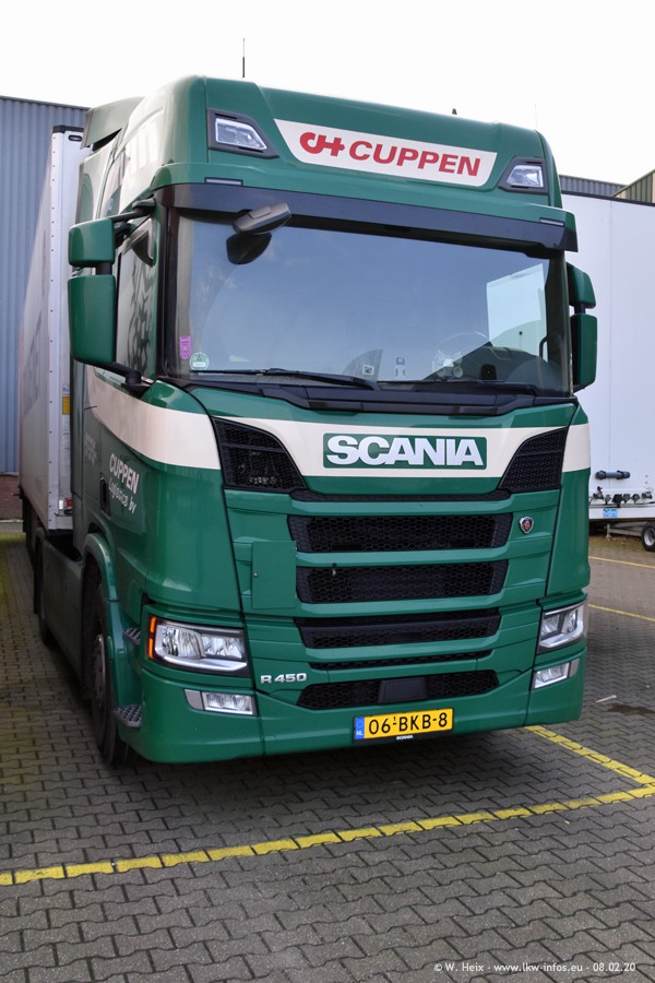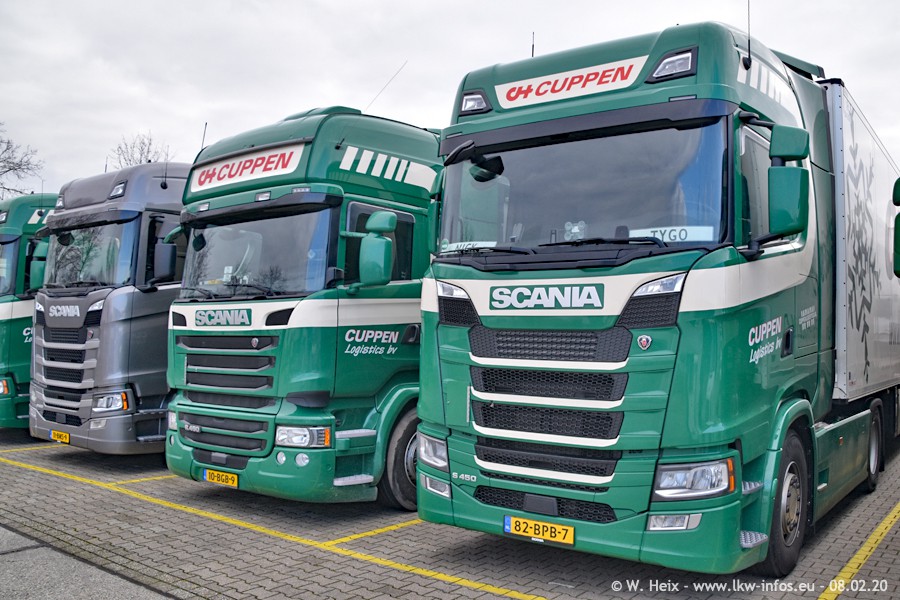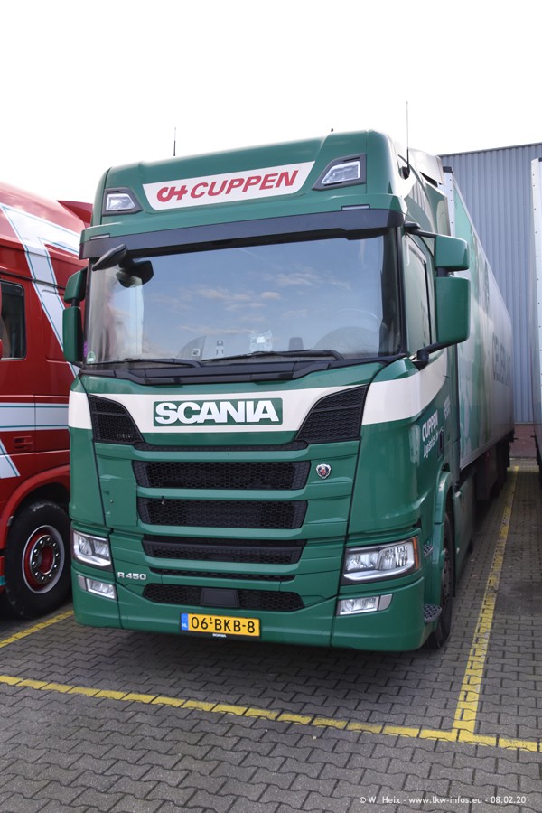 Kurz nach meinem ersten Besuch dieses Jahres im Januar hat Cuppen Logistics zwei weitere neue SCANIA S 450 NextGen bekommen. Die sind zu erkennen an der Buchstabenkombination "BPB" auf dem Kennzeichen. Stand Februar 2020 besteht der Fuhrpark aus 40 LKW der Marken DAF, SCANIA und VOLVO. Dazu kommen noch 5 Charter (Subunternehmer). Zwei davon stehen immer fest auf dem Gelände (v. d. Gun und Knoops). Diese habe ich aber nicht mit fotografiert.