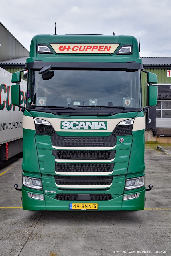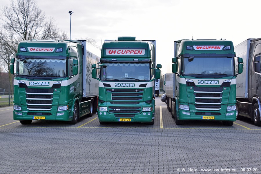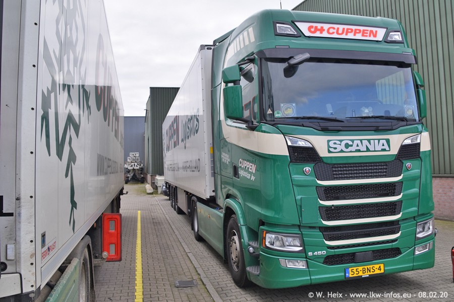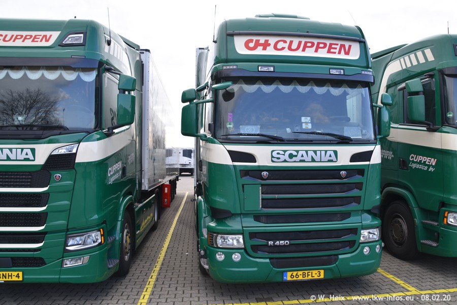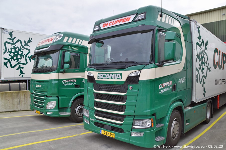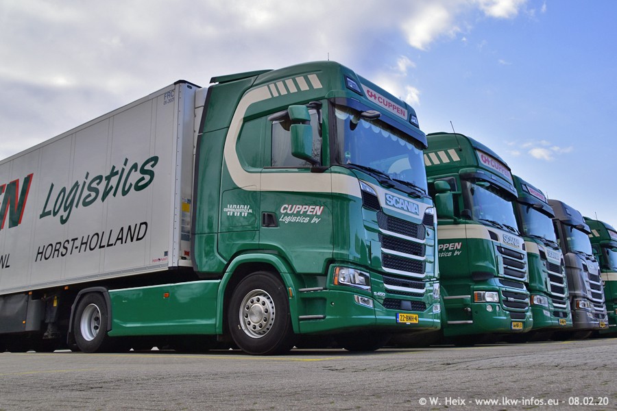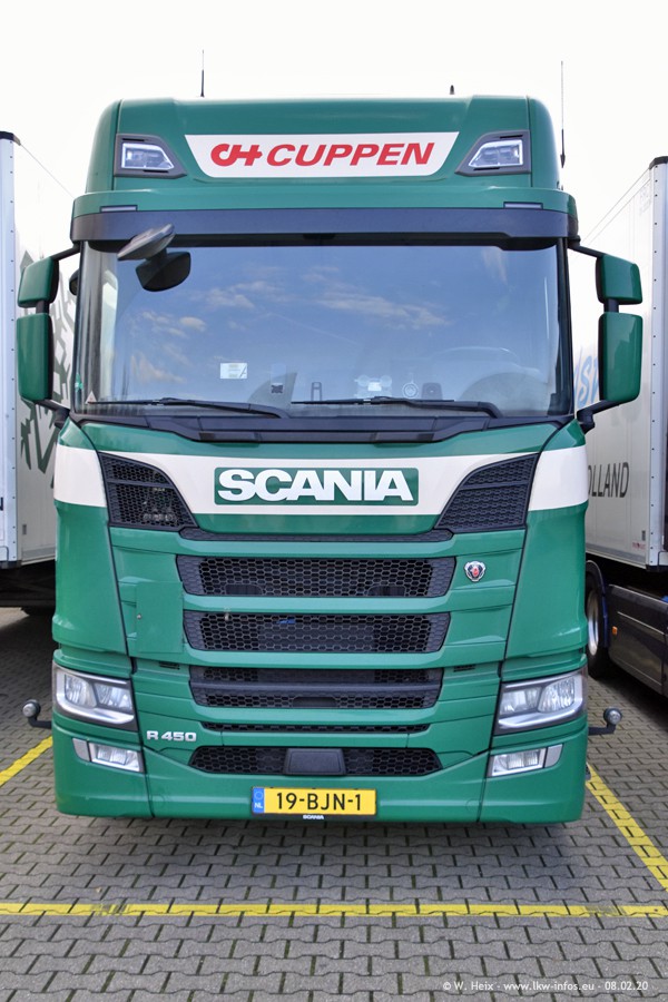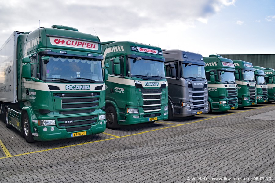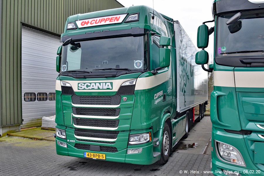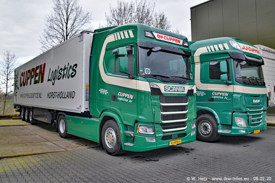 Kurz nach meinem ersten Besuch dieses Jahres im Januar hat Cuppen Logistics zwei weitere neue SCANIA S 450 NextGen bekommen. Die sind zu erkennen an der Buchstabenkombination "BPB" auf dem Kennzeichen. Stand Februar 2020 besteht der Fuhrpark aus 40 LKW der Marken DAF, SCANIA und VOLVO. Dazu kommen noch 5 Charter (Subunternehmer). Zwei davon stehen immer fest auf dem Gelände (v. d. Gun und Knoops). Diese habe ich aber nicht mit fotografiert.