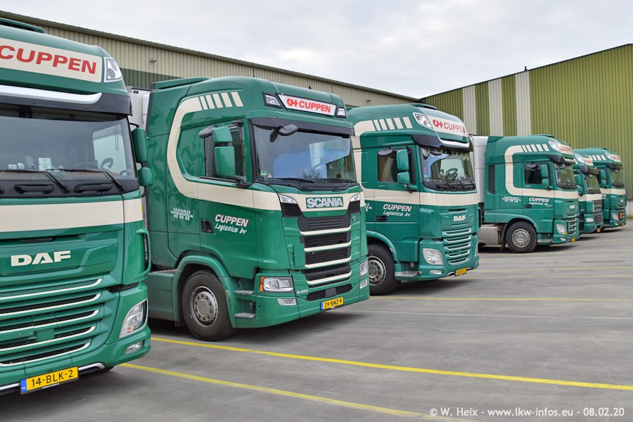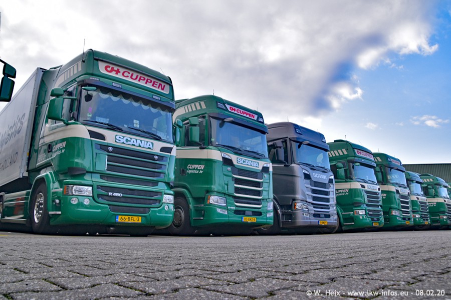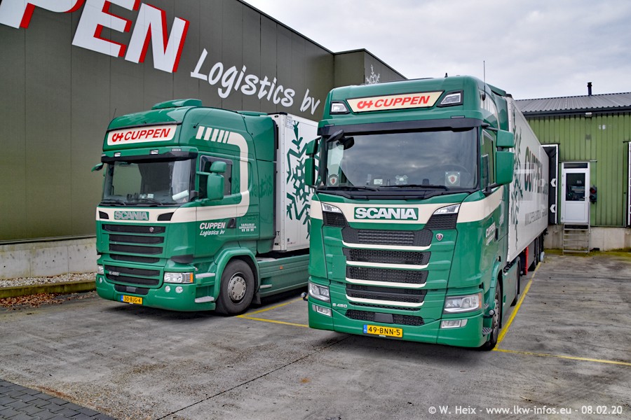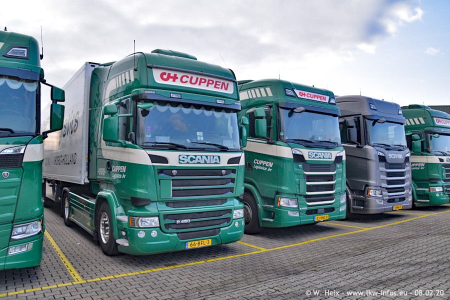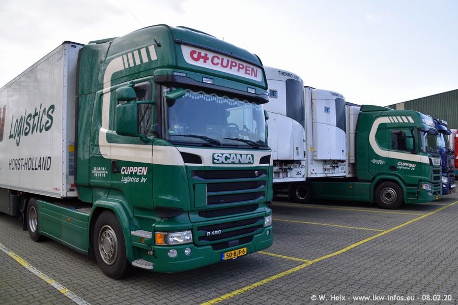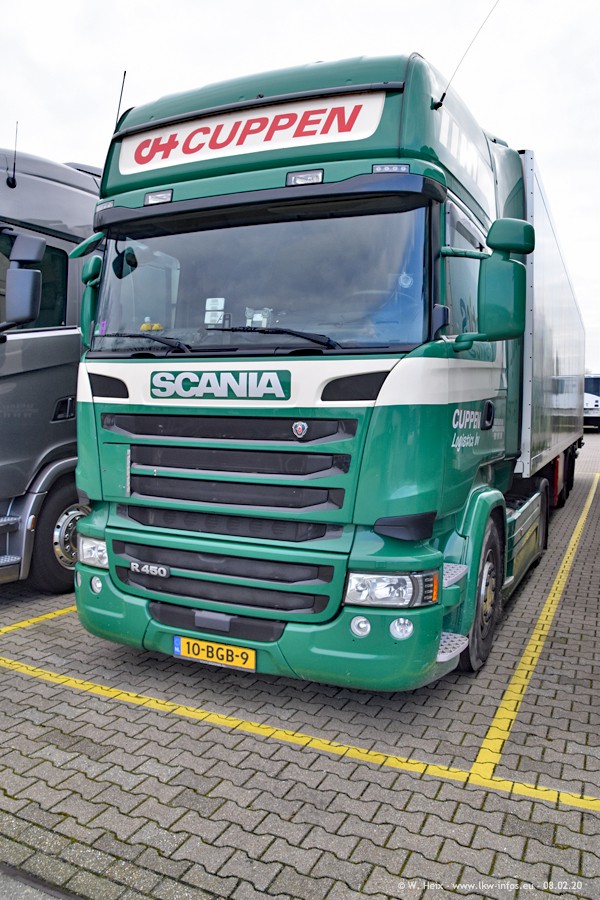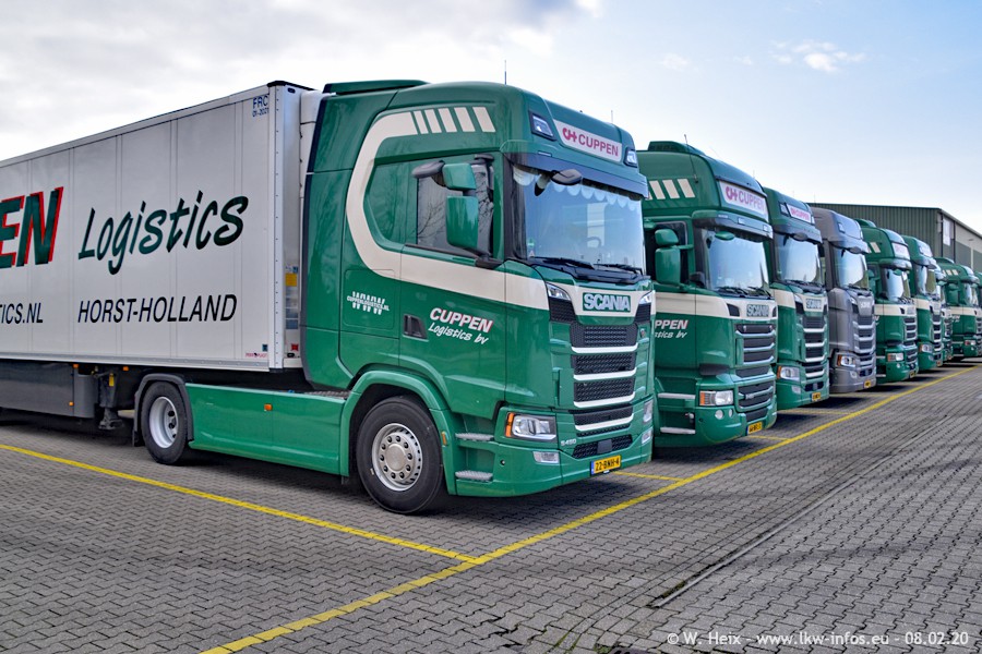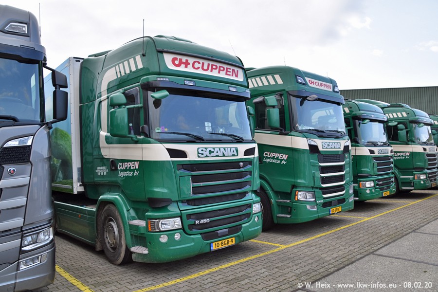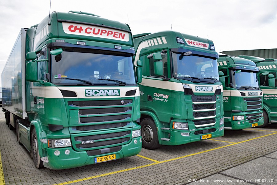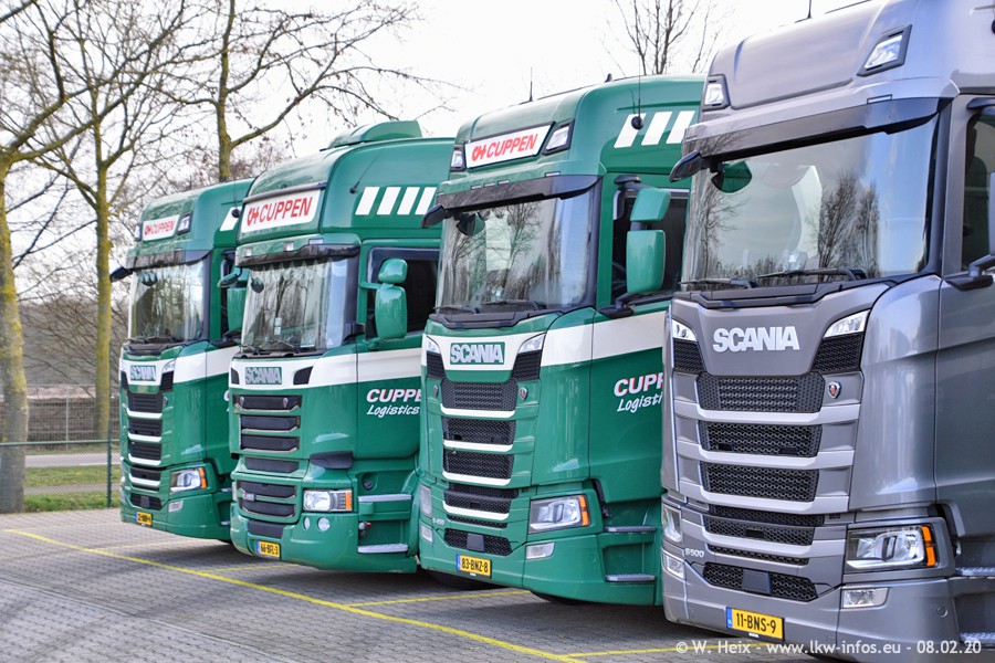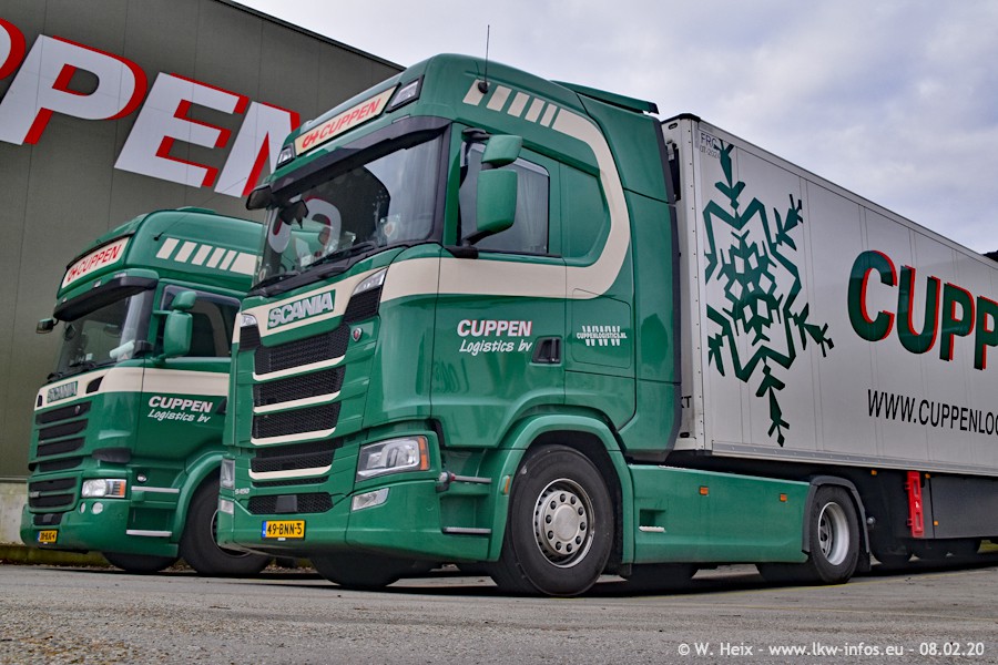 Kurz nach meinem ersten Besuch dieses Jahres im Januar hat Cuppen Logistics zwei weitere neue SCANIA S 450 NextGen bekommen. Die sind zu erkennen an der Buchstabenkombination "BPB" auf dem Kennzeichen. Stand Februar 2020 besteht der Fuhrpark aus 40 LKW der Marken DAF, SCANIA und VOLVO. Dazu kommen noch 5 Charter (Subunternehmer). Zwei davon stehen immer fest auf dem Gelände (v. d. Gun und Knoops). Diese habe ich aber nicht mit fotografiert.