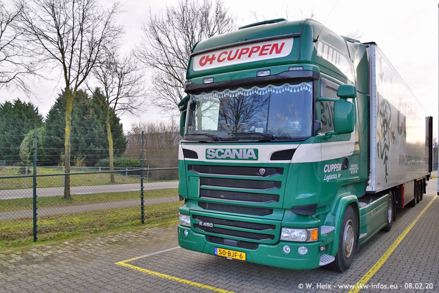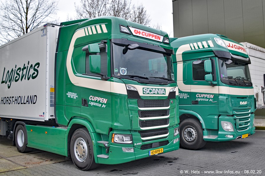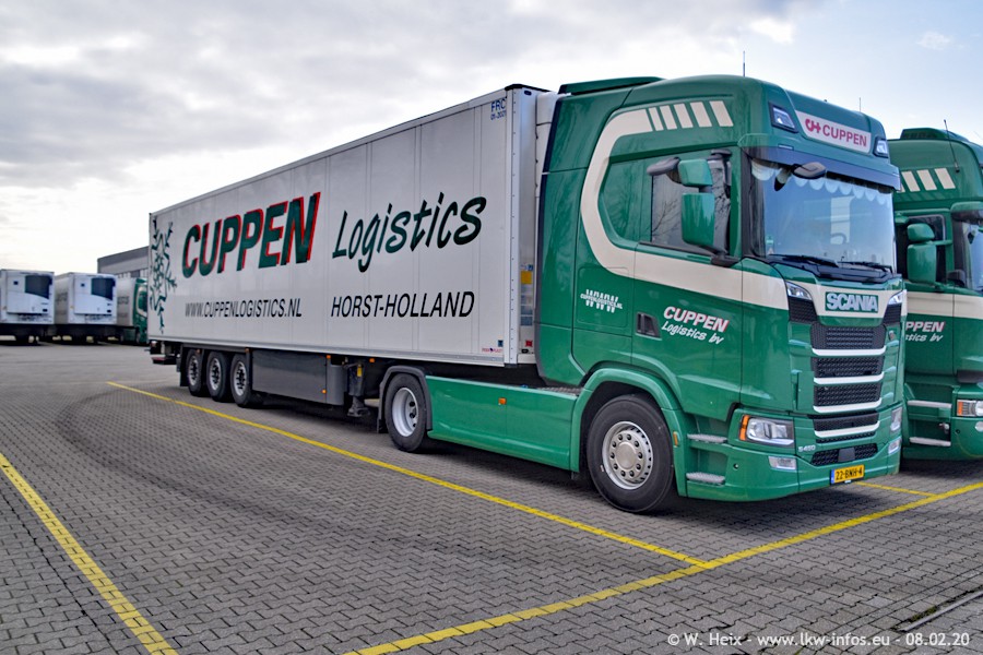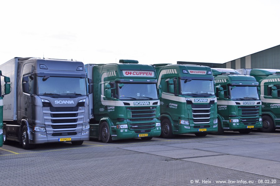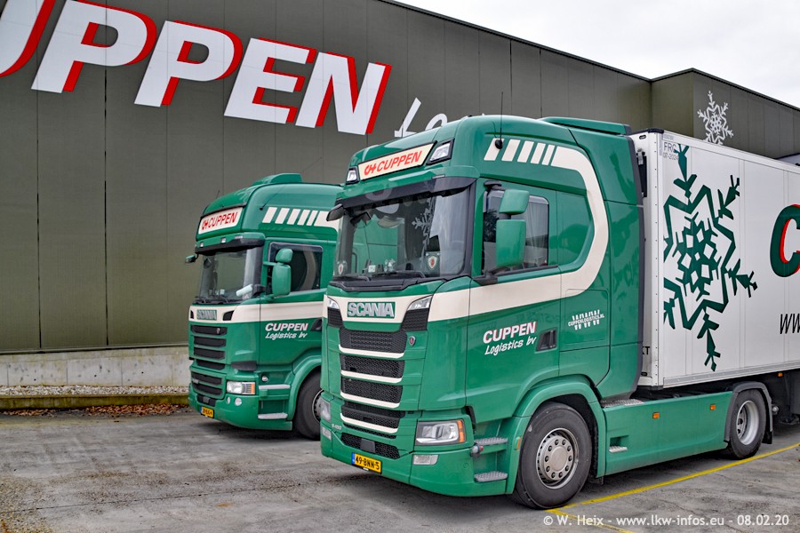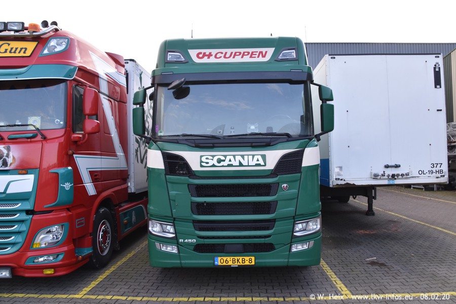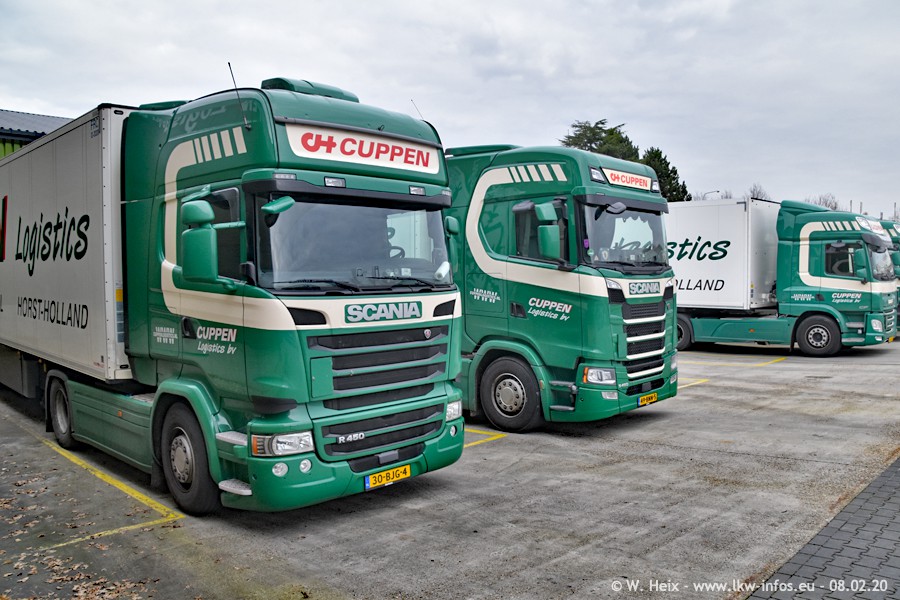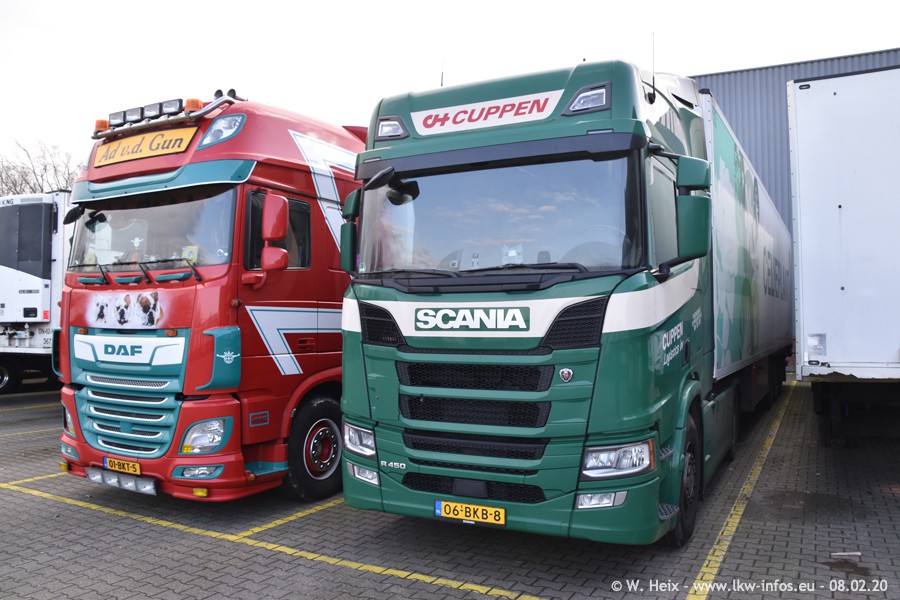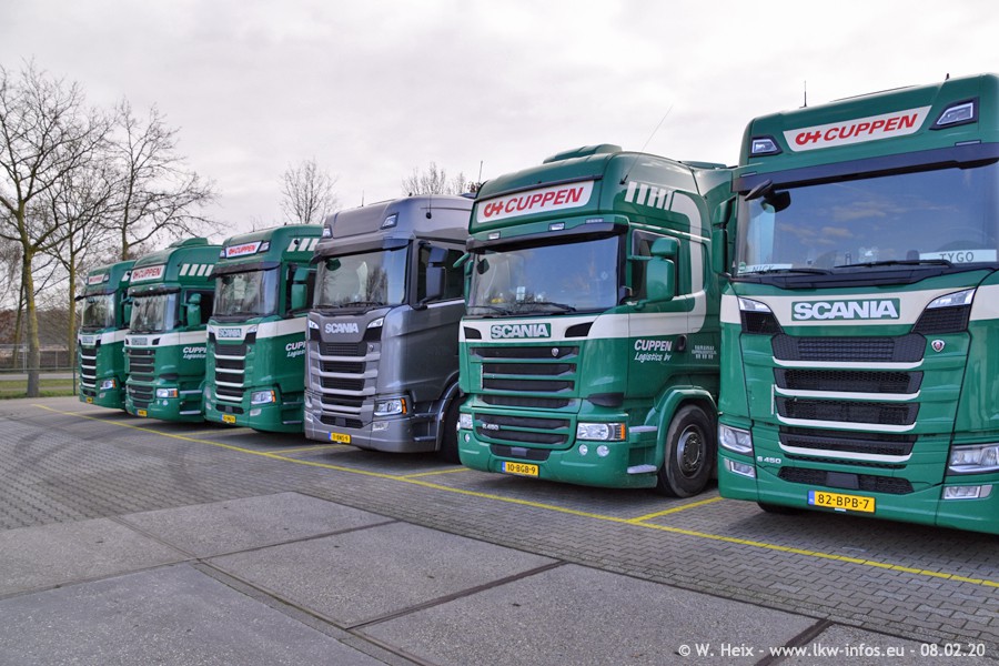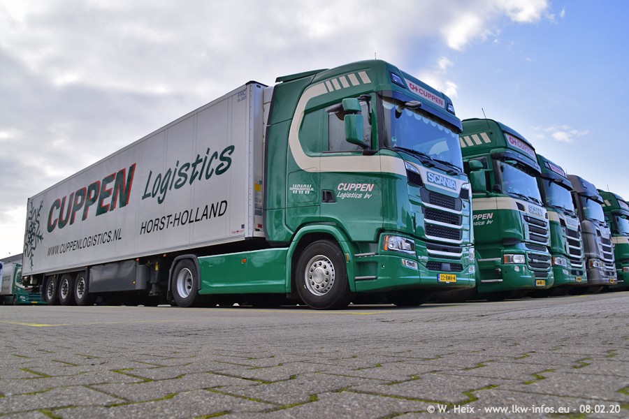 Kurz nach meinem ersten Besuch dieses Jahres im Januar hat Cuppen Logistics zwei weitere neue SCANIA S 450 NextGen bekommen. Die sind zu erkennen an der Buchstabenkombination "BPB" auf dem Kennzeichen. Stand Februar 2020 besteht der Fuhrpark aus 40 LKW der Marken DAF, SCANIA und VOLVO. Dazu kommen noch 5 Charter (Subunternehmer). Zwei davon stehen immer fest auf dem Gelände (v. d. Gun und Knoops). Diese habe ich aber nicht mit fotografiert.