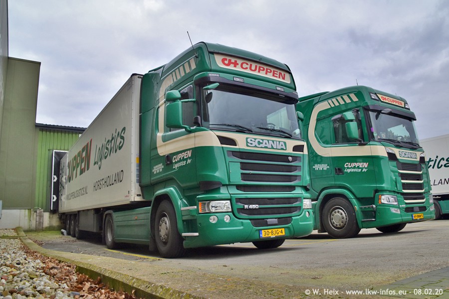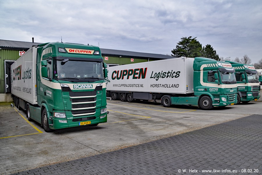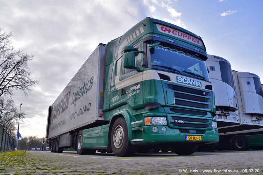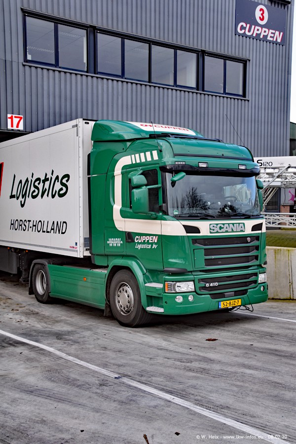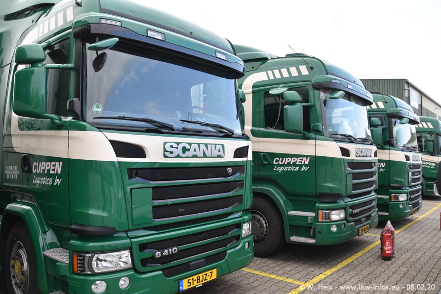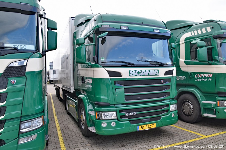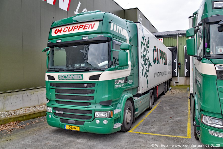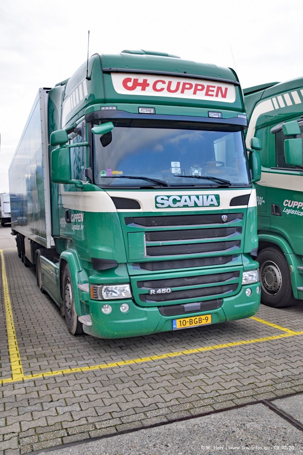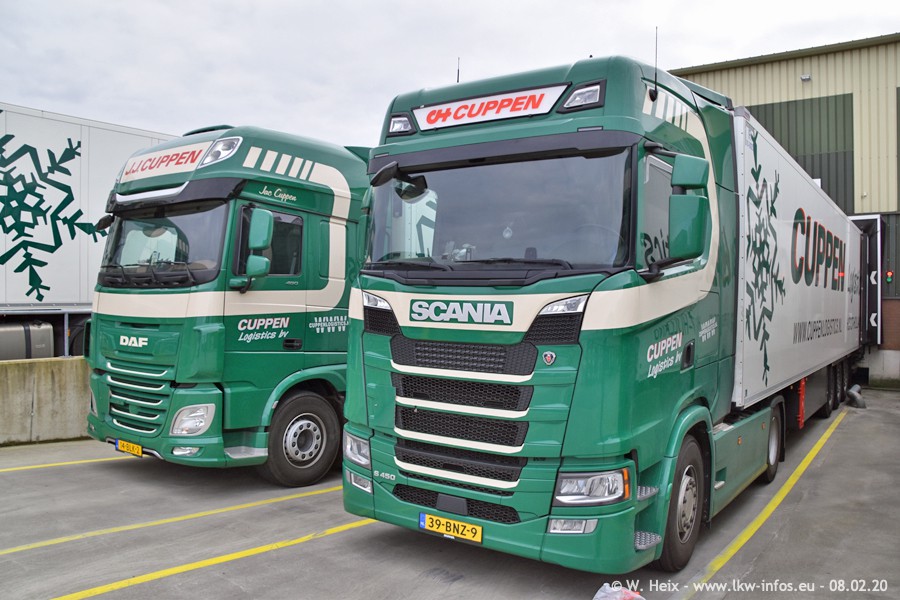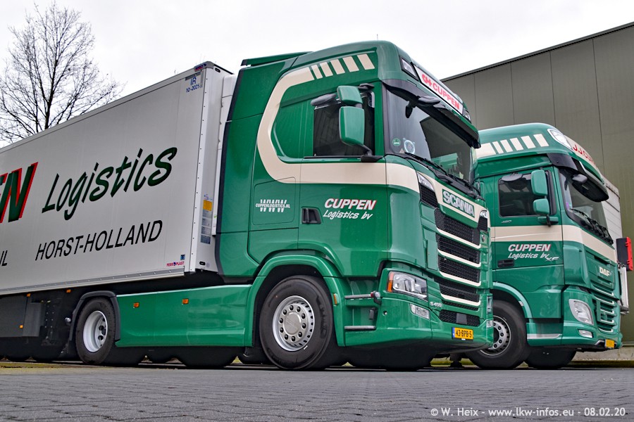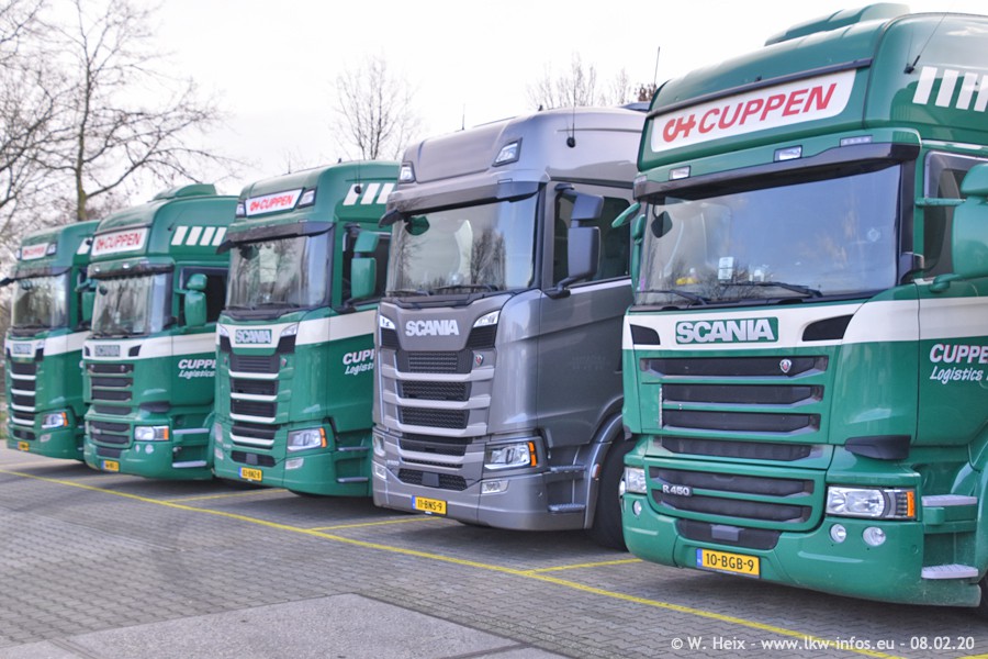 Kurz nach meinem ersten Besuch dieses Jahres im Januar hat Cuppen Logistics zwei weitere neue SCANIA S 450 NextGen bekommen. Die sind zu erkennen an der Buchstabenkombination "BPB" auf dem Kennzeichen. Stand Februar 2020 besteht der Fuhrpark aus 40 LKW der Marken DAF, SCANIA und VOLVO. Dazu kommen noch 5 Charter (Subunternehmer). Zwei davon stehen immer fest auf dem Gelände (v. d. Gun und Knoops). Diese habe ich aber nicht mit fotografiert.