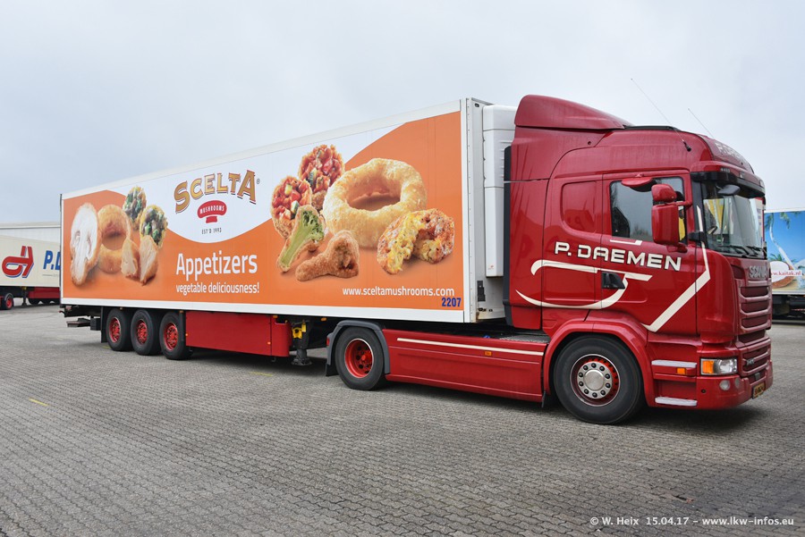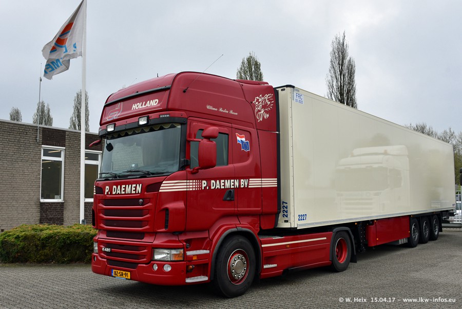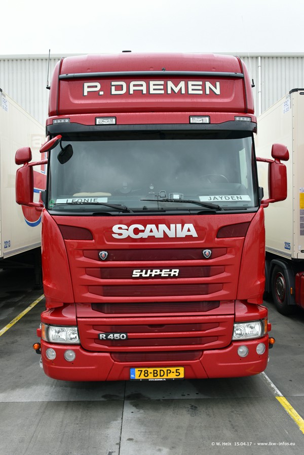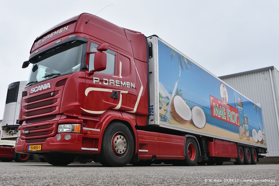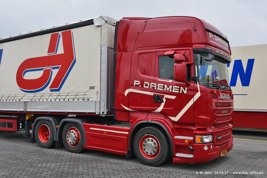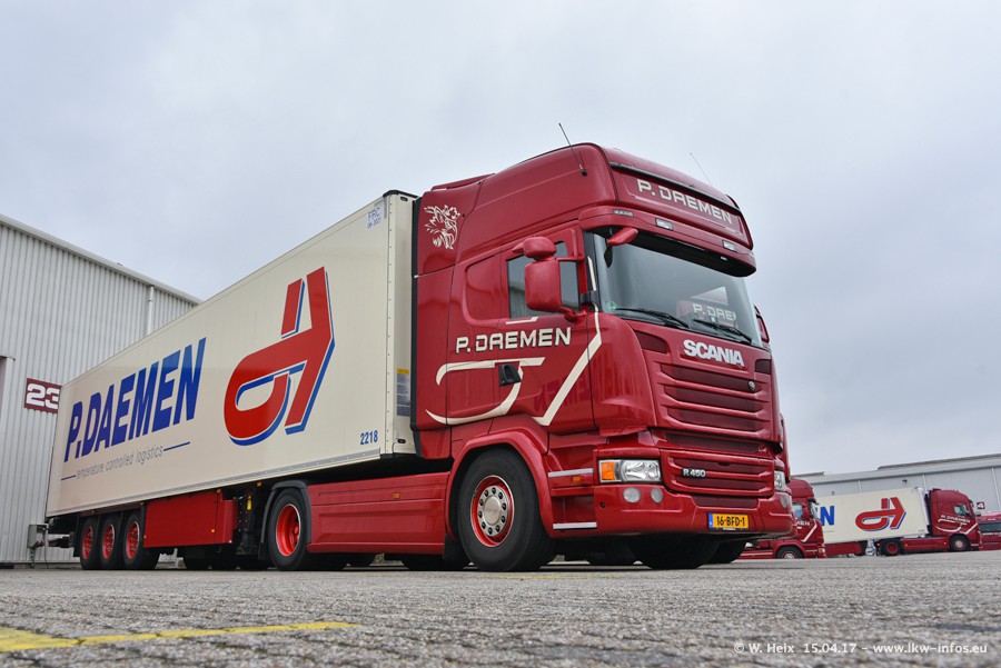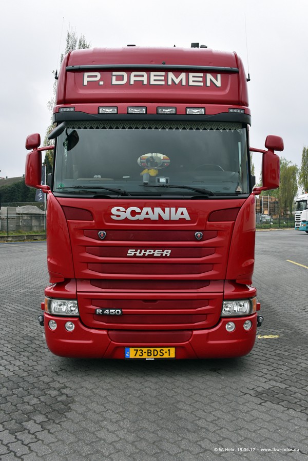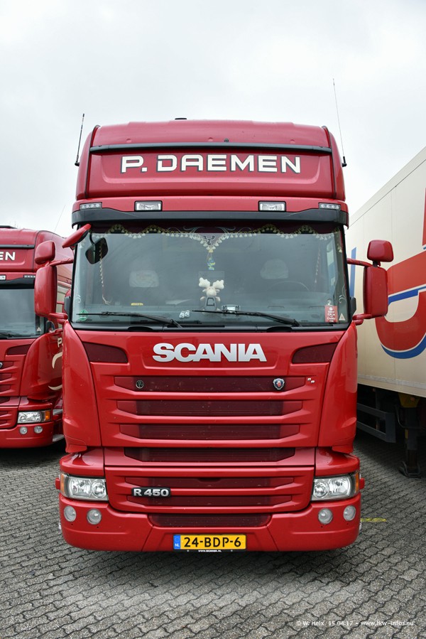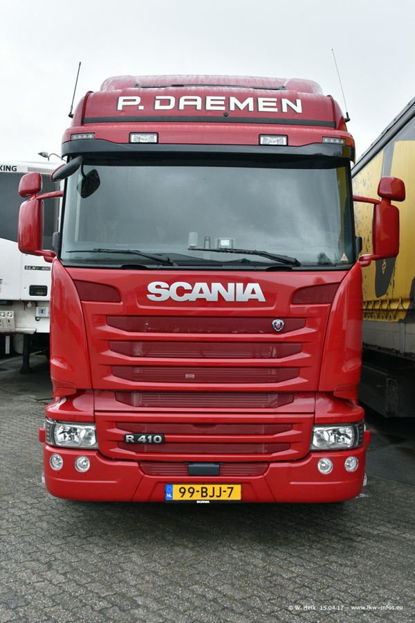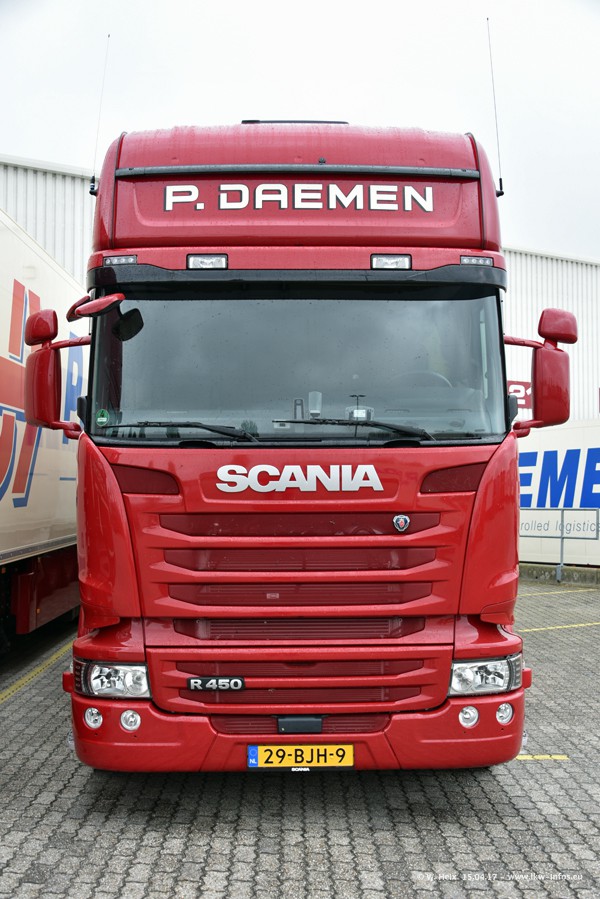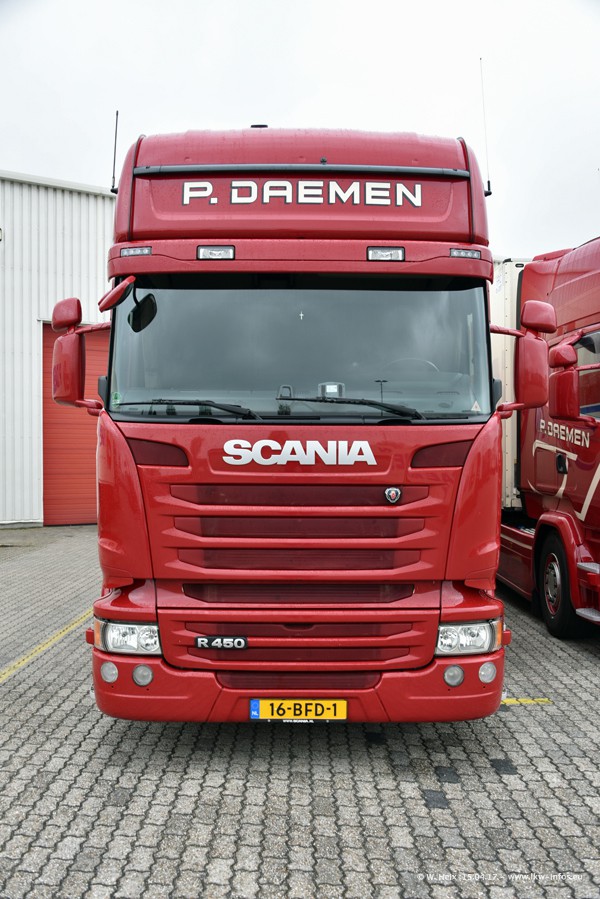 In den letzten Wochen wurde der Furhpark bei Daemen weiter modernisiert. Neu sind zwei DAF XF Euro 6 und mehrere Scania R 410 und R 450 Streamline (alte Baureihe). Und ich konnte einen neuen Auflieger entdecken, der wieder im Design eines Kunden gestaltet ist. Alle neuen Zugmaschinen sind an denn Kennzeichen mit den Buchstabenkombinationen "BJ" zu erkennen.
