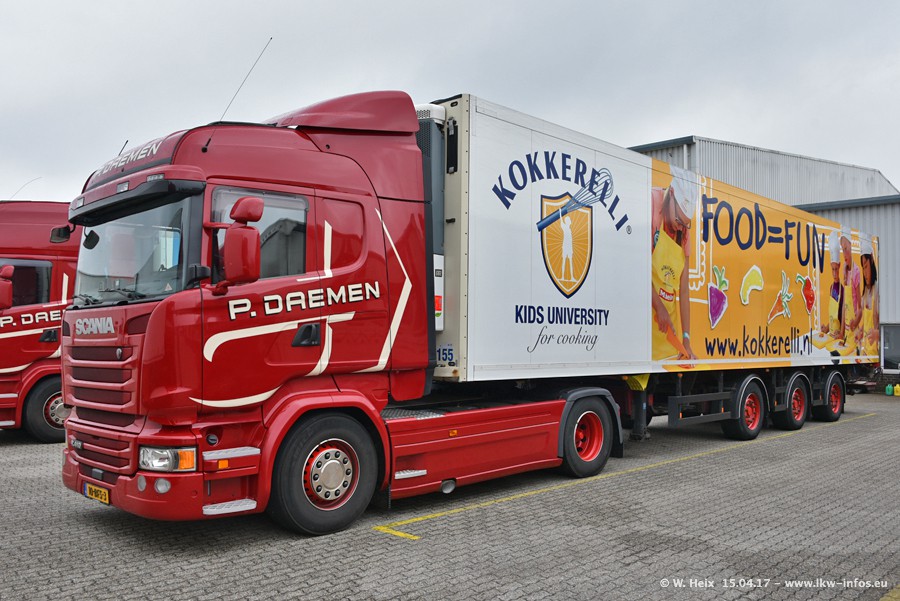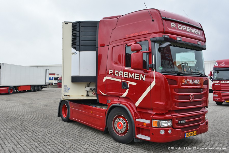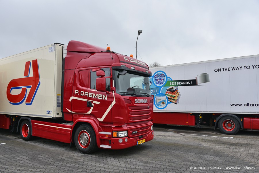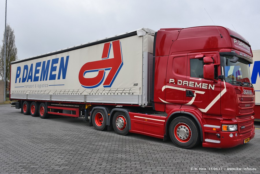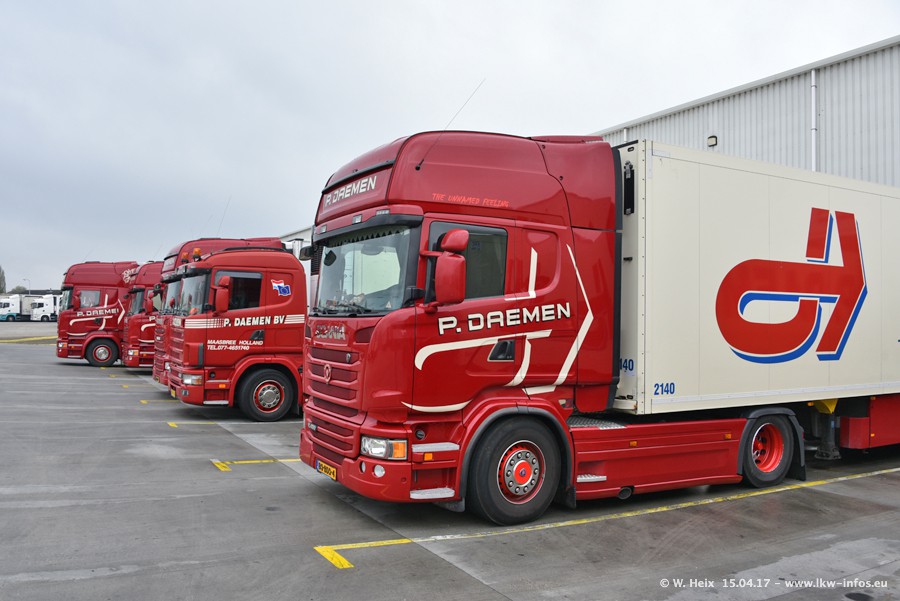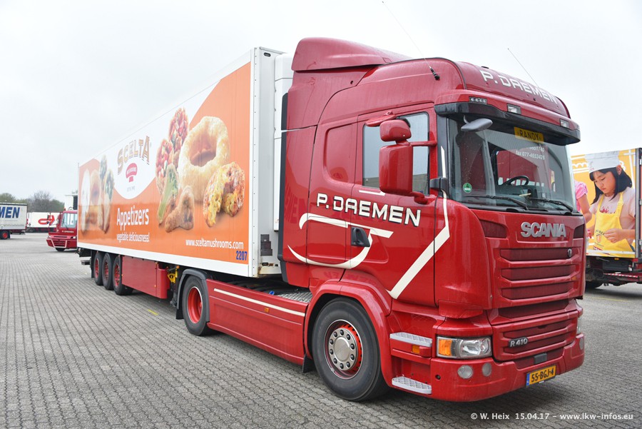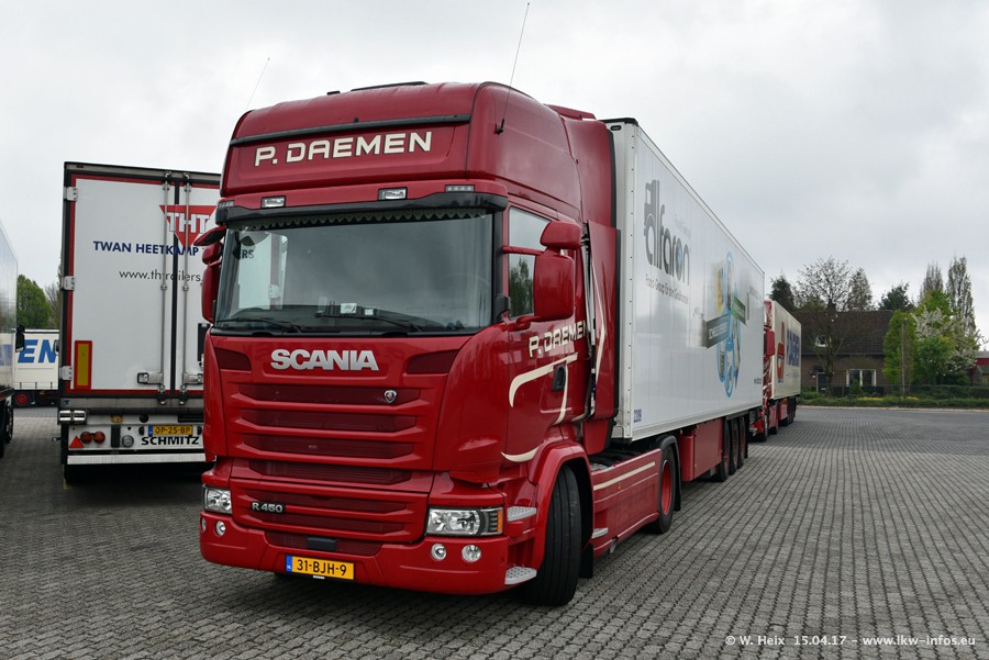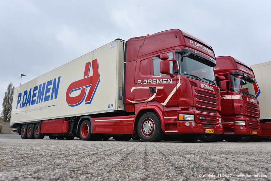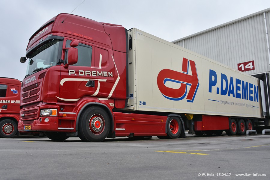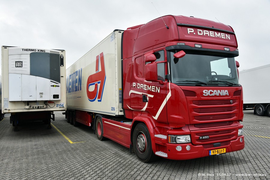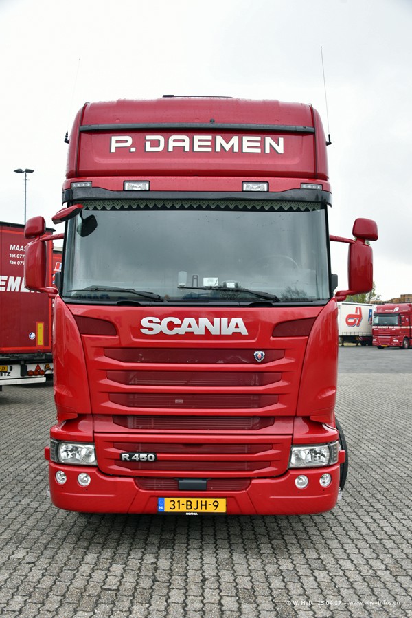 In den letzten Wochen wurde der Furhpark bei Daemen weiter modernisiert. Neu sind zwei DAF XF Euro 6 und mehrere Scania R 410 und R 450 Streamline (alte Baureihe). Und ich konnte einen neuen Auflieger entdecken, der wieder im Design eines Kunden gestaltet ist. Alle neuen Zugmaschinen sind an denn Kennzeichen mit den Buchstabenkombinationen "BJ" zu erkennen.